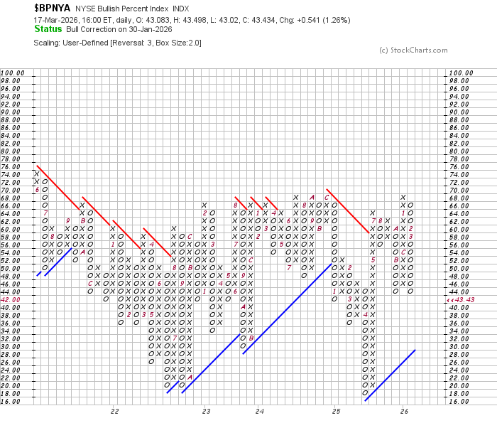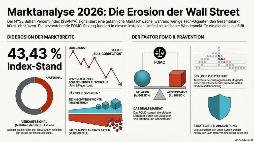 Der Blick auf den NYSE Bullish Percent Index ($BPNYA) am 17. März 2026 lässt erfahrenen Börsianern den Atem stocken. Mit einem Stand von nur noch 43,43 % offenbart der Index eine gefährliche Erosion unter der glänzenden Oberfläche der großen Indizes. Während die Schlagzeilen oft noch Optimismus verbreiten, zeigt dieser Indikator die nackte Wahrheit: Weniger als die Hälfte aller NYSE-Aktien befinden sich auf einem Kaufsignal. Der Markt gleicht einem prachtvollen Gebäude, bei dem im Keller bereits die tragenden Wände wegbrechen – ein klassisches Warnsignal für einen bevorstehenden Crash.