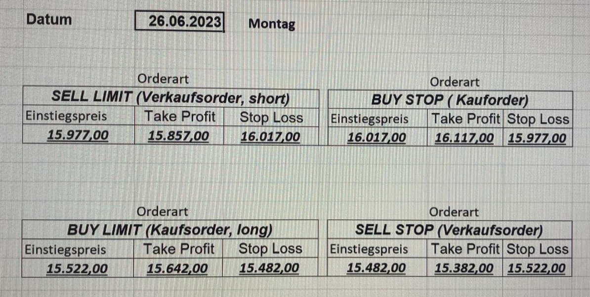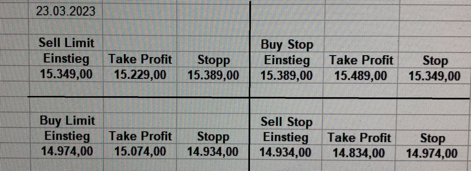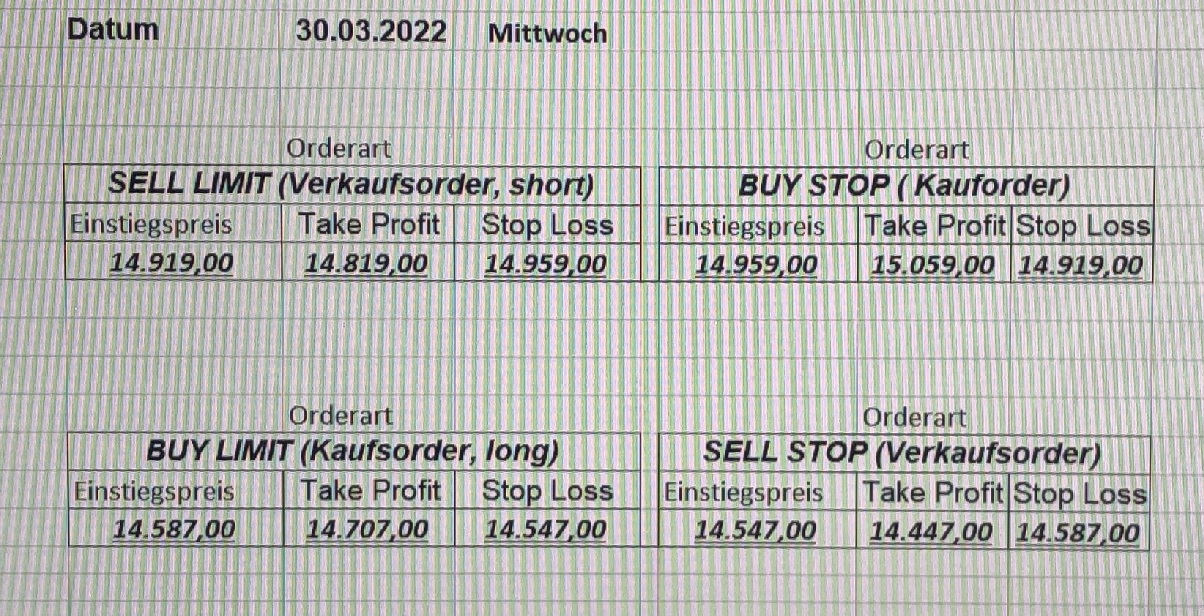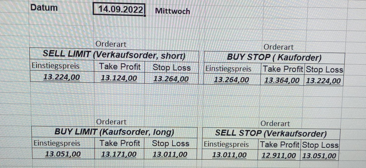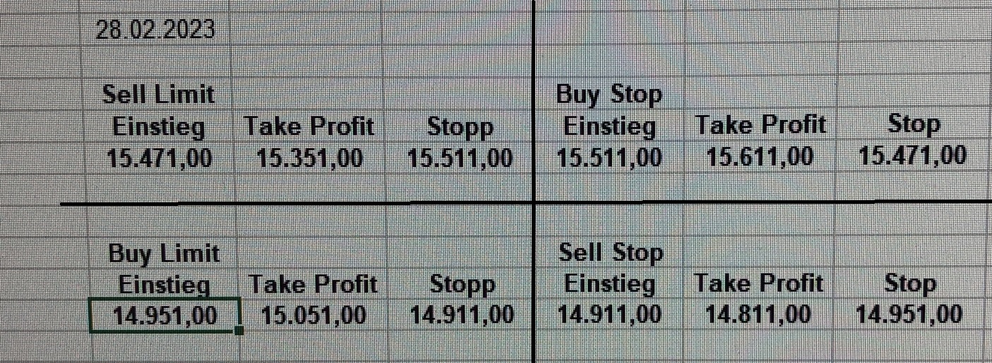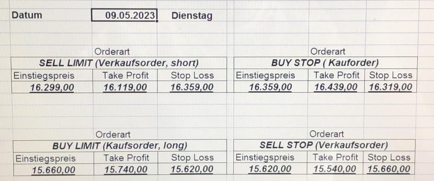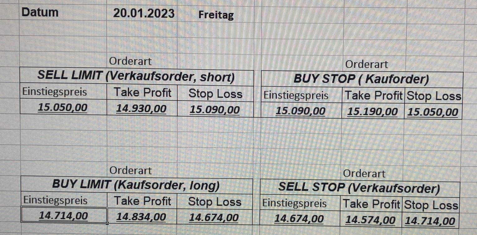 16.5.2023 Platzieren Sie die  Order bis 9:00 Löschen Sie bitte offene Order und Positionen um 21:45 ! Zur Frage der Punktgröße: Beispielrechnung: Bitte immer kurz auf den am weitest entfernten Stopp schauen. Diese Punktzahl sollte nicht mehr als 0,5% bis 1% des Kapitals ausmachen. 15.5.2023 Platzieren Sie die  Order bis 9:00 Löschen Sie bitte offene Order und Positionen um 21:45 ! Zur Frage der Punktgröße: Beispielrechnung: Bitte immer kurz auf den am weitest entfernten Stopp schauen. Diese Punktzahl sollte nicht mehr als 0,5% bis 1% des Kapitals ausmachen. 12.5.2023 Platzieren Sie die  Order bis 9:00 Löschen Sie bitte offene Order und Positionen um 21:45 ! Zur Frage der Punktgröße: Beispielrechnung: Bitte immer kurz auf den am weitest entfernten Stopp schauen. Diese Punktzahl sollte nicht mehr als 0,5% bis 1% des Kapitals ausmachen. 10.5.2023  Platzieren Sie die  Order bis 9:00 Löschen Sie bitte offene Order und Positionen um 21:45 ! Zur Frage der Punktgröße: Beispielrechnung: Bitte immer kurz auf den am weitest entfernten Stopp schauen. Diese Punktzahl sollte nicht mehr als 0,5% bis 1% des Kapitals ausmachen. 9.5.2023 Platzieren Sie die  Order bis 9:00 Löschen Sie bitte offene Order und Positionen um 21:45 ! Zur Frage der Punktgröße: Beispielrechnung: Bitte immer kurz auf den am weitest entfernten Stopp schauen. Diese Punktzahl sollte nicht mehr als 0,5% bis 1% des Kapitals ausmachen.   8.5.2023 Platzieren Sie die  Order bis 9:00 Löschen Sie bitte offene Order und Positionen um 21:45 ! Zur Frage der Punktgröße: Beispielrechnung: Bitte immer kurz auf den am weitest entfernten Stopp schauen. Diese Punktzahl sollte nicht mehr als 0,5% bis 1% des Kapitals ausmachen. 5.5.2023 Platzieren Sie die  Order bis 9:00 Löschen Sie bitte offene Order und Positionen um 21:45 ! Zur Frage der Punktgröße: Beispielrechnung: Bitte immer kurz auf den am weitest entfernten Stopp schauen. Diese Punktzahl sollte nicht mehr als 0,5% bis 1% des Kapitals ausmachen. 4.5.2023 Platzieren Sie die  Order bis 9:00 Löschen Sie bitte offene Order und Positionen um 21:45 ! Zur Frage der Punktgröße: Beispielrechnung: Bitte immer kurz auf den am weitest entfernten Stopp schauen. Diese Punktzahl sollte nicht mehr als 0,5% bis 1% des Kapitals ausmachen. 3.5.2023 Heute abend FED-Sitzung: Wir bleiben heute aus dem Markt! 2.5.2023 Platzieren Sie die  Order bis 9:00 Löschen Sie bitte offene Order und Positionen um 21:45 ! Zur Frage der Punktgröße: Beispielrechnung: Bitte immer kurz auf den am weitest entfernten Stopp schauen. Diese Punktzahl sollte nicht mehr als 0,5% bis 1% des Kapitals ausmachen. 28.4.2023 Platzieren Sie die  Order bis 9:00 Löschen Sie bitte offene Order und Positionen um 21:45 ! Zur Frage der Punktgröße: Beispielrechnung: Bitte immer kurz auf den am weitest entfernten Stopp schauen. Diese Punktzahl sollte nicht mehr als 0,5% bis 1% des Kapitals ausmachen. 27.4.2023 Platzieren Sie die  Order bis 9:00 Löschen Sie bitte offene Order und Positionen um 21:45 ! Zur Frage der Punktgröße: Beispielrechnung: Bitte immer kurz auf den am weitest entfernten Stopp schauen. Diese Punktzahl sollte nicht mehr als 0,5% bis 1% des Kapitals ausmachen. 26.4.2023 Platzieren Sie die  Order bis 9:00 Löschen Sie bitte offene Order und Positionen um 21:45 ! Zur Frage der Punktgröße: Beispielrechnung: Bitte immer kurz auf den am weitest entfernten Stopp schauen. Diese Punktzahl sollte nicht mehr als 0,5% bis 1% des Kapitals ausmachen. 25.4.2023 Platzieren Sie die  Order bis 9:00 Löschen Sie bitte offene Order und Positionen um 21:45 ! Zur Frage der Punktgröße: Beispielrechnung: Bitte immer kurz auf den am weitest entfernten Stopp schauen. Diese Punktzahl sollte nicht mehr als 0,5% bis 1% des Kapitals ausmachen. 24.4.2023 Platzieren Sie die  Order bis 9:00 Löschen Sie bitte offene Order und Positionen um 21:45 ! Zur Frage der Punktgröße: Beispielrechnung: Bitte immer kurz auf den am weitest entfernten Stopp schauen. Diese Punktzahl sollte nicht mehr als 0,5% bis 1% des Kapitals ausmachen. 21.4.2023 Platzieren Sie die  Order bis 9:00 Löschen Sie bitte offene Order und Positionen um 21:45 ! Zur Frage der Punktgröße: Beispielrechnung: Bitte immer kurz auf den am weitest entfernten Stopp schauen. Diese Punktzahl sollte nicht mehr als 0,5% bis 1% des Kapitals ausmachen. Sorry, falscher Wochentag, aber es sind die heutigen Signale!    20.4.2023 Platzieren Sie die  Order bis 9:00 Löschen Sie bitte offene Order und Positionen um 21:45 ! Zur Frage der Punktgröße: Beispielrechnung: Bitte immer kurz auf den am weitest entfernten Stopp schauen. Diese Punktzahl sollte nicht mehr als 0,5% bis 1% des Kapitals ausmachen. 19.4.2023 Platzieren Sie die  Order bis 9:00 Löschen Sie bitte offene Order und Positionen um 21:45 ! Zur Frage der Punktgröße: Beispielrechnung: Bitte immer kurz auf den am weitest entfernten Stopp schauen. Diese Punktzahl sollte nicht mehr als 0,5% bis 1% des Kapitals ausmachen. 18.4.2023 Platzieren Sie die  Order bis 9:00 Löschen Sie bitte offene Order und Positionen um 21:45 ! Zur Frage der Punktgröße: Beispielrechnung: Bitte immer kurz auf den am weitest entfernten Stopp schauen. Diese Punktzahl sollte nicht mehr als 0,5% bis 1% des Kapitals ausmachen.  17.4.2023 Platzieren Sie die  Order bis 9:00 Löschen Sie bitte offene Order und Positionen um 21:45 ! Zur Frage der Punktgröße: Beispielrechnung: Bitte immer kurz auf den am weitest entfernten Stopp schauen. Diese Punktzahl sollte nicht mehr als 0,5% bis 1% des Kapitals ausmachen. 14.4.2023 Platzieren Sie die  Order bis 9:00 Löschen Sie bitte offene Order und Positionen um 21:45 ! Zur Frage der Punktgröße: Beispielrechnung: Bitte immer kurz auf den am weitest entfernten Stopp schauen. Diese Punktzahl sollte nicht mehr als 0,5% bis 1% des Kapitals ausmachen. 13.4.2023 Heute bleiben wir an der Seitenlinie. Aktuell ist der DAX nicht volatil genug!  12.4.2023 Pla