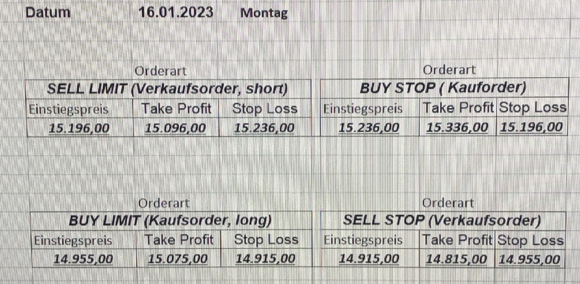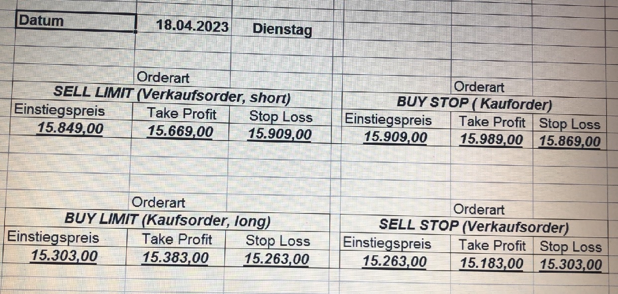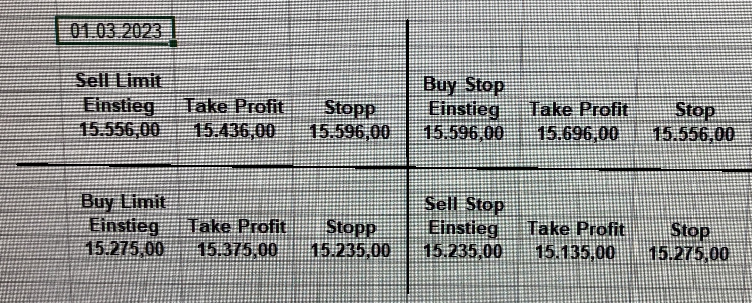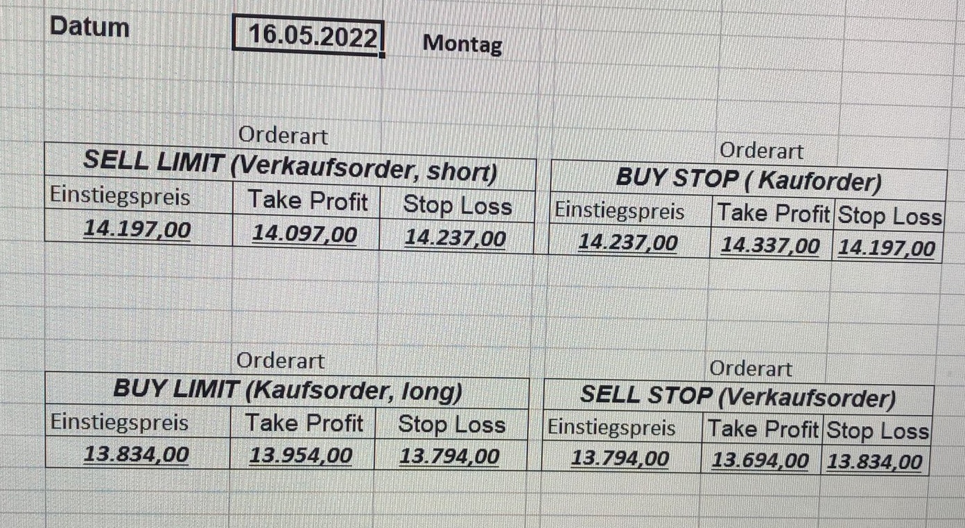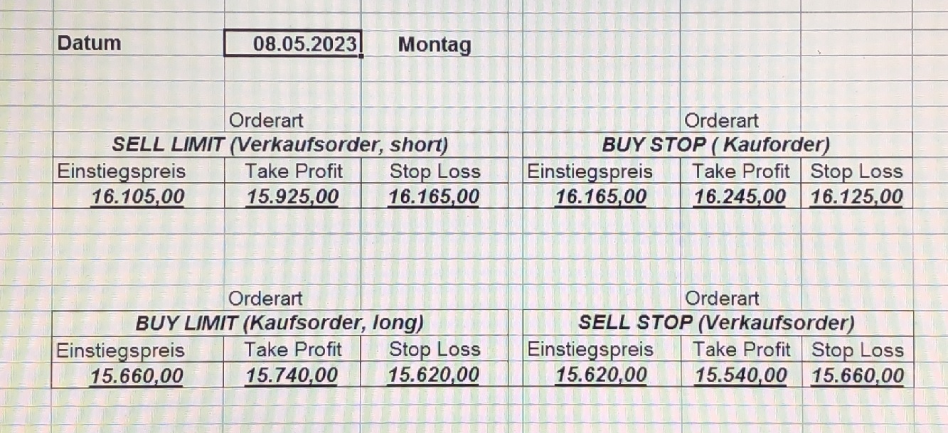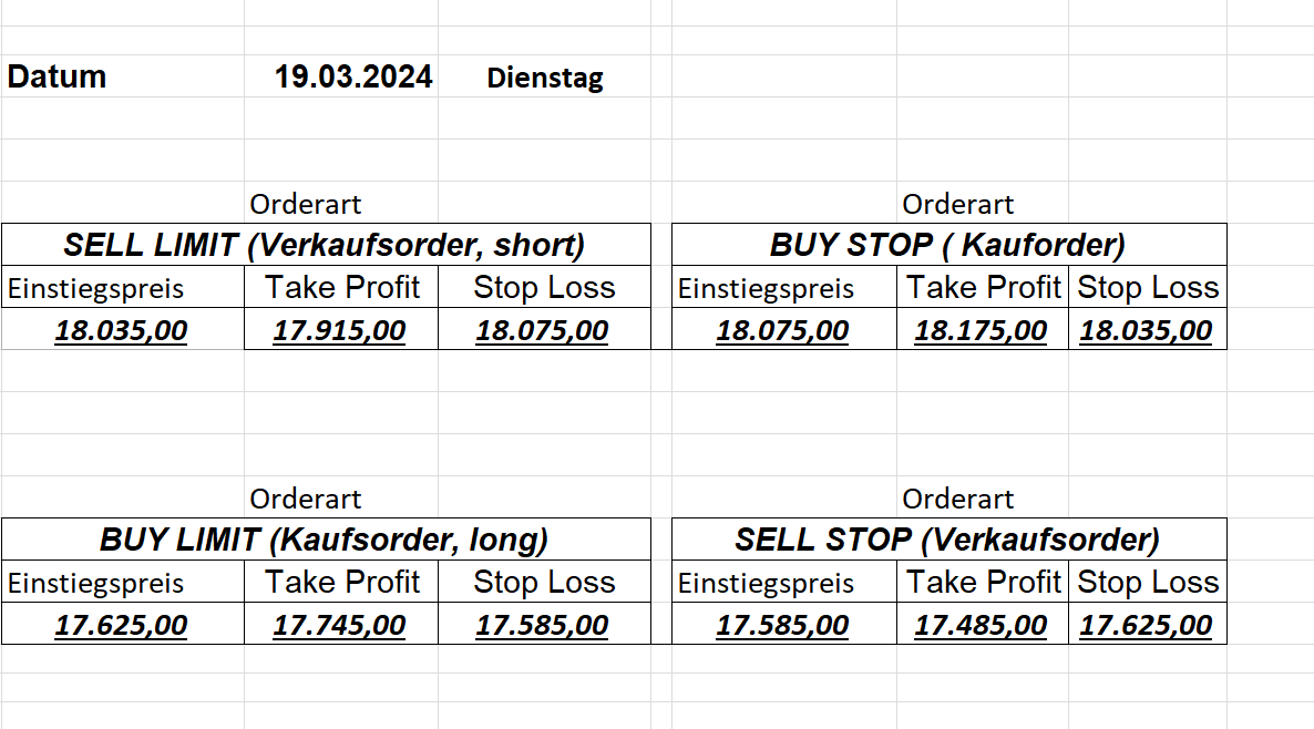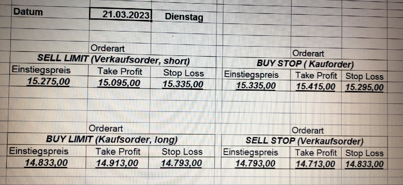 16.5.2023 Platzieren Sie die  Order bis 9:00 Löschen Sie bitte offene Order und Positionen um 21:45 ! Zur Frage der Punktgröße: Beispielrechnung: Bitte immer kurz auf den am weitest entfernten Stopp schauen. Diese Punktzahl sollte nicht mehr als 0,5% bis 1% des Kapitals ausmachen. 15.5.2023 Platzieren Sie die  Order bis 9:00 Löschen Sie bitte offene Order und Positionen um 21:45 ! Zur Frage der Punktgröße: Beispielrechnung: Bitte immer kurz auf den am weitest entfernten Stopp schauen. Diese Punktzahl sollte nicht mehr als 0,5% bis 1% des Kapitals ausmachen. 12.5.2023 Platzieren Sie die  Order bis 9:00 Löschen Sie bitte offene Order und Positionen um 21:45 ! Zur Frage der Punktgröße: Beispielrechnung: Bitte immer kurz auf den am weitest entfernten Stopp schauen. Diese Punktzahl sollte nicht mehr als 0,5% bis 1% des Kapitals ausmachen. 10.5.2023  Platzieren Sie die  Order bis 9:00 Löschen Sie bitte offene Order und Positionen um 21:45 ! Zur Frage der Punktgröße: Beispielrechnung: Bitte immer kurz auf den am weitest entfernten Stopp schauen. Diese Punktzahl sollte nicht mehr als 0,5% bis 1% des Kapitals ausmachen. 9.5.2023 Platzieren Sie die  Order bis 9:00 Löschen Sie bitte offene Order und Positionen um 21:45 ! Zur Frage der Punktgröße: Beispielrechnung: Bitte immer kurz auf den am weitest entfernten Stopp schauen. Diese Punktzahl sollte nicht mehr als 0,5% bis 1% des Kapitals ausmachen.   8.5.2023 Platzieren Sie die  Order bis 9:00 Löschen Sie bitte offene Order und Positionen um 21:45 ! Zur Frage der Punktgröße: Beispielrechnung: Bitte immer kurz auf den am weitest entfernten Stopp schauen. Diese Punktzahl sollte nicht mehr als 0,5% bis 1% des Kapitals ausmachen. 5.5.2023 Platzieren Sie die  Order bis 9:00 Löschen Sie bitte offene Order und Positionen um 21:45 ! Zur Frage der Punktgröße: Beispielrechnung: Bitte immer kurz auf den am weitest entfernten Stopp schauen. Diese Punktzahl sollte nicht mehr als 0,5% bis 1% des Kapitals ausmachen. 4.5.2023 Platzieren Sie die  Order bis 9:00 Löschen Sie bitte offene Order und Positionen um 21:45 ! Zur Frage der Punktgröße: Beispielrechnung: Bitte immer kurz auf den am weitest entfernten Stopp schauen. Diese Punktzahl sollte nicht mehr als 0,5% bis 1% des Kapitals ausmachen. 3.5.2023 Heute abend FED-Sitzung: Wir bleiben heute aus dem Markt! 2.5.2023 Platzieren Sie die  Order bis 9:00 Löschen Sie bitte offene Order und Positionen um 21:45 ! Zur Frage der Punktgröße: Beispielrechnung: Bitte immer kurz auf den am weitest entfernten Stopp schauen. Diese Punktzahl sollte nicht mehr als 0,5% bis 1% des Kapitals ausmachen. 28.4.2023 Platzieren Sie die  Order bis 9:00 Löschen Sie bitte offene Order und Positionen um 21:45 ! Zur Frage der Punktgröße: Beispielrechnung: Bitte immer kurz auf den am weitest entfernten Stopp schauen. Diese Punktzahl sollte nicht mehr als 0,5% bis 1% des Kapitals ausmachen. 27.4.2023 Platzieren Sie die  Order bis 9:00 Löschen Sie bitte offene Order und Positionen um 21:45 ! Zur Frage der Punktgröße: Beispielrechnung: Bitte immer kurz auf den am weitest entfernten Stopp schauen. Diese Punktzahl sollte nicht mehr als 0,5% bis 1% des Kapitals ausmachen. 26.4.2023 Platzieren Sie die  Order bis 9:00 Löschen Sie bitte offene Order und Positionen um 21:45 ! Zur Frage der Punktgröße: Beispielrechnung: Bitte immer kurz auf den am weitest entfernten Stopp schauen. Diese Punktzahl sollte nicht mehr als 0,5% bis 1% des Kapitals ausmachen. 25.4.2023 Platzieren Sie die  Order bis 9:00 Löschen Sie bitte offene Order und Positionen um 21:45 ! Zur Frage der Punktgröße: Beispielrechnung: Bitte immer kurz auf den am weitest entfernten Stopp schauen. Diese Punktzahl sollte nicht mehr als 0,5% bis 1% des Kapitals ausmachen. 24.4.2023 Platzieren Sie die  Order bis 9:00 Löschen Sie bitte offene Order und Positionen um 21:45 ! Zur Frage der Punktgröße: Beispielrechnung: Bitte immer kurz auf den am weitest entfernten Stopp schauen. Diese Punktzahl sollte nicht mehr als 0,5% bis 1% des Kapitals ausmachen. 21.4.2023 Platzieren Sie die  Order bis 9:00 Löschen Sie bitte offene Order und Positionen um 21:45 ! Zur Frage der Punktgröße: Beispielrechnung: Bitte immer kurz auf den am weitest entfernten Stopp schauen. Diese Punktzahl sollte nicht mehr als 0,5% bis 1% des Kapitals ausmachen. Sorry, falscher Wochentag, aber es sind die heutigen Signale!    20.4.2023 Platzieren Sie die  Order bis 9:00 Löschen Sie bitte offene Order und Positionen um 21:45 ! Zur Frage der Punktgröße: Beispielrechnung: Bitte immer kurz auf den am weitest entfernten Stopp schauen. Diese Punktzahl sollte nicht mehr als 0,5% bis 1% des Kapitals ausmachen. 19.4.2023 Platzieren Sie die  Order bis 9:00 Löschen Sie bitte offene Order und Positionen um 21:45 ! Zur Frage der Punktgröße: Beispielrechnung: Bitte immer kurz auf den am weitest entfernten Stopp schauen. Diese Punktzahl sollte nicht mehr als 0,5% bis 1% des Kapitals ausmachen. 18.4.2023 Platzieren Sie die  Order bis 9:00 Löschen Sie bitte offene Order und Positionen um 21:45 ! Zur Frage der Punktgröße: Beispielrechnung: Bitte immer kurz auf den am weitest entfernten Stopp schauen. Diese Punktzahl sollte nicht mehr als 0,5% bis 1% des Kapitals ausmachen.  17.4.2023 Platzieren Sie die  Order bis 9:00 Löschen Sie bitte offene Order und Positionen um 21:45 ! Zur Frage der Punktgröße: Beispielrechnung: Bitte immer kurz auf den am weitest entfernten Stopp schauen. Diese Punktzahl sollte nicht mehr als 0,5% bis 1% des Kapitals ausmachen. 14.4.2023 Platzieren Sie die  Order bis 9:00 Löschen Sie bitte offene Order und Positionen um 21:45 ! Zur Frage der Punktgröße: Beispielrechnung: Bitte immer kurz auf den am weitest entfernten Stopp schauen. Diese Punktzahl sollte nicht mehr als 0,5% bis 1% des Kapitals ausmachen. 13.4.2023 Heute bleiben wir an der Seitenlinie. Aktuell ist der DAX nicht volatil genug!  12.4.2023 Pla