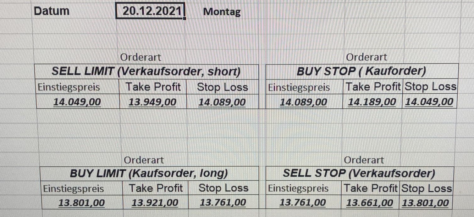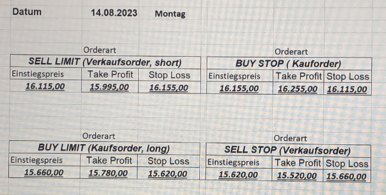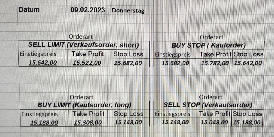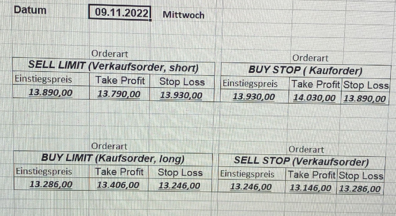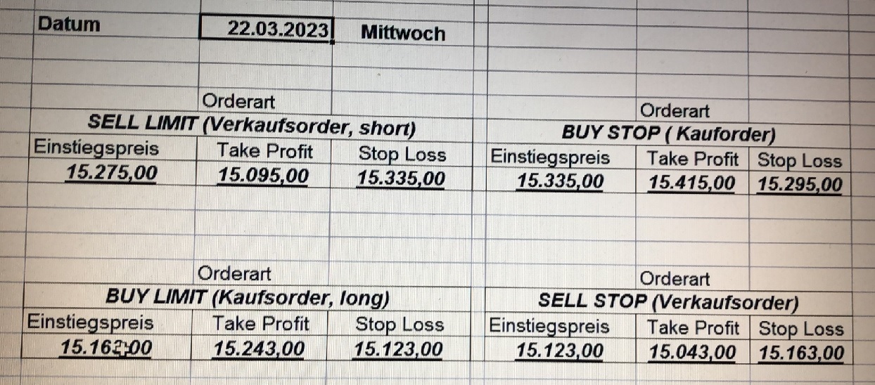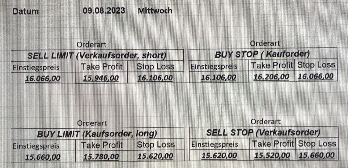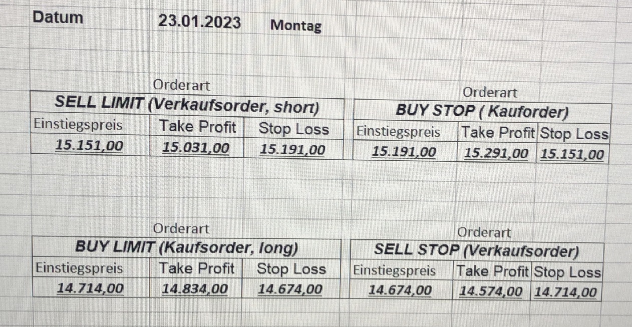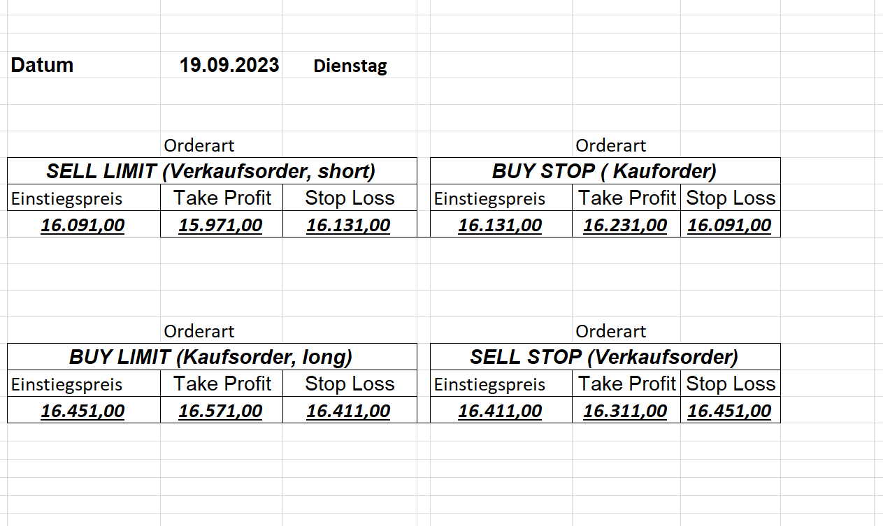 16.5.2023 Platzieren Sie die  Order bis 9:00 Löschen Sie bitte offene Order und Positionen um 21:45 ! Zur Frage der Punktgröße: Beispielrechnung: Bitte immer kurz auf den am weitest entfernten Stopp schauen. Diese Punktzahl sollte nicht mehr als 0,5% bis 1% des Kapitals ausmachen. 15.5.2023 Platzieren Sie die  Order bis 9:00 Löschen Sie bitte offene Order und Positionen um 21:45 ! Zur Frage der Punktgröße: Beispielrechnung: Bitte immer kurz auf den am weitest entfernten Stopp schauen. Diese Punktzahl sollte nicht mehr als 0,5% bis 1% des Kapitals ausmachen. 12.5.2023 Platzieren Sie die  Order bis 9:00 Löschen Sie bitte offene Order und Positionen um 21:45 ! Zur Frage der Punktgröße: Beispielrechnung: Bitte immer kurz auf den am weitest entfernten Stopp schauen. Diese Punktzahl sollte nicht mehr als 0,5% bis 1% des Kapitals ausmachen. 10.5.2023  Platzieren Sie die  Order bis 9:00 Löschen Sie bitte offene Order und Positionen um 21:45 ! Zur Frage der Punktgröße: Beispielrechnung: Bitte immer kurz auf den am weitest entfernten Stopp schauen. Diese Punktzahl sollte nicht mehr als 0,5% bis 1% des Kapitals ausmachen. 9.5.2023 Platzieren Sie die  Order bis 9:00 Löschen Sie bitte offene Order und Positionen um 21:45 ! Zur Frage der Punktgröße: Beispielrechnung: Bitte immer kurz auf den am weitest entfernten Stopp schauen. Diese Punktzahl sollte nicht mehr als 0,5% bis 1% des Kapitals ausmachen.   8.5.2023 Platzieren Sie die  Order bis 9:00 Löschen Sie bitte offene Order und Positionen um 21:45 ! Zur Frage der Punktgröße: Beispielrechnung: Bitte immer kurz auf den am weitest entfernten Stopp schauen. Diese Punktzahl sollte nicht mehr als 0,5% bis 1% des Kapitals ausmachen. 5.5.2023 Platzieren Sie die  Order bis 9:00 Löschen Sie bitte offene Order und Positionen um 21:45 ! Zur Frage der Punktgröße: Beispielrechnung: Bitte immer kurz auf den am weitest entfernten Stopp schauen. Diese Punktzahl sollte nicht mehr als 0,5% bis 1% des Kapitals ausmachen. 4.5.2023 Platzieren Sie die  Order bis 9:00 Löschen Sie bitte offene Order und Positionen um 21:45 ! Zur Frage der Punktgröße: Beispielrechnung: Bitte immer kurz auf den am weitest entfernten Stopp schauen. Diese Punktzahl sollte nicht mehr als 0,5% bis 1% des Kapitals ausmachen. 3.5.2023 Heute abend FED-Sitzung: Wir bleiben heute aus dem Markt! 2.5.2023 Platzieren Sie die  Order bis 9:00 Löschen Sie bitte offene Order und Positionen um 21:45 ! Zur Frage der Punktgröße: Beispielrechnung: Bitte immer kurz auf den am weitest entfernten Stopp schauen. Diese Punktzahl sollte nicht mehr als 0,5% bis 1% des Kapitals ausmachen. 28.4.2023 Platzieren Sie die  Order bis 9:00 Löschen Sie bitte offene Order und Positionen um 21:45 ! Zur Frage der Punktgröße: Beispielrechnung: Bitte immer kurz auf den am weitest entfernten Stopp schauen. Diese Punktzahl sollte nicht mehr als 0,5% bis 1% des Kapitals ausmachen. 27.4.2023 Platzieren Sie die  Order bis 9:00 Löschen Sie bitte offene Order und Positionen um 21:45 ! Zur Frage der Punktgröße: Beispielrechnung: Bitte immer kurz auf den am weitest entfernten Stopp schauen. Diese Punktzahl sollte nicht mehr als 0,5% bis 1% des Kapitals ausmachen. 26.4.2023 Platzieren Sie die  Order bis 9:00 Löschen Sie bitte offene Order und Positionen um 21:45 ! Zur Frage der Punktgröße: Beispielrechnung: Bitte immer kurz auf den am weitest entfernten Stopp schauen. Diese Punktzahl sollte nicht mehr als 0,5% bis 1% des Kapitals ausmachen. 25.4.2023 Platzieren Sie die  Order bis 9:00 Löschen Sie bitte offene Order und Positionen um 21:45 ! Zur Frage der Punktgröße: Beispielrechnung: Bitte immer kurz auf den am weitest entfernten Stopp schauen. Diese Punktzahl sollte nicht mehr als 0,5% bis 1% des Kapitals ausmachen. 24.4.2023 Platzieren Sie die  Order bis 9:00 Löschen Sie bitte offene Order und Positionen um 21:45 ! Zur Frage der Punktgröße: Beispielrechnung: Bitte immer kurz auf den am weitest entfernten Stopp schauen. Diese Punktzahl sollte nicht mehr als 0,5% bis 1% des Kapitals ausmachen. 21.4.2023 Platzieren Sie die  Order bis 9:00 Löschen Sie bitte offene Order und Positionen um 21:45 ! Zur Frage der Punktgröße: Beispielrechnung: Bitte immer kurz auf den am weitest entfernten Stopp schauen. Diese Punktzahl sollte nicht mehr als 0,5% bis 1% des Kapitals ausmachen. Sorry, falscher Wochentag, aber es sind die heutigen Signale!    20.4.2023 Platzieren Sie die  Order bis 9:00 Löschen Sie bitte offene Order und Positionen um 21:45 ! Zur Frage der Punktgröße: Beispielrechnung: Bitte immer kurz auf den am weitest entfernten Stopp schauen. Diese Punktzahl sollte nicht mehr als 0,5% bis 1% des Kapitals ausmachen. 19.4.2023 Platzieren Sie die  Order bis 9:00 Löschen Sie bitte offene Order und Positionen um 21:45 ! Zur Frage der Punktgröße: Beispielrechnung: Bitte immer kurz auf den am weitest entfernten Stopp schauen. Diese Punktzahl sollte nicht mehr als 0,5% bis 1% des Kapitals ausmachen. 18.4.2023 Platzieren Sie die  Order bis 9:00 Löschen Sie bitte offene Order und Positionen um 21:45 ! Zur Frage der Punktgröße: Beispielrechnung: Bitte immer kurz auf den am weitest entfernten Stopp schauen. Diese Punktzahl sollte nicht mehr als 0,5% bis 1% des Kapitals ausmachen.  17.4.2023 Platzieren Sie die  Order bis 9:00 Löschen Sie bitte offene Order und Positionen um 21:45 ! Zur Frage der Punktgröße: Beispielrechnung: Bitte immer kurz auf den am weitest entfernten Stopp schauen. Diese Punktzahl sollte nicht mehr als 0,5% bis 1% des Kapitals ausmachen. 14.4.2023 Platzieren Sie die  Order bis 9:00 Löschen Sie bitte offene Order und Positionen um 21:45 ! Zur Frage der Punktgröße: Beispielrechnung: Bitte immer kurz auf den am weitest entfernten Stopp schauen. Diese Punktzahl sollte nicht mehr als 0,5% bis 1% des Kapitals ausmachen. 13.4.2023 Heute bleiben wir an der Seitenlinie. Aktuell ist der DAX nicht volatil genug!  12.4.2023 Pla