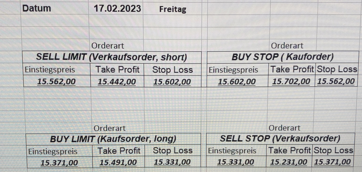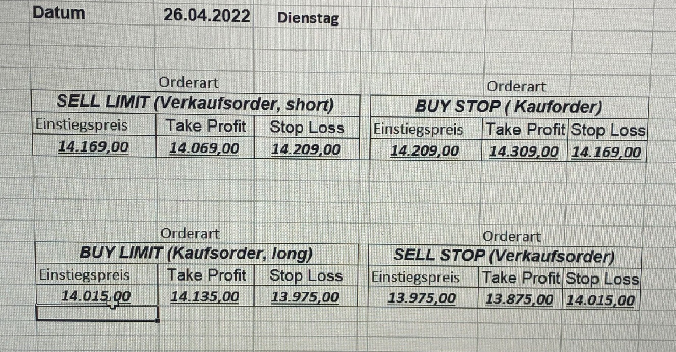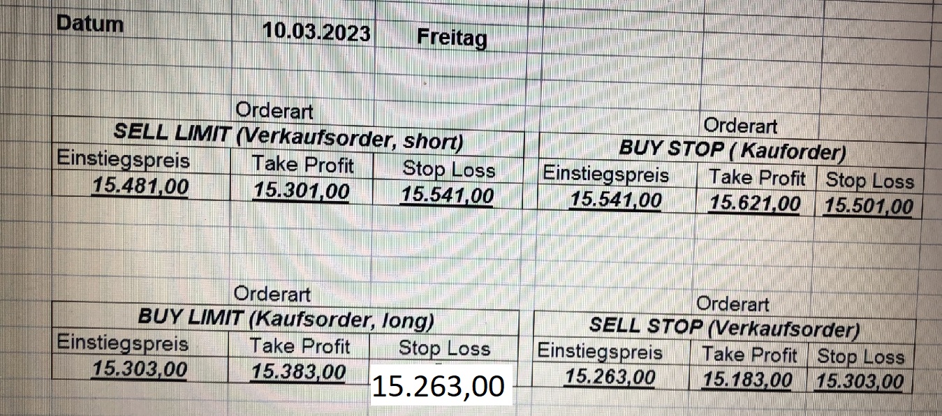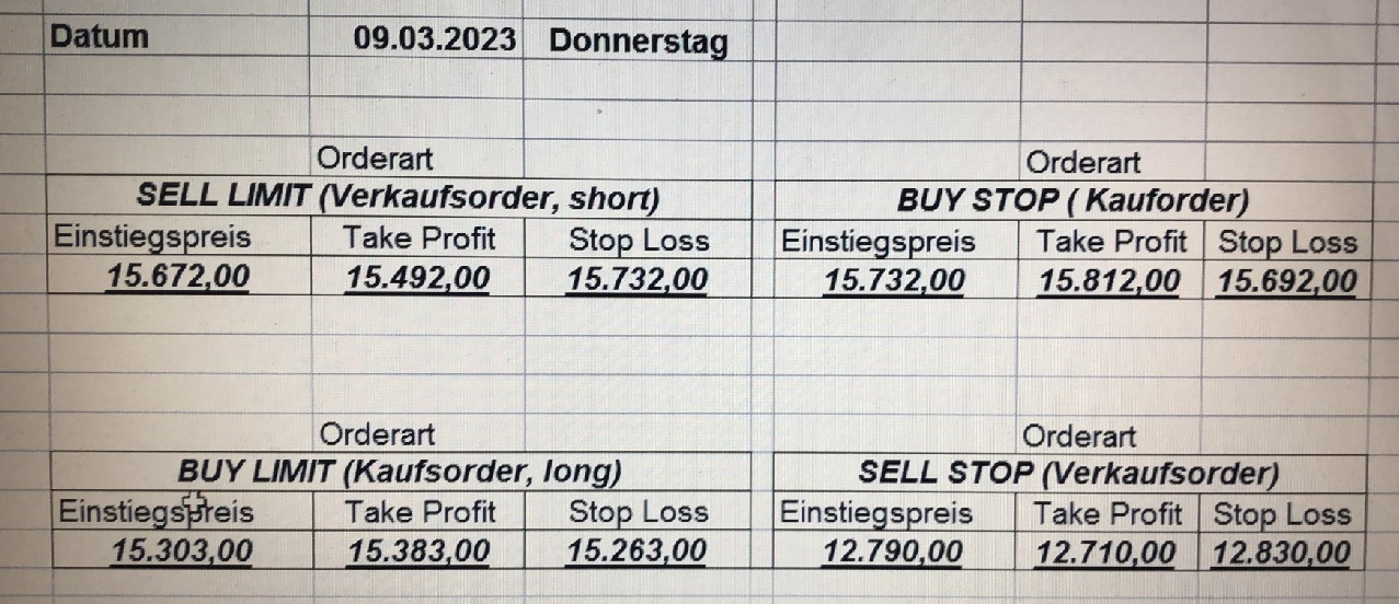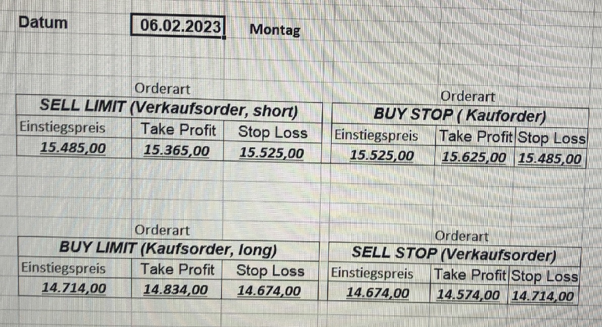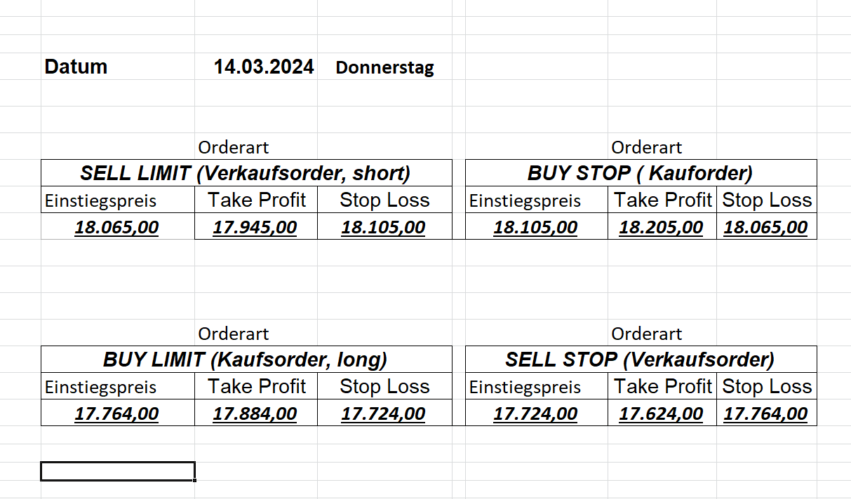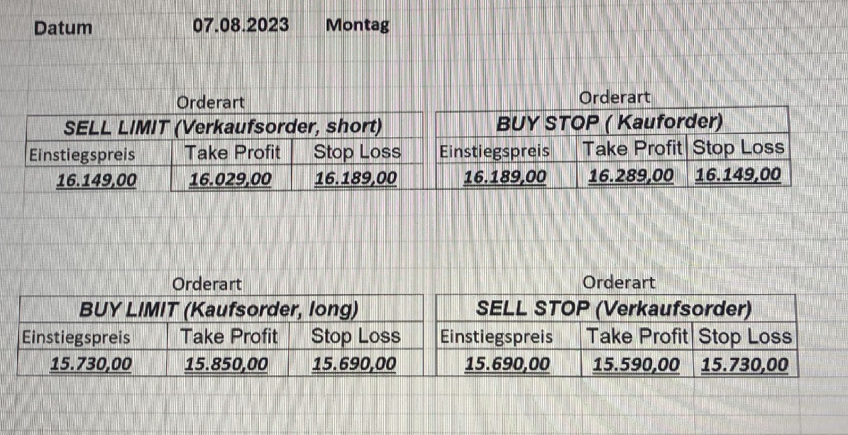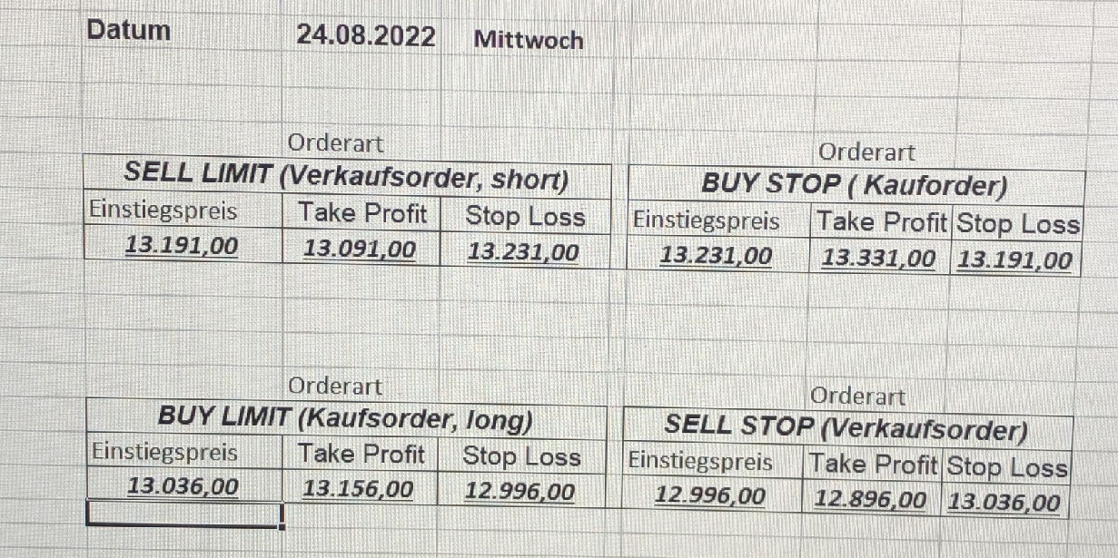 16.5.2023 Platzieren Sie die  Order bis 9:00 Löschen Sie bitte offene Order und Positionen um 21:45 ! Zur Frage der Punktgröße: Beispielrechnung: Bitte immer kurz auf den am weitest entfernten Stopp schauen. Diese Punktzahl sollte nicht mehr als 0,5% bis 1% des Kapitals ausmachen. 15.5.2023 Platzieren Sie die  Order bis 9:00 Löschen Sie bitte offene Order und Positionen um 21:45 ! Zur Frage der Punktgröße: Beispielrechnung: Bitte immer kurz auf den am weitest entfernten Stopp schauen. Diese Punktzahl sollte nicht mehr als 0,5% bis 1% des Kapitals ausmachen. 12.5.2023 Platzieren Sie die  Order bis 9:00 Löschen Sie bitte offene Order und Positionen um 21:45 ! Zur Frage der Punktgröße: Beispielrechnung: Bitte immer kurz auf den am weitest entfernten Stopp schauen. Diese Punktzahl sollte nicht mehr als 0,5% bis 1% des Kapitals ausmachen. 10.5.2023  Platzieren Sie die  Order bis 9:00 Löschen Sie bitte offene Order und Positionen um 21:45 ! Zur Frage der Punktgröße: Beispielrechnung: Bitte immer kurz auf den am weitest entfernten Stopp schauen. Diese Punktzahl sollte nicht mehr als 0,5% bis 1% des Kapitals ausmachen. 9.5.2023 Platzieren Sie die  Order bis 9:00 Löschen Sie bitte offene Order und Positionen um 21:45 ! Zur Frage der Punktgröße: Beispielrechnung: Bitte immer kurz auf den am weitest entfernten Stopp schauen. Diese Punktzahl sollte nicht mehr als 0,5% bis 1% des Kapitals ausmachen.   8.5.2023 Platzieren Sie die  Order bis 9:00 Löschen Sie bitte offene Order und Positionen um 21:45 ! Zur Frage der Punktgröße: Beispielrechnung: Bitte immer kurz auf den am weitest entfernten Stopp schauen. Diese Punktzahl sollte nicht mehr als 0,5% bis 1% des Kapitals ausmachen. 5.5.2023 Platzieren Sie die  Order bis 9:00 Löschen Sie bitte offene Order und Positionen um 21:45 ! Zur Frage der Punktgröße: Beispielrechnung: Bitte immer kurz auf den am weitest entfernten Stopp schauen. Diese Punktzahl sollte nicht mehr als 0,5% bis 1% des Kapitals ausmachen. 4.5.2023 Platzieren Sie die  Order bis 9:00 Löschen Sie bitte offene Order und Positionen um 21:45 ! Zur Frage der Punktgröße: Beispielrechnung: Bitte immer kurz auf den am weitest entfernten Stopp schauen. Diese Punktzahl sollte nicht mehr als 0,5% bis 1% des Kapitals ausmachen. 3.5.2023 Heute abend FED-Sitzung: Wir bleiben heute aus dem Markt! 2.5.2023 Platzieren Sie die  Order bis 9:00 Löschen Sie bitte offene Order und Positionen um 21:45 ! Zur Frage der Punktgröße: Beispielrechnung: Bitte immer kurz auf den am weitest entfernten Stopp schauen. Diese Punktzahl sollte nicht mehr als 0,5% bis 1% des Kapitals ausmachen. 28.4.2023 Platzieren Sie die  Order bis 9:00 Löschen Sie bitte offene Order und Positionen um 21:45 ! Zur Frage der Punktgröße: Beispielrechnung: Bitte immer kurz auf den am weitest entfernten Stopp schauen. Diese Punktzahl sollte nicht mehr als 0,5% bis 1% des Kapitals ausmachen. 27.4.2023 Platzieren Sie die  Order bis 9:00 Löschen Sie bitte offene Order und Positionen um 21:45 ! Zur Frage der Punktgröße: Beispielrechnung: Bitte immer kurz auf den am weitest entfernten Stopp schauen. Diese Punktzahl sollte nicht mehr als 0,5% bis 1% des Kapitals ausmachen. 26.4.2023 Platzieren Sie die  Order bis 9:00 Löschen Sie bitte offene Order und Positionen um 21:45 ! Zur Frage der Punktgröße: Beispielrechnung: Bitte immer kurz auf den am weitest entfernten Stopp schauen. Diese Punktzahl sollte nicht mehr als 0,5% bis 1% des Kapitals ausmachen. 25.4.2023 Platzieren Sie die  Order bis 9:00 Löschen Sie bitte offene Order und Positionen um 21:45 ! Zur Frage der Punktgröße: Beispielrechnung: Bitte immer kurz auf den am weitest entfernten Stopp schauen. Diese Punktzahl sollte nicht mehr als 0,5% bis 1% des Kapitals ausmachen. 24.4.2023 Platzieren Sie die  Order bis 9:00 Löschen Sie bitte offene Order und Positionen um 21:45 ! Zur Frage der Punktgröße: Beispielrechnung: Bitte immer kurz auf den am weitest entfernten Stopp schauen. Diese Punktzahl sollte nicht mehr als 0,5% bis 1% des Kapitals ausmachen. 21.4.2023 Platzieren Sie die  Order bis 9:00 Löschen Sie bitte offene Order und Positionen um 21:45 ! Zur Frage der Punktgröße: Beispielrechnung: Bitte immer kurz auf den am weitest entfernten Stopp schauen. Diese Punktzahl sollte nicht mehr als 0,5% bis 1% des Kapitals ausmachen. Sorry, falscher Wochentag, aber es sind die heutigen Signale!    20.4.2023 Platzieren Sie die  Order bis 9:00 Löschen Sie bitte offene Order und Positionen um 21:45 ! Zur Frage der Punktgröße: Beispielrechnung: Bitte immer kurz auf den am weitest entfernten Stopp schauen. Diese Punktzahl sollte nicht mehr als 0,5% bis 1% des Kapitals ausmachen. 19.4.2023 Platzieren Sie die  Order bis 9:00 Löschen Sie bitte offene Order und Positionen um 21:45 ! Zur Frage der Punktgröße: Beispielrechnung: Bitte immer kurz auf den am weitest entfernten Stopp schauen. Diese Punktzahl sollte nicht mehr als 0,5% bis 1% des Kapitals ausmachen. 18.4.2023 Platzieren Sie die  Order bis 9:00 Löschen Sie bitte offene Order und Positionen um 21:45 ! Zur Frage der Punktgröße: Beispielrechnung: Bitte immer kurz auf den am weitest entfernten Stopp schauen. Diese Punktzahl sollte nicht mehr als 0,5% bis 1% des Kapitals ausmachen.  17.4.2023 Platzieren Sie die  Order bis 9:00 Löschen Sie bitte offene Order und Positionen um 21:45 ! Zur Frage der Punktgröße: Beispielrechnung: Bitte immer kurz auf den am weitest entfernten Stopp schauen. Diese Punktzahl sollte nicht mehr als 0,5% bis 1% des Kapitals ausmachen. 14.4.2023 Platzieren Sie die  Order bis 9:00 Löschen Sie bitte offene Order und Positionen um 21:45 ! Zur Frage der Punktgröße: Beispielrechnung: Bitte immer kurz auf den am weitest entfernten Stopp schauen. Diese Punktzahl sollte nicht mehr als 0,5% bis 1% des Kapitals ausmachen. 13.4.2023 Heute bleiben wir an der Seitenlinie. Aktuell ist der DAX nicht volatil genug!  12.4.2023 Pla