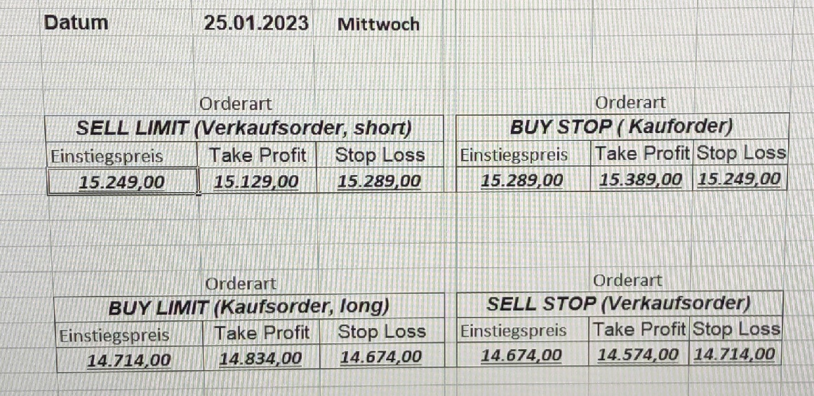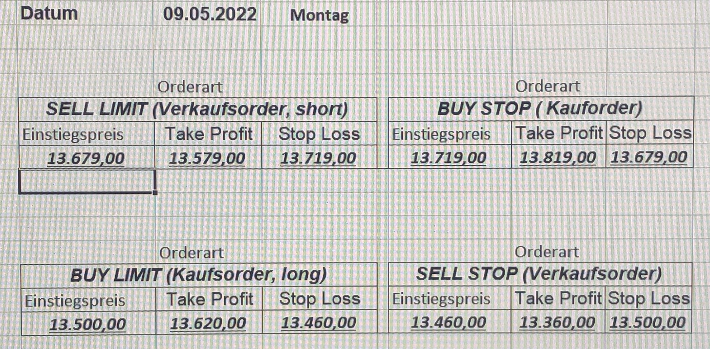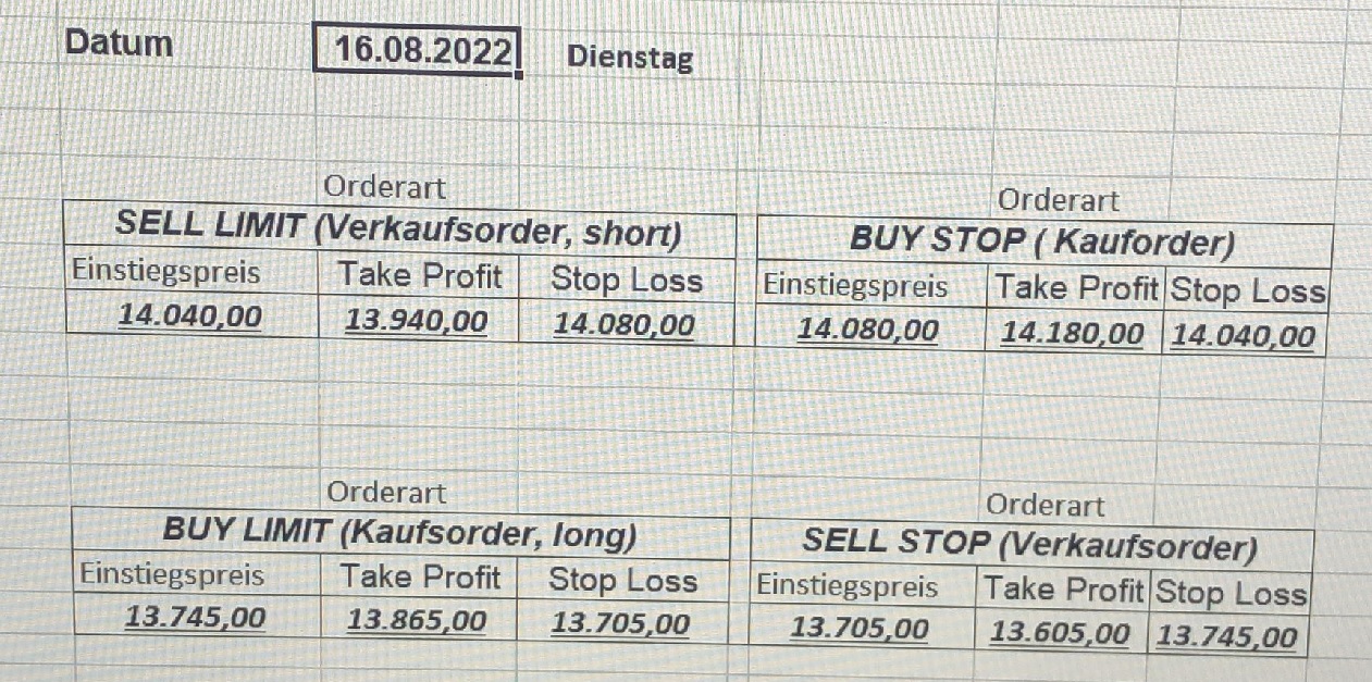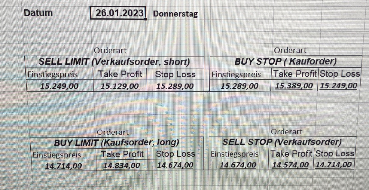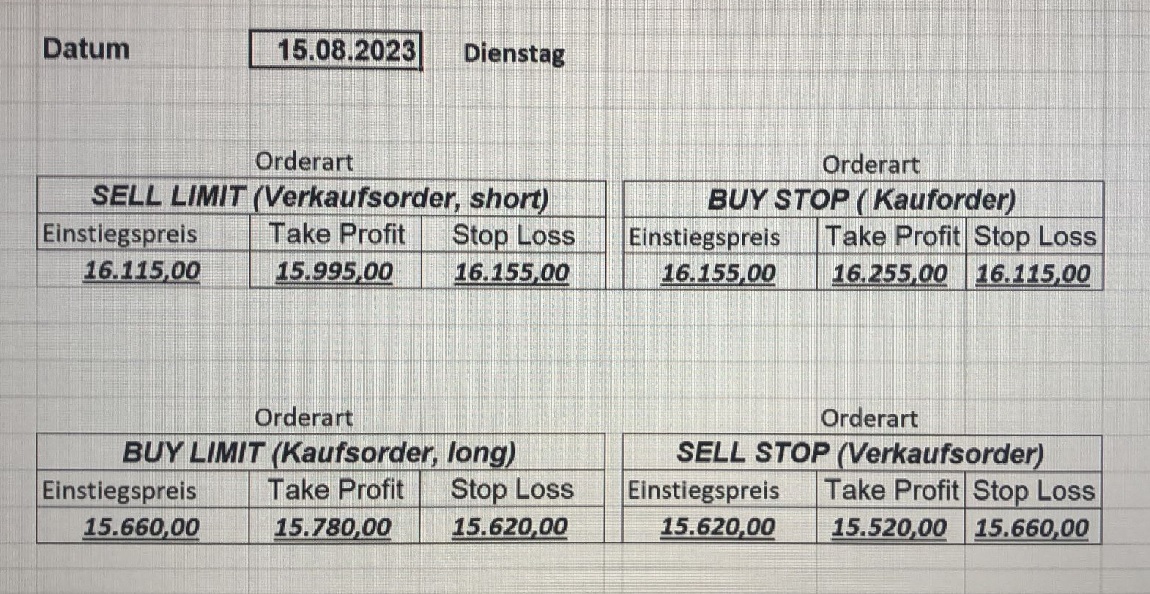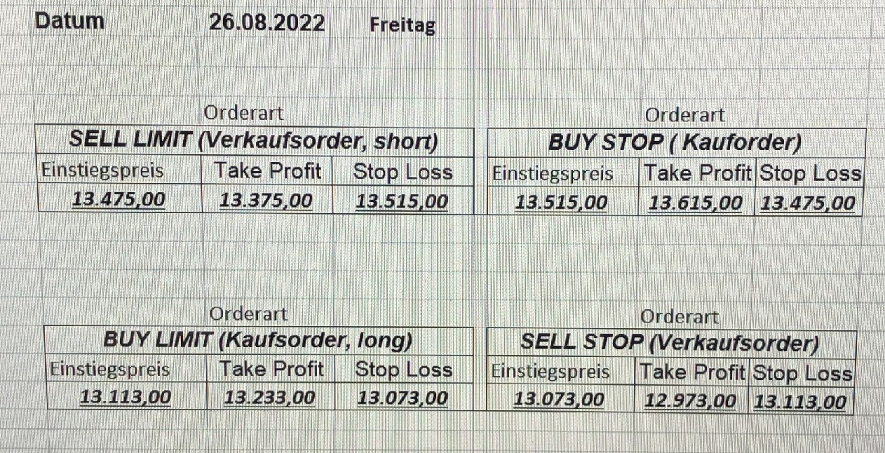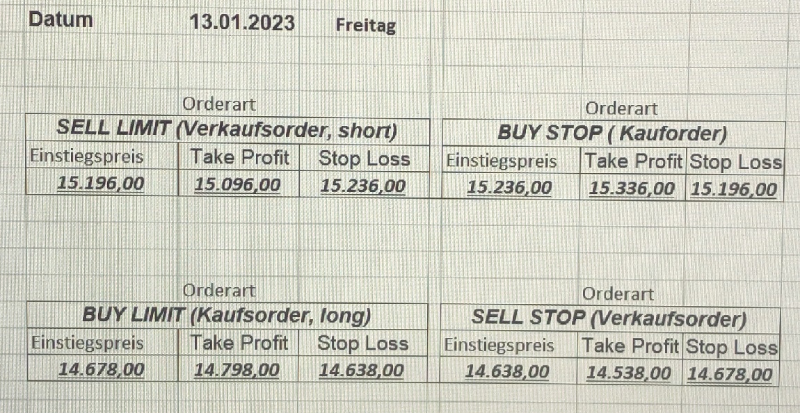 16.5.2023 Platzieren Sie die  Order bis 9:00 Löschen Sie bitte offene Order und Positionen um 21:45 ! Zur Frage der Punktgröße: Beispielrechnung: Bitte immer kurz auf den am weitest entfernten Stopp schauen. Diese Punktzahl sollte nicht mehr als 0,5% bis 1% des Kapitals ausmachen. 15.5.2023 Platzieren Sie die  Order bis 9:00 Löschen Sie bitte offene Order und Positionen um 21:45 ! Zur Frage der Punktgröße: Beispielrechnung: Bitte immer kurz auf den am weitest entfernten Stopp schauen. Diese Punktzahl sollte nicht mehr als 0,5% bis 1% des Kapitals ausmachen. 12.5.2023 Platzieren Sie die  Order bis 9:00 Löschen Sie bitte offene Order und Positionen um 21:45 ! Zur Frage der Punktgröße: Beispielrechnung: Bitte immer kurz auf den am weitest entfernten Stopp schauen. Diese Punktzahl sollte nicht mehr als 0,5% bis 1% des Kapitals ausmachen. 10.5.2023  Platzieren Sie die  Order bis 9:00 Löschen Sie bitte offene Order und Positionen um 21:45 ! Zur Frage der Punktgröße: Beispielrechnung: Bitte immer kurz auf den am weitest entfernten Stopp schauen. Diese Punktzahl sollte nicht mehr als 0,5% bis 1% des Kapitals ausmachen. 9.5.2023 Platzieren Sie die  Order bis 9:00 Löschen Sie bitte offene Order und Positionen um 21:45 ! Zur Frage der Punktgröße: Beispielrechnung: Bitte immer kurz auf den am weitest entfernten Stopp schauen. Diese Punktzahl sollte nicht mehr als 0,5% bis 1% des Kapitals ausmachen.   8.5.2023 Platzieren Sie die  Order bis 9:00 Löschen Sie bitte offene Order und Positionen um 21:45 ! Zur Frage der Punktgröße: Beispielrechnung: Bitte immer kurz auf den am weitest entfernten Stopp schauen. Diese Punktzahl sollte nicht mehr als 0,5% bis 1% des Kapitals ausmachen. 5.5.2023 Platzieren Sie die  Order bis 9:00 Löschen Sie bitte offene Order und Positionen um 21:45 ! Zur Frage der Punktgröße: Beispielrechnung: Bitte immer kurz auf den am weitest entfernten Stopp schauen. Diese Punktzahl sollte nicht mehr als 0,5% bis 1% des Kapitals ausmachen. 4.5.2023 Platzieren Sie die  Order bis 9:00 Löschen Sie bitte offene Order und Positionen um 21:45 ! Zur Frage der Punktgröße: Beispielrechnung: Bitte immer kurz auf den am weitest entfernten Stopp schauen. Diese Punktzahl sollte nicht mehr als 0,5% bis 1% des Kapitals ausmachen. 3.5.2023 Heute abend FED-Sitzung: Wir bleiben heute aus dem Markt! 2.5.2023 Platzieren Sie die  Order bis 9:00 Löschen Sie bitte offene Order und Positionen um 21:45 ! Zur Frage der Punktgröße: Beispielrechnung: Bitte immer kurz auf den am weitest entfernten Stopp schauen. Diese Punktzahl sollte nicht mehr als 0,5% bis 1% des Kapitals ausmachen. 28.4.2023 Platzieren Sie die  Order bis 9:00 Löschen Sie bitte offene Order und Positionen um 21:45 ! Zur Frage der Punktgröße: Beispielrechnung: Bitte immer kurz auf den am weitest entfernten Stopp schauen. Diese Punktzahl sollte nicht mehr als 0,5% bis 1% des Kapitals ausmachen. 27.4.2023 Platzieren Sie die  Order bis 9:00 Löschen Sie bitte offene Order und Positionen um 21:45 ! Zur Frage der Punktgröße: Beispielrechnung: Bitte immer kurz auf den am weitest entfernten Stopp schauen. Diese Punktzahl sollte nicht mehr als 0,5% bis 1% des Kapitals ausmachen. 26.4.2023 Platzieren Sie die  Order bis 9:00 Löschen Sie bitte offene Order und Positionen um 21:45 ! Zur Frage der Punktgröße: Beispielrechnung: Bitte immer kurz auf den am weitest entfernten Stopp schauen. Diese Punktzahl sollte nicht mehr als 0,5% bis 1% des Kapitals ausmachen. 25.4.2023 Platzieren Sie die  Order bis 9:00 Löschen Sie bitte offene Order und Positionen um 21:45 ! Zur Frage der Punktgröße: Beispielrechnung: Bitte immer kurz auf den am weitest entfernten Stopp schauen. Diese Punktzahl sollte nicht mehr als 0,5% bis 1% des Kapitals ausmachen. 24.4.2023 Platzieren Sie die  Order bis 9:00 Löschen Sie bitte offene Order und Positionen um 21:45 ! Zur Frage der Punktgröße: Beispielrechnung: Bitte immer kurz auf den am weitest entfernten Stopp schauen. Diese Punktzahl sollte nicht mehr als 0,5% bis 1% des Kapitals ausmachen. 21.4.2023 Platzieren Sie die  Order bis 9:00 Löschen Sie bitte offene Order und Positionen um 21:45 ! Zur Frage der Punktgröße: Beispielrechnung: Bitte immer kurz auf den am weitest entfernten Stopp schauen. Diese Punktzahl sollte nicht mehr als 0,5% bis 1% des Kapitals ausmachen. Sorry, falscher Wochentag, aber es sind die heutigen Signale!    20.4.2023 Platzieren Sie die  Order bis 9:00 Löschen Sie bitte offene Order und Positionen um 21:45 ! Zur Frage der Punktgröße: Beispielrechnung: Bitte immer kurz auf den am weitest entfernten Stopp schauen. Diese Punktzahl sollte nicht mehr als 0,5% bis 1% des Kapitals ausmachen. 19.4.2023 Platzieren Sie die  Order bis 9:00 Löschen Sie bitte offene Order und Positionen um 21:45 ! Zur Frage der Punktgröße: Beispielrechnung: Bitte immer kurz auf den am weitest entfernten Stopp schauen. Diese Punktzahl sollte nicht mehr als 0,5% bis 1% des Kapitals ausmachen. 18.4.2023 Platzieren Sie die  Order bis 9:00 Löschen Sie bitte offene Order und Positionen um 21:45 ! Zur Frage der Punktgröße: Beispielrechnung: Bitte immer kurz auf den am weitest entfernten Stopp schauen. Diese Punktzahl sollte nicht mehr als 0,5% bis 1% des Kapitals ausmachen.  17.4.2023 Platzieren Sie die  Order bis 9:00 Löschen Sie bitte offene Order und Positionen um 21:45 ! Zur Frage der Punktgröße: Beispielrechnung: Bitte immer kurz auf den am weitest entfernten Stopp schauen. Diese Punktzahl sollte nicht mehr als 0,5% bis 1% des Kapitals ausmachen. 14.4.2023 Platzieren Sie die  Order bis 9:00 Löschen Sie bitte offene Order und Positionen um 21:45 ! Zur Frage der Punktgröße: Beispielrechnung: Bitte immer kurz auf den am weitest entfernten Stopp schauen. Diese Punktzahl sollte nicht mehr als 0,5% bis 1% des Kapitals ausmachen. 13.4.2023 Heute bleiben wir an der Seitenlinie. Aktuell ist der DAX nicht volatil genug!  12.4.2023 Pla