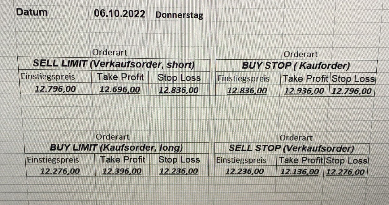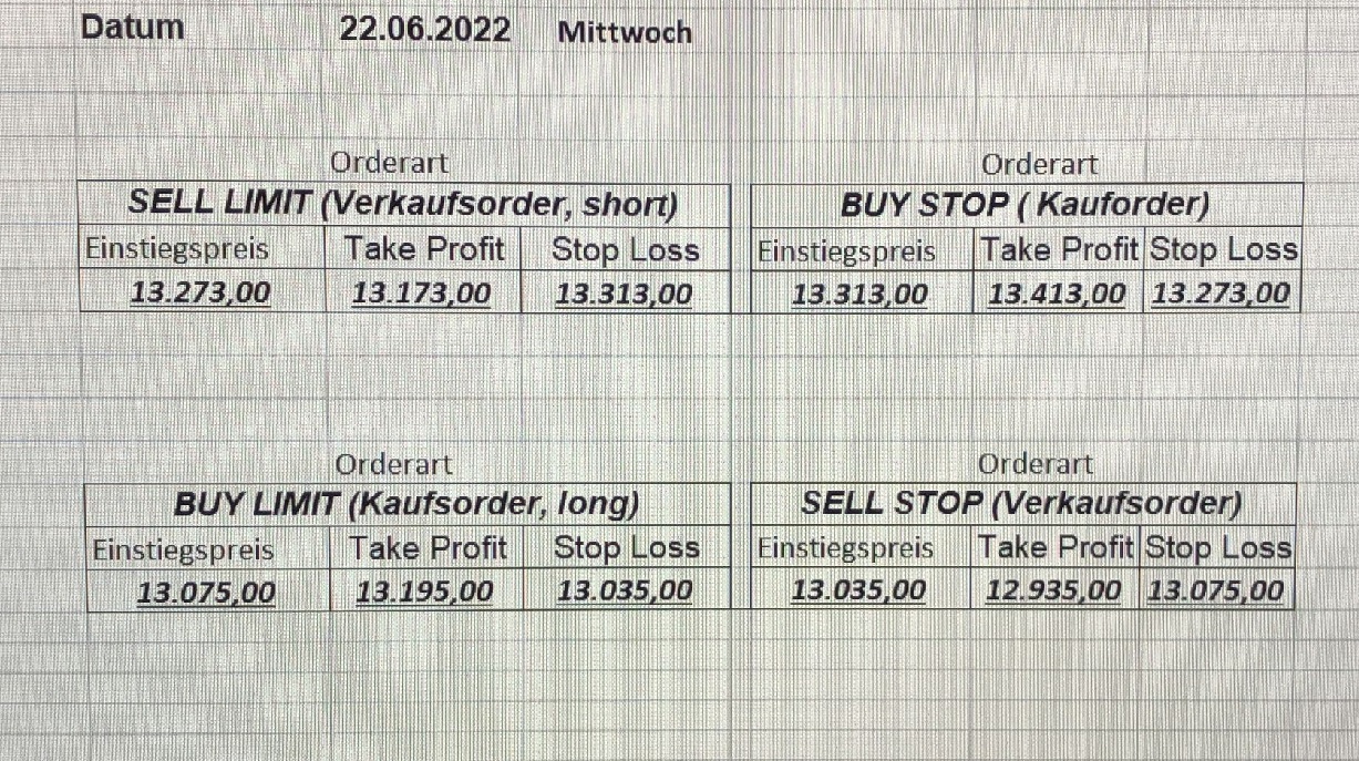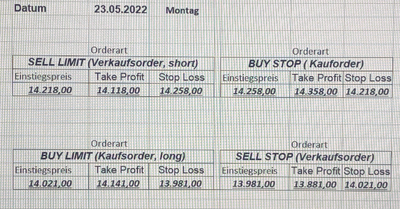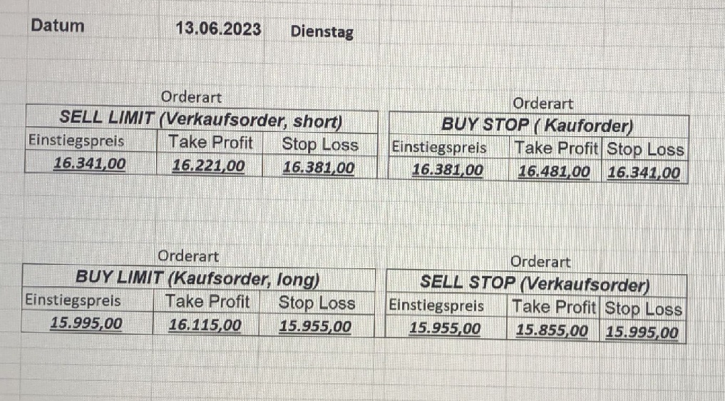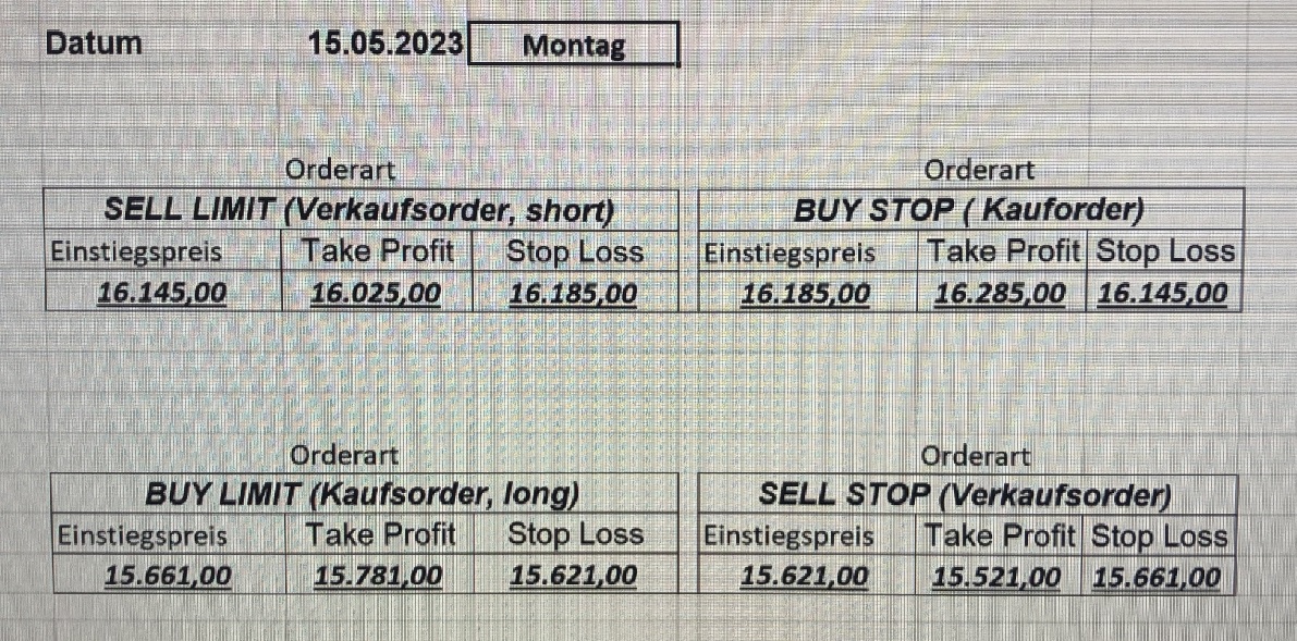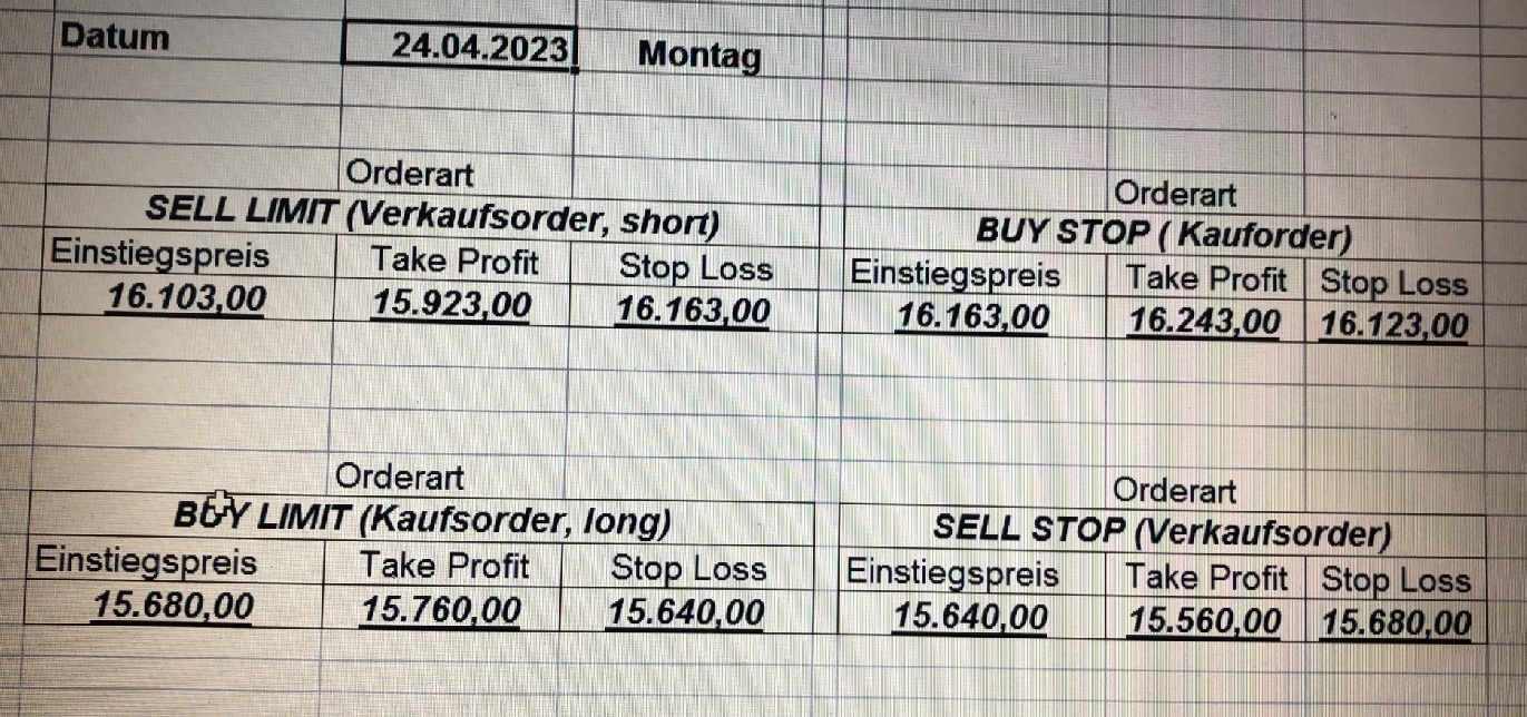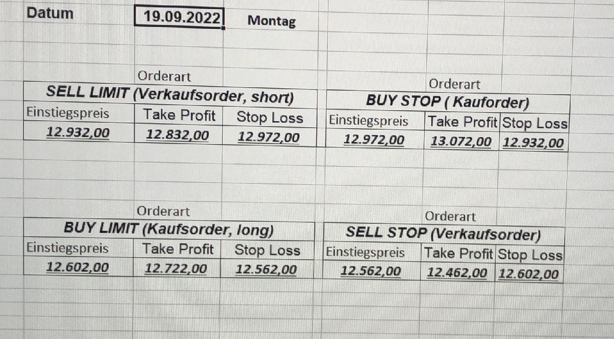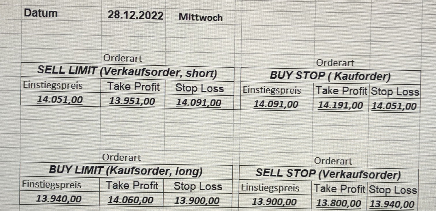 16.5.2023 Platzieren Sie die  Order bis 9:00 Löschen Sie bitte offene Order und Positionen um 21:45 ! Zur Frage der Punktgröße: Beispielrechnung: Bitte immer kurz auf den am weitest entfernten Stopp schauen. Diese Punktzahl sollte nicht mehr als 0,5% bis 1% des Kapitals ausmachen. 15.5.2023 Platzieren Sie die  Order bis 9:00 Löschen Sie bitte offene Order und Positionen um 21:45 ! Zur Frage der Punktgröße: Beispielrechnung: Bitte immer kurz auf den am weitest entfernten Stopp schauen. Diese Punktzahl sollte nicht mehr als 0,5% bis 1% des Kapitals ausmachen. 12.5.2023 Platzieren Sie die  Order bis 9:00 Löschen Sie bitte offene Order und Positionen um 21:45 ! Zur Frage der Punktgröße: Beispielrechnung: Bitte immer kurz auf den am weitest entfernten Stopp schauen. Diese Punktzahl sollte nicht mehr als 0,5% bis 1% des Kapitals ausmachen. 10.5.2023  Platzieren Sie die  Order bis 9:00 Löschen Sie bitte offene Order und Positionen um 21:45 ! Zur Frage der Punktgröße: Beispielrechnung: Bitte immer kurz auf den am weitest entfernten Stopp schauen. Diese Punktzahl sollte nicht mehr als 0,5% bis 1% des Kapitals ausmachen. 9.5.2023 Platzieren Sie die  Order bis 9:00 Löschen Sie bitte offene Order und Positionen um 21:45 ! Zur Frage der Punktgröße: Beispielrechnung: Bitte immer kurz auf den am weitest entfernten Stopp schauen. Diese Punktzahl sollte nicht mehr als 0,5% bis 1% des Kapitals ausmachen.   8.5.2023 Platzieren Sie die  Order bis 9:00 Löschen Sie bitte offene Order und Positionen um 21:45 ! Zur Frage der Punktgröße: Beispielrechnung: Bitte immer kurz auf den am weitest entfernten Stopp schauen. Diese Punktzahl sollte nicht mehr als 0,5% bis 1% des Kapitals ausmachen. 5.5.2023 Platzieren Sie die  Order bis 9:00 Löschen Sie bitte offene Order und Positionen um 21:45 ! Zur Frage der Punktgröße: Beispielrechnung: Bitte immer kurz auf den am weitest entfernten Stopp schauen. Diese Punktzahl sollte nicht mehr als 0,5% bis 1% des Kapitals ausmachen. 4.5.2023 Platzieren Sie die  Order bis 9:00 Löschen Sie bitte offene Order und Positionen um 21:45 ! Zur Frage der Punktgröße: Beispielrechnung: Bitte immer kurz auf den am weitest entfernten Stopp schauen. Diese Punktzahl sollte nicht mehr als 0,5% bis 1% des Kapitals ausmachen. 3.5.2023 Heute abend FED-Sitzung: Wir bleiben heute aus dem Markt! 2.5.2023 Platzieren Sie die  Order bis 9:00 Löschen Sie bitte offene Order und Positionen um 21:45 ! Zur Frage der Punktgröße: Beispielrechnung: Bitte immer kurz auf den am weitest entfernten Stopp schauen. Diese Punktzahl sollte nicht mehr als 0,5% bis 1% des Kapitals ausmachen. 28.4.2023 Platzieren Sie die  Order bis 9:00 Löschen Sie bitte offene Order und Positionen um 21:45 ! Zur Frage der Punktgröße: Beispielrechnung: Bitte immer kurz auf den am weitest entfernten Stopp schauen. Diese Punktzahl sollte nicht mehr als 0,5% bis 1% des Kapitals ausmachen. 27.4.2023 Platzieren Sie die  Order bis 9:00 Löschen Sie bitte offene Order und Positionen um 21:45 ! Zur Frage der Punktgröße: Beispielrechnung: Bitte immer kurz auf den am weitest entfernten Stopp schauen. Diese Punktzahl sollte nicht mehr als 0,5% bis 1% des Kapitals ausmachen. 26.4.2023 Platzieren Sie die  Order bis 9:00 Löschen Sie bitte offene Order und Positionen um 21:45 ! Zur Frage der Punktgröße: Beispielrechnung: Bitte immer kurz auf den am weitest entfernten Stopp schauen. Diese Punktzahl sollte nicht mehr als 0,5% bis 1% des Kapitals ausmachen. 25.4.2023 Platzieren Sie die  Order bis 9:00 Löschen Sie bitte offene Order und Positionen um 21:45 ! Zur Frage der Punktgröße: Beispielrechnung: Bitte immer kurz auf den am weitest entfernten Stopp schauen. Diese Punktzahl sollte nicht mehr als 0,5% bis 1% des Kapitals ausmachen. 24.4.2023 Platzieren Sie die  Order bis 9:00 Löschen Sie bitte offene Order und Positionen um 21:45 ! Zur Frage der Punktgröße: Beispielrechnung: Bitte immer kurz auf den am weitest entfernten Stopp schauen. Diese Punktzahl sollte nicht mehr als 0,5% bis 1% des Kapitals ausmachen. 21.4.2023 Platzieren Sie die  Order bis 9:00 Löschen Sie bitte offene Order und Positionen um 21:45 ! Zur Frage der Punktgröße: Beispielrechnung: Bitte immer kurz auf den am weitest entfernten Stopp schauen. Diese Punktzahl sollte nicht mehr als 0,5% bis 1% des Kapitals ausmachen. Sorry, falscher Wochentag, aber es sind die heutigen Signale!    20.4.2023 Platzieren Sie die  Order bis 9:00 Löschen Sie bitte offene Order und Positionen um 21:45 ! Zur Frage der Punktgröße: Beispielrechnung: Bitte immer kurz auf den am weitest entfernten Stopp schauen. Diese Punktzahl sollte nicht mehr als 0,5% bis 1% des Kapitals ausmachen. 19.4.2023 Platzieren Sie die  Order bis 9:00 Löschen Sie bitte offene Order und Positionen um 21:45 ! Zur Frage der Punktgröße: Beispielrechnung: Bitte immer kurz auf den am weitest entfernten Stopp schauen. Diese Punktzahl sollte nicht mehr als 0,5% bis 1% des Kapitals ausmachen. 18.4.2023 Platzieren Sie die  Order bis 9:00 Löschen Sie bitte offene Order und Positionen um 21:45 ! Zur Frage der Punktgröße: Beispielrechnung: Bitte immer kurz auf den am weitest entfernten Stopp schauen. Diese Punktzahl sollte nicht mehr als 0,5% bis 1% des Kapitals ausmachen.  17.4.2023 Platzieren Sie die  Order bis 9:00 Löschen Sie bitte offene Order und Positionen um 21:45 ! Zur Frage der Punktgröße: Beispielrechnung: Bitte immer kurz auf den am weitest entfernten Stopp schauen. Diese Punktzahl sollte nicht mehr als 0,5% bis 1% des Kapitals ausmachen. 14.4.2023 Platzieren Sie die  Order bis 9:00 Löschen Sie bitte offene Order und Positionen um 21:45 ! Zur Frage der Punktgröße: Beispielrechnung: Bitte immer kurz auf den am weitest entfernten Stopp schauen. Diese Punktzahl sollte nicht mehr als 0,5% bis 1% des Kapitals ausmachen. 13.4.2023 Heute bleiben wir an der Seitenlinie. Aktuell ist der DAX nicht volatil genug!  12.4.2023 Pla