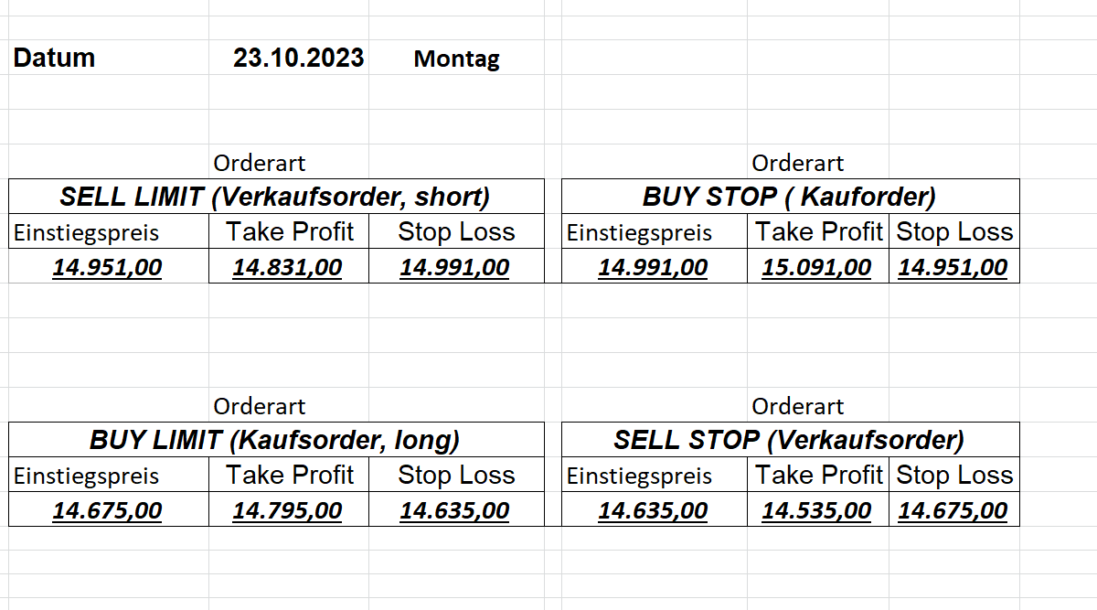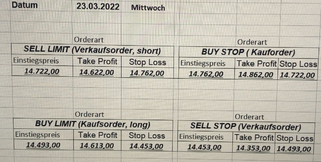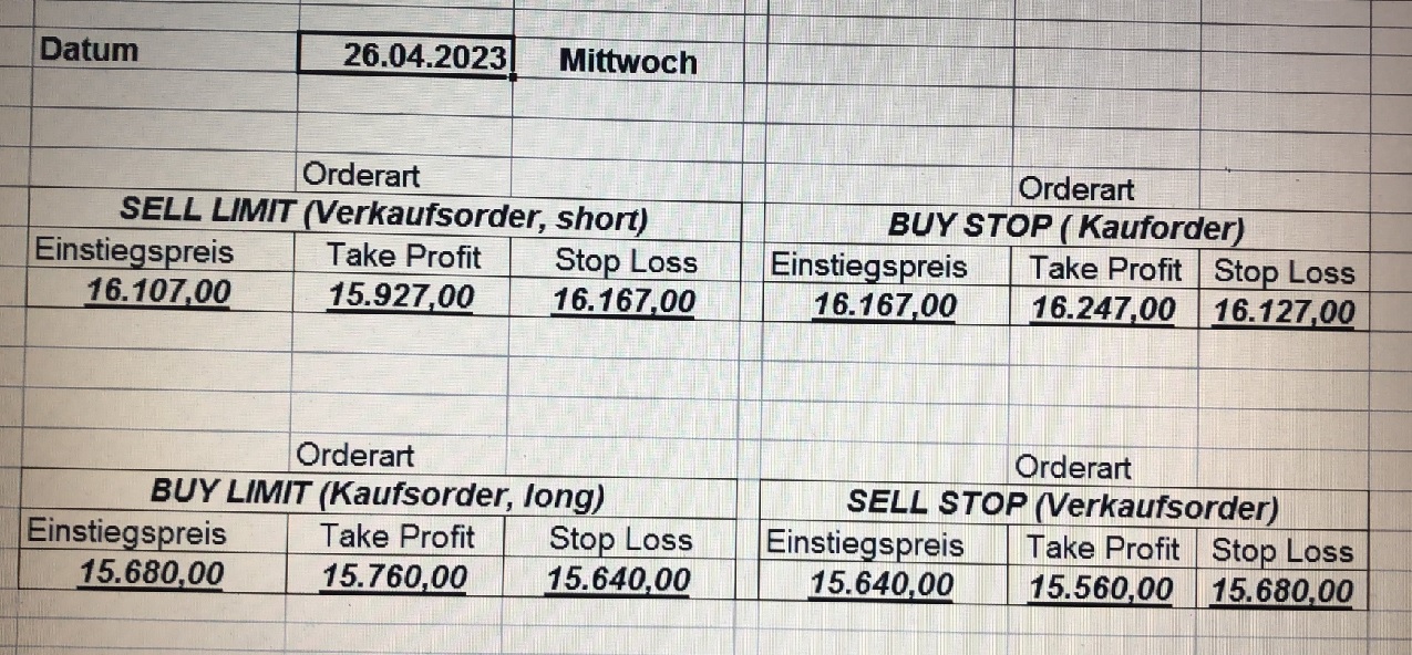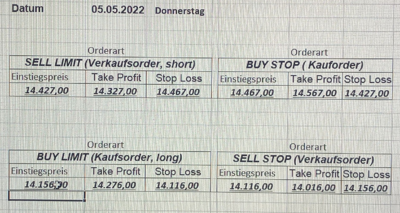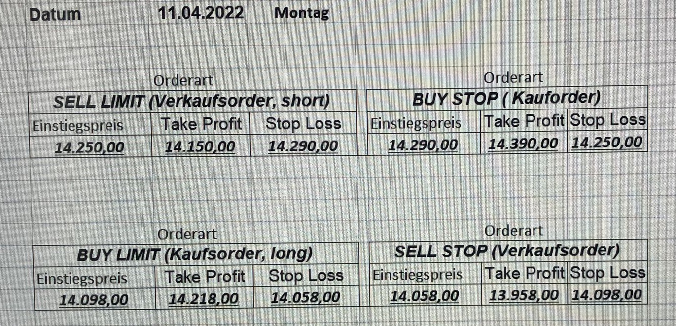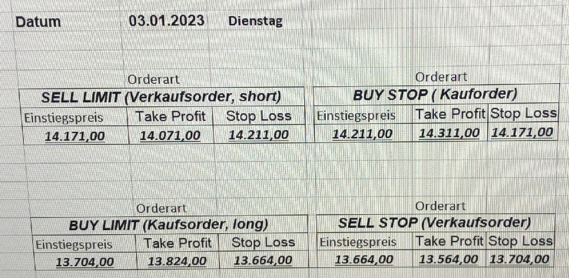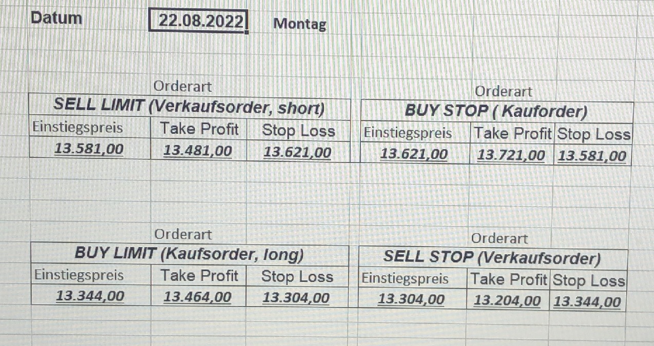 16.5.2023 Platzieren Sie die  Order bis 9:00 Löschen Sie bitte offene Order und Positionen um 21:45 ! Zur Frage der Punktgröße: Beispielrechnung: Bitte immer kurz auf den am weitest entfernten Stopp schauen. Diese Punktzahl sollte nicht mehr als 0,5% bis 1% des Kapitals ausmachen. 15.5.2023 Platzieren Sie die  Order bis 9:00 Löschen Sie bitte offene Order und Positionen um 21:45 ! Zur Frage der Punktgröße: Beispielrechnung: Bitte immer kurz auf den am weitest entfernten Stopp schauen. Diese Punktzahl sollte nicht mehr als 0,5% bis 1% des Kapitals ausmachen. 12.5.2023 Platzieren Sie die  Order bis 9:00 Löschen Sie bitte offene Order und Positionen um 21:45 ! Zur Frage der Punktgröße: Beispielrechnung: Bitte immer kurz auf den am weitest entfernten Stopp schauen. Diese Punktzahl sollte nicht mehr als 0,5% bis 1% des Kapitals ausmachen. 10.5.2023  Platzieren Sie die  Order bis 9:00 Löschen Sie bitte offene Order und Positionen um 21:45 ! Zur Frage der Punktgröße: Beispielrechnung: Bitte immer kurz auf den am weitest entfernten Stopp schauen. Diese Punktzahl sollte nicht mehr als 0,5% bis 1% des Kapitals ausmachen. 9.5.2023 Platzieren Sie die  Order bis 9:00 Löschen Sie bitte offene Order und Positionen um 21:45 ! Zur Frage der Punktgröße: Beispielrechnung: Bitte immer kurz auf den am weitest entfernten Stopp schauen. Diese Punktzahl sollte nicht mehr als 0,5% bis 1% des Kapitals ausmachen.   8.5.2023 Platzieren Sie die  Order bis 9:00 Löschen Sie bitte offene Order und Positionen um 21:45 ! Zur Frage der Punktgröße: Beispielrechnung: Bitte immer kurz auf den am weitest entfernten Stopp schauen. Diese Punktzahl sollte nicht mehr als 0,5% bis 1% des Kapitals ausmachen. 5.5.2023 Platzieren Sie die  Order bis 9:00 Löschen Sie bitte offene Order und Positionen um 21:45 ! Zur Frage der Punktgröße: Beispielrechnung: Bitte immer kurz auf den am weitest entfernten Stopp schauen. Diese Punktzahl sollte nicht mehr als 0,5% bis 1% des Kapitals ausmachen. 4.5.2023 Platzieren Sie die  Order bis 9:00 Löschen Sie bitte offene Order und Positionen um 21:45 ! Zur Frage der Punktgröße: Beispielrechnung: Bitte immer kurz auf den am weitest entfernten Stopp schauen. Diese Punktzahl sollte nicht mehr als 0,5% bis 1% des Kapitals ausmachen. 3.5.2023 Heute abend FED-Sitzung: Wir bleiben heute aus dem Markt! 2.5.2023 Platzieren Sie die  Order bis 9:00 Löschen Sie bitte offene Order und Positionen um 21:45 ! Zur Frage der Punktgröße: Beispielrechnung: Bitte immer kurz auf den am weitest entfernten Stopp schauen. Diese Punktzahl sollte nicht mehr als 0,5% bis 1% des Kapitals ausmachen. 28.4.2023 Platzieren Sie die  Order bis 9:00 Löschen Sie bitte offene Order und Positionen um 21:45 ! Zur Frage der Punktgröße: Beispielrechnung: Bitte immer kurz auf den am weitest entfernten Stopp schauen. Diese Punktzahl sollte nicht mehr als 0,5% bis 1% des Kapitals ausmachen. 27.4.2023 Platzieren Sie die  Order bis 9:00 Löschen Sie bitte offene Order und Positionen um 21:45 ! Zur Frage der Punktgröße: Beispielrechnung: Bitte immer kurz auf den am weitest entfernten Stopp schauen. Diese Punktzahl sollte nicht mehr als 0,5% bis 1% des Kapitals ausmachen. 26.4.2023 Platzieren Sie die  Order bis 9:00 Löschen Sie bitte offene Order und Positionen um 21:45 ! Zur Frage der Punktgröße: Beispielrechnung: Bitte immer kurz auf den am weitest entfernten Stopp schauen. Diese Punktzahl sollte nicht mehr als 0,5% bis 1% des Kapitals ausmachen. 25.4.2023 Platzieren Sie die  Order bis 9:00 Löschen Sie bitte offene Order und Positionen um 21:45 ! Zur Frage der Punktgröße: Beispielrechnung: Bitte immer kurz auf den am weitest entfernten Stopp schauen. Diese Punktzahl sollte nicht mehr als 0,5% bis 1% des Kapitals ausmachen. 24.4.2023 Platzieren Sie die  Order bis 9:00 Löschen Sie bitte offene Order und Positionen um 21:45 ! Zur Frage der Punktgröße: Beispielrechnung: Bitte immer kurz auf den am weitest entfernten Stopp schauen. Diese Punktzahl sollte nicht mehr als 0,5% bis 1% des Kapitals ausmachen. 21.4.2023 Platzieren Sie die  Order bis 9:00 Löschen Sie bitte offene Order und Positionen um 21:45 ! Zur Frage der Punktgröße: Beispielrechnung: Bitte immer kurz auf den am weitest entfernten Stopp schauen. Diese Punktzahl sollte nicht mehr als 0,5% bis 1% des Kapitals ausmachen. Sorry, falscher Wochentag, aber es sind die heutigen Signale!    20.4.2023 Platzieren Sie die  Order bis 9:00 Löschen Sie bitte offene Order und Positionen um 21:45 ! Zur Frage der Punktgröße: Beispielrechnung: Bitte immer kurz auf den am weitest entfernten Stopp schauen. Diese Punktzahl sollte nicht mehr als 0,5% bis 1% des Kapitals ausmachen. 19.4.2023 Platzieren Sie die  Order bis 9:00 Löschen Sie bitte offene Order und Positionen um 21:45 ! Zur Frage der Punktgröße: Beispielrechnung: Bitte immer kurz auf den am weitest entfernten Stopp schauen. Diese Punktzahl sollte nicht mehr als 0,5% bis 1% des Kapitals ausmachen. 18.4.2023 Platzieren Sie die  Order bis 9:00 Löschen Sie bitte offene Order und Positionen um 21:45 ! Zur Frage der Punktgröße: Beispielrechnung: Bitte immer kurz auf den am weitest entfernten Stopp schauen. Diese Punktzahl sollte nicht mehr als 0,5% bis 1% des Kapitals ausmachen.  17.4.2023 Platzieren Sie die  Order bis 9:00 Löschen Sie bitte offene Order und Positionen um 21:45 ! Zur Frage der Punktgröße: Beispielrechnung: Bitte immer kurz auf den am weitest entfernten Stopp schauen. Diese Punktzahl sollte nicht mehr als 0,5% bis 1% des Kapitals ausmachen. 14.4.2023 Platzieren Sie die  Order bis 9:00 Löschen Sie bitte offene Order und Positionen um 21:45 ! Zur Frage der Punktgröße: Beispielrechnung: Bitte immer kurz auf den am weitest entfernten Stopp schauen. Diese Punktzahl sollte nicht mehr als 0,5% bis 1% des Kapitals ausmachen. 13.4.2023 Heute bleiben wir an der Seitenlinie. Aktuell ist der DAX nicht volatil genug!  12.4.2023 Pla