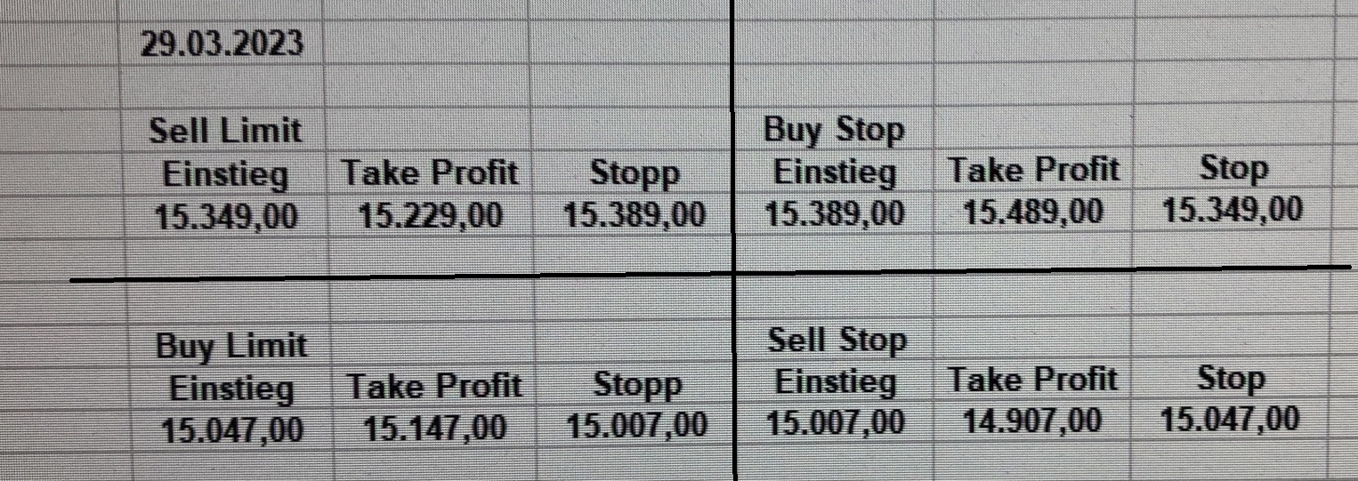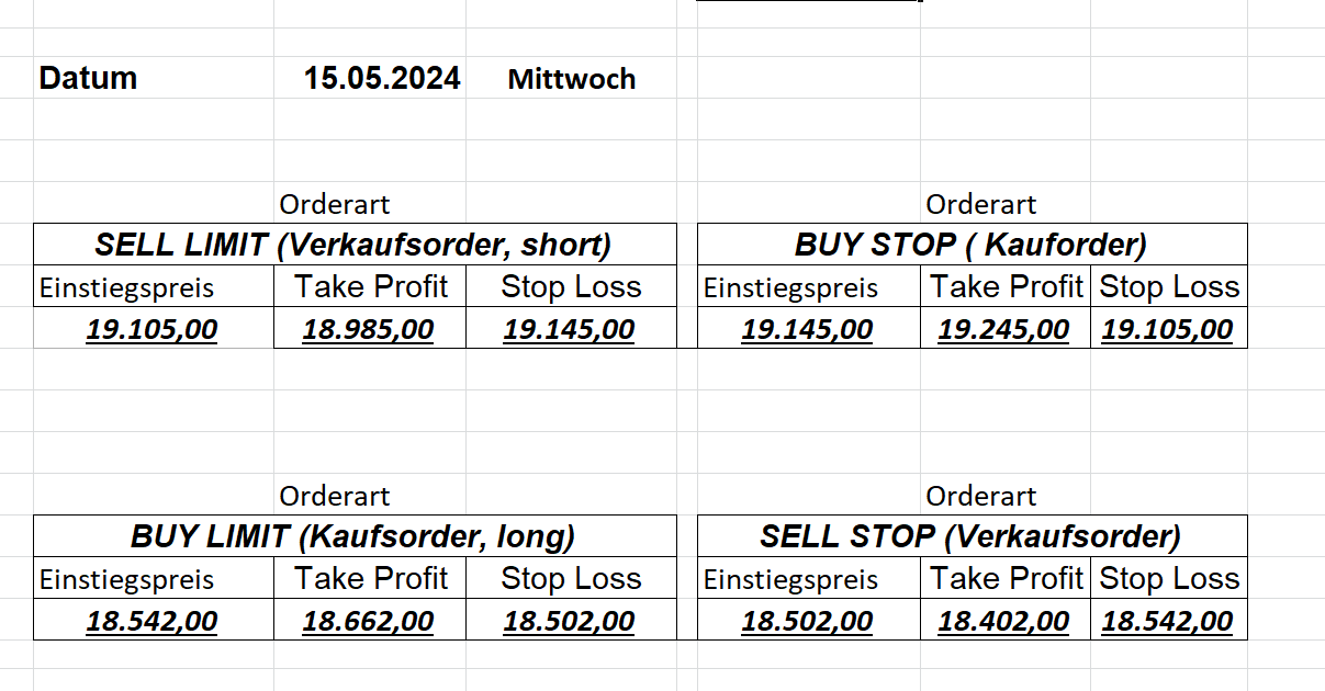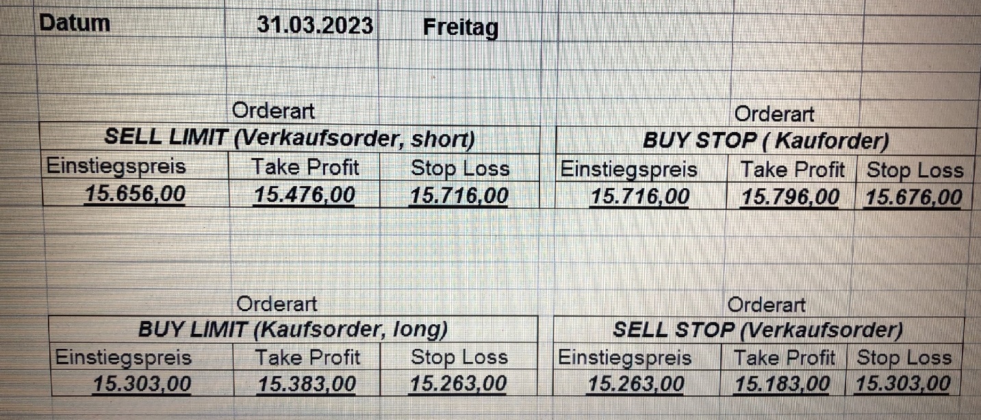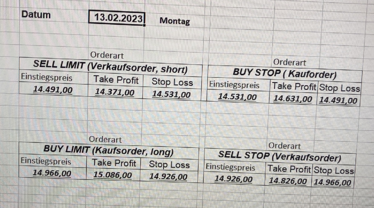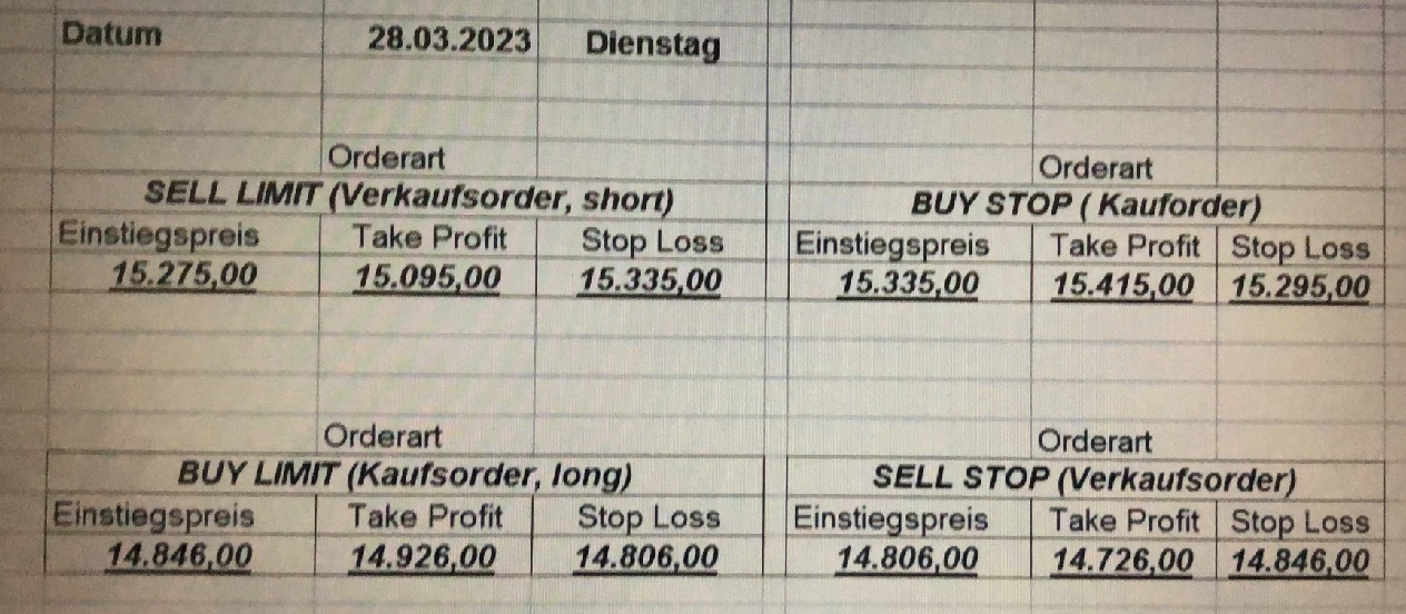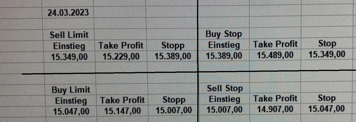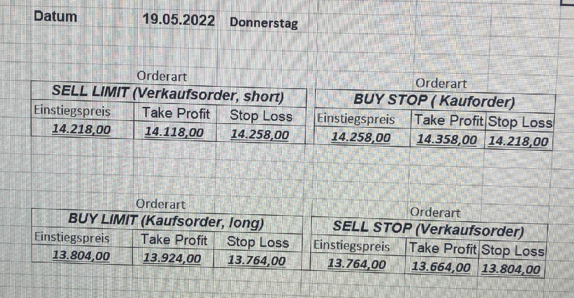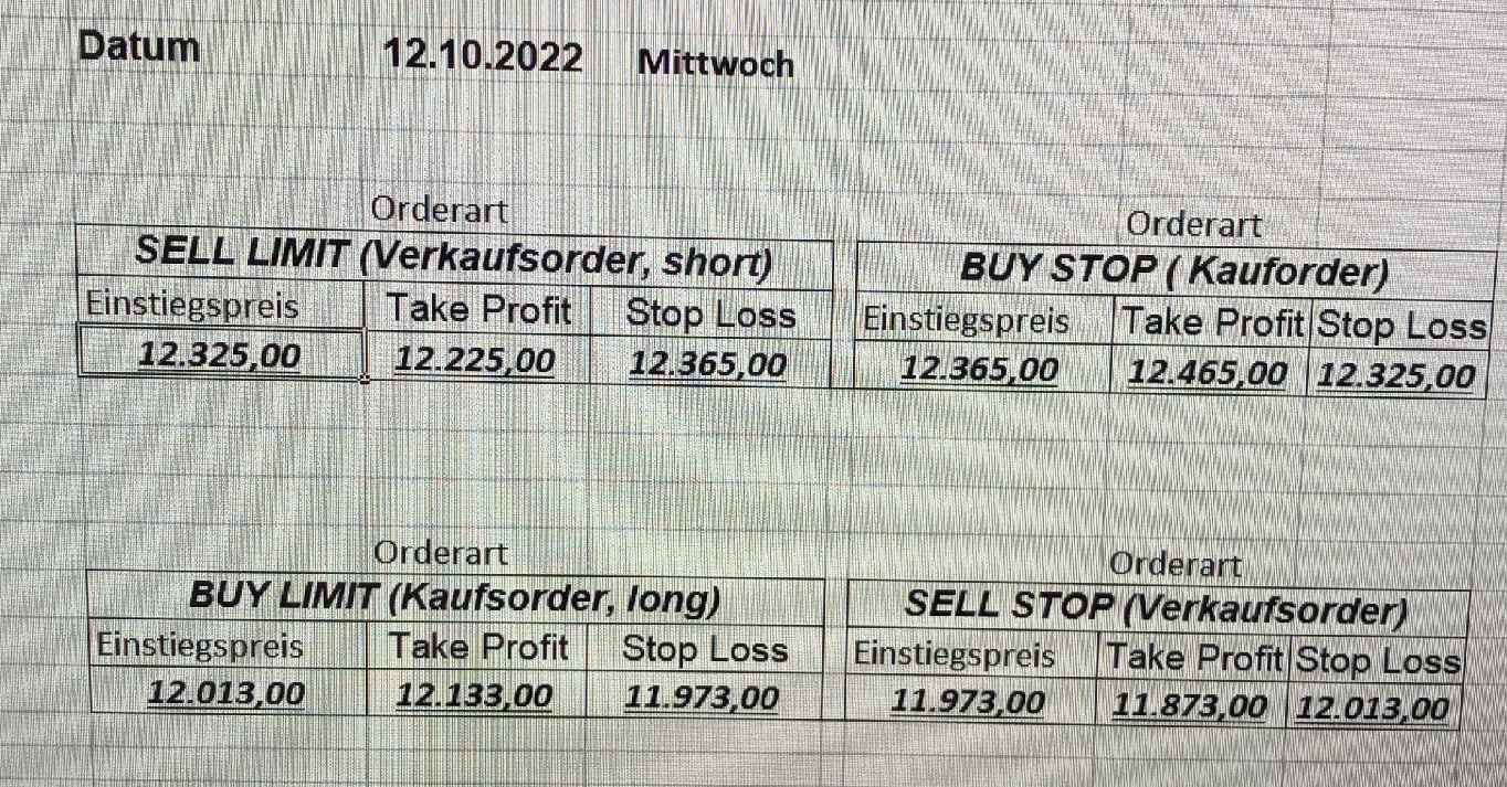 16.5.2023 Platzieren Sie die  Order bis 9:00 Löschen Sie bitte offene Order und Positionen um 21:45 ! Zur Frage der Punktgröße: Beispielrechnung: Bitte immer kurz auf den am weitest entfernten Stopp schauen. Diese Punktzahl sollte nicht mehr als 0,5% bis 1% des Kapitals ausmachen. 15.5.2023 Platzieren Sie die  Order bis 9:00 Löschen Sie bitte offene Order und Positionen um 21:45 ! Zur Frage der Punktgröße: Beispielrechnung: Bitte immer kurz auf den am weitest entfernten Stopp schauen. Diese Punktzahl sollte nicht mehr als 0,5% bis 1% des Kapitals ausmachen. 12.5.2023 Platzieren Sie die  Order bis 9:00 Löschen Sie bitte offene Order und Positionen um 21:45 ! Zur Frage der Punktgröße: Beispielrechnung: Bitte immer kurz auf den am weitest entfernten Stopp schauen. Diese Punktzahl sollte nicht mehr als 0,5% bis 1% des Kapitals ausmachen. 10.5.2023  Platzieren Sie die  Order bis 9:00 Löschen Sie bitte offene Order und Positionen um 21:45 ! Zur Frage der Punktgröße: Beispielrechnung: Bitte immer kurz auf den am weitest entfernten Stopp schauen. Diese Punktzahl sollte nicht mehr als 0,5% bis 1% des Kapitals ausmachen. 9.5.2023 Platzieren Sie die  Order bis 9:00 Löschen Sie bitte offene Order und Positionen um 21:45 ! Zur Frage der Punktgröße: Beispielrechnung: Bitte immer kurz auf den am weitest entfernten Stopp schauen. Diese Punktzahl sollte nicht mehr als 0,5% bis 1% des Kapitals ausmachen.   8.5.2023 Platzieren Sie die  Order bis 9:00 Löschen Sie bitte offene Order und Positionen um 21:45 ! Zur Frage der Punktgröße: Beispielrechnung: Bitte immer kurz auf den am weitest entfernten Stopp schauen. Diese Punktzahl sollte nicht mehr als 0,5% bis 1% des Kapitals ausmachen. 5.5.2023 Platzieren Sie die  Order bis 9:00 Löschen Sie bitte offene Order und Positionen um 21:45 ! Zur Frage der Punktgröße: Beispielrechnung: Bitte immer kurz auf den am weitest entfernten Stopp schauen. Diese Punktzahl sollte nicht mehr als 0,5% bis 1% des Kapitals ausmachen. 4.5.2023 Platzieren Sie die  Order bis 9:00 Löschen Sie bitte offene Order und Positionen um 21:45 ! Zur Frage der Punktgröße: Beispielrechnung: Bitte immer kurz auf den am weitest entfernten Stopp schauen. Diese Punktzahl sollte nicht mehr als 0,5% bis 1% des Kapitals ausmachen. 3.5.2023 Heute abend FED-Sitzung: Wir bleiben heute aus dem Markt! 2.5.2023 Platzieren Sie die  Order bis 9:00 Löschen Sie bitte offene Order und Positionen um 21:45 ! Zur Frage der Punktgröße: Beispielrechnung: Bitte immer kurz auf den am weitest entfernten Stopp schauen. Diese Punktzahl sollte nicht mehr als 0,5% bis 1% des Kapitals ausmachen. 28.4.2023 Platzieren Sie die  Order bis 9:00 Löschen Sie bitte offene Order und Positionen um 21:45 ! Zur Frage der Punktgröße: Beispielrechnung: Bitte immer kurz auf den am weitest entfernten Stopp schauen. Diese Punktzahl sollte nicht mehr als 0,5% bis 1% des Kapitals ausmachen. 27.4.2023 Platzieren Sie die  Order bis 9:00 Löschen Sie bitte offene Order und Positionen um 21:45 ! Zur Frage der Punktgröße: Beispielrechnung: Bitte immer kurz auf den am weitest entfernten Stopp schauen. Diese Punktzahl sollte nicht mehr als 0,5% bis 1% des Kapitals ausmachen. 26.4.2023 Platzieren Sie die  Order bis 9:00 Löschen Sie bitte offene Order und Positionen um 21:45 ! Zur Frage der Punktgröße: Beispielrechnung: Bitte immer kurz auf den am weitest entfernten Stopp schauen. Diese Punktzahl sollte nicht mehr als 0,5% bis 1% des Kapitals ausmachen. 25.4.2023 Platzieren Sie die  Order bis 9:00 Löschen Sie bitte offene Order und Positionen um 21:45 ! Zur Frage der Punktgröße: Beispielrechnung: Bitte immer kurz auf den am weitest entfernten Stopp schauen. Diese Punktzahl sollte nicht mehr als 0,5% bis 1% des Kapitals ausmachen. 24.4.2023 Platzieren Sie die  Order bis 9:00 Löschen Sie bitte offene Order und Positionen um 21:45 ! Zur Frage der Punktgröße: Beispielrechnung: Bitte immer kurz auf den am weitest entfernten Stopp schauen. Diese Punktzahl sollte nicht mehr als 0,5% bis 1% des Kapitals ausmachen. 21.4.2023 Platzieren Sie die  Order bis 9:00 Löschen Sie bitte offene Order und Positionen um 21:45 ! Zur Frage der Punktgröße: Beispielrechnung: Bitte immer kurz auf den am weitest entfernten Stopp schauen. Diese Punktzahl sollte nicht mehr als 0,5% bis 1% des Kapitals ausmachen. Sorry, falscher Wochentag, aber es sind die heutigen Signale!    20.4.2023 Platzieren Sie die  Order bis 9:00 Löschen Sie bitte offene Order und Positionen um 21:45 ! Zur Frage der Punktgröße: Beispielrechnung: Bitte immer kurz auf den am weitest entfernten Stopp schauen. Diese Punktzahl sollte nicht mehr als 0,5% bis 1% des Kapitals ausmachen. 19.4.2023 Platzieren Sie die  Order bis 9:00 Löschen Sie bitte offene Order und Positionen um 21:45 ! Zur Frage der Punktgröße: Beispielrechnung: Bitte immer kurz auf den am weitest entfernten Stopp schauen. Diese Punktzahl sollte nicht mehr als 0,5% bis 1% des Kapitals ausmachen. 18.4.2023 Platzieren Sie die  Order bis 9:00 Löschen Sie bitte offene Order und Positionen um 21:45 ! Zur Frage der Punktgröße: Beispielrechnung: Bitte immer kurz auf den am weitest entfernten Stopp schauen. Diese Punktzahl sollte nicht mehr als 0,5% bis 1% des Kapitals ausmachen.  17.4.2023 Platzieren Sie die  Order bis 9:00 Löschen Sie bitte offene Order und Positionen um 21:45 ! Zur Frage der Punktgröße: Beispielrechnung: Bitte immer kurz auf den am weitest entfernten Stopp schauen. Diese Punktzahl sollte nicht mehr als 0,5% bis 1% des Kapitals ausmachen. 14.4.2023 Platzieren Sie die  Order bis 9:00 Löschen Sie bitte offene Order und Positionen um 21:45 ! Zur Frage der Punktgröße: Beispielrechnung: Bitte immer kurz auf den am weitest entfernten Stopp schauen. Diese Punktzahl sollte nicht mehr als 0,5% bis 1% des Kapitals ausmachen. 13.4.2023 Heute bleiben wir an der Seitenlinie. Aktuell ist der DAX nicht volatil genug!  12.4.2023 Pla