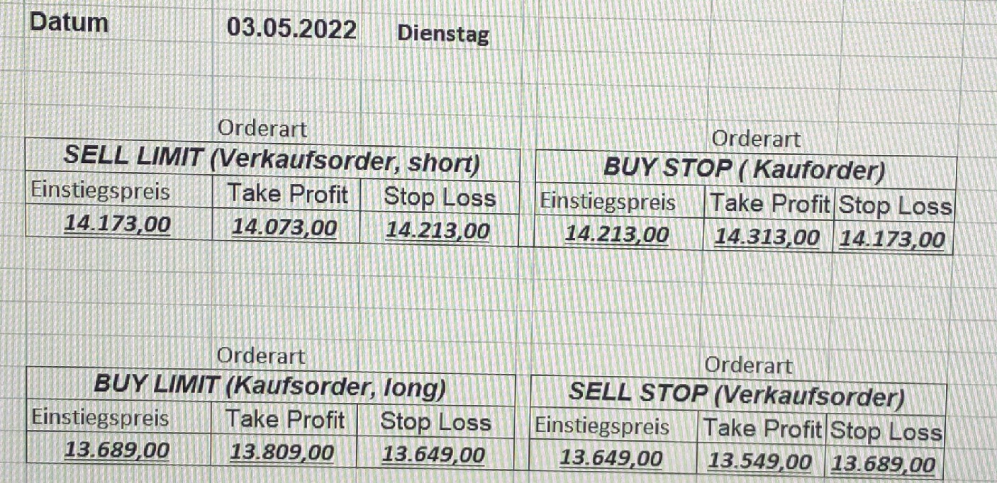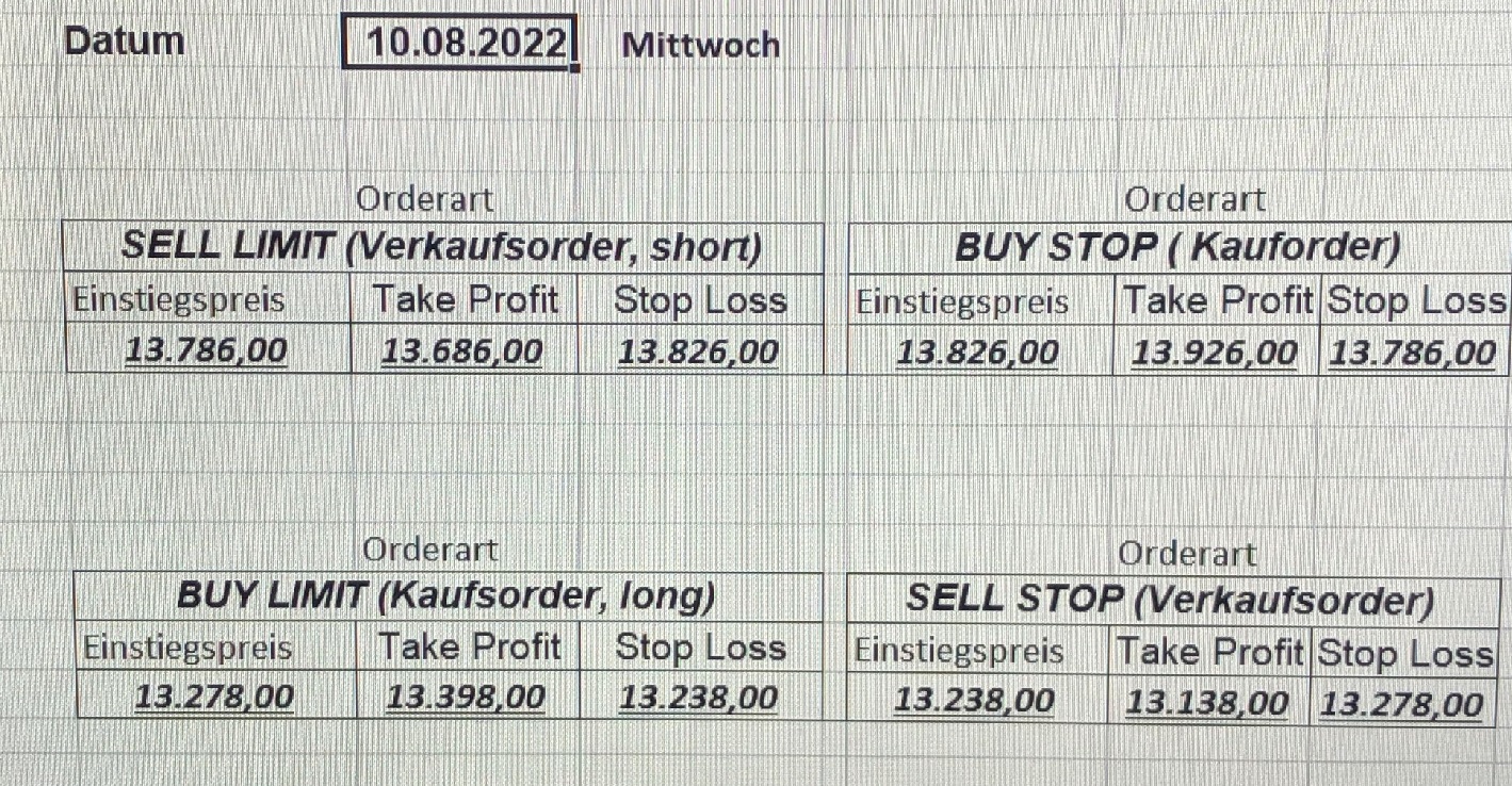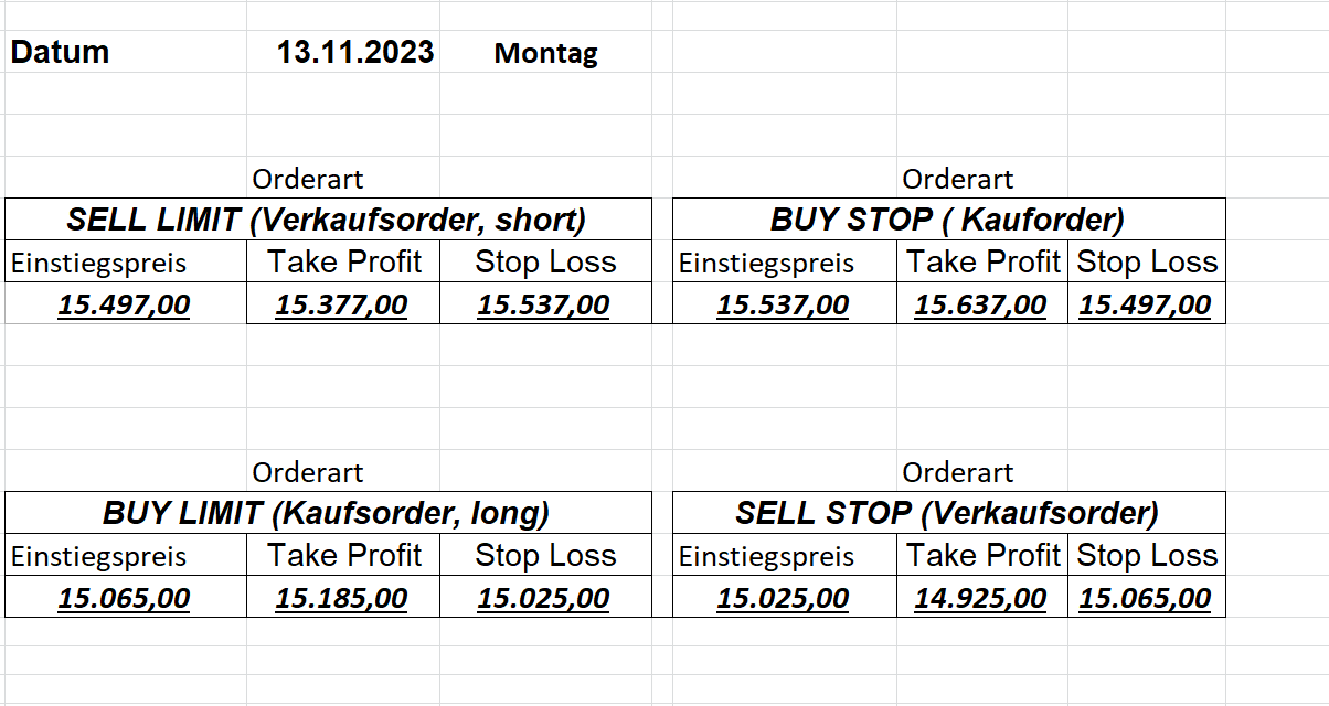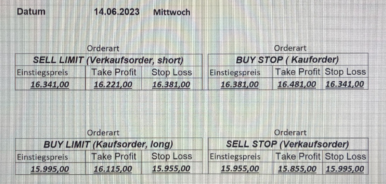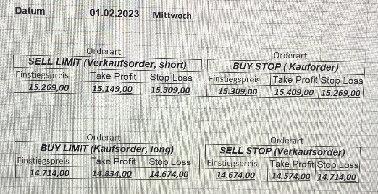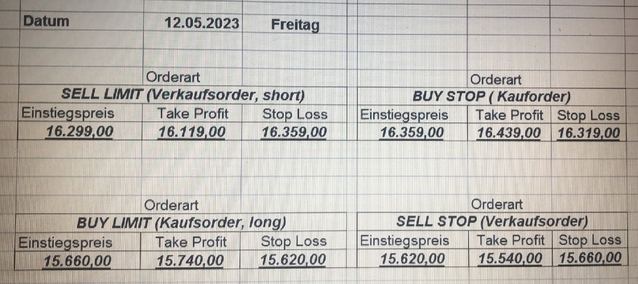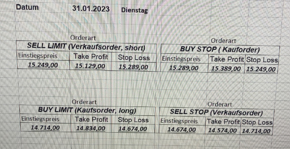 16.5.2023 Platzieren Sie die  Order bis 9:00 Löschen Sie bitte offene Order und Positionen um 21:45 ! Zur Frage der Punktgröße: Beispielrechnung: Bitte immer kurz auf den am weitest entfernten Stopp schauen. Diese Punktzahl sollte nicht mehr als 0,5% bis 1% des Kapitals ausmachen. 15.5.2023 Platzieren Sie die  Order bis 9:00 Löschen Sie bitte offene Order und Positionen um 21:45 ! Zur Frage der Punktgröße: Beispielrechnung: Bitte immer kurz auf den am weitest entfernten Stopp schauen. Diese Punktzahl sollte nicht mehr als 0,5% bis 1% des Kapitals ausmachen. 12.5.2023 Platzieren Sie die  Order bis 9:00 Löschen Sie bitte offene Order und Positionen um 21:45 ! Zur Frage der Punktgröße: Beispielrechnung: Bitte immer kurz auf den am weitest entfernten Stopp schauen. Diese Punktzahl sollte nicht mehr als 0,5% bis 1% des Kapitals ausmachen. 10.5.2023  Platzieren Sie die  Order bis 9:00 Löschen Sie bitte offene Order und Positionen um 21:45 ! Zur Frage der Punktgröße: Beispielrechnung: Bitte immer kurz auf den am weitest entfernten Stopp schauen. Diese Punktzahl sollte nicht mehr als 0,5% bis 1% des Kapitals ausmachen. 9.5.2023 Platzieren Sie die  Order bis 9:00 Löschen Sie bitte offene Order und Positionen um 21:45 ! Zur Frage der Punktgröße: Beispielrechnung: Bitte immer kurz auf den am weitest entfernten Stopp schauen. Diese Punktzahl sollte nicht mehr als 0,5% bis 1% des Kapitals ausmachen.   8.5.2023 Platzieren Sie die  Order bis 9:00 Löschen Sie bitte offene Order und Positionen um 21:45 ! Zur Frage der Punktgröße: Beispielrechnung: Bitte immer kurz auf den am weitest entfernten Stopp schauen. Diese Punktzahl sollte nicht mehr als 0,5% bis 1% des Kapitals ausmachen. 5.5.2023 Platzieren Sie die  Order bis 9:00 Löschen Sie bitte offene Order und Positionen um 21:45 ! Zur Frage der Punktgröße: Beispielrechnung: Bitte immer kurz auf den am weitest entfernten Stopp schauen. Diese Punktzahl sollte nicht mehr als 0,5% bis 1% des Kapitals ausmachen. 4.5.2023 Platzieren Sie die  Order bis 9:00 Löschen Sie bitte offene Order und Positionen um 21:45 ! Zur Frage der Punktgröße: Beispielrechnung: Bitte immer kurz auf den am weitest entfernten Stopp schauen. Diese Punktzahl sollte nicht mehr als 0,5% bis 1% des Kapitals ausmachen. 3.5.2023 Heute abend FED-Sitzung: Wir bleiben heute aus dem Markt! 2.5.2023 Platzieren Sie die  Order bis 9:00 Löschen Sie bitte offene Order und Positionen um 21:45 ! Zur Frage der Punktgröße: Beispielrechnung: Bitte immer kurz auf den am weitest entfernten Stopp schauen. Diese Punktzahl sollte nicht mehr als 0,5% bis 1% des Kapitals ausmachen. 28.4.2023 Platzieren Sie die  Order bis 9:00 Löschen Sie bitte offene Order und Positionen um 21:45 ! Zur Frage der Punktgröße: Beispielrechnung: Bitte immer kurz auf den am weitest entfernten Stopp schauen. Diese Punktzahl sollte nicht mehr als 0,5% bis 1% des Kapitals ausmachen. 27.4.2023 Platzieren Sie die  Order bis 9:00 Löschen Sie bitte offene Order und Positionen um 21:45 ! Zur Frage der Punktgröße: Beispielrechnung: Bitte immer kurz auf den am weitest entfernten Stopp schauen. Diese Punktzahl sollte nicht mehr als 0,5% bis 1% des Kapitals ausmachen. 26.4.2023 Platzieren Sie die  Order bis 9:00 Löschen Sie bitte offene Order und Positionen um 21:45 ! Zur Frage der Punktgröße: Beispielrechnung: Bitte immer kurz auf den am weitest entfernten Stopp schauen. Diese Punktzahl sollte nicht mehr als 0,5% bis 1% des Kapitals ausmachen. 25.4.2023 Platzieren Sie die  Order bis 9:00 Löschen Sie bitte offene Order und Positionen um 21:45 ! Zur Frage der Punktgröße: Beispielrechnung: Bitte immer kurz auf den am weitest entfernten Stopp schauen. Diese Punktzahl sollte nicht mehr als 0,5% bis 1% des Kapitals ausmachen. 24.4.2023 Platzieren Sie die  Order bis 9:00 Löschen Sie bitte offene Order und Positionen um 21:45 ! Zur Frage der Punktgröße: Beispielrechnung: Bitte immer kurz auf den am weitest entfernten Stopp schauen. Diese Punktzahl sollte nicht mehr als 0,5% bis 1% des Kapitals ausmachen. 21.4.2023 Platzieren Sie die  Order bis 9:00 Löschen Sie bitte offene Order und Positionen um 21:45 ! Zur Frage der Punktgröße: Beispielrechnung: Bitte immer kurz auf den am weitest entfernten Stopp schauen. Diese Punktzahl sollte nicht mehr als 0,5% bis 1% des Kapitals ausmachen. Sorry, falscher Wochentag, aber es sind die heutigen Signale!    20.4.2023 Platzieren Sie die  Order bis 9:00 Löschen Sie bitte offene Order und Positionen um 21:45 ! Zur Frage der Punktgröße: Beispielrechnung: Bitte immer kurz auf den am weitest entfernten Stopp schauen. Diese Punktzahl sollte nicht mehr als 0,5% bis 1% des Kapitals ausmachen. 19.4.2023 Platzieren Sie die  Order bis 9:00 Löschen Sie bitte offene Order und Positionen um 21:45 ! Zur Frage der Punktgröße: Beispielrechnung: Bitte immer kurz auf den am weitest entfernten Stopp schauen. Diese Punktzahl sollte nicht mehr als 0,5% bis 1% des Kapitals ausmachen. 18.4.2023 Platzieren Sie die  Order bis 9:00 Löschen Sie bitte offene Order und Positionen um 21:45 ! Zur Frage der Punktgröße: Beispielrechnung: Bitte immer kurz auf den am weitest entfernten Stopp schauen. Diese Punktzahl sollte nicht mehr als 0,5% bis 1% des Kapitals ausmachen.  17.4.2023 Platzieren Sie die  Order bis 9:00 Löschen Sie bitte offene Order und Positionen um 21:45 ! Zur Frage der Punktgröße: Beispielrechnung: Bitte immer kurz auf den am weitest entfernten Stopp schauen. Diese Punktzahl sollte nicht mehr als 0,5% bis 1% des Kapitals ausmachen. 14.4.2023 Platzieren Sie die  Order bis 9:00 Löschen Sie bitte offene Order und Positionen um 21:45 ! Zur Frage der Punktgröße: Beispielrechnung: Bitte immer kurz auf den am weitest entfernten Stopp schauen. Diese Punktzahl sollte nicht mehr als 0,5% bis 1% des Kapitals ausmachen. 13.4.2023 Heute bleiben wir an der Seitenlinie. Aktuell ist der DAX nicht volatil genug!  12.4.2023 Pla