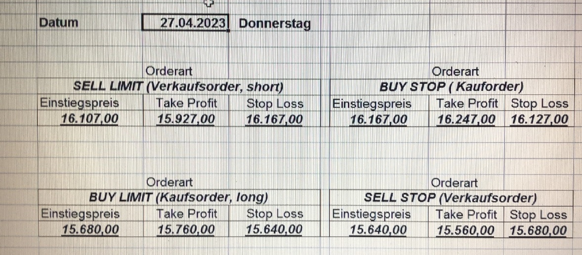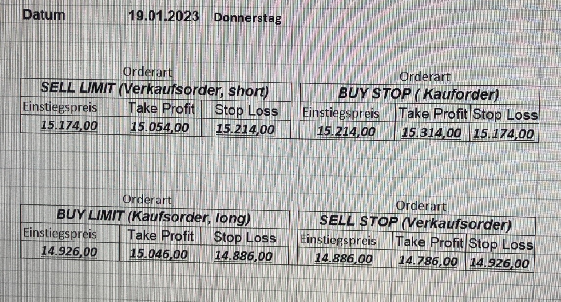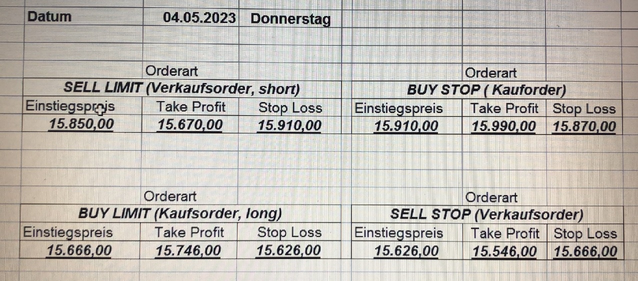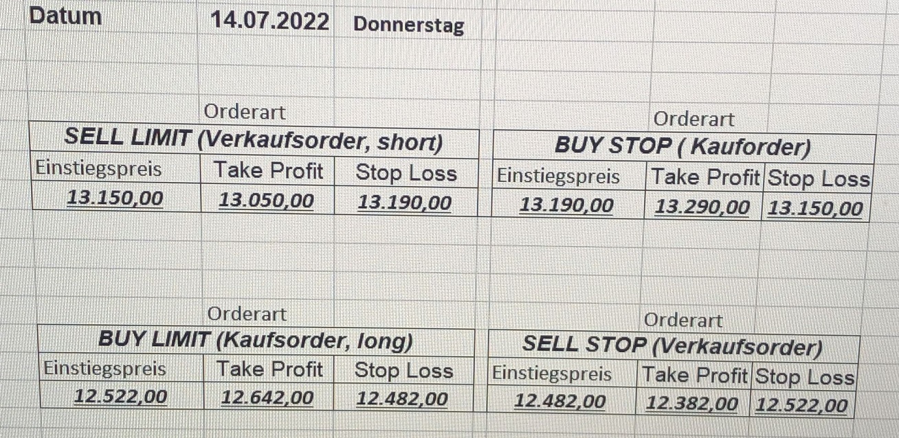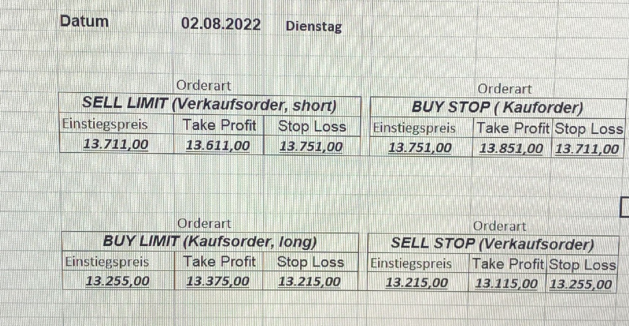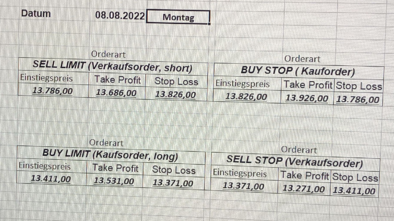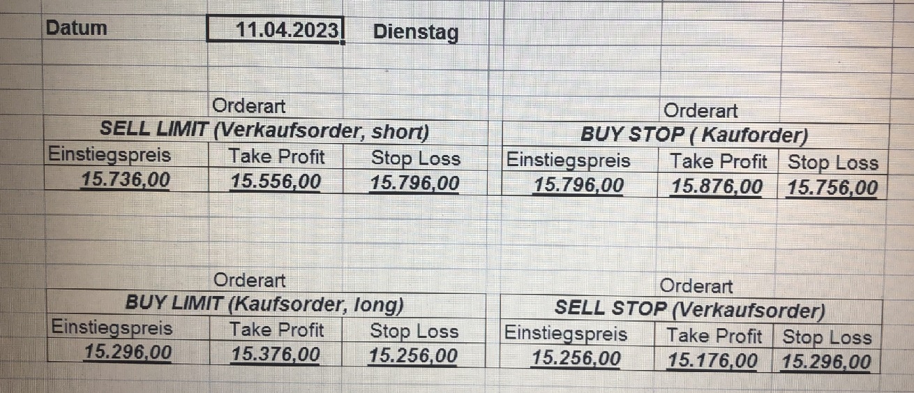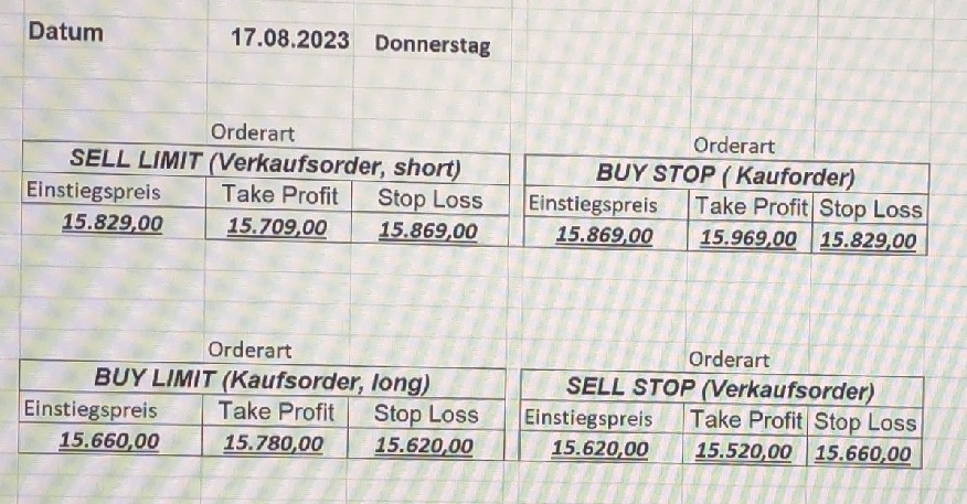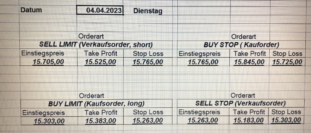 16.5.2023 Platzieren Sie die  Order bis 9:00 Löschen Sie bitte offene Order und Positionen um 21:45 ! Zur Frage der Punktgröße: Beispielrechnung: Bitte immer kurz auf den am weitest entfernten Stopp schauen. Diese Punktzahl sollte nicht mehr als 0,5% bis 1% des Kapitals ausmachen. 15.5.2023 Platzieren Sie die  Order bis 9:00 Löschen Sie bitte offene Order und Positionen um 21:45 ! Zur Frage der Punktgröße: Beispielrechnung: Bitte immer kurz auf den am weitest entfernten Stopp schauen. Diese Punktzahl sollte nicht mehr als 0,5% bis 1% des Kapitals ausmachen. 12.5.2023 Platzieren Sie die  Order bis 9:00 Löschen Sie bitte offene Order und Positionen um 21:45 ! Zur Frage der Punktgröße: Beispielrechnung: Bitte immer kurz auf den am weitest entfernten Stopp schauen. Diese Punktzahl sollte nicht mehr als 0,5% bis 1% des Kapitals ausmachen. 10.5.2023  Platzieren Sie die  Order bis 9:00 Löschen Sie bitte offene Order und Positionen um 21:45 ! Zur Frage der Punktgröße: Beispielrechnung: Bitte immer kurz auf den am weitest entfernten Stopp schauen. Diese Punktzahl sollte nicht mehr als 0,5% bis 1% des Kapitals ausmachen. 9.5.2023 Platzieren Sie die  Order bis 9:00 Löschen Sie bitte offene Order und Positionen um 21:45 ! Zur Frage der Punktgröße: Beispielrechnung: Bitte immer kurz auf den am weitest entfernten Stopp schauen. Diese Punktzahl sollte nicht mehr als 0,5% bis 1% des Kapitals ausmachen.   8.5.2023 Platzieren Sie die  Order bis 9:00 Löschen Sie bitte offene Order und Positionen um 21:45 ! Zur Frage der Punktgröße: Beispielrechnung: Bitte immer kurz auf den am weitest entfernten Stopp schauen. Diese Punktzahl sollte nicht mehr als 0,5% bis 1% des Kapitals ausmachen. 5.5.2023 Platzieren Sie die  Order bis 9:00 Löschen Sie bitte offene Order und Positionen um 21:45 ! Zur Frage der Punktgröße: Beispielrechnung: Bitte immer kurz auf den am weitest entfernten Stopp schauen. Diese Punktzahl sollte nicht mehr als 0,5% bis 1% des Kapitals ausmachen. 4.5.2023 Platzieren Sie die  Order bis 9:00 Löschen Sie bitte offene Order und Positionen um 21:45 ! Zur Frage der Punktgröße: Beispielrechnung: Bitte immer kurz auf den am weitest entfernten Stopp schauen. Diese Punktzahl sollte nicht mehr als 0,5% bis 1% des Kapitals ausmachen. 3.5.2023 Heute abend FED-Sitzung: Wir bleiben heute aus dem Markt! 2.5.2023 Platzieren Sie die  Order bis 9:00 Löschen Sie bitte offene Order und Positionen um 21:45 ! Zur Frage der Punktgröße: Beispielrechnung: Bitte immer kurz auf den am weitest entfernten Stopp schauen. Diese Punktzahl sollte nicht mehr als 0,5% bis 1% des Kapitals ausmachen. 28.4.2023 Platzieren Sie die  Order bis 9:00 Löschen Sie bitte offene Order und Positionen um 21:45 ! Zur Frage der Punktgröße: Beispielrechnung: Bitte immer kurz auf den am weitest entfernten Stopp schauen. Diese Punktzahl sollte nicht mehr als 0,5% bis 1% des Kapitals ausmachen. 27.4.2023 Platzieren Sie die  Order bis 9:00 Löschen Sie bitte offene Order und Positionen um 21:45 ! Zur Frage der Punktgröße: Beispielrechnung: Bitte immer kurz auf den am weitest entfernten Stopp schauen. Diese Punktzahl sollte nicht mehr als 0,5% bis 1% des Kapitals ausmachen. 26.4.2023 Platzieren Sie die  Order bis 9:00 Löschen Sie bitte offene Order und Positionen um 21:45 ! Zur Frage der Punktgröße: Beispielrechnung: Bitte immer kurz auf den am weitest entfernten Stopp schauen. Diese Punktzahl sollte nicht mehr als 0,5% bis 1% des Kapitals ausmachen. 25.4.2023 Platzieren Sie die  Order bis 9:00 Löschen Sie bitte offene Order und Positionen um 21:45 ! Zur Frage der Punktgröße: Beispielrechnung: Bitte immer kurz auf den am weitest entfernten Stopp schauen. Diese Punktzahl sollte nicht mehr als 0,5% bis 1% des Kapitals ausmachen. 24.4.2023 Platzieren Sie die  Order bis 9:00 Löschen Sie bitte offene Order und Positionen um 21:45 ! Zur Frage der Punktgröße: Beispielrechnung: Bitte immer kurz auf den am weitest entfernten Stopp schauen. Diese Punktzahl sollte nicht mehr als 0,5% bis 1% des Kapitals ausmachen. 21.4.2023 Platzieren Sie die  Order bis 9:00 Löschen Sie bitte offene Order und Positionen um 21:45 ! Zur Frage der Punktgröße: Beispielrechnung: Bitte immer kurz auf den am weitest entfernten Stopp schauen. Diese Punktzahl sollte nicht mehr als 0,5% bis 1% des Kapitals ausmachen. Sorry, falscher Wochentag, aber es sind die heutigen Signale!    20.4.2023 Platzieren Sie die  Order bis 9:00 Löschen Sie bitte offene Order und Positionen um 21:45 ! Zur Frage der Punktgröße: Beispielrechnung: Bitte immer kurz auf den am weitest entfernten Stopp schauen. Diese Punktzahl sollte nicht mehr als 0,5% bis 1% des Kapitals ausmachen. 19.4.2023 Platzieren Sie die  Order bis 9:00 Löschen Sie bitte offene Order und Positionen um 21:45 ! Zur Frage der Punktgröße: Beispielrechnung: Bitte immer kurz auf den am weitest entfernten Stopp schauen. Diese Punktzahl sollte nicht mehr als 0,5% bis 1% des Kapitals ausmachen. 18.4.2023 Platzieren Sie die  Order bis 9:00 Löschen Sie bitte offene Order und Positionen um 21:45 ! Zur Frage der Punktgröße: Beispielrechnung: Bitte immer kurz auf den am weitest entfernten Stopp schauen. Diese Punktzahl sollte nicht mehr als 0,5% bis 1% des Kapitals ausmachen.  17.4.2023 Platzieren Sie die  Order bis 9:00 Löschen Sie bitte offene Order und Positionen um 21:45 ! Zur Frage der Punktgröße: Beispielrechnung: Bitte immer kurz auf den am weitest entfernten Stopp schauen. Diese Punktzahl sollte nicht mehr als 0,5% bis 1% des Kapitals ausmachen. 14.4.2023 Platzieren Sie die  Order bis 9:00 Löschen Sie bitte offene Order und Positionen um 21:45 ! Zur Frage der Punktgröße: Beispielrechnung: Bitte immer kurz auf den am weitest entfernten Stopp schauen. Diese Punktzahl sollte nicht mehr als 0,5% bis 1% des Kapitals ausmachen. 13.4.2023 Heute bleiben wir an der Seitenlinie. Aktuell ist der DAX nicht volatil genug!  12.4.2023 Pla