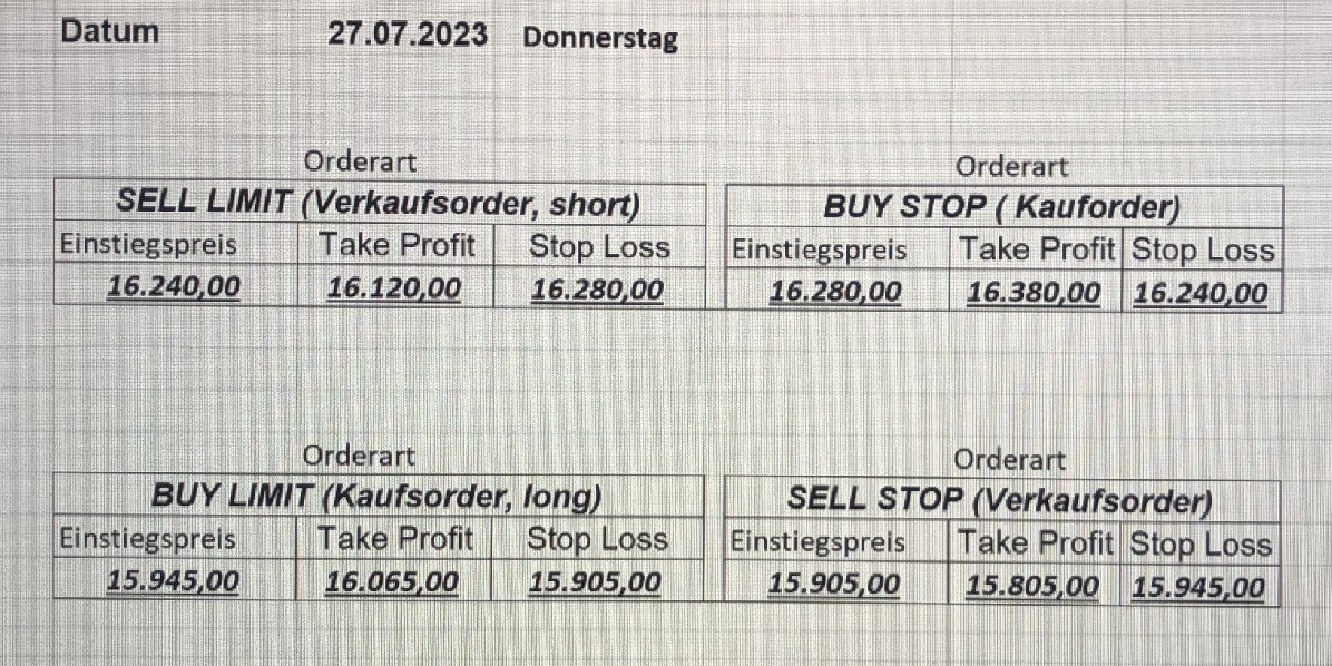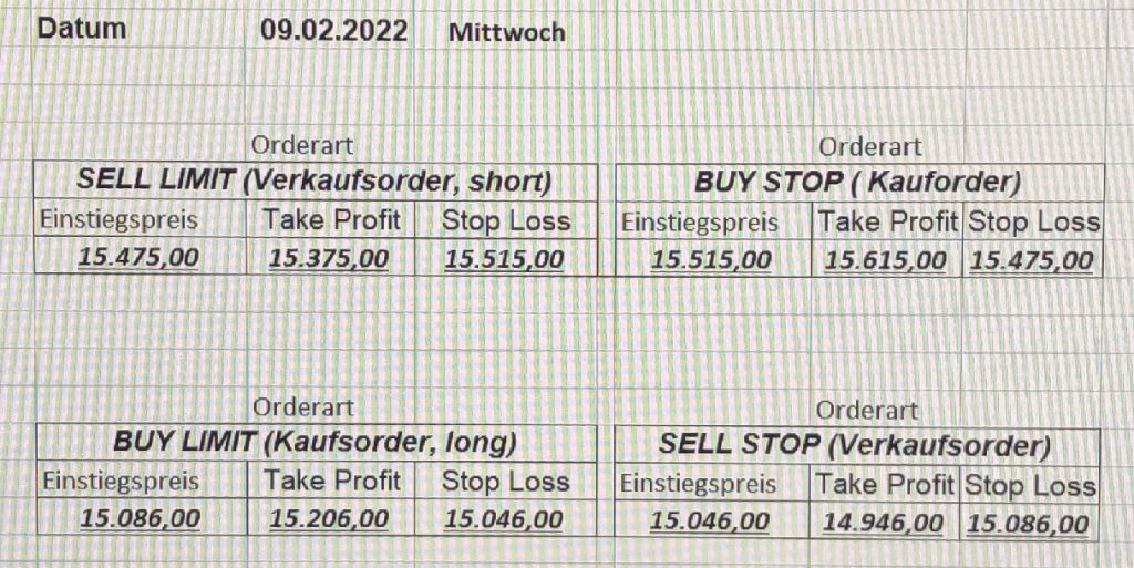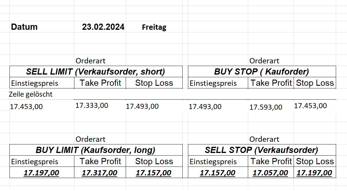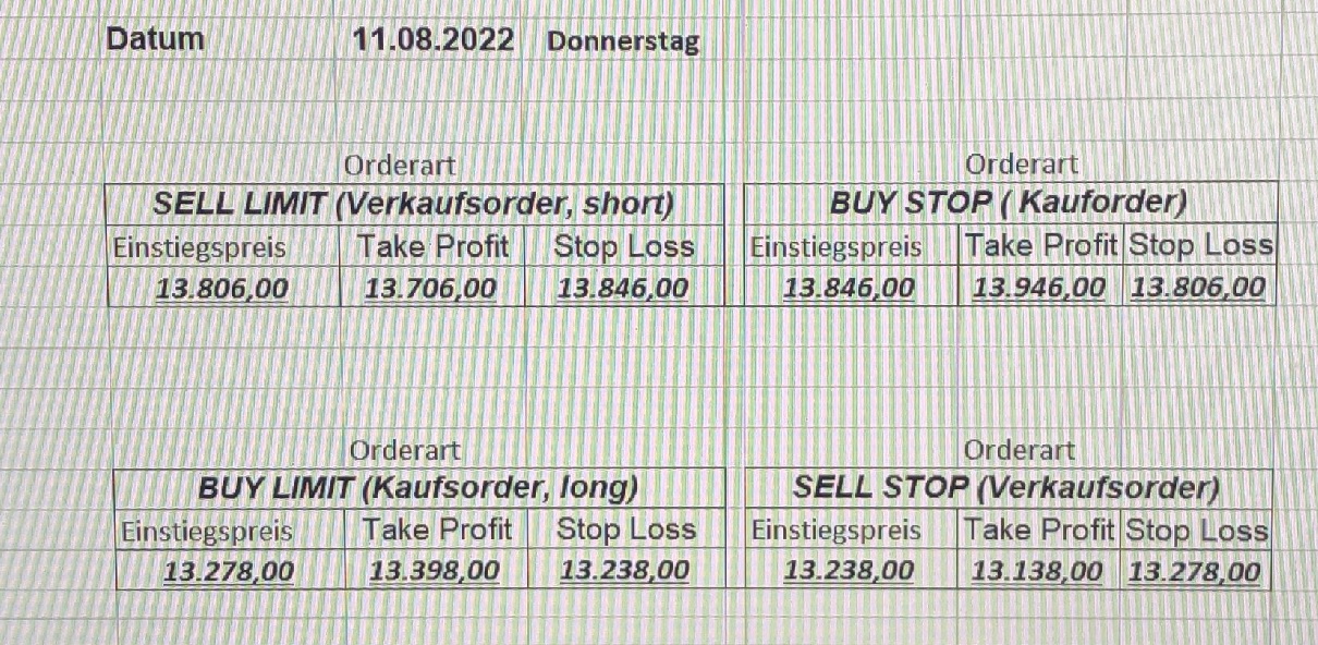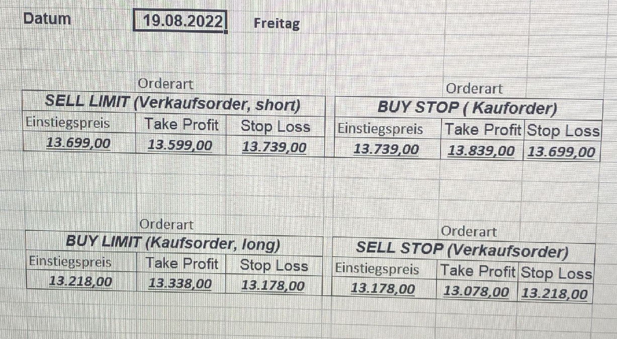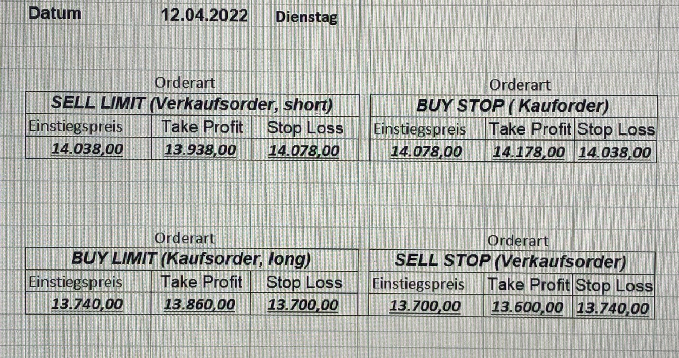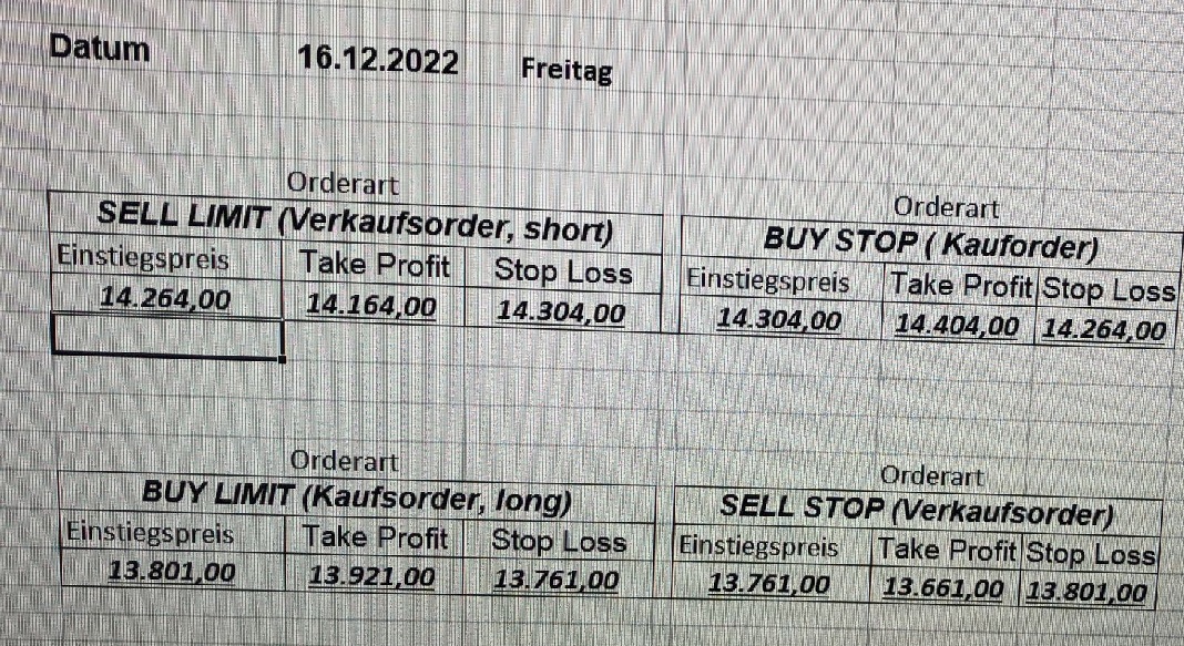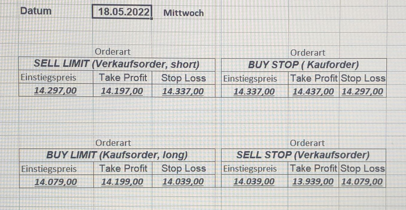 16.5.2023 Platzieren Sie die  Order bis 9:00 Löschen Sie bitte offene Order und Positionen um 21:45 ! Zur Frage der Punktgröße: Beispielrechnung: Bitte immer kurz auf den am weitest entfernten Stopp schauen. Diese Punktzahl sollte nicht mehr als 0,5% bis 1% des Kapitals ausmachen. 15.5.2023 Platzieren Sie die  Order bis 9:00 Löschen Sie bitte offene Order und Positionen um 21:45 ! Zur Frage der Punktgröße: Beispielrechnung: Bitte immer kurz auf den am weitest entfernten Stopp schauen. Diese Punktzahl sollte nicht mehr als 0,5% bis 1% des Kapitals ausmachen. 12.5.2023 Platzieren Sie die  Order bis 9:00 Löschen Sie bitte offene Order und Positionen um 21:45 ! Zur Frage der Punktgröße: Beispielrechnung: Bitte immer kurz auf den am weitest entfernten Stopp schauen. Diese Punktzahl sollte nicht mehr als 0,5% bis 1% des Kapitals ausmachen. 10.5.2023  Platzieren Sie die  Order bis 9:00 Löschen Sie bitte offene Order und Positionen um 21:45 ! Zur Frage der Punktgröße: Beispielrechnung: Bitte immer kurz auf den am weitest entfernten Stopp schauen. Diese Punktzahl sollte nicht mehr als 0,5% bis 1% des Kapitals ausmachen. 9.5.2023 Platzieren Sie die  Order bis 9:00 Löschen Sie bitte offene Order und Positionen um 21:45 ! Zur Frage der Punktgröße: Beispielrechnung: Bitte immer kurz auf den am weitest entfernten Stopp schauen. Diese Punktzahl sollte nicht mehr als 0,5% bis 1% des Kapitals ausmachen.   8.5.2023 Platzieren Sie die  Order bis 9:00 Löschen Sie bitte offene Order und Positionen um 21:45 ! Zur Frage der Punktgröße: Beispielrechnung: Bitte immer kurz auf den am weitest entfernten Stopp schauen. Diese Punktzahl sollte nicht mehr als 0,5% bis 1% des Kapitals ausmachen. 5.5.2023 Platzieren Sie die  Order bis 9:00 Löschen Sie bitte offene Order und Positionen um 21:45 ! Zur Frage der Punktgröße: Beispielrechnung: Bitte immer kurz auf den am weitest entfernten Stopp schauen. Diese Punktzahl sollte nicht mehr als 0,5% bis 1% des Kapitals ausmachen. 4.5.2023 Platzieren Sie die  Order bis 9:00 Löschen Sie bitte offene Order und Positionen um 21:45 ! Zur Frage der Punktgröße: Beispielrechnung: Bitte immer kurz auf den am weitest entfernten Stopp schauen. Diese Punktzahl sollte nicht mehr als 0,5% bis 1% des Kapitals ausmachen. 3.5.2023 Heute abend FED-Sitzung: Wir bleiben heute aus dem Markt! 2.5.2023 Platzieren Sie die  Order bis 9:00 Löschen Sie bitte offene Order und Positionen um 21:45 ! Zur Frage der Punktgröße: Beispielrechnung: Bitte immer kurz auf den am weitest entfernten Stopp schauen. Diese Punktzahl sollte nicht mehr als 0,5% bis 1% des Kapitals ausmachen. 28.4.2023 Platzieren Sie die  Order bis 9:00 Löschen Sie bitte offene Order und Positionen um 21:45 ! Zur Frage der Punktgröße: Beispielrechnung: Bitte immer kurz auf den am weitest entfernten Stopp schauen. Diese Punktzahl sollte nicht mehr als 0,5% bis 1% des Kapitals ausmachen. 27.4.2023 Platzieren Sie die  Order bis 9:00 Löschen Sie bitte offene Order und Positionen um 21:45 ! Zur Frage der Punktgröße: Beispielrechnung: Bitte immer kurz auf den am weitest entfernten Stopp schauen. Diese Punktzahl sollte nicht mehr als 0,5% bis 1% des Kapitals ausmachen. 26.4.2023 Platzieren Sie die  Order bis 9:00 Löschen Sie bitte offene Order und Positionen um 21:45 ! Zur Frage der Punktgröße: Beispielrechnung: Bitte immer kurz auf den am weitest entfernten Stopp schauen. Diese Punktzahl sollte nicht mehr als 0,5% bis 1% des Kapitals ausmachen. 25.4.2023 Platzieren Sie die  Order bis 9:00 Löschen Sie bitte offene Order und Positionen um 21:45 ! Zur Frage der Punktgröße: Beispielrechnung: Bitte immer kurz auf den am weitest entfernten Stopp schauen. Diese Punktzahl sollte nicht mehr als 0,5% bis 1% des Kapitals ausmachen. 24.4.2023 Platzieren Sie die  Order bis 9:00 Löschen Sie bitte offene Order und Positionen um 21:45 ! Zur Frage der Punktgröße: Beispielrechnung: Bitte immer kurz auf den am weitest entfernten Stopp schauen. Diese Punktzahl sollte nicht mehr als 0,5% bis 1% des Kapitals ausmachen. 21.4.2023 Platzieren Sie die  Order bis 9:00 Löschen Sie bitte offene Order und Positionen um 21:45 ! Zur Frage der Punktgröße: Beispielrechnung: Bitte immer kurz auf den am weitest entfernten Stopp schauen. Diese Punktzahl sollte nicht mehr als 0,5% bis 1% des Kapitals ausmachen. Sorry, falscher Wochentag, aber es sind die heutigen Signale!    20.4.2023 Platzieren Sie die  Order bis 9:00 Löschen Sie bitte offene Order und Positionen um 21:45 ! Zur Frage der Punktgröße: Beispielrechnung: Bitte immer kurz auf den am weitest entfernten Stopp schauen. Diese Punktzahl sollte nicht mehr als 0,5% bis 1% des Kapitals ausmachen. 19.4.2023 Platzieren Sie die  Order bis 9:00 Löschen Sie bitte offene Order und Positionen um 21:45 ! Zur Frage der Punktgröße: Beispielrechnung: Bitte immer kurz auf den am weitest entfernten Stopp schauen. Diese Punktzahl sollte nicht mehr als 0,5% bis 1% des Kapitals ausmachen. 18.4.2023 Platzieren Sie die  Order bis 9:00 Löschen Sie bitte offene Order und Positionen um 21:45 ! Zur Frage der Punktgröße: Beispielrechnung: Bitte immer kurz auf den am weitest entfernten Stopp schauen. Diese Punktzahl sollte nicht mehr als 0,5% bis 1% des Kapitals ausmachen.  17.4.2023 Platzieren Sie die  Order bis 9:00 Löschen Sie bitte offene Order und Positionen um 21:45 ! Zur Frage der Punktgröße: Beispielrechnung: Bitte immer kurz auf den am weitest entfernten Stopp schauen. Diese Punktzahl sollte nicht mehr als 0,5% bis 1% des Kapitals ausmachen. 14.4.2023 Platzieren Sie die  Order bis 9:00 Löschen Sie bitte offene Order und Positionen um 21:45 ! Zur Frage der Punktgröße: Beispielrechnung: Bitte immer kurz auf den am weitest entfernten Stopp schauen. Diese Punktzahl sollte nicht mehr als 0,5% bis 1% des Kapitals ausmachen. 13.4.2023 Heute bleiben wir an der Seitenlinie. Aktuell ist der DAX nicht volatil genug!  12.4.2023 Pla