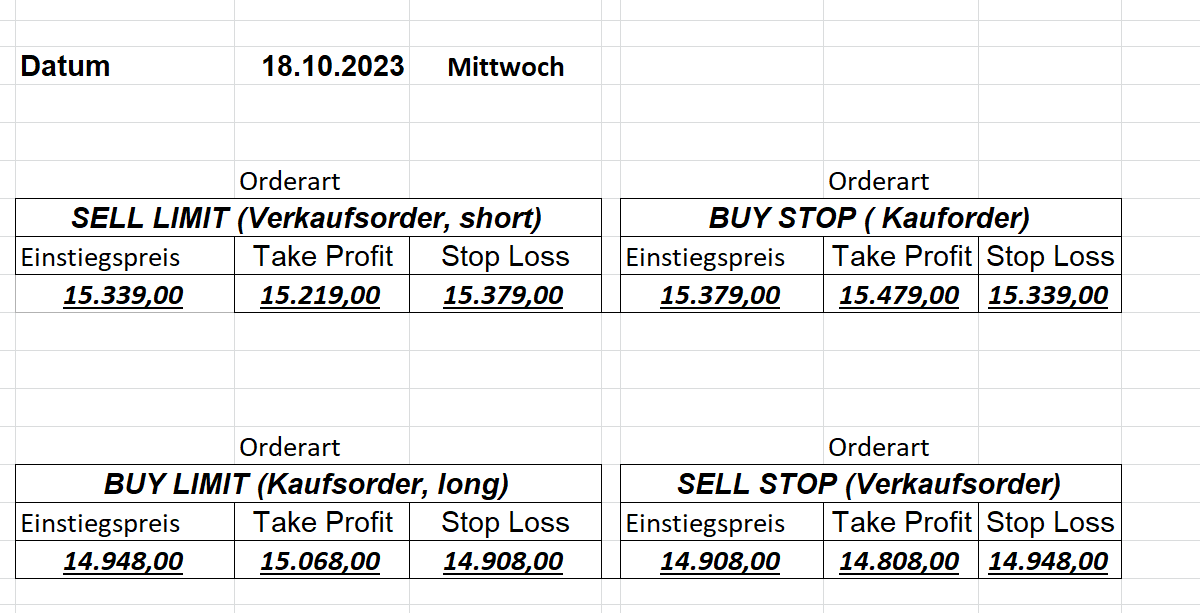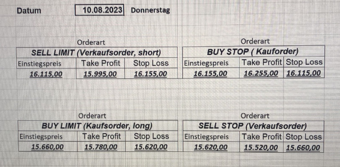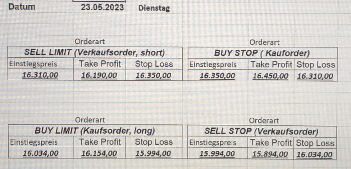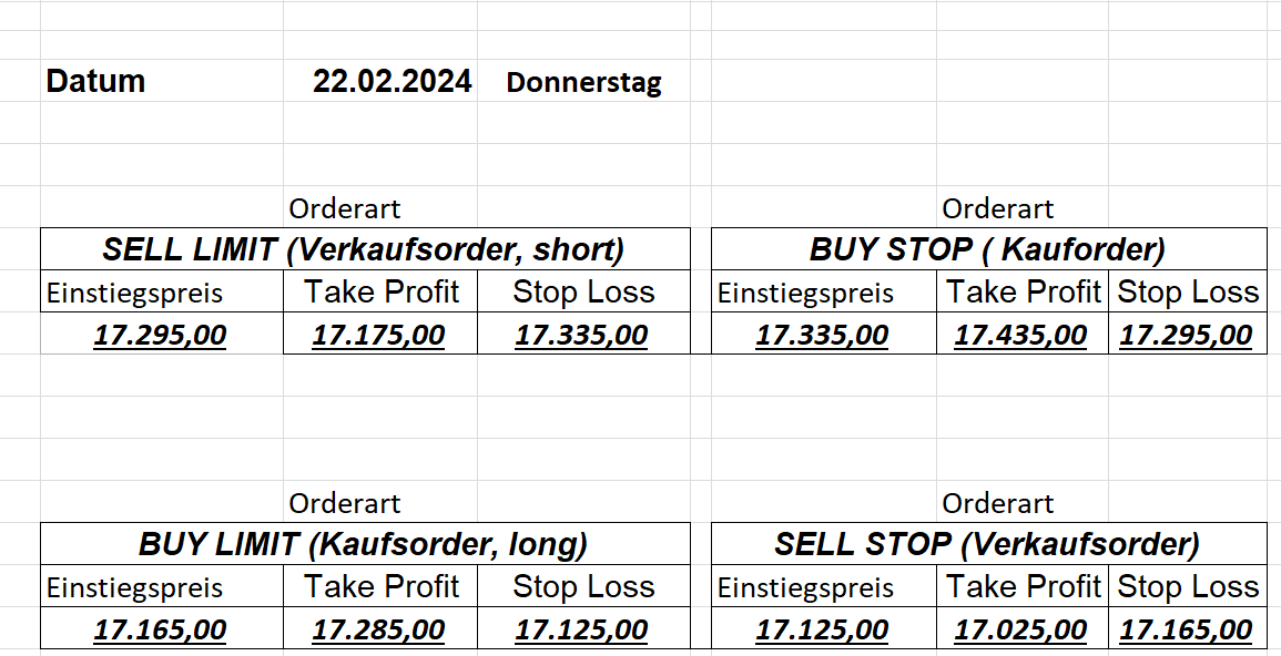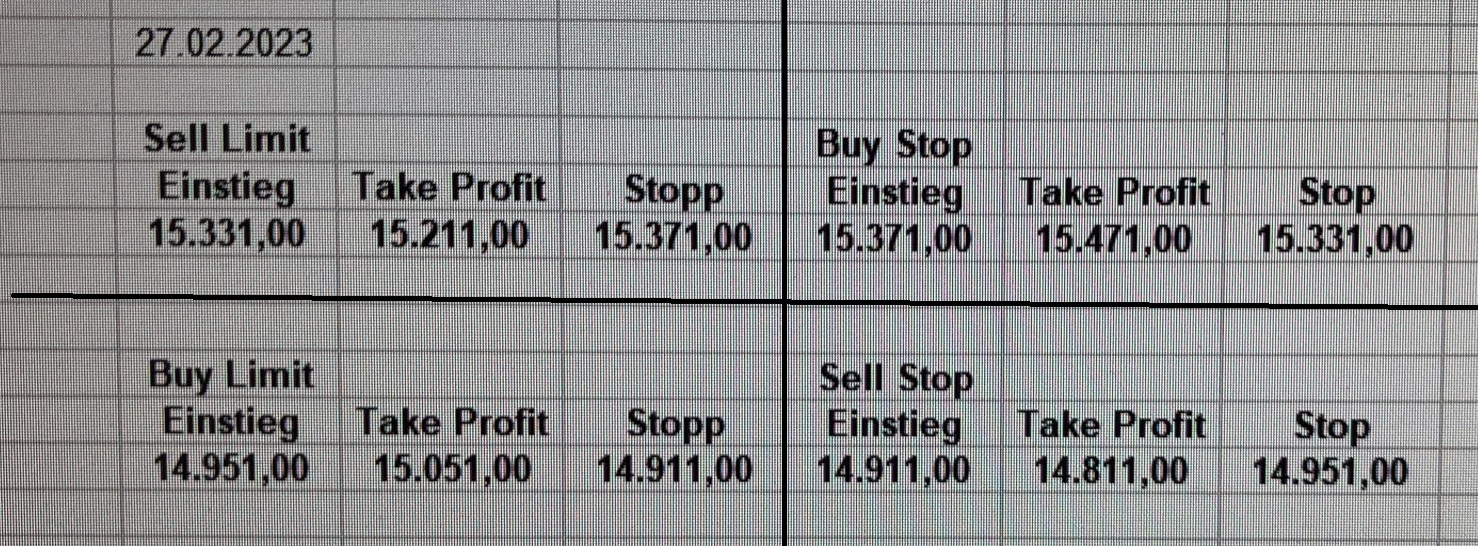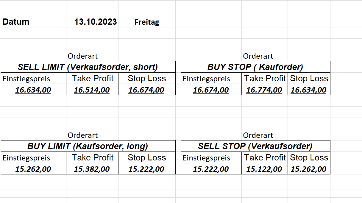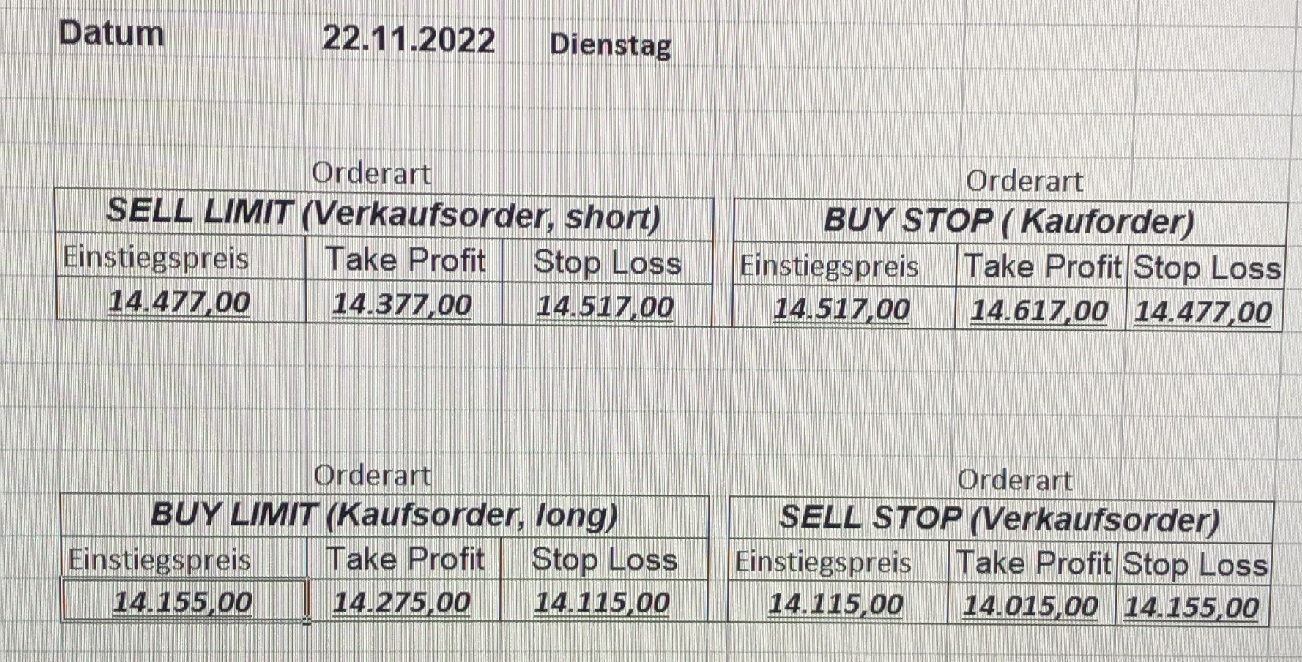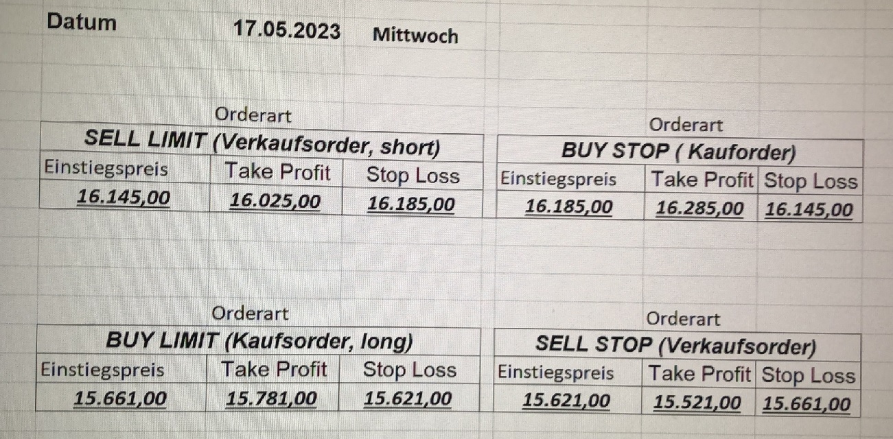 16.5.2023 Platzieren Sie die  Order bis 9:00 Löschen Sie bitte offene Order und Positionen um 21:45 ! Zur Frage der Punktgröße: Beispielrechnung: Bitte immer kurz auf den am weitest entfernten Stopp schauen. Diese Punktzahl sollte nicht mehr als 0,5% bis 1% des Kapitals ausmachen. 15.5.2023 Platzieren Sie die  Order bis 9:00 Löschen Sie bitte offene Order und Positionen um 21:45 ! Zur Frage der Punktgröße: Beispielrechnung: Bitte immer kurz auf den am weitest entfernten Stopp schauen. Diese Punktzahl sollte nicht mehr als 0,5% bis 1% des Kapitals ausmachen. 12.5.2023 Platzieren Sie die  Order bis 9:00 Löschen Sie bitte offene Order und Positionen um 21:45 ! Zur Frage der Punktgröße: Beispielrechnung: Bitte immer kurz auf den am weitest entfernten Stopp schauen. Diese Punktzahl sollte nicht mehr als 0,5% bis 1% des Kapitals ausmachen. 10.5.2023  Platzieren Sie die  Order bis 9:00 Löschen Sie bitte offene Order und Positionen um 21:45 ! Zur Frage der Punktgröße: Beispielrechnung: Bitte immer kurz auf den am weitest entfernten Stopp schauen. Diese Punktzahl sollte nicht mehr als 0,5% bis 1% des Kapitals ausmachen. 9.5.2023 Platzieren Sie die  Order bis 9:00 Löschen Sie bitte offene Order und Positionen um 21:45 ! Zur Frage der Punktgröße: Beispielrechnung: Bitte immer kurz auf den am weitest entfernten Stopp schauen. Diese Punktzahl sollte nicht mehr als 0,5% bis 1% des Kapitals ausmachen.   8.5.2023 Platzieren Sie die  Order bis 9:00 Löschen Sie bitte offene Order und Positionen um 21:45 ! Zur Frage der Punktgröße: Beispielrechnung: Bitte immer kurz auf den am weitest entfernten Stopp schauen. Diese Punktzahl sollte nicht mehr als 0,5% bis 1% des Kapitals ausmachen. 5.5.2023 Platzieren Sie die  Order bis 9:00 Löschen Sie bitte offene Order und Positionen um 21:45 ! Zur Frage der Punktgröße: Beispielrechnung: Bitte immer kurz auf den am weitest entfernten Stopp schauen. Diese Punktzahl sollte nicht mehr als 0,5% bis 1% des Kapitals ausmachen. 4.5.2023 Platzieren Sie die  Order bis 9:00 Löschen Sie bitte offene Order und Positionen um 21:45 ! Zur Frage der Punktgröße: Beispielrechnung: Bitte immer kurz auf den am weitest entfernten Stopp schauen. Diese Punktzahl sollte nicht mehr als 0,5% bis 1% des Kapitals ausmachen. 3.5.2023 Heute abend FED-Sitzung: Wir bleiben heute aus dem Markt! 2.5.2023 Platzieren Sie die  Order bis 9:00 Löschen Sie bitte offene Order und Positionen um 21:45 ! Zur Frage der Punktgröße: Beispielrechnung: Bitte immer kurz auf den am weitest entfernten Stopp schauen. Diese Punktzahl sollte nicht mehr als 0,5% bis 1% des Kapitals ausmachen. 28.4.2023 Platzieren Sie die  Order bis 9:00 Löschen Sie bitte offene Order und Positionen um 21:45 ! Zur Frage der Punktgröße: Beispielrechnung: Bitte immer kurz auf den am weitest entfernten Stopp schauen. Diese Punktzahl sollte nicht mehr als 0,5% bis 1% des Kapitals ausmachen. 27.4.2023 Platzieren Sie die  Order bis 9:00 Löschen Sie bitte offene Order und Positionen um 21:45 ! Zur Frage der Punktgröße: Beispielrechnung: Bitte immer kurz auf den am weitest entfernten Stopp schauen. Diese Punktzahl sollte nicht mehr als 0,5% bis 1% des Kapitals ausmachen. 26.4.2023 Platzieren Sie die  Order bis 9:00 Löschen Sie bitte offene Order und Positionen um 21:45 ! Zur Frage der Punktgröße: Beispielrechnung: Bitte immer kurz auf den am weitest entfernten Stopp schauen. Diese Punktzahl sollte nicht mehr als 0,5% bis 1% des Kapitals ausmachen. 25.4.2023 Platzieren Sie die  Order bis 9:00 Löschen Sie bitte offene Order und Positionen um 21:45 ! Zur Frage der Punktgröße: Beispielrechnung: Bitte immer kurz auf den am weitest entfernten Stopp schauen. Diese Punktzahl sollte nicht mehr als 0,5% bis 1% des Kapitals ausmachen. 24.4.2023 Platzieren Sie die  Order bis 9:00 Löschen Sie bitte offene Order und Positionen um 21:45 ! Zur Frage der Punktgröße: Beispielrechnung: Bitte immer kurz auf den am weitest entfernten Stopp schauen. Diese Punktzahl sollte nicht mehr als 0,5% bis 1% des Kapitals ausmachen. 21.4.2023 Platzieren Sie die  Order bis 9:00 Löschen Sie bitte offene Order und Positionen um 21:45 ! Zur Frage der Punktgröße: Beispielrechnung: Bitte immer kurz auf den am weitest entfernten Stopp schauen. Diese Punktzahl sollte nicht mehr als 0,5% bis 1% des Kapitals ausmachen. Sorry, falscher Wochentag, aber es sind die heutigen Signale!    20.4.2023 Platzieren Sie die  Order bis 9:00 Löschen Sie bitte offene Order und Positionen um 21:45 ! Zur Frage der Punktgröße: Beispielrechnung: Bitte immer kurz auf den am weitest entfernten Stopp schauen. Diese Punktzahl sollte nicht mehr als 0,5% bis 1% des Kapitals ausmachen. 19.4.2023 Platzieren Sie die  Order bis 9:00 Löschen Sie bitte offene Order und Positionen um 21:45 ! Zur Frage der Punktgröße: Beispielrechnung: Bitte immer kurz auf den am weitest entfernten Stopp schauen. Diese Punktzahl sollte nicht mehr als 0,5% bis 1% des Kapitals ausmachen. 18.4.2023 Platzieren Sie die  Order bis 9:00 Löschen Sie bitte offene Order und Positionen um 21:45 ! Zur Frage der Punktgröße: Beispielrechnung: Bitte immer kurz auf den am weitest entfernten Stopp schauen. Diese Punktzahl sollte nicht mehr als 0,5% bis 1% des Kapitals ausmachen.  17.4.2023 Platzieren Sie die  Order bis 9:00 Löschen Sie bitte offene Order und Positionen um 21:45 ! Zur Frage der Punktgröße: Beispielrechnung: Bitte immer kurz auf den am weitest entfernten Stopp schauen. Diese Punktzahl sollte nicht mehr als 0,5% bis 1% des Kapitals ausmachen. 14.4.2023 Platzieren Sie die  Order bis 9:00 Löschen Sie bitte offene Order und Positionen um 21:45 ! Zur Frage der Punktgröße: Beispielrechnung: Bitte immer kurz auf den am weitest entfernten Stopp schauen. Diese Punktzahl sollte nicht mehr als 0,5% bis 1% des Kapitals ausmachen. 13.4.2023 Heute bleiben wir an der Seitenlinie. Aktuell ist der DAX nicht volatil genug!  12.4.2023 Pla
