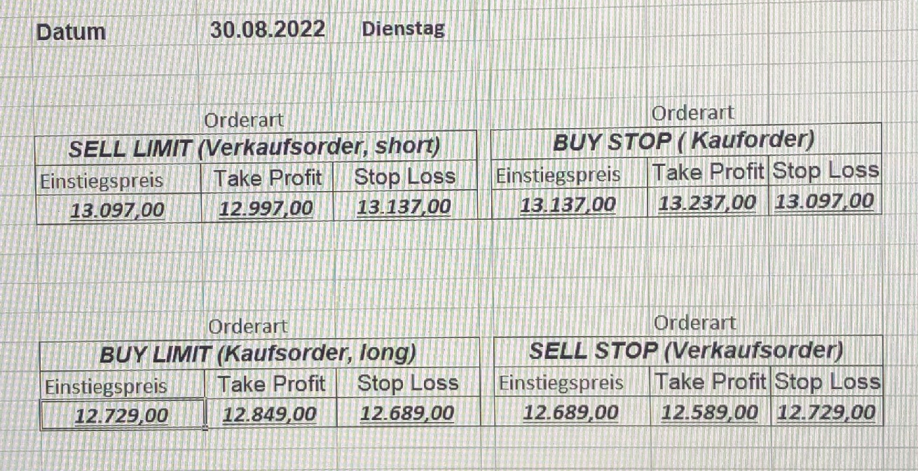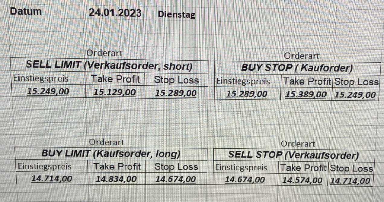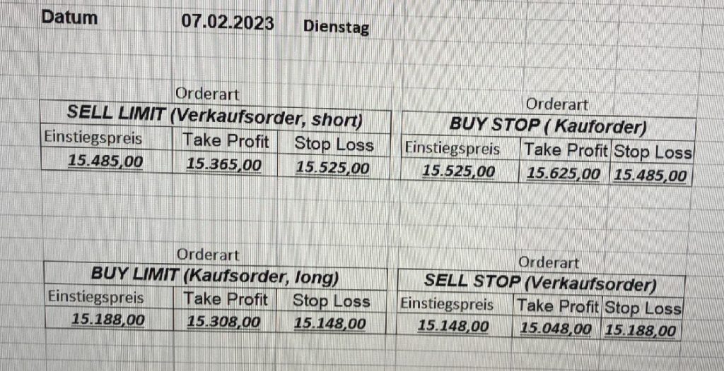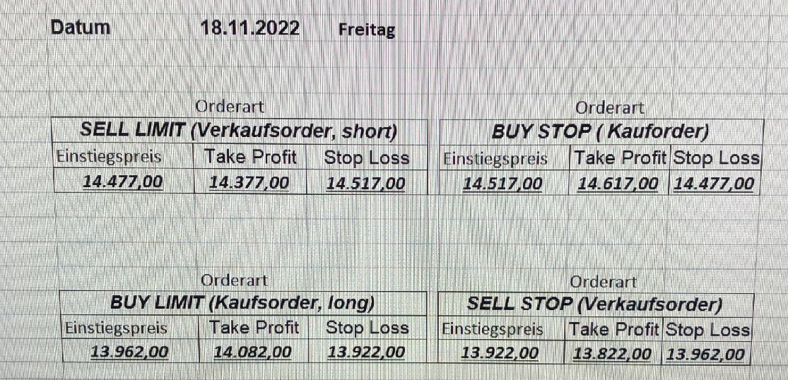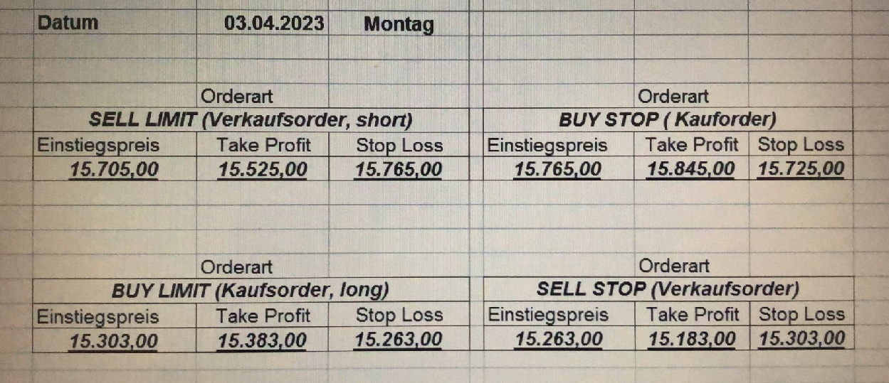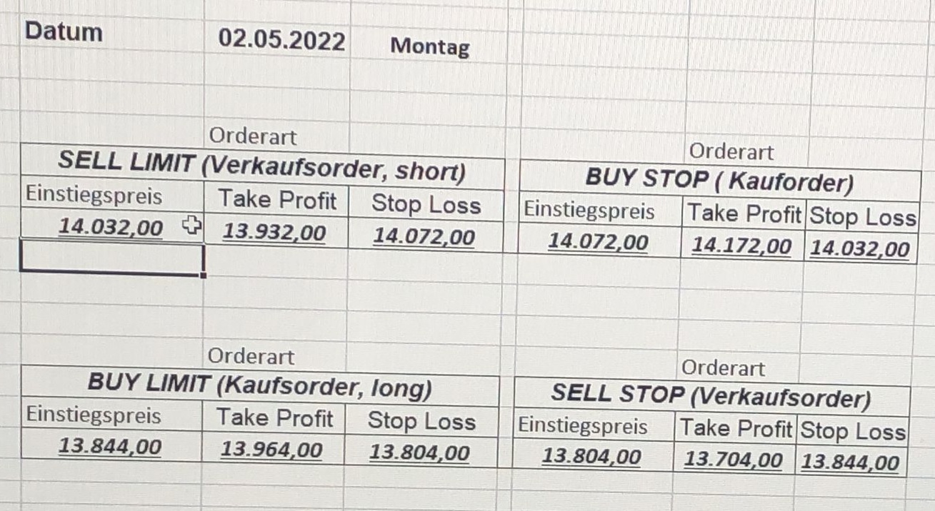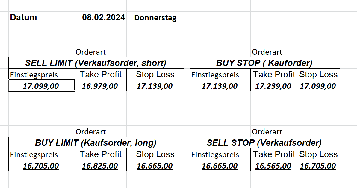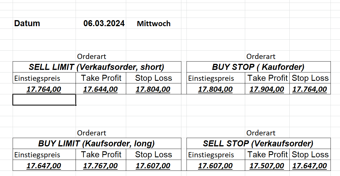 16.5.2023 Platzieren Sie die  Order bis 9:00 Löschen Sie bitte offene Order und Positionen um 21:45 ! Zur Frage der Punktgröße: Beispielrechnung: Bitte immer kurz auf den am weitest entfernten Stopp schauen. Diese Punktzahl sollte nicht mehr als 0,5% bis 1% des Kapitals ausmachen. 15.5.2023 Platzieren Sie die  Order bis 9:00 Löschen Sie bitte offene Order und Positionen um 21:45 ! Zur Frage der Punktgröße: Beispielrechnung: Bitte immer kurz auf den am weitest entfernten Stopp schauen. Diese Punktzahl sollte nicht mehr als 0,5% bis 1% des Kapitals ausmachen. 12.5.2023 Platzieren Sie die  Order bis 9:00 Löschen Sie bitte offene Order und Positionen um 21:45 ! Zur Frage der Punktgröße: Beispielrechnung: Bitte immer kurz auf den am weitest entfernten Stopp schauen. Diese Punktzahl sollte nicht mehr als 0,5% bis 1% des Kapitals ausmachen. 10.5.2023  Platzieren Sie die  Order bis 9:00 Löschen Sie bitte offene Order und Positionen um 21:45 ! Zur Frage der Punktgröße: Beispielrechnung: Bitte immer kurz auf den am weitest entfernten Stopp schauen. Diese Punktzahl sollte nicht mehr als 0,5% bis 1% des Kapitals ausmachen. 9.5.2023 Platzieren Sie die  Order bis 9:00 Löschen Sie bitte offene Order und Positionen um 21:45 ! Zur Frage der Punktgröße: Beispielrechnung: Bitte immer kurz auf den am weitest entfernten Stopp schauen. Diese Punktzahl sollte nicht mehr als 0,5% bis 1% des Kapitals ausmachen.   8.5.2023 Platzieren Sie die  Order bis 9:00 Löschen Sie bitte offene Order und Positionen um 21:45 ! Zur Frage der Punktgröße: Beispielrechnung: Bitte immer kurz auf den am weitest entfernten Stopp schauen. Diese Punktzahl sollte nicht mehr als 0,5% bis 1% des Kapitals ausmachen. 5.5.2023 Platzieren Sie die  Order bis 9:00 Löschen Sie bitte offene Order und Positionen um 21:45 ! Zur Frage der Punktgröße: Beispielrechnung: Bitte immer kurz auf den am weitest entfernten Stopp schauen. Diese Punktzahl sollte nicht mehr als 0,5% bis 1% des Kapitals ausmachen. 4.5.2023 Platzieren Sie die  Order bis 9:00 Löschen Sie bitte offene Order und Positionen um 21:45 ! Zur Frage der Punktgröße: Beispielrechnung: Bitte immer kurz auf den am weitest entfernten Stopp schauen. Diese Punktzahl sollte nicht mehr als 0,5% bis 1% des Kapitals ausmachen. 3.5.2023 Heute abend FED-Sitzung: Wir bleiben heute aus dem Markt! 2.5.2023 Platzieren Sie die  Order bis 9:00 Löschen Sie bitte offene Order und Positionen um 21:45 ! Zur Frage der Punktgröße: Beispielrechnung: Bitte immer kurz auf den am weitest entfernten Stopp schauen. Diese Punktzahl sollte nicht mehr als 0,5% bis 1% des Kapitals ausmachen. 28.4.2023 Platzieren Sie die  Order bis 9:00 Löschen Sie bitte offene Order und Positionen um 21:45 ! Zur Frage der Punktgröße: Beispielrechnung: Bitte immer kurz auf den am weitest entfernten Stopp schauen. Diese Punktzahl sollte nicht mehr als 0,5% bis 1% des Kapitals ausmachen. 27.4.2023 Platzieren Sie die  Order bis 9:00 Löschen Sie bitte offene Order und Positionen um 21:45 ! Zur Frage der Punktgröße: Beispielrechnung: Bitte immer kurz auf den am weitest entfernten Stopp schauen. Diese Punktzahl sollte nicht mehr als 0,5% bis 1% des Kapitals ausmachen. 26.4.2023 Platzieren Sie die  Order bis 9:00 Löschen Sie bitte offene Order und Positionen um 21:45 ! Zur Frage der Punktgröße: Beispielrechnung: Bitte immer kurz auf den am weitest entfernten Stopp schauen. Diese Punktzahl sollte nicht mehr als 0,5% bis 1% des Kapitals ausmachen. 25.4.2023 Platzieren Sie die  Order bis 9:00 Löschen Sie bitte offene Order und Positionen um 21:45 ! Zur Frage der Punktgröße: Beispielrechnung: Bitte immer kurz auf den am weitest entfernten Stopp schauen. Diese Punktzahl sollte nicht mehr als 0,5% bis 1% des Kapitals ausmachen. 24.4.2023 Platzieren Sie die  Order bis 9:00 Löschen Sie bitte offene Order und Positionen um 21:45 ! Zur Frage der Punktgröße: Beispielrechnung: Bitte immer kurz auf den am weitest entfernten Stopp schauen. Diese Punktzahl sollte nicht mehr als 0,5% bis 1% des Kapitals ausmachen. 21.4.2023 Platzieren Sie die  Order bis 9:00 Löschen Sie bitte offene Order und Positionen um 21:45 ! Zur Frage der Punktgröße: Beispielrechnung: Bitte immer kurz auf den am weitest entfernten Stopp schauen. Diese Punktzahl sollte nicht mehr als 0,5% bis 1% des Kapitals ausmachen. Sorry, falscher Wochentag, aber es sind die heutigen Signale!    20.4.2023 Platzieren Sie die  Order bis 9:00 Löschen Sie bitte offene Order und Positionen um 21:45 ! Zur Frage der Punktgröße: Beispielrechnung: Bitte immer kurz auf den am weitest entfernten Stopp schauen. Diese Punktzahl sollte nicht mehr als 0,5% bis 1% des Kapitals ausmachen. 19.4.2023 Platzieren Sie die  Order bis 9:00 Löschen Sie bitte offene Order und Positionen um 21:45 ! Zur Frage der Punktgröße: Beispielrechnung: Bitte immer kurz auf den am weitest entfernten Stopp schauen. Diese Punktzahl sollte nicht mehr als 0,5% bis 1% des Kapitals ausmachen. 18.4.2023 Platzieren Sie die  Order bis 9:00 Löschen Sie bitte offene Order und Positionen um 21:45 ! Zur Frage der Punktgröße: Beispielrechnung: Bitte immer kurz auf den am weitest entfernten Stopp schauen. Diese Punktzahl sollte nicht mehr als 0,5% bis 1% des Kapitals ausmachen.  17.4.2023 Platzieren Sie die  Order bis 9:00 Löschen Sie bitte offene Order und Positionen um 21:45 ! Zur Frage der Punktgröße: Beispielrechnung: Bitte immer kurz auf den am weitest entfernten Stopp schauen. Diese Punktzahl sollte nicht mehr als 0,5% bis 1% des Kapitals ausmachen. 14.4.2023 Platzieren Sie die  Order bis 9:00 Löschen Sie bitte offene Order und Positionen um 21:45 ! Zur Frage der Punktgröße: Beispielrechnung: Bitte immer kurz auf den am weitest entfernten Stopp schauen. Diese Punktzahl sollte nicht mehr als 0,5% bis 1% des Kapitals ausmachen. 13.4.2023 Heute bleiben wir an der Seitenlinie. Aktuell ist der DAX nicht volatil genug!  12.4.2023 Pla