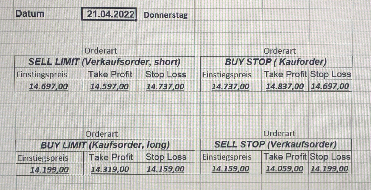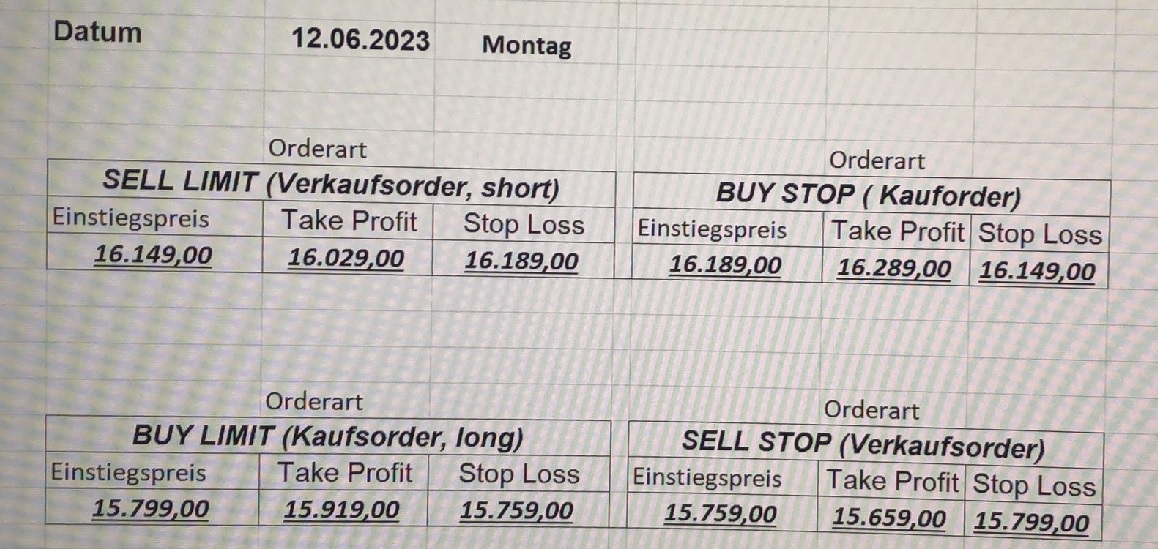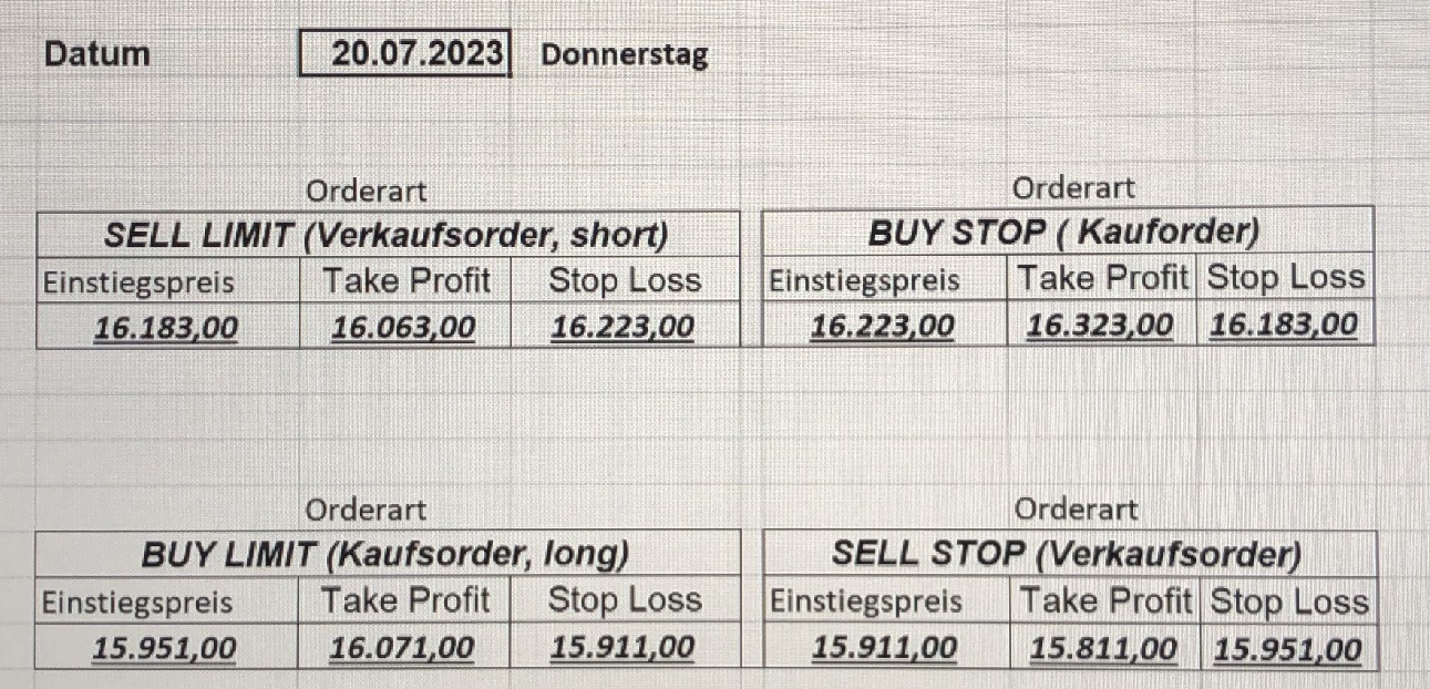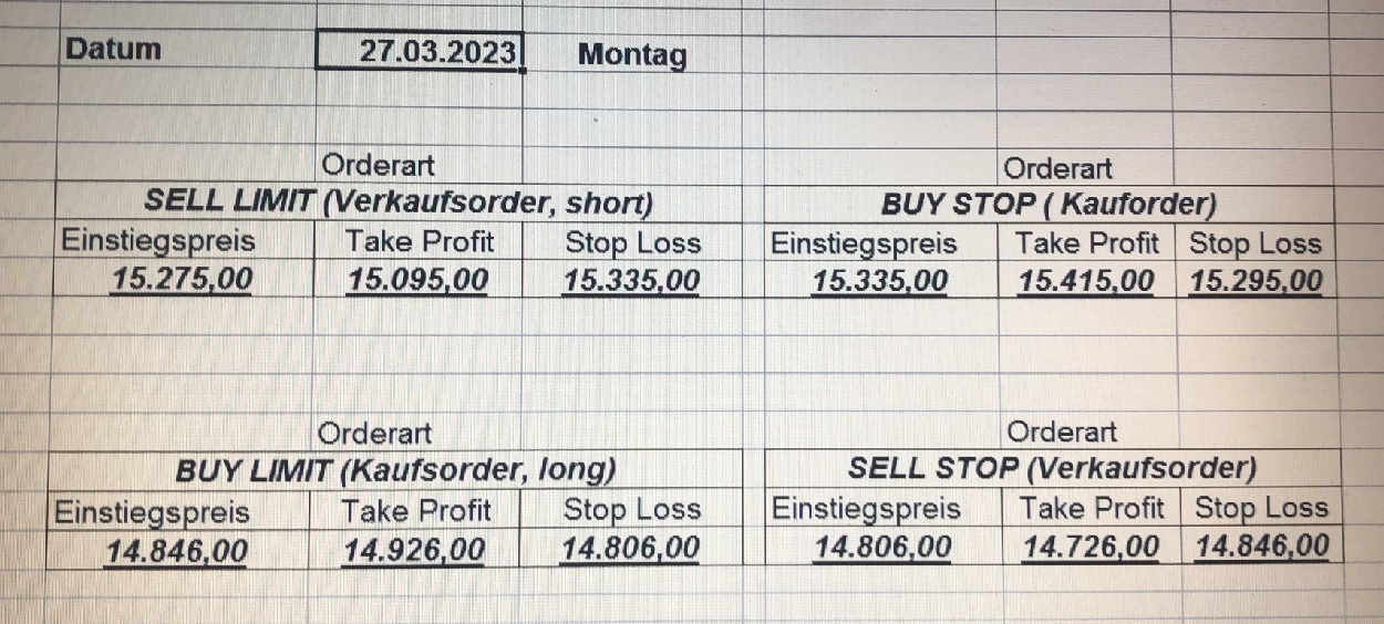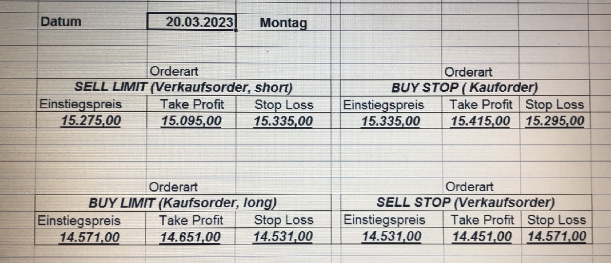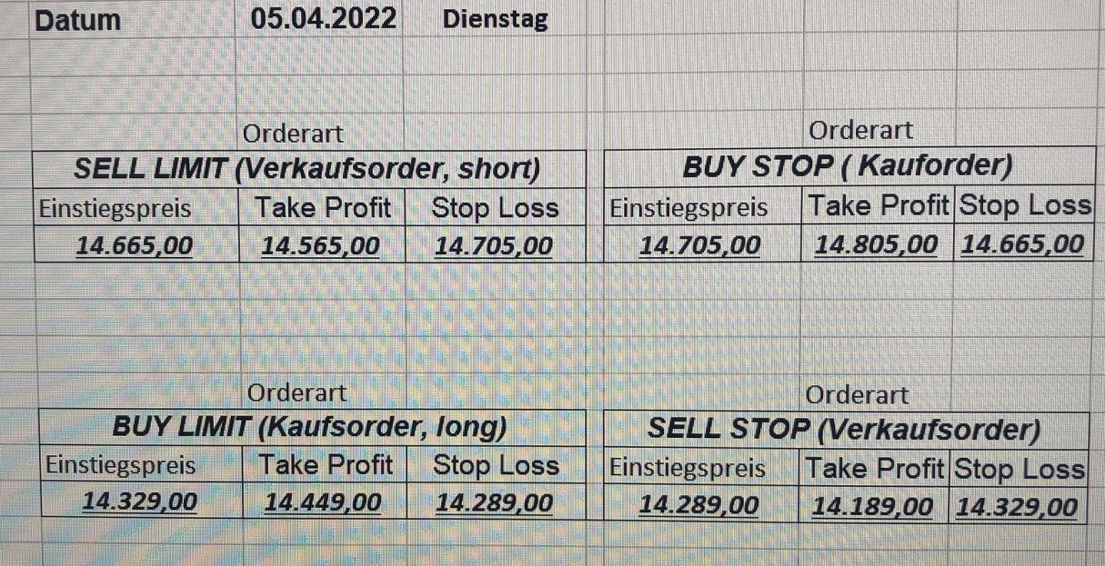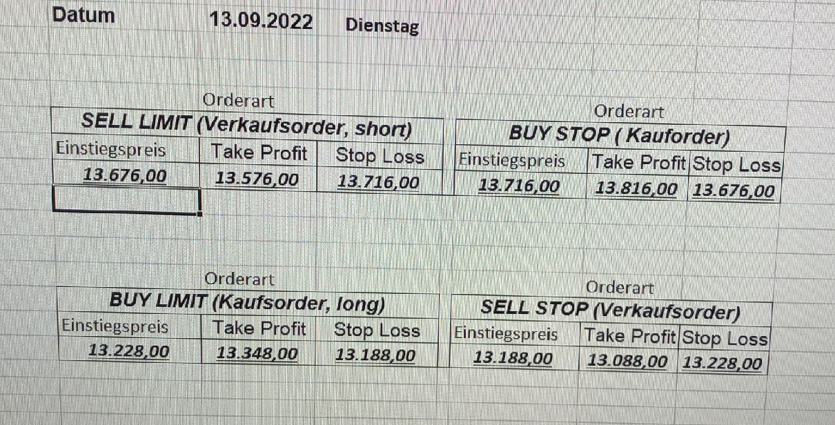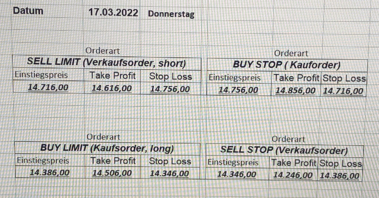 16.5.2023 Platzieren Sie die  Order bis 9:00 Löschen Sie bitte offene Order und Positionen um 21:45 ! Zur Frage der Punktgröße: Beispielrechnung: Bitte immer kurz auf den am weitest entfernten Stopp schauen. Diese Punktzahl sollte nicht mehr als 0,5% bis 1% des Kapitals ausmachen. 15.5.2023 Platzieren Sie die  Order bis 9:00 Löschen Sie bitte offene Order und Positionen um 21:45 ! Zur Frage der Punktgröße: Beispielrechnung: Bitte immer kurz auf den am weitest entfernten Stopp schauen. Diese Punktzahl sollte nicht mehr als 0,5% bis 1% des Kapitals ausmachen. 12.5.2023 Platzieren Sie die  Order bis 9:00 Löschen Sie bitte offene Order und Positionen um 21:45 ! Zur Frage der Punktgröße: Beispielrechnung: Bitte immer kurz auf den am weitest entfernten Stopp schauen. Diese Punktzahl sollte nicht mehr als 0,5% bis 1% des Kapitals ausmachen. 10.5.2023  Platzieren Sie die  Order bis 9:00 Löschen Sie bitte offene Order und Positionen um 21:45 ! Zur Frage der Punktgröße: Beispielrechnung: Bitte immer kurz auf den am weitest entfernten Stopp schauen. Diese Punktzahl sollte nicht mehr als 0,5% bis 1% des Kapitals ausmachen. 9.5.2023 Platzieren Sie die  Order bis 9:00 Löschen Sie bitte offene Order und Positionen um 21:45 ! Zur Frage der Punktgröße: Beispielrechnung: Bitte immer kurz auf den am weitest entfernten Stopp schauen. Diese Punktzahl sollte nicht mehr als 0,5% bis 1% des Kapitals ausmachen.   8.5.2023 Platzieren Sie die  Order bis 9:00 Löschen Sie bitte offene Order und Positionen um 21:45 ! Zur Frage der Punktgröße: Beispielrechnung: Bitte immer kurz auf den am weitest entfernten Stopp schauen. Diese Punktzahl sollte nicht mehr als 0,5% bis 1% des Kapitals ausmachen. 5.5.2023 Platzieren Sie die  Order bis 9:00 Löschen Sie bitte offene Order und Positionen um 21:45 ! Zur Frage der Punktgröße: Beispielrechnung: Bitte immer kurz auf den am weitest entfernten Stopp schauen. Diese Punktzahl sollte nicht mehr als 0,5% bis 1% des Kapitals ausmachen. 4.5.2023 Platzieren Sie die  Order bis 9:00 Löschen Sie bitte offene Order und Positionen um 21:45 ! Zur Frage der Punktgröße: Beispielrechnung: Bitte immer kurz auf den am weitest entfernten Stopp schauen. Diese Punktzahl sollte nicht mehr als 0,5% bis 1% des Kapitals ausmachen. 3.5.2023 Heute abend FED-Sitzung: Wir bleiben heute aus dem Markt! 2.5.2023 Platzieren Sie die  Order bis 9:00 Löschen Sie bitte offene Order und Positionen um 21:45 ! Zur Frage der Punktgröße: Beispielrechnung: Bitte immer kurz auf den am weitest entfernten Stopp schauen. Diese Punktzahl sollte nicht mehr als 0,5% bis 1% des Kapitals ausmachen. 28.4.2023 Platzieren Sie die  Order bis 9:00 Löschen Sie bitte offene Order und Positionen um 21:45 ! Zur Frage der Punktgröße: Beispielrechnung: Bitte immer kurz auf den am weitest entfernten Stopp schauen. Diese Punktzahl sollte nicht mehr als 0,5% bis 1% des Kapitals ausmachen. 27.4.2023 Platzieren Sie die  Order bis 9:00 Löschen Sie bitte offene Order und Positionen um 21:45 ! Zur Frage der Punktgröße: Beispielrechnung: Bitte immer kurz auf den am weitest entfernten Stopp schauen. Diese Punktzahl sollte nicht mehr als 0,5% bis 1% des Kapitals ausmachen. 26.4.2023 Platzieren Sie die  Order bis 9:00 Löschen Sie bitte offene Order und Positionen um 21:45 ! Zur Frage der Punktgröße: Beispielrechnung: Bitte immer kurz auf den am weitest entfernten Stopp schauen. Diese Punktzahl sollte nicht mehr als 0,5% bis 1% des Kapitals ausmachen. 25.4.2023 Platzieren Sie die  Order bis 9:00 Löschen Sie bitte offene Order und Positionen um 21:45 ! Zur Frage der Punktgröße: Beispielrechnung: Bitte immer kurz auf den am weitest entfernten Stopp schauen. Diese Punktzahl sollte nicht mehr als 0,5% bis 1% des Kapitals ausmachen. 24.4.2023 Platzieren Sie die  Order bis 9:00 Löschen Sie bitte offene Order und Positionen um 21:45 ! Zur Frage der Punktgröße: Beispielrechnung: Bitte immer kurz auf den am weitest entfernten Stopp schauen. Diese Punktzahl sollte nicht mehr als 0,5% bis 1% des Kapitals ausmachen. 21.4.2023 Platzieren Sie die  Order bis 9:00 Löschen Sie bitte offene Order und Positionen um 21:45 ! Zur Frage der Punktgröße: Beispielrechnung: Bitte immer kurz auf den am weitest entfernten Stopp schauen. Diese Punktzahl sollte nicht mehr als 0,5% bis 1% des Kapitals ausmachen. Sorry, falscher Wochentag, aber es sind die heutigen Signale!    20.4.2023 Platzieren Sie die  Order bis 9:00 Löschen Sie bitte offene Order und Positionen um 21:45 ! Zur Frage der Punktgröße: Beispielrechnung: Bitte immer kurz auf den am weitest entfernten Stopp schauen. Diese Punktzahl sollte nicht mehr als 0,5% bis 1% des Kapitals ausmachen. 19.4.2023 Platzieren Sie die  Order bis 9:00 Löschen Sie bitte offene Order und Positionen um 21:45 ! Zur Frage der Punktgröße: Beispielrechnung: Bitte immer kurz auf den am weitest entfernten Stopp schauen. Diese Punktzahl sollte nicht mehr als 0,5% bis 1% des Kapitals ausmachen. 18.4.2023 Platzieren Sie die  Order bis 9:00 Löschen Sie bitte offene Order und Positionen um 21:45 ! Zur Frage der Punktgröße: Beispielrechnung: Bitte immer kurz auf den am weitest entfernten Stopp schauen. Diese Punktzahl sollte nicht mehr als 0,5% bis 1% des Kapitals ausmachen.  17.4.2023 Platzieren Sie die  Order bis 9:00 Löschen Sie bitte offene Order und Positionen um 21:45 ! Zur Frage der Punktgröße: Beispielrechnung: Bitte immer kurz auf den am weitest entfernten Stopp schauen. Diese Punktzahl sollte nicht mehr als 0,5% bis 1% des Kapitals ausmachen. 14.4.2023 Platzieren Sie die  Order bis 9:00 Löschen Sie bitte offene Order und Positionen um 21:45 ! Zur Frage der Punktgröße: Beispielrechnung: Bitte immer kurz auf den am weitest entfernten Stopp schauen. Diese Punktzahl sollte nicht mehr als 0,5% bis 1% des Kapitals ausmachen. 13.4.2023 Heute bleiben wir an der Seitenlinie. Aktuell ist der DAX nicht volatil genug!  12.4.2023 Pla