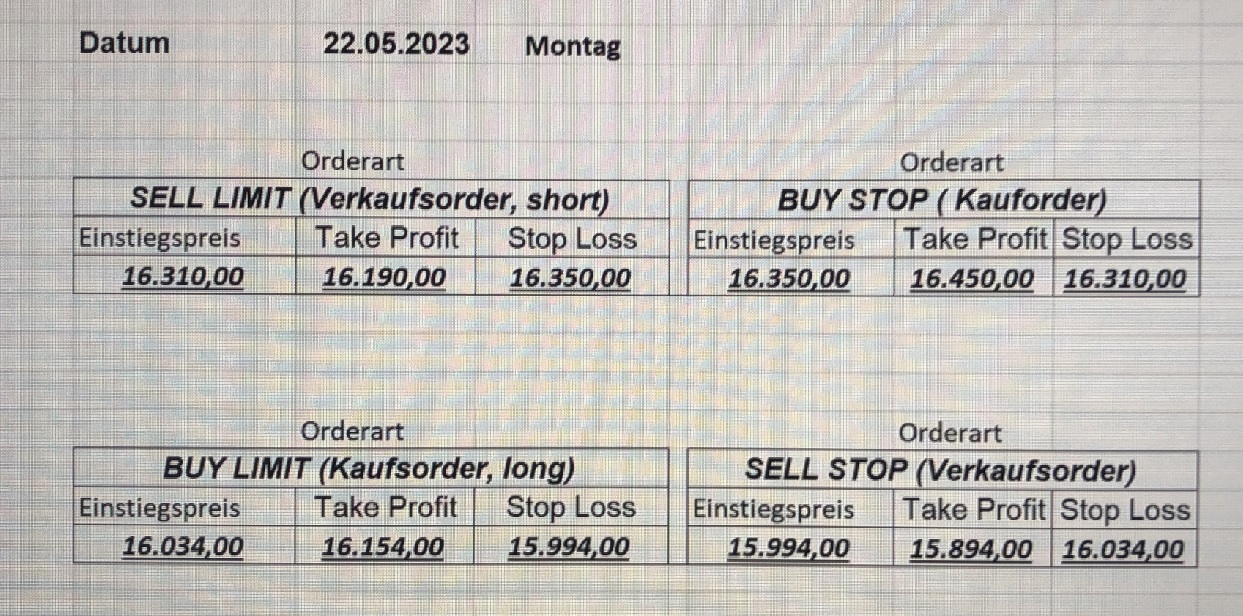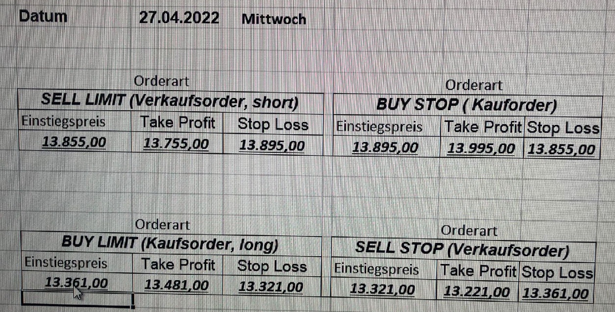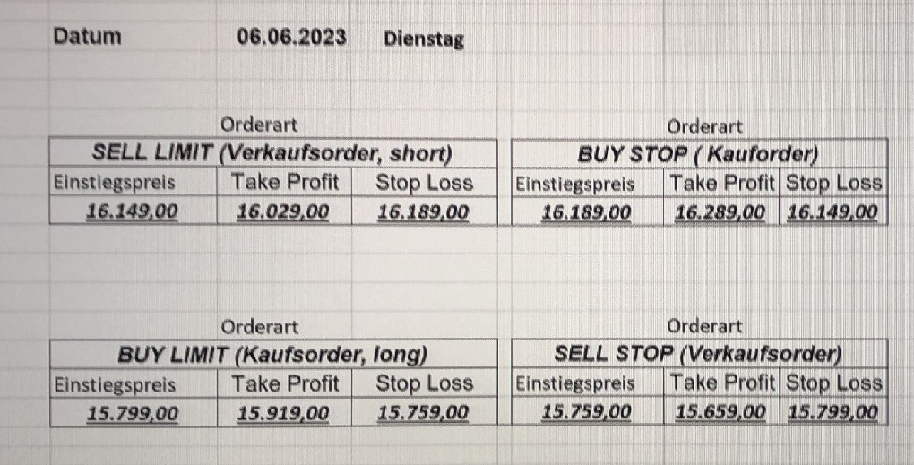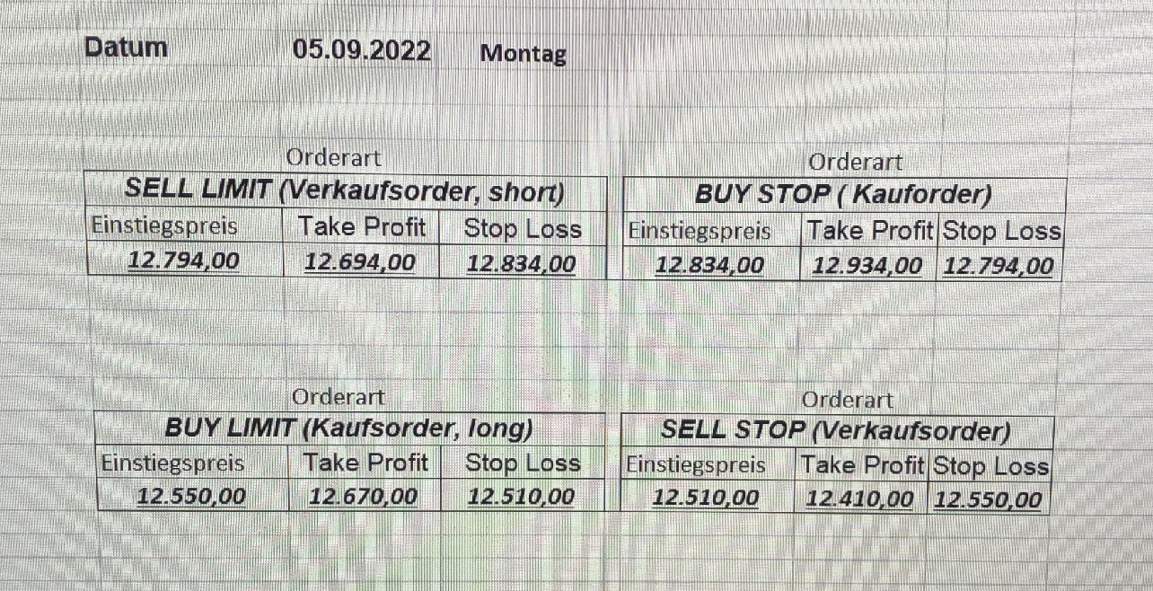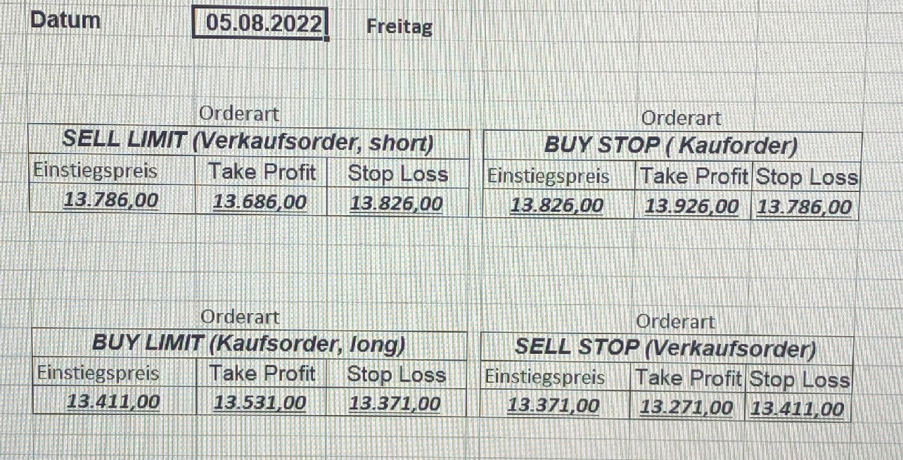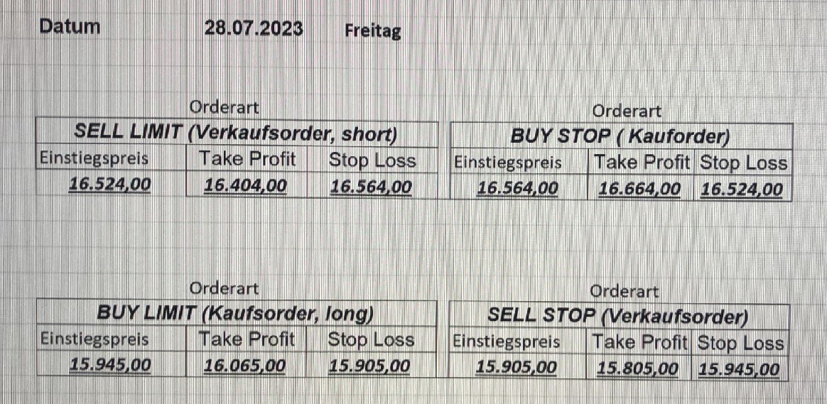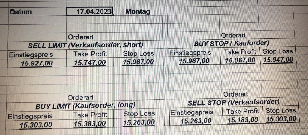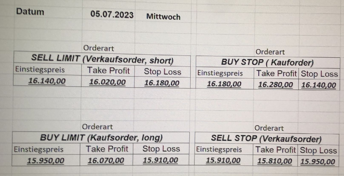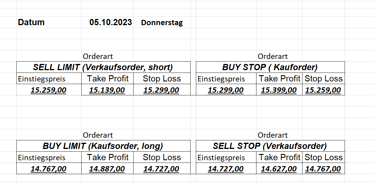 16.5.2023 Platzieren Sie die  Order bis 9:00 Löschen Sie bitte offene Order und Positionen um 21:45 ! Zur Frage der Punktgröße: Beispielrechnung: Bitte immer kurz auf den am weitest entfernten Stopp schauen. Diese Punktzahl sollte nicht mehr als 0,5% bis 1% des Kapitals ausmachen. 15.5.2023 Platzieren Sie die  Order bis 9:00 Löschen Sie bitte offene Order und Positionen um 21:45 ! Zur Frage der Punktgröße: Beispielrechnung: Bitte immer kurz auf den am weitest entfernten Stopp schauen. Diese Punktzahl sollte nicht mehr als 0,5% bis 1% des Kapitals ausmachen. 12.5.2023 Platzieren Sie die  Order bis 9:00 Löschen Sie bitte offene Order und Positionen um 21:45 ! Zur Frage der Punktgröße: Beispielrechnung: Bitte immer kurz auf den am weitest entfernten Stopp schauen. Diese Punktzahl sollte nicht mehr als 0,5% bis 1% des Kapitals ausmachen. 10.5.2023  Platzieren Sie die  Order bis 9:00 Löschen Sie bitte offene Order und Positionen um 21:45 ! Zur Frage der Punktgröße: Beispielrechnung: Bitte immer kurz auf den am weitest entfernten Stopp schauen. Diese Punktzahl sollte nicht mehr als 0,5% bis 1% des Kapitals ausmachen. 9.5.2023 Platzieren Sie die  Order bis 9:00 Löschen Sie bitte offene Order und Positionen um 21:45 ! Zur Frage der Punktgröße: Beispielrechnung: Bitte immer kurz auf den am weitest entfernten Stopp schauen. Diese Punktzahl sollte nicht mehr als 0,5% bis 1% des Kapitals ausmachen.   8.5.2023 Platzieren Sie die  Order bis 9:00 Löschen Sie bitte offene Order und Positionen um 21:45 ! Zur Frage der Punktgröße: Beispielrechnung: Bitte immer kurz auf den am weitest entfernten Stopp schauen. Diese Punktzahl sollte nicht mehr als 0,5% bis 1% des Kapitals ausmachen. 5.5.2023 Platzieren Sie die  Order bis 9:00 Löschen Sie bitte offene Order und Positionen um 21:45 ! Zur Frage der Punktgröße: Beispielrechnung: Bitte immer kurz auf den am weitest entfernten Stopp schauen. Diese Punktzahl sollte nicht mehr als 0,5% bis 1% des Kapitals ausmachen. 4.5.2023 Platzieren Sie die  Order bis 9:00 Löschen Sie bitte offene Order und Positionen um 21:45 ! Zur Frage der Punktgröße: Beispielrechnung: Bitte immer kurz auf den am weitest entfernten Stopp schauen. Diese Punktzahl sollte nicht mehr als 0,5% bis 1% des Kapitals ausmachen. 3.5.2023 Heute abend FED-Sitzung: Wir bleiben heute aus dem Markt! 2.5.2023 Platzieren Sie die  Order bis 9:00 Löschen Sie bitte offene Order und Positionen um 21:45 ! Zur Frage der Punktgröße: Beispielrechnung: Bitte immer kurz auf den am weitest entfernten Stopp schauen. Diese Punktzahl sollte nicht mehr als 0,5% bis 1% des Kapitals ausmachen. 28.4.2023 Platzieren Sie die  Order bis 9:00 Löschen Sie bitte offene Order und Positionen um 21:45 ! Zur Frage der Punktgröße: Beispielrechnung: Bitte immer kurz auf den am weitest entfernten Stopp schauen. Diese Punktzahl sollte nicht mehr als 0,5% bis 1% des Kapitals ausmachen. 27.4.2023 Platzieren Sie die  Order bis 9:00 Löschen Sie bitte offene Order und Positionen um 21:45 ! Zur Frage der Punktgröße: Beispielrechnung: Bitte immer kurz auf den am weitest entfernten Stopp schauen. Diese Punktzahl sollte nicht mehr als 0,5% bis 1% des Kapitals ausmachen. 26.4.2023 Platzieren Sie die  Order bis 9:00 Löschen Sie bitte offene Order und Positionen um 21:45 ! Zur Frage der Punktgröße: Beispielrechnung: Bitte immer kurz auf den am weitest entfernten Stopp schauen. Diese Punktzahl sollte nicht mehr als 0,5% bis 1% des Kapitals ausmachen. 25.4.2023 Platzieren Sie die  Order bis 9:00 Löschen Sie bitte offene Order und Positionen um 21:45 ! Zur Frage der Punktgröße: Beispielrechnung: Bitte immer kurz auf den am weitest entfernten Stopp schauen. Diese Punktzahl sollte nicht mehr als 0,5% bis 1% des Kapitals ausmachen. 24.4.2023 Platzieren Sie die  Order bis 9:00 Löschen Sie bitte offene Order und Positionen um 21:45 ! Zur Frage der Punktgröße: Beispielrechnung: Bitte immer kurz auf den am weitest entfernten Stopp schauen. Diese Punktzahl sollte nicht mehr als 0,5% bis 1% des Kapitals ausmachen. 21.4.2023 Platzieren Sie die  Order bis 9:00 Löschen Sie bitte offene Order und Positionen um 21:45 ! Zur Frage der Punktgröße: Beispielrechnung: Bitte immer kurz auf den am weitest entfernten Stopp schauen. Diese Punktzahl sollte nicht mehr als 0,5% bis 1% des Kapitals ausmachen. Sorry, falscher Wochentag, aber es sind die heutigen Signale!    20.4.2023 Platzieren Sie die  Order bis 9:00 Löschen Sie bitte offene Order und Positionen um 21:45 ! Zur Frage der Punktgröße: Beispielrechnung: Bitte immer kurz auf den am weitest entfernten Stopp schauen. Diese Punktzahl sollte nicht mehr als 0,5% bis 1% des Kapitals ausmachen. 19.4.2023 Platzieren Sie die  Order bis 9:00 Löschen Sie bitte offene Order und Positionen um 21:45 ! Zur Frage der Punktgröße: Beispielrechnung: Bitte immer kurz auf den am weitest entfernten Stopp schauen. Diese Punktzahl sollte nicht mehr als 0,5% bis 1% des Kapitals ausmachen. 18.4.2023 Platzieren Sie die  Order bis 9:00 Löschen Sie bitte offene Order und Positionen um 21:45 ! Zur Frage der Punktgröße: Beispielrechnung: Bitte immer kurz auf den am weitest entfernten Stopp schauen. Diese Punktzahl sollte nicht mehr als 0,5% bis 1% des Kapitals ausmachen.  17.4.2023 Platzieren Sie die  Order bis 9:00 Löschen Sie bitte offene Order und Positionen um 21:45 ! Zur Frage der Punktgröße: Beispielrechnung: Bitte immer kurz auf den am weitest entfernten Stopp schauen. Diese Punktzahl sollte nicht mehr als 0,5% bis 1% des Kapitals ausmachen. 14.4.2023 Platzieren Sie die  Order bis 9:00 Löschen Sie bitte offene Order und Positionen um 21:45 ! Zur Frage der Punktgröße: Beispielrechnung: Bitte immer kurz auf den am weitest entfernten Stopp schauen. Diese Punktzahl sollte nicht mehr als 0,5% bis 1% des Kapitals ausmachen. 13.4.2023 Heute bleiben wir an der Seitenlinie. Aktuell ist der DAX nicht volatil genug!  12.4.2023 Pla