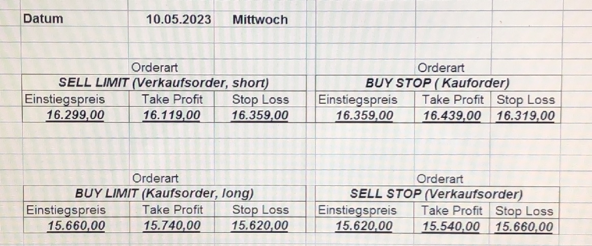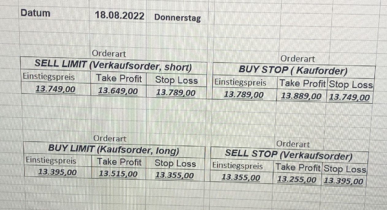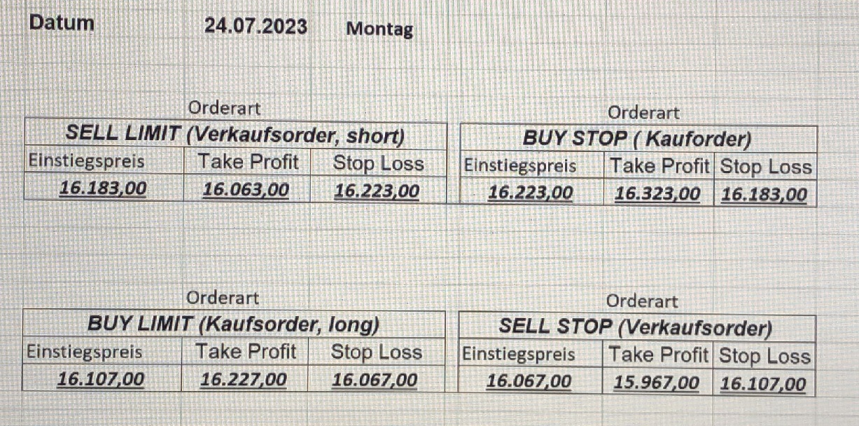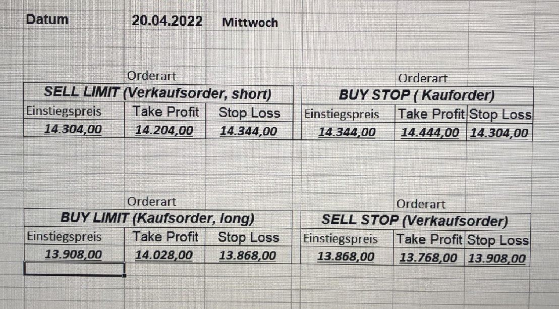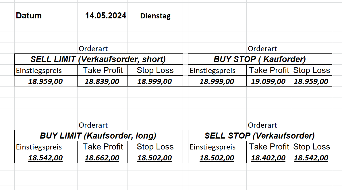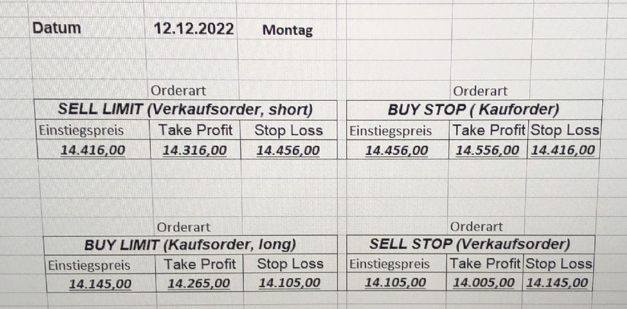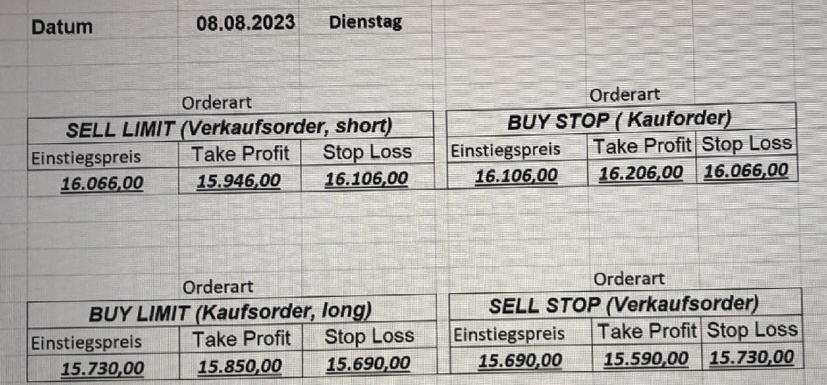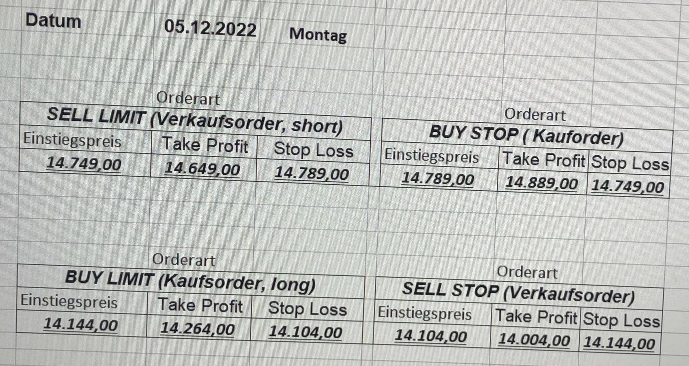 16.5.2023 Platzieren Sie die  Order bis 9:00 Löschen Sie bitte offene Order und Positionen um 21:45 ! Zur Frage der Punktgröße: Beispielrechnung: Bitte immer kurz auf den am weitest entfernten Stopp schauen. Diese Punktzahl sollte nicht mehr als 0,5% bis 1% des Kapitals ausmachen. 15.5.2023 Platzieren Sie die  Order bis 9:00 Löschen Sie bitte offene Order und Positionen um 21:45 ! Zur Frage der Punktgröße: Beispielrechnung: Bitte immer kurz auf den am weitest entfernten Stopp schauen. Diese Punktzahl sollte nicht mehr als 0,5% bis 1% des Kapitals ausmachen. 12.5.2023 Platzieren Sie die  Order bis 9:00 Löschen Sie bitte offene Order und Positionen um 21:45 ! Zur Frage der Punktgröße: Beispielrechnung: Bitte immer kurz auf den am weitest entfernten Stopp schauen. Diese Punktzahl sollte nicht mehr als 0,5% bis 1% des Kapitals ausmachen. 10.5.2023  Platzieren Sie die  Order bis 9:00 Löschen Sie bitte offene Order und Positionen um 21:45 ! Zur Frage der Punktgröße: Beispielrechnung: Bitte immer kurz auf den am weitest entfernten Stopp schauen. Diese Punktzahl sollte nicht mehr als 0,5% bis 1% des Kapitals ausmachen. 9.5.2023 Platzieren Sie die  Order bis 9:00 Löschen Sie bitte offene Order und Positionen um 21:45 ! Zur Frage der Punktgröße: Beispielrechnung: Bitte immer kurz auf den am weitest entfernten Stopp schauen. Diese Punktzahl sollte nicht mehr als 0,5% bis 1% des Kapitals ausmachen.   8.5.2023 Platzieren Sie die  Order bis 9:00 Löschen Sie bitte offene Order und Positionen um 21:45 ! Zur Frage der Punktgröße: Beispielrechnung: Bitte immer kurz auf den am weitest entfernten Stopp schauen. Diese Punktzahl sollte nicht mehr als 0,5% bis 1% des Kapitals ausmachen. 5.5.2023 Platzieren Sie die  Order bis 9:00 Löschen Sie bitte offene Order und Positionen um 21:45 ! Zur Frage der Punktgröße: Beispielrechnung: Bitte immer kurz auf den am weitest entfernten Stopp schauen. Diese Punktzahl sollte nicht mehr als 0,5% bis 1% des Kapitals ausmachen. 4.5.2023 Platzieren Sie die  Order bis 9:00 Löschen Sie bitte offene Order und Positionen um 21:45 ! Zur Frage der Punktgröße: Beispielrechnung: Bitte immer kurz auf den am weitest entfernten Stopp schauen. Diese Punktzahl sollte nicht mehr als 0,5% bis 1% des Kapitals ausmachen. 3.5.2023 Heute abend FED-Sitzung: Wir bleiben heute aus dem Markt! 2.5.2023 Platzieren Sie die  Order bis 9:00 Löschen Sie bitte offene Order und Positionen um 21:45 ! Zur Frage der Punktgröße: Beispielrechnung: Bitte immer kurz auf den am weitest entfernten Stopp schauen. Diese Punktzahl sollte nicht mehr als 0,5% bis 1% des Kapitals ausmachen. 28.4.2023 Platzieren Sie die  Order bis 9:00 Löschen Sie bitte offene Order und Positionen um 21:45 ! Zur Frage der Punktgröße: Beispielrechnung: Bitte immer kurz auf den am weitest entfernten Stopp schauen. Diese Punktzahl sollte nicht mehr als 0,5% bis 1% des Kapitals ausmachen. 27.4.2023 Platzieren Sie die  Order bis 9:00 Löschen Sie bitte offene Order und Positionen um 21:45 ! Zur Frage der Punktgröße: Beispielrechnung: Bitte immer kurz auf den am weitest entfernten Stopp schauen. Diese Punktzahl sollte nicht mehr als 0,5% bis 1% des Kapitals ausmachen. 26.4.2023 Platzieren Sie die  Order bis 9:00 Löschen Sie bitte offene Order und Positionen um 21:45 ! Zur Frage der Punktgröße: Beispielrechnung: Bitte immer kurz auf den am weitest entfernten Stopp schauen. Diese Punktzahl sollte nicht mehr als 0,5% bis 1% des Kapitals ausmachen. 25.4.2023 Platzieren Sie die  Order bis 9:00 Löschen Sie bitte offene Order und Positionen um 21:45 ! Zur Frage der Punktgröße: Beispielrechnung: Bitte immer kurz auf den am weitest entfernten Stopp schauen. Diese Punktzahl sollte nicht mehr als 0,5% bis 1% des Kapitals ausmachen. 24.4.2023 Platzieren Sie die  Order bis 9:00 Löschen Sie bitte offene Order und Positionen um 21:45 ! Zur Frage der Punktgröße: Beispielrechnung: Bitte immer kurz auf den am weitest entfernten Stopp schauen. Diese Punktzahl sollte nicht mehr als 0,5% bis 1% des Kapitals ausmachen. 21.4.2023 Platzieren Sie die  Order bis 9:00 Löschen Sie bitte offene Order und Positionen um 21:45 ! Zur Frage der Punktgröße: Beispielrechnung: Bitte immer kurz auf den am weitest entfernten Stopp schauen. Diese Punktzahl sollte nicht mehr als 0,5% bis 1% des Kapitals ausmachen. Sorry, falscher Wochentag, aber es sind die heutigen Signale!    20.4.2023 Platzieren Sie die  Order bis 9:00 Löschen Sie bitte offene Order und Positionen um 21:45 ! Zur Frage der Punktgröße: Beispielrechnung: Bitte immer kurz auf den am weitest entfernten Stopp schauen. Diese Punktzahl sollte nicht mehr als 0,5% bis 1% des Kapitals ausmachen. 19.4.2023 Platzieren Sie die  Order bis 9:00 Löschen Sie bitte offene Order und Positionen um 21:45 ! Zur Frage der Punktgröße: Beispielrechnung: Bitte immer kurz auf den am weitest entfernten Stopp schauen. Diese Punktzahl sollte nicht mehr als 0,5% bis 1% des Kapitals ausmachen. 18.4.2023 Platzieren Sie die  Order bis 9:00 Löschen Sie bitte offene Order und Positionen um 21:45 ! Zur Frage der Punktgröße: Beispielrechnung: Bitte immer kurz auf den am weitest entfernten Stopp schauen. Diese Punktzahl sollte nicht mehr als 0,5% bis 1% des Kapitals ausmachen.  17.4.2023 Platzieren Sie die  Order bis 9:00 Löschen Sie bitte offene Order und Positionen um 21:45 ! Zur Frage der Punktgröße: Beispielrechnung: Bitte immer kurz auf den am weitest entfernten Stopp schauen. Diese Punktzahl sollte nicht mehr als 0,5% bis 1% des Kapitals ausmachen. 14.4.2023 Platzieren Sie die  Order bis 9:00 Löschen Sie bitte offene Order und Positionen um 21:45 ! Zur Frage der Punktgröße: Beispielrechnung: Bitte immer kurz auf den am weitest entfernten Stopp schauen. Diese Punktzahl sollte nicht mehr als 0,5% bis 1% des Kapitals ausmachen. 13.4.2023 Heute bleiben wir an der Seitenlinie. Aktuell ist der DAX nicht volatil genug!  12.4.2023 Pla