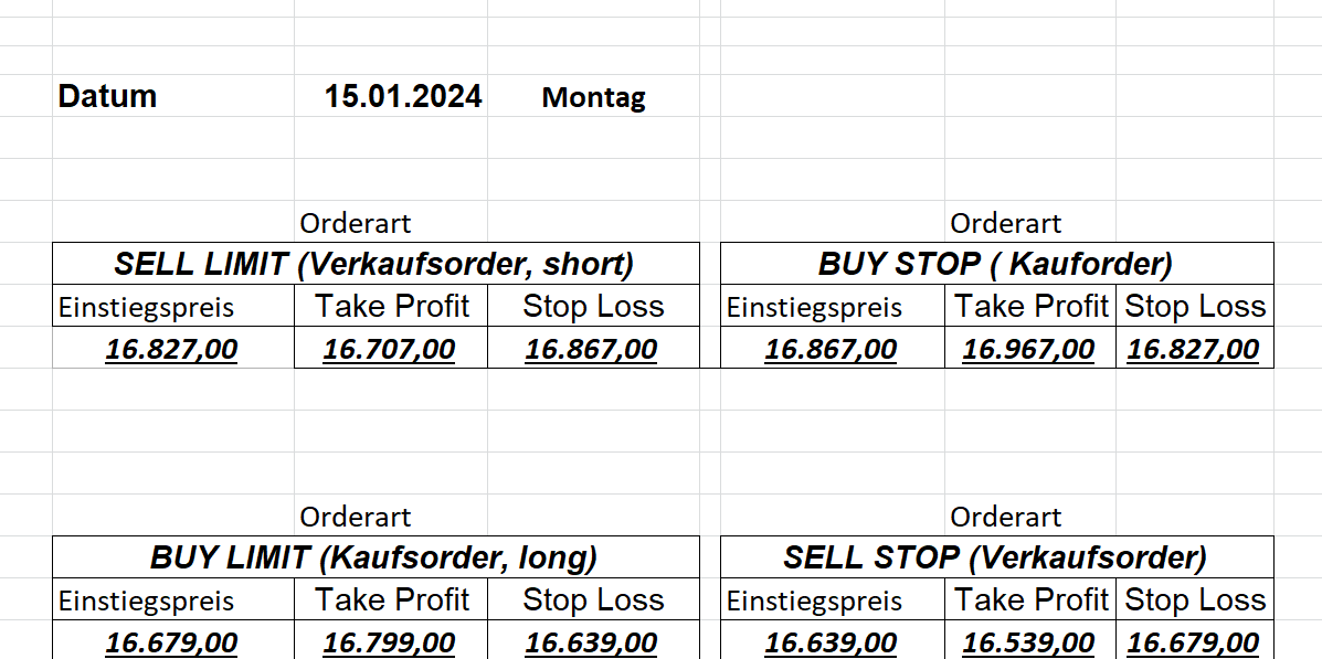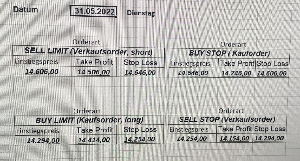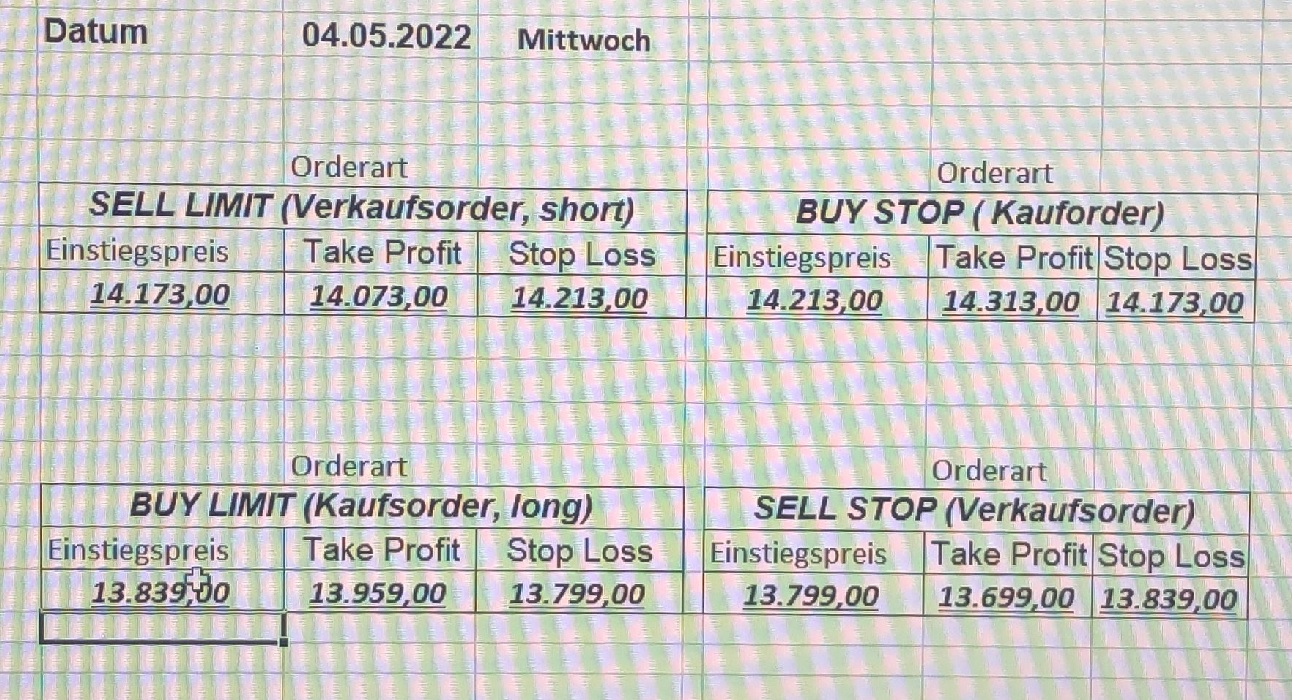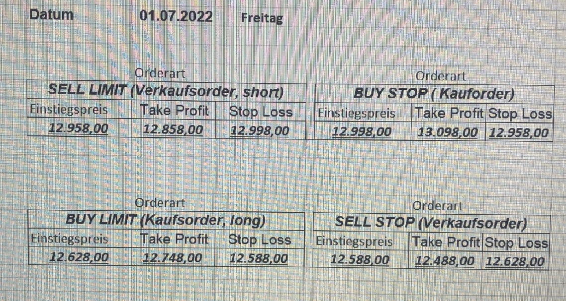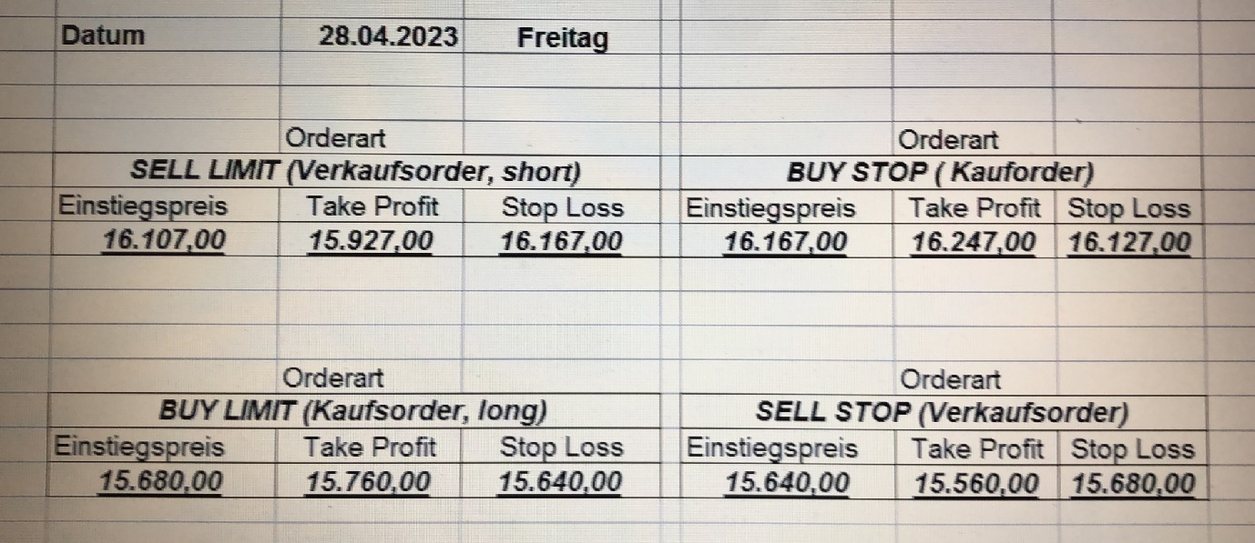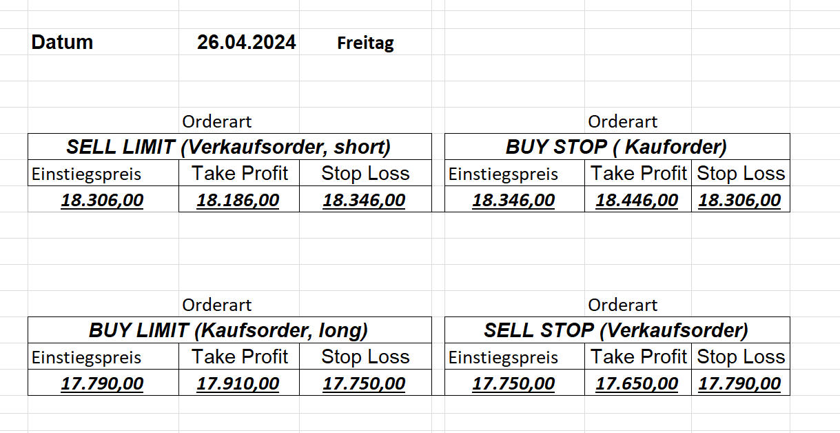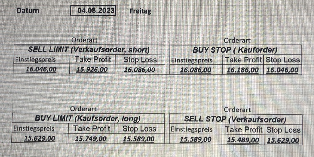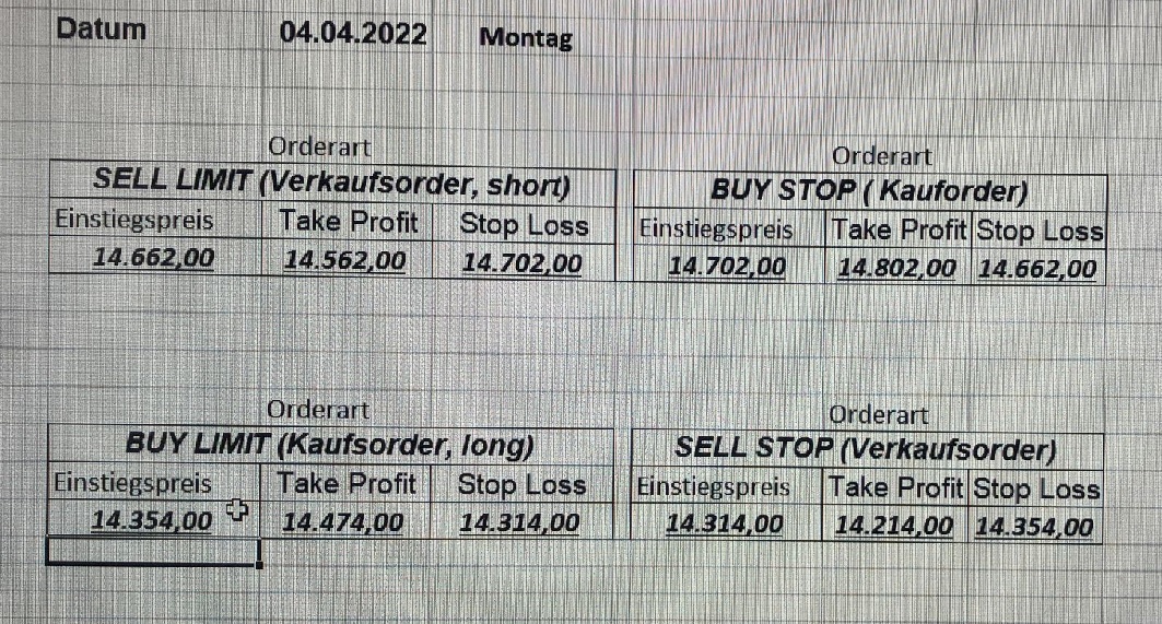 16.5.2023 Platzieren Sie die  Order bis 9:00 Löschen Sie bitte offene Order und Positionen um 21:45 ! Zur Frage der Punktgröße: Beispielrechnung: Bitte immer kurz auf den am weitest entfernten Stopp schauen. Diese Punktzahl sollte nicht mehr als 0,5% bis 1% des Kapitals ausmachen. 15.5.2023 Platzieren Sie die  Order bis 9:00 Löschen Sie bitte offene Order und Positionen um 21:45 ! Zur Frage der Punktgröße: Beispielrechnung: Bitte immer kurz auf den am weitest entfernten Stopp schauen. Diese Punktzahl sollte nicht mehr als 0,5% bis 1% des Kapitals ausmachen. 12.5.2023 Platzieren Sie die  Order bis 9:00 Löschen Sie bitte offene Order und Positionen um 21:45 ! Zur Frage der Punktgröße: Beispielrechnung: Bitte immer kurz auf den am weitest entfernten Stopp schauen. Diese Punktzahl sollte nicht mehr als 0,5% bis 1% des Kapitals ausmachen. 10.5.2023  Platzieren Sie die  Order bis 9:00 Löschen Sie bitte offene Order und Positionen um 21:45 ! Zur Frage der Punktgröße: Beispielrechnung: Bitte immer kurz auf den am weitest entfernten Stopp schauen. Diese Punktzahl sollte nicht mehr als 0,5% bis 1% des Kapitals ausmachen. 9.5.2023 Platzieren Sie die  Order bis 9:00 Löschen Sie bitte offene Order und Positionen um 21:45 ! Zur Frage der Punktgröße: Beispielrechnung: Bitte immer kurz auf den am weitest entfernten Stopp schauen. Diese Punktzahl sollte nicht mehr als 0,5% bis 1% des Kapitals ausmachen.   8.5.2023 Platzieren Sie die  Order bis 9:00 Löschen Sie bitte offene Order und Positionen um 21:45 ! Zur Frage der Punktgröße: Beispielrechnung: Bitte immer kurz auf den am weitest entfernten Stopp schauen. Diese Punktzahl sollte nicht mehr als 0,5% bis 1% des Kapitals ausmachen. 5.5.2023 Platzieren Sie die  Order bis 9:00 Löschen Sie bitte offene Order und Positionen um 21:45 ! Zur Frage der Punktgröße: Beispielrechnung: Bitte immer kurz auf den am weitest entfernten Stopp schauen. Diese Punktzahl sollte nicht mehr als 0,5% bis 1% des Kapitals ausmachen. 4.5.2023 Platzieren Sie die  Order bis 9:00 Löschen Sie bitte offene Order und Positionen um 21:45 ! Zur Frage der Punktgröße: Beispielrechnung: Bitte immer kurz auf den am weitest entfernten Stopp schauen. Diese Punktzahl sollte nicht mehr als 0,5% bis 1% des Kapitals ausmachen. 3.5.2023 Heute abend FED-Sitzung: Wir bleiben heute aus dem Markt! 2.5.2023 Platzieren Sie die  Order bis 9:00 Löschen Sie bitte offene Order und Positionen um 21:45 ! Zur Frage der Punktgröße: Beispielrechnung: Bitte immer kurz auf den am weitest entfernten Stopp schauen. Diese Punktzahl sollte nicht mehr als 0,5% bis 1% des Kapitals ausmachen. 28.4.2023 Platzieren Sie die  Order bis 9:00 Löschen Sie bitte offene Order und Positionen um 21:45 ! Zur Frage der Punktgröße: Beispielrechnung: Bitte immer kurz auf den am weitest entfernten Stopp schauen. Diese Punktzahl sollte nicht mehr als 0,5% bis 1% des Kapitals ausmachen. 27.4.2023 Platzieren Sie die  Order bis 9:00 Löschen Sie bitte offene Order und Positionen um 21:45 ! Zur Frage der Punktgröße: Beispielrechnung: Bitte immer kurz auf den am weitest entfernten Stopp schauen. Diese Punktzahl sollte nicht mehr als 0,5% bis 1% des Kapitals ausmachen. 26.4.2023 Platzieren Sie die  Order bis 9:00 Löschen Sie bitte offene Order und Positionen um 21:45 ! Zur Frage der Punktgröße: Beispielrechnung: Bitte immer kurz auf den am weitest entfernten Stopp schauen. Diese Punktzahl sollte nicht mehr als 0,5% bis 1% des Kapitals ausmachen. 25.4.2023 Platzieren Sie die  Order bis 9:00 Löschen Sie bitte offene Order und Positionen um 21:45 ! Zur Frage der Punktgröße: Beispielrechnung: Bitte immer kurz auf den am weitest entfernten Stopp schauen. Diese Punktzahl sollte nicht mehr als 0,5% bis 1% des Kapitals ausmachen. 24.4.2023 Platzieren Sie die  Order bis 9:00 Löschen Sie bitte offene Order und Positionen um 21:45 ! Zur Frage der Punktgröße: Beispielrechnung: Bitte immer kurz auf den am weitest entfernten Stopp schauen. Diese Punktzahl sollte nicht mehr als 0,5% bis 1% des Kapitals ausmachen. 21.4.2023 Platzieren Sie die  Order bis 9:00 Löschen Sie bitte offene Order und Positionen um 21:45 ! Zur Frage der Punktgröße: Beispielrechnung: Bitte immer kurz auf den am weitest entfernten Stopp schauen. Diese Punktzahl sollte nicht mehr als 0,5% bis 1% des Kapitals ausmachen. Sorry, falscher Wochentag, aber es sind die heutigen Signale!    20.4.2023 Platzieren Sie die  Order bis 9:00 Löschen Sie bitte offene Order und Positionen um 21:45 ! Zur Frage der Punktgröße: Beispielrechnung: Bitte immer kurz auf den am weitest entfernten Stopp schauen. Diese Punktzahl sollte nicht mehr als 0,5% bis 1% des Kapitals ausmachen. 19.4.2023 Platzieren Sie die  Order bis 9:00 Löschen Sie bitte offene Order und Positionen um 21:45 ! Zur Frage der Punktgröße: Beispielrechnung: Bitte immer kurz auf den am weitest entfernten Stopp schauen. Diese Punktzahl sollte nicht mehr als 0,5% bis 1% des Kapitals ausmachen. 18.4.2023 Platzieren Sie die  Order bis 9:00 Löschen Sie bitte offene Order und Positionen um 21:45 ! Zur Frage der Punktgröße: Beispielrechnung: Bitte immer kurz auf den am weitest entfernten Stopp schauen. Diese Punktzahl sollte nicht mehr als 0,5% bis 1% des Kapitals ausmachen.  17.4.2023 Platzieren Sie die  Order bis 9:00 Löschen Sie bitte offene Order und Positionen um 21:45 ! Zur Frage der Punktgröße: Beispielrechnung: Bitte immer kurz auf den am weitest entfernten Stopp schauen. Diese Punktzahl sollte nicht mehr als 0,5% bis 1% des Kapitals ausmachen. 14.4.2023 Platzieren Sie die  Order bis 9:00 Löschen Sie bitte offene Order und Positionen um 21:45 ! Zur Frage der Punktgröße: Beispielrechnung: Bitte immer kurz auf den am weitest entfernten Stopp schauen. Diese Punktzahl sollte nicht mehr als 0,5% bis 1% des Kapitals ausmachen. 13.4.2023 Heute bleiben wir an der Seitenlinie. Aktuell ist der DAX nicht volatil genug!  12.4.2023 Pla