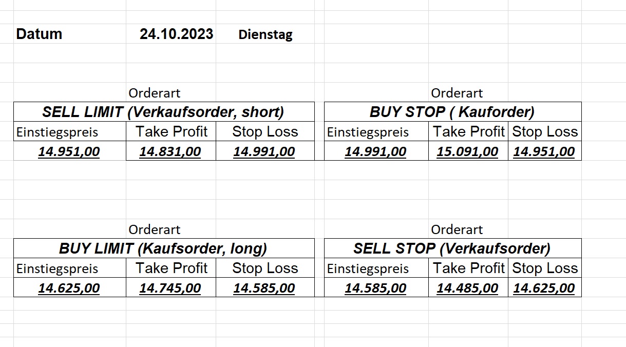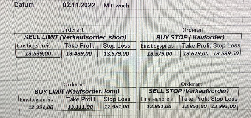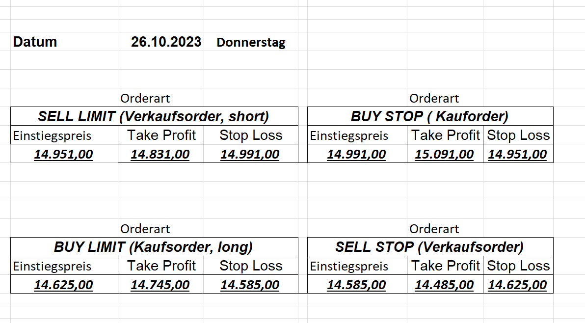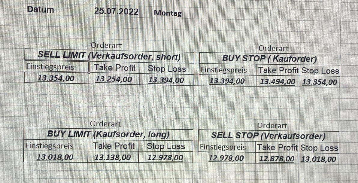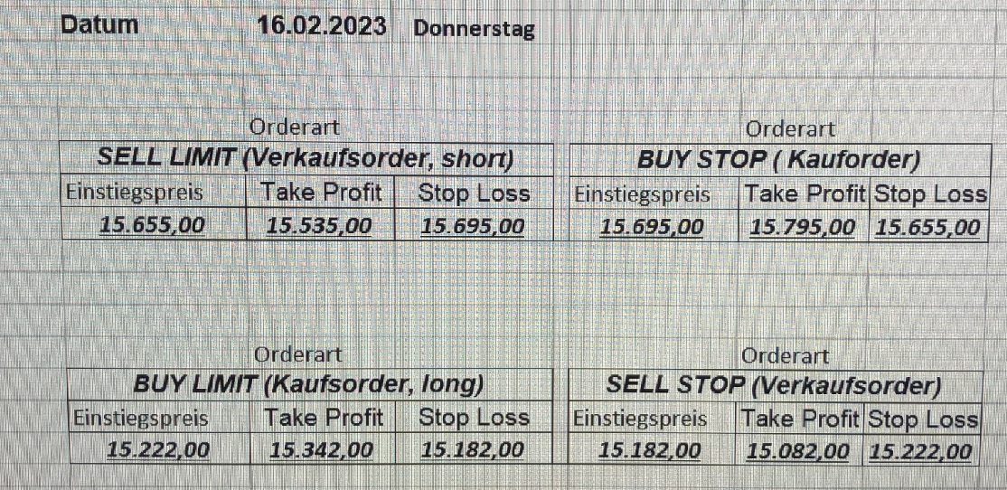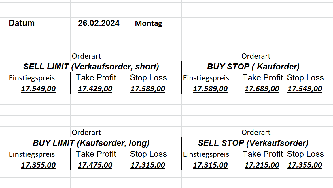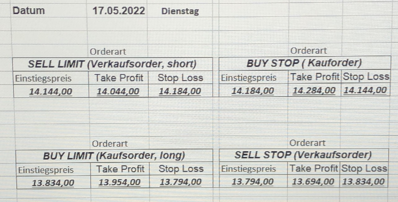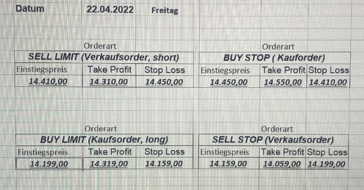 16.5.2023 Platzieren Sie die  Order bis 9:00 Löschen Sie bitte offene Order und Positionen um 21:45 ! Zur Frage der Punktgröße: Beispielrechnung: Bitte immer kurz auf den am weitest entfernten Stopp schauen. Diese Punktzahl sollte nicht mehr als 0,5% bis 1% des Kapitals ausmachen. 15.5.2023 Platzieren Sie die  Order bis 9:00 Löschen Sie bitte offene Order und Positionen um 21:45 ! Zur Frage der Punktgröße: Beispielrechnung: Bitte immer kurz auf den am weitest entfernten Stopp schauen. Diese Punktzahl sollte nicht mehr als 0,5% bis 1% des Kapitals ausmachen. 12.5.2023 Platzieren Sie die  Order bis 9:00 Löschen Sie bitte offene Order und Positionen um 21:45 ! Zur Frage der Punktgröße: Beispielrechnung: Bitte immer kurz auf den am weitest entfernten Stopp schauen. Diese Punktzahl sollte nicht mehr als 0,5% bis 1% des Kapitals ausmachen. 10.5.2023  Platzieren Sie die  Order bis 9:00 Löschen Sie bitte offene Order und Positionen um 21:45 ! Zur Frage der Punktgröße: Beispielrechnung: Bitte immer kurz auf den am weitest entfernten Stopp schauen. Diese Punktzahl sollte nicht mehr als 0,5% bis 1% des Kapitals ausmachen. 9.5.2023 Platzieren Sie die  Order bis 9:00 Löschen Sie bitte offene Order und Positionen um 21:45 ! Zur Frage der Punktgröße: Beispielrechnung: Bitte immer kurz auf den am weitest entfernten Stopp schauen. Diese Punktzahl sollte nicht mehr als 0,5% bis 1% des Kapitals ausmachen.   8.5.2023 Platzieren Sie die  Order bis 9:00 Löschen Sie bitte offene Order und Positionen um 21:45 ! Zur Frage der Punktgröße: Beispielrechnung: Bitte immer kurz auf den am weitest entfernten Stopp schauen. Diese Punktzahl sollte nicht mehr als 0,5% bis 1% des Kapitals ausmachen. 5.5.2023 Platzieren Sie die  Order bis 9:00 Löschen Sie bitte offene Order und Positionen um 21:45 ! Zur Frage der Punktgröße: Beispielrechnung: Bitte immer kurz auf den am weitest entfernten Stopp schauen. Diese Punktzahl sollte nicht mehr als 0,5% bis 1% des Kapitals ausmachen. 4.5.2023 Platzieren Sie die  Order bis 9:00 Löschen Sie bitte offene Order und Positionen um 21:45 ! Zur Frage der Punktgröße: Beispielrechnung: Bitte immer kurz auf den am weitest entfernten Stopp schauen. Diese Punktzahl sollte nicht mehr als 0,5% bis 1% des Kapitals ausmachen. 3.5.2023 Heute abend FED-Sitzung: Wir bleiben heute aus dem Markt! 2.5.2023 Platzieren Sie die  Order bis 9:00 Löschen Sie bitte offene Order und Positionen um 21:45 ! Zur Frage der Punktgröße: Beispielrechnung: Bitte immer kurz auf den am weitest entfernten Stopp schauen. Diese Punktzahl sollte nicht mehr als 0,5% bis 1% des Kapitals ausmachen. 28.4.2023 Platzieren Sie die  Order bis 9:00 Löschen Sie bitte offene Order und Positionen um 21:45 ! Zur Frage der Punktgröße: Beispielrechnung: Bitte immer kurz auf den am weitest entfernten Stopp schauen. Diese Punktzahl sollte nicht mehr als 0,5% bis 1% des Kapitals ausmachen. 27.4.2023 Platzieren Sie die  Order bis 9:00 Löschen Sie bitte offene Order und Positionen um 21:45 ! Zur Frage der Punktgröße: Beispielrechnung: Bitte immer kurz auf den am weitest entfernten Stopp schauen. Diese Punktzahl sollte nicht mehr als 0,5% bis 1% des Kapitals ausmachen. 26.4.2023 Platzieren Sie die  Order bis 9:00 Löschen Sie bitte offene Order und Positionen um 21:45 ! Zur Frage der Punktgröße: Beispielrechnung: Bitte immer kurz auf den am weitest entfernten Stopp schauen. Diese Punktzahl sollte nicht mehr als 0,5% bis 1% des Kapitals ausmachen. 25.4.2023 Platzieren Sie die  Order bis 9:00 Löschen Sie bitte offene Order und Positionen um 21:45 ! Zur Frage der Punktgröße: Beispielrechnung: Bitte immer kurz auf den am weitest entfernten Stopp schauen. Diese Punktzahl sollte nicht mehr als 0,5% bis 1% des Kapitals ausmachen. 24.4.2023 Platzieren Sie die  Order bis 9:00 Löschen Sie bitte offene Order und Positionen um 21:45 ! Zur Frage der Punktgröße: Beispielrechnung: Bitte immer kurz auf den am weitest entfernten Stopp schauen. Diese Punktzahl sollte nicht mehr als 0,5% bis 1% des Kapitals ausmachen. 21.4.2023 Platzieren Sie die  Order bis 9:00 Löschen Sie bitte offene Order und Positionen um 21:45 ! Zur Frage der Punktgröße: Beispielrechnung: Bitte immer kurz auf den am weitest entfernten Stopp schauen. Diese Punktzahl sollte nicht mehr als 0,5% bis 1% des Kapitals ausmachen. Sorry, falscher Wochentag, aber es sind die heutigen Signale!    20.4.2023 Platzieren Sie die  Order bis 9:00 Löschen Sie bitte offene Order und Positionen um 21:45 ! Zur Frage der Punktgröße: Beispielrechnung: Bitte immer kurz auf den am weitest entfernten Stopp schauen. Diese Punktzahl sollte nicht mehr als 0,5% bis 1% des Kapitals ausmachen. 19.4.2023 Platzieren Sie die  Order bis 9:00 Löschen Sie bitte offene Order und Positionen um 21:45 ! Zur Frage der Punktgröße: Beispielrechnung: Bitte immer kurz auf den am weitest entfernten Stopp schauen. Diese Punktzahl sollte nicht mehr als 0,5% bis 1% des Kapitals ausmachen. 18.4.2023 Platzieren Sie die  Order bis 9:00 Löschen Sie bitte offene Order und Positionen um 21:45 ! Zur Frage der Punktgröße: Beispielrechnung: Bitte immer kurz auf den am weitest entfernten Stopp schauen. Diese Punktzahl sollte nicht mehr als 0,5% bis 1% des Kapitals ausmachen.  17.4.2023 Platzieren Sie die  Order bis 9:00 Löschen Sie bitte offene Order und Positionen um 21:45 ! Zur Frage der Punktgröße: Beispielrechnung: Bitte immer kurz auf den am weitest entfernten Stopp schauen. Diese Punktzahl sollte nicht mehr als 0,5% bis 1% des Kapitals ausmachen. 14.4.2023 Platzieren Sie die  Order bis 9:00 Löschen Sie bitte offene Order und Positionen um 21:45 ! Zur Frage der Punktgröße: Beispielrechnung: Bitte immer kurz auf den am weitest entfernten Stopp schauen. Diese Punktzahl sollte nicht mehr als 0,5% bis 1% des Kapitals ausmachen. 13.4.2023 Heute bleiben wir an der Seitenlinie. Aktuell ist der DAX nicht volatil genug!  12.4.2023 Pla