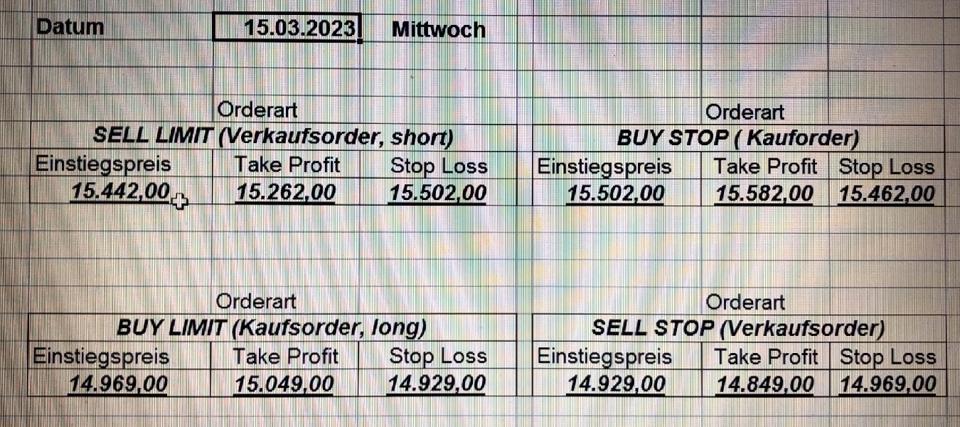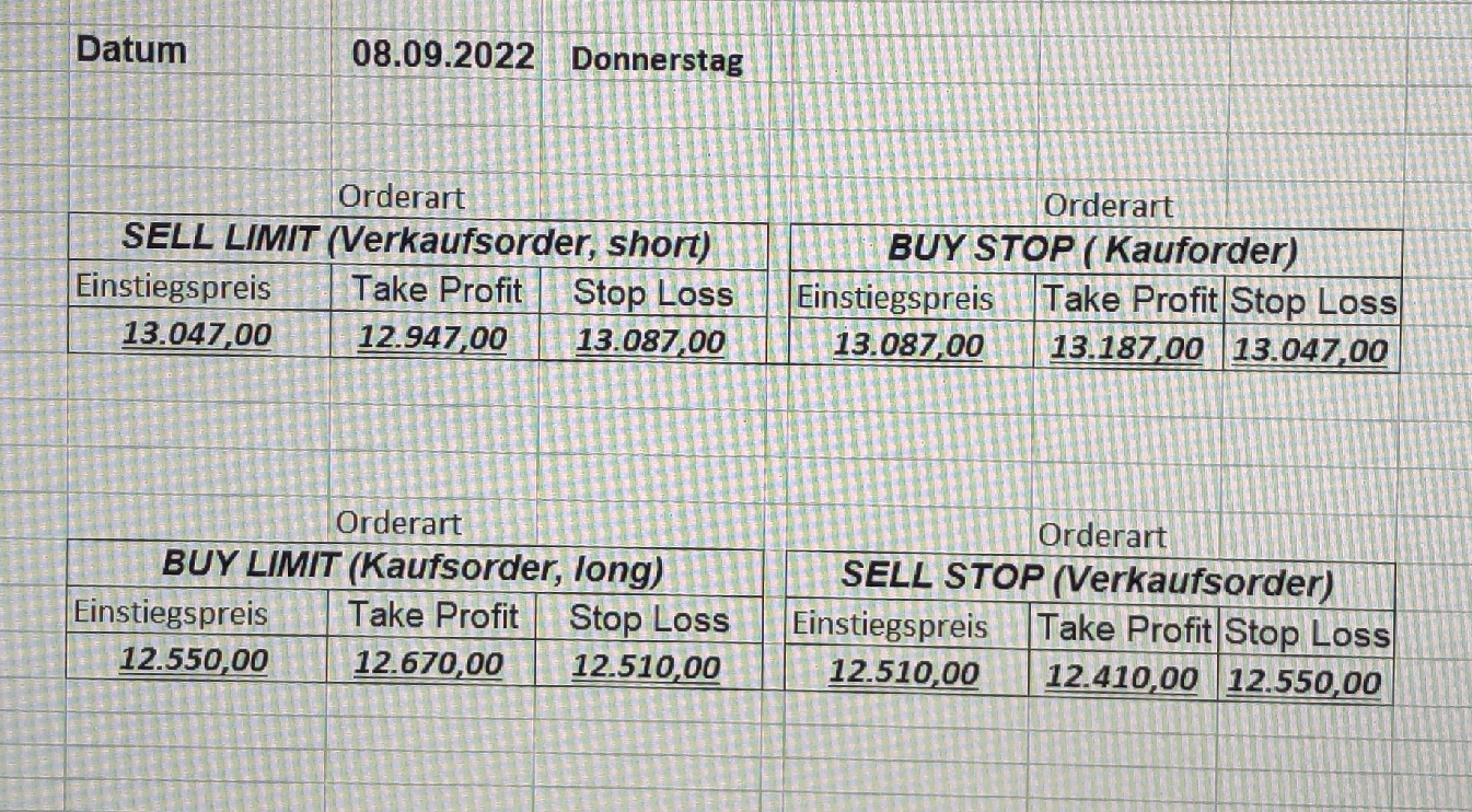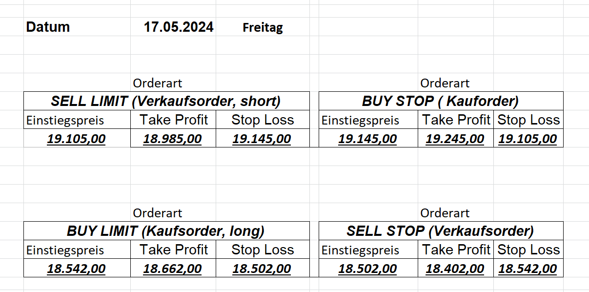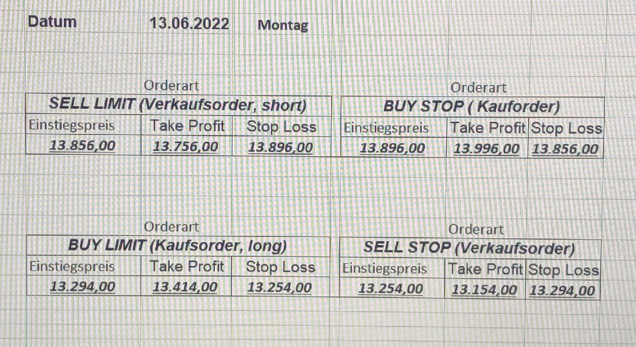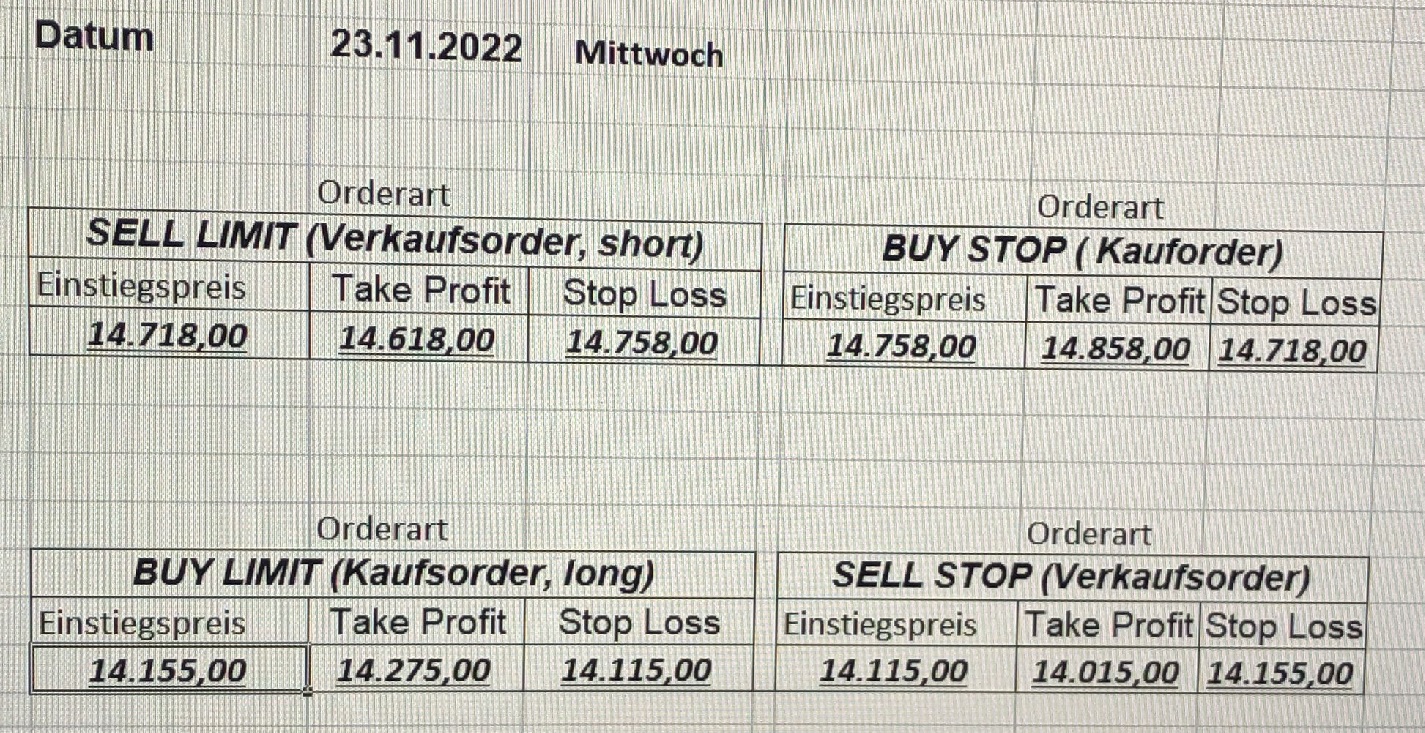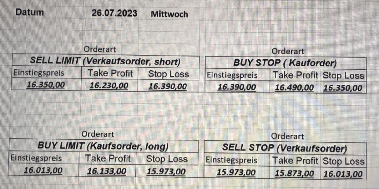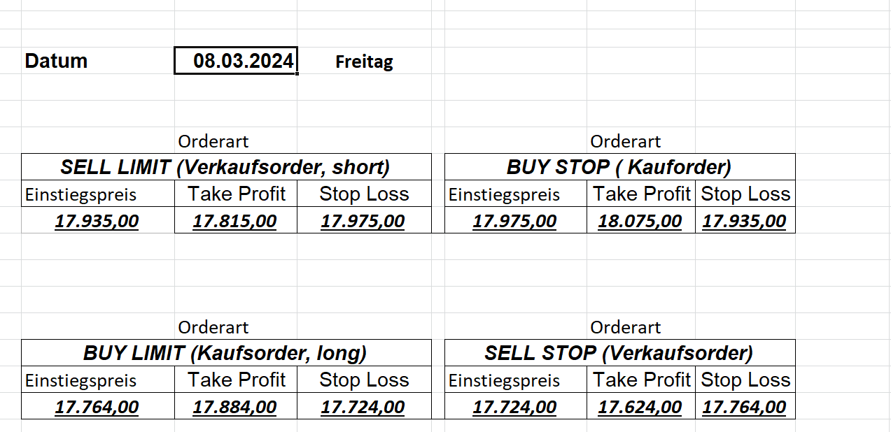 16.5.2023 Platzieren Sie die  Order bis 9:00 Löschen Sie bitte offene Order und Positionen um 21:45 ! Zur Frage der Punktgröße: Beispielrechnung: Bitte immer kurz auf den am weitest entfernten Stopp schauen. Diese Punktzahl sollte nicht mehr als 0,5% bis 1% des Kapitals ausmachen. 15.5.2023 Platzieren Sie die  Order bis 9:00 Löschen Sie bitte offene Order und Positionen um 21:45 ! Zur Frage der Punktgröße: Beispielrechnung: Bitte immer kurz auf den am weitest entfernten Stopp schauen. Diese Punktzahl sollte nicht mehr als 0,5% bis 1% des Kapitals ausmachen. 12.5.2023 Platzieren Sie die  Order bis 9:00 Löschen Sie bitte offene Order und Positionen um 21:45 ! Zur Frage der Punktgröße: Beispielrechnung: Bitte immer kurz auf den am weitest entfernten Stopp schauen. Diese Punktzahl sollte nicht mehr als 0,5% bis 1% des Kapitals ausmachen. 10.5.2023  Platzieren Sie die  Order bis 9:00 Löschen Sie bitte offene Order und Positionen um 21:45 ! Zur Frage der Punktgröße: Beispielrechnung: Bitte immer kurz auf den am weitest entfernten Stopp schauen. Diese Punktzahl sollte nicht mehr als 0,5% bis 1% des Kapitals ausmachen. 9.5.2023 Platzieren Sie die  Order bis 9:00 Löschen Sie bitte offene Order und Positionen um 21:45 ! Zur Frage der Punktgröße: Beispielrechnung: Bitte immer kurz auf den am weitest entfernten Stopp schauen. Diese Punktzahl sollte nicht mehr als 0,5% bis 1% des Kapitals ausmachen.   8.5.2023 Platzieren Sie die  Order bis 9:00 Löschen Sie bitte offene Order und Positionen um 21:45 ! Zur Frage der Punktgröße: Beispielrechnung: Bitte immer kurz auf den am weitest entfernten Stopp schauen. Diese Punktzahl sollte nicht mehr als 0,5% bis 1% des Kapitals ausmachen. 5.5.2023 Platzieren Sie die  Order bis 9:00 Löschen Sie bitte offene Order und Positionen um 21:45 ! Zur Frage der Punktgröße: Beispielrechnung: Bitte immer kurz auf den am weitest entfernten Stopp schauen. Diese Punktzahl sollte nicht mehr als 0,5% bis 1% des Kapitals ausmachen. 4.5.2023 Platzieren Sie die  Order bis 9:00 Löschen Sie bitte offene Order und Positionen um 21:45 ! Zur Frage der Punktgröße: Beispielrechnung: Bitte immer kurz auf den am weitest entfernten Stopp schauen. Diese Punktzahl sollte nicht mehr als 0,5% bis 1% des Kapitals ausmachen. 3.5.2023 Heute abend FED-Sitzung: Wir bleiben heute aus dem Markt! 2.5.2023 Platzieren Sie die  Order bis 9:00 Löschen Sie bitte offene Order und Positionen um 21:45 ! Zur Frage der Punktgröße: Beispielrechnung: Bitte immer kurz auf den am weitest entfernten Stopp schauen. Diese Punktzahl sollte nicht mehr als 0,5% bis 1% des Kapitals ausmachen. 28.4.2023 Platzieren Sie die  Order bis 9:00 Löschen Sie bitte offene Order und Positionen um 21:45 ! Zur Frage der Punktgröße: Beispielrechnung: Bitte immer kurz auf den am weitest entfernten Stopp schauen. Diese Punktzahl sollte nicht mehr als 0,5% bis 1% des Kapitals ausmachen. 27.4.2023 Platzieren Sie die  Order bis 9:00 Löschen Sie bitte offene Order und Positionen um 21:45 ! Zur Frage der Punktgröße: Beispielrechnung: Bitte immer kurz auf den am weitest entfernten Stopp schauen. Diese Punktzahl sollte nicht mehr als 0,5% bis 1% des Kapitals ausmachen. 26.4.2023 Platzieren Sie die  Order bis 9:00 Löschen Sie bitte offene Order und Positionen um 21:45 ! Zur Frage der Punktgröße: Beispielrechnung: Bitte immer kurz auf den am weitest entfernten Stopp schauen. Diese Punktzahl sollte nicht mehr als 0,5% bis 1% des Kapitals ausmachen. 25.4.2023 Platzieren Sie die  Order bis 9:00 Löschen Sie bitte offene Order und Positionen um 21:45 ! Zur Frage der Punktgröße: Beispielrechnung: Bitte immer kurz auf den am weitest entfernten Stopp schauen. Diese Punktzahl sollte nicht mehr als 0,5% bis 1% des Kapitals ausmachen. 24.4.2023 Platzieren Sie die  Order bis 9:00 Löschen Sie bitte offene Order und Positionen um 21:45 ! Zur Frage der Punktgröße: Beispielrechnung: Bitte immer kurz auf den am weitest entfernten Stopp schauen. Diese Punktzahl sollte nicht mehr als 0,5% bis 1% des Kapitals ausmachen. 21.4.2023 Platzieren Sie die  Order bis 9:00 Löschen Sie bitte offene Order und Positionen um 21:45 ! Zur Frage der Punktgröße: Beispielrechnung: Bitte immer kurz auf den am weitest entfernten Stopp schauen. Diese Punktzahl sollte nicht mehr als 0,5% bis 1% des Kapitals ausmachen. Sorry, falscher Wochentag, aber es sind die heutigen Signale!    20.4.2023 Platzieren Sie die  Order bis 9:00 Löschen Sie bitte offene Order und Positionen um 21:45 ! Zur Frage der Punktgröße: Beispielrechnung: Bitte immer kurz auf den am weitest entfernten Stopp schauen. Diese Punktzahl sollte nicht mehr als 0,5% bis 1% des Kapitals ausmachen. 19.4.2023 Platzieren Sie die  Order bis 9:00 Löschen Sie bitte offene Order und Positionen um 21:45 ! Zur Frage der Punktgröße: Beispielrechnung: Bitte immer kurz auf den am weitest entfernten Stopp schauen. Diese Punktzahl sollte nicht mehr als 0,5% bis 1% des Kapitals ausmachen. 18.4.2023 Platzieren Sie die  Order bis 9:00 Löschen Sie bitte offene Order und Positionen um 21:45 ! Zur Frage der Punktgröße: Beispielrechnung: Bitte immer kurz auf den am weitest entfernten Stopp schauen. Diese Punktzahl sollte nicht mehr als 0,5% bis 1% des Kapitals ausmachen.  17.4.2023 Platzieren Sie die  Order bis 9:00 Löschen Sie bitte offene Order und Positionen um 21:45 ! Zur Frage der Punktgröße: Beispielrechnung: Bitte immer kurz auf den am weitest entfernten Stopp schauen. Diese Punktzahl sollte nicht mehr als 0,5% bis 1% des Kapitals ausmachen. 14.4.2023 Platzieren Sie die  Order bis 9:00 Löschen Sie bitte offene Order und Positionen um 21:45 ! Zur Frage der Punktgröße: Beispielrechnung: Bitte immer kurz auf den am weitest entfernten Stopp schauen. Diese Punktzahl sollte nicht mehr als 0,5% bis 1% des Kapitals ausmachen. 13.4.2023 Heute bleiben wir an der Seitenlinie. Aktuell ist der DAX nicht volatil genug!  12.4.2023 Pla