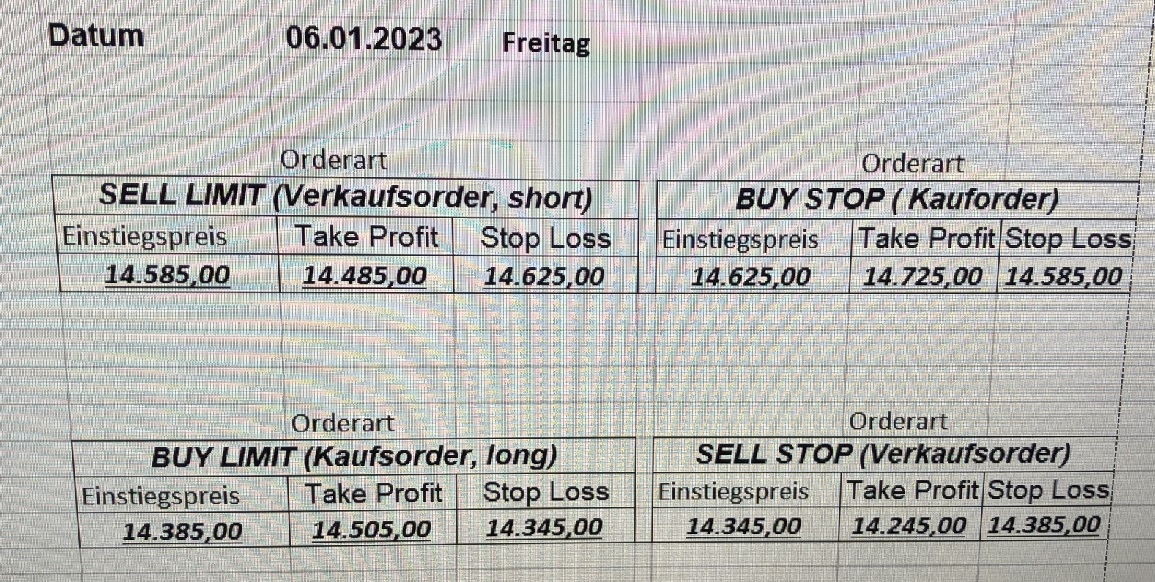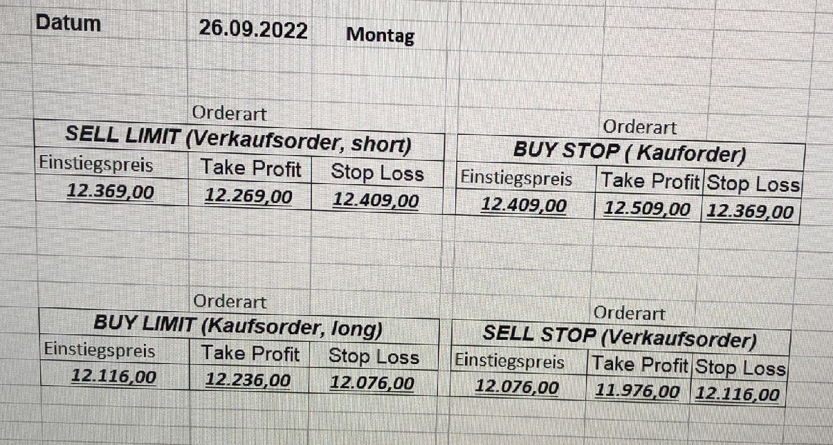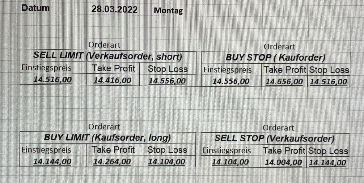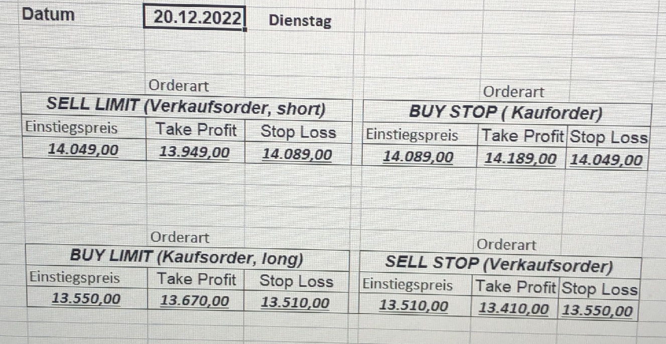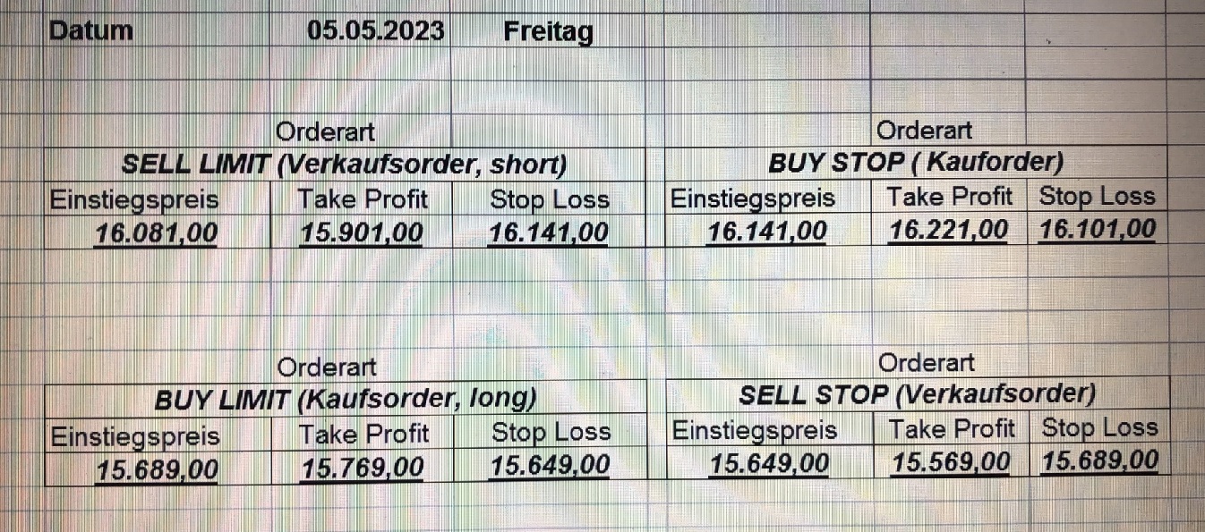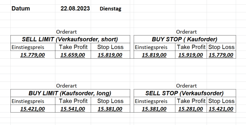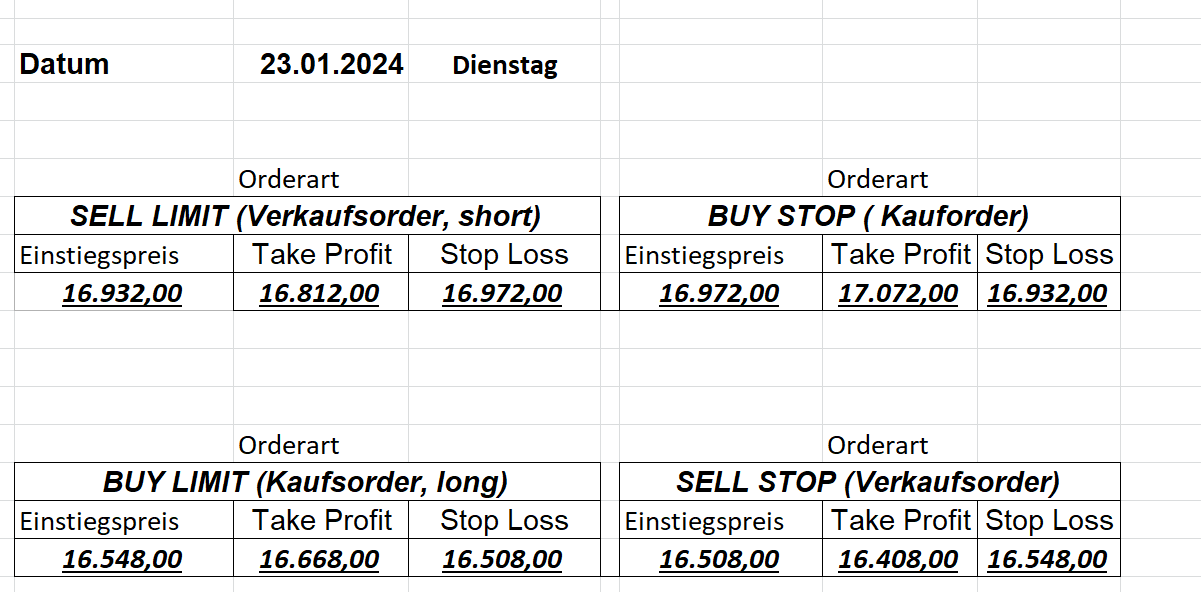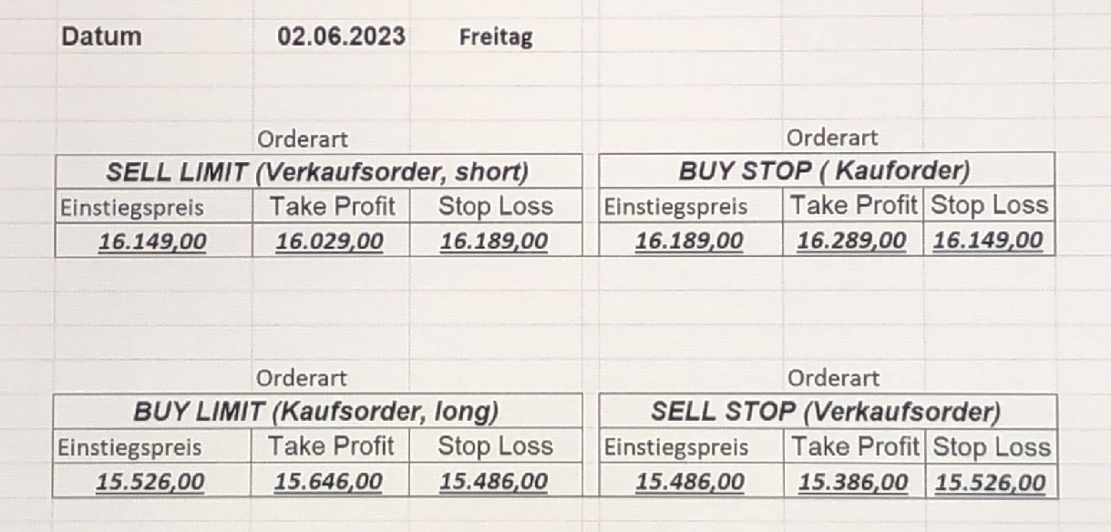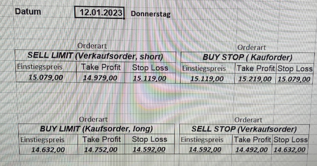16.5.2023 Platzieren Sie die  Order bis 9:00 Löschen Sie bitte offene Order und Positionen um 21:45 ! Zur Frage der Punktgröße: Beispielrechnung: Bitte immer kurz auf den am weitest entfernten Stopp schauen. Diese Punktzahl sollte nicht mehr als 0,5% bis 1% des Kapitals ausmachen. 15.5.2023 Platzieren Sie die  Order bis 9:00 Löschen Sie bitte offene Order und Positionen um 21:45 ! Zur Frage der Punktgröße: Beispielrechnung: Bitte immer kurz auf den am weitest entfernten Stopp schauen. Diese Punktzahl sollte nicht mehr als 0,5% bis 1% des Kapitals ausmachen. 12.5.2023 Platzieren Sie die  Order bis 9:00 Löschen Sie bitte offene Order und Positionen um 21:45 ! Zur Frage der Punktgröße: Beispielrechnung: Bitte immer kurz auf den am weitest entfernten Stopp schauen. Diese Punktzahl sollte nicht mehr als 0,5% bis 1% des Kapitals ausmachen. 10.5.2023  Platzieren Sie die  Order bis 9:00 Löschen Sie bitte offene Order und Positionen um 21:45 ! Zur Frage der Punktgröße: Beispielrechnung: Bitte immer kurz auf den am weitest entfernten Stopp schauen. Diese Punktzahl sollte nicht mehr als 0,5% bis 1% des Kapitals ausmachen. 9.5.2023 Platzieren Sie die  Order bis 9:00 Löschen Sie bitte offene Order und Positionen um 21:45 ! Zur Frage der Punktgröße: Beispielrechnung: Bitte immer kurz auf den am weitest entfernten Stopp schauen. Diese Punktzahl sollte nicht mehr als 0,5% bis 1% des Kapitals ausmachen.   8.5.2023 Platzieren Sie die  Order bis 9:00 Löschen Sie bitte offene Order und Positionen um 21:45 ! Zur Frage der Punktgröße: Beispielrechnung: Bitte immer kurz auf den am weitest entfernten Stopp schauen. Diese Punktzahl sollte nicht mehr als 0,5% bis 1% des Kapitals ausmachen. 5.5.2023 Platzieren Sie die  Order bis 9:00 Löschen Sie bitte offene Order und Positionen um 21:45 ! Zur Frage der Punktgröße: Beispielrechnung: Bitte immer kurz auf den am weitest entfernten Stopp schauen. Diese Punktzahl sollte nicht mehr als 0,5% bis 1% des Kapitals ausmachen. 4.5.2023 Platzieren Sie die  Order bis 9:00 Löschen Sie bitte offene Order und Positionen um 21:45 ! Zur Frage der Punktgröße: Beispielrechnung: Bitte immer kurz auf den am weitest entfernten Stopp schauen. Diese Punktzahl sollte nicht mehr als 0,5% bis 1% des Kapitals ausmachen. 3.5.2023 Heute abend FED-Sitzung: Wir bleiben heute aus dem Markt! 2.5.2023 Platzieren Sie die  Order bis 9:00 Löschen Sie bitte offene Order und Positionen um 21:45 ! Zur Frage der Punktgröße: Beispielrechnung: Bitte immer kurz auf den am weitest entfernten Stopp schauen. Diese Punktzahl sollte nicht mehr als 0,5% bis 1% des Kapitals ausmachen. 28.4.2023 Platzieren Sie die  Order bis 9:00 Löschen Sie bitte offene Order und Positionen um 21:45 ! Zur Frage der Punktgröße: Beispielrechnung: Bitte immer kurz auf den am weitest entfernten Stopp schauen. Diese Punktzahl sollte nicht mehr als 0,5% bis 1% des Kapitals ausmachen. 27.4.2023 Platzieren Sie die  Order bis 9:00 Löschen Sie bitte offene Order und Positionen um 21:45 ! Zur Frage der Punktgröße: Beispielrechnung: Bitte immer kurz auf den am weitest entfernten Stopp schauen. Diese Punktzahl sollte nicht mehr als 0,5% bis 1% des Kapitals ausmachen. 26.4.2023 Platzieren Sie die  Order bis 9:00 Löschen Sie bitte offene Order und Positionen um 21:45 ! Zur Frage der Punktgröße: Beispielrechnung: Bitte immer kurz auf den am weitest entfernten Stopp schauen. Diese Punktzahl sollte nicht mehr als 0,5% bis 1% des Kapitals ausmachen. 25.4.2023 Platzieren Sie die  Order bis 9:00 Löschen Sie bitte offene Order und Positionen um 21:45 ! Zur Frage der Punktgröße: Beispielrechnung: Bitte immer kurz auf den am weitest entfernten Stopp schauen. Diese Punktzahl sollte nicht mehr als 0,5% bis 1% des Kapitals ausmachen. 24.4.2023 Platzieren Sie die  Order bis 9:00 Löschen Sie bitte offene Order und Positionen um 21:45 ! Zur Frage der Punktgröße: Beispielrechnung: Bitte immer kurz auf den am weitest entfernten Stopp schauen. Diese Punktzahl sollte nicht mehr als 0,5% bis 1% des Kapitals ausmachen. 21.4.2023 Platzieren Sie die  Order bis 9:00 Löschen Sie bitte offene Order und Positionen um 21:45 ! Zur Frage der Punktgröße: Beispielrechnung: Bitte immer kurz auf den am weitest entfernten Stopp schauen. Diese Punktzahl sollte nicht mehr als 0,5% bis 1% des Kapitals ausmachen. Sorry, falscher Wochentag, aber es sind die heutigen Signale!    20.4.2023 Platzieren Sie die  Order bis 9:00 Löschen Sie bitte offene Order und Positionen um 21:45 ! Zur Frage der Punktgröße: Beispielrechnung: Bitte immer kurz auf den am weitest entfernten Stopp schauen. Diese Punktzahl sollte nicht mehr als 0,5% bis 1% des Kapitals ausmachen. 19.4.2023 Platzieren Sie die  Order bis 9:00 Löschen Sie bitte offene Order und Positionen um 21:45 ! Zur Frage der Punktgröße: Beispielrechnung: Bitte immer kurz auf den am weitest entfernten Stopp schauen. Diese Punktzahl sollte nicht mehr als 0,5% bis 1% des Kapitals ausmachen. 18.4.2023 Platzieren Sie die  Order bis 9:00 Löschen Sie bitte offene Order und Positionen um 21:45 ! Zur Frage der Punktgröße: Beispielrechnung: Bitte immer kurz auf den am weitest entfernten Stopp schauen. Diese Punktzahl sollte nicht mehr als 0,5% bis 1% des Kapitals ausmachen.  17.4.2023 Platzieren Sie die  Order bis 9:00 Löschen Sie bitte offene Order und Positionen um 21:45 ! Zur Frage der Punktgröße: Beispielrechnung: Bitte immer kurz auf den am weitest entfernten Stopp schauen. Diese Punktzahl sollte nicht mehr als 0,5% bis 1% des Kapitals ausmachen. 14.4.2023 Platzieren Sie die  Order bis 9:00 Löschen Sie bitte offene Order und Positionen um 21:45 ! Zur Frage der Punktgröße: Beispielrechnung: Bitte immer kurz auf den am weitest entfernten Stopp schauen. Diese Punktzahl sollte nicht mehr als 0,5% bis 1% des Kapitals ausmachen. 13.4.2023 Heute bleiben wir an der Seitenlinie. Aktuell ist der DAX nicht volatil genug!  12.4.2023 Pla
