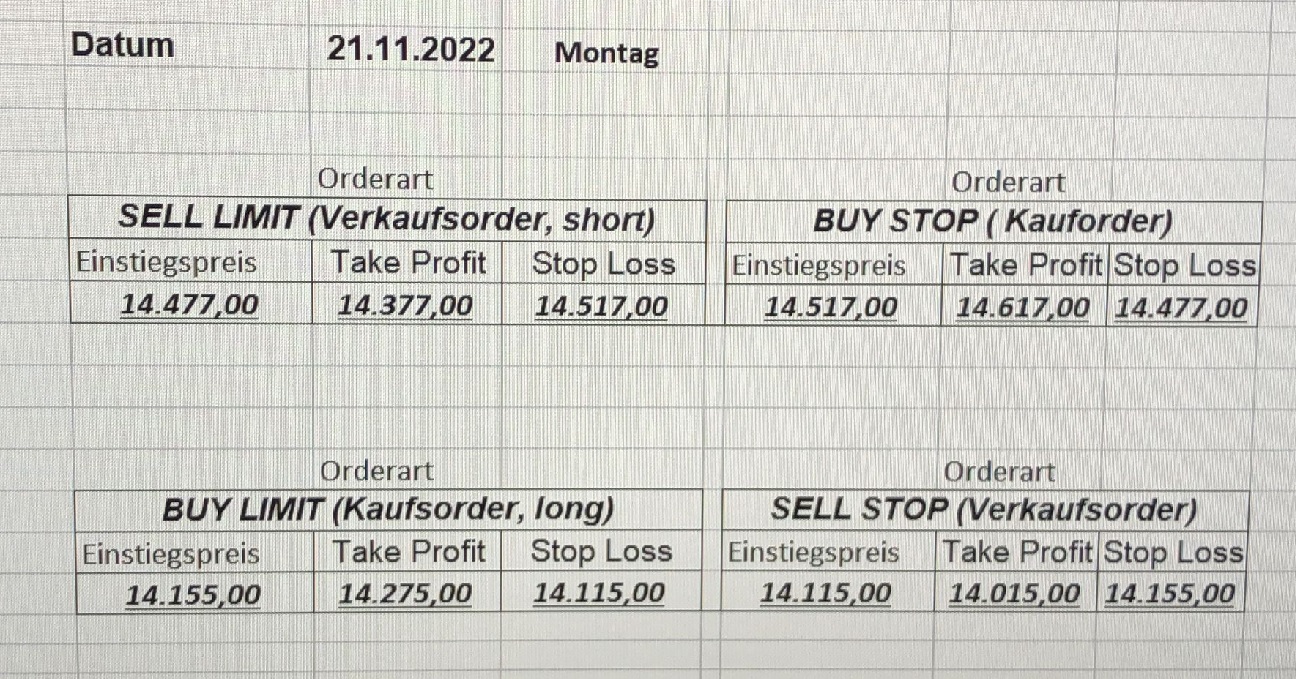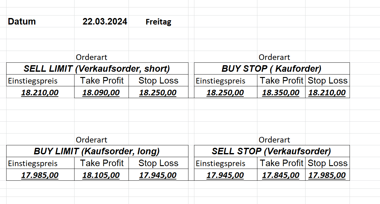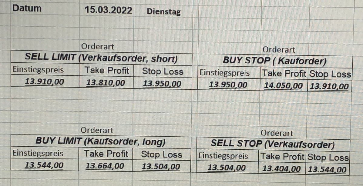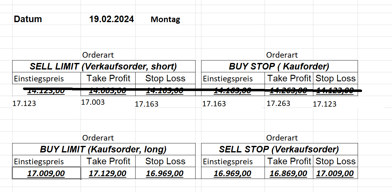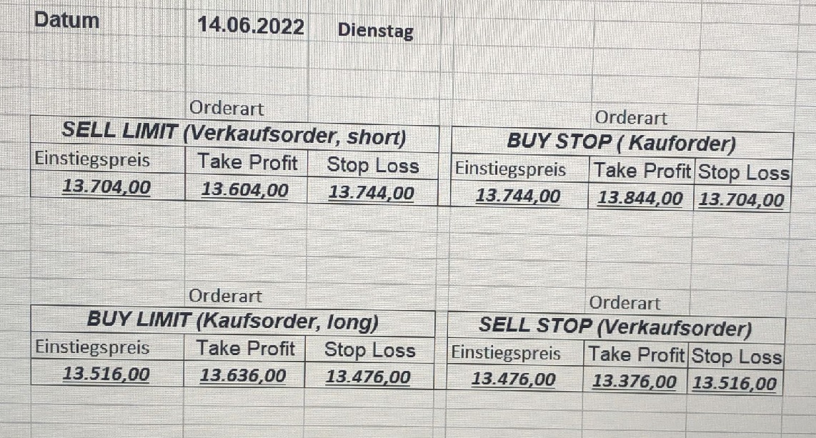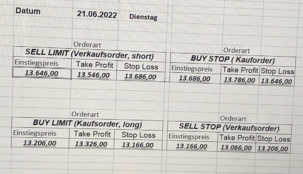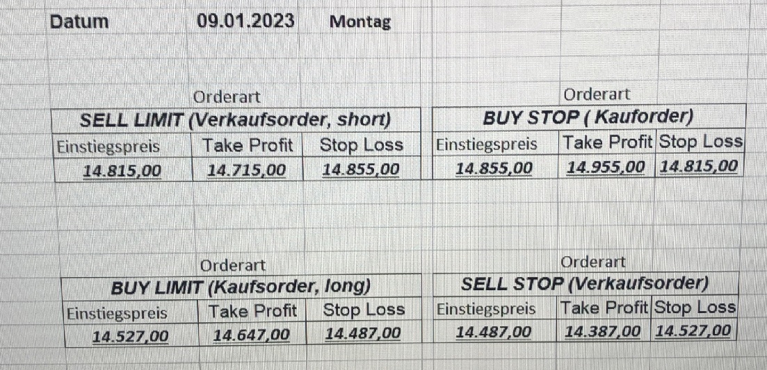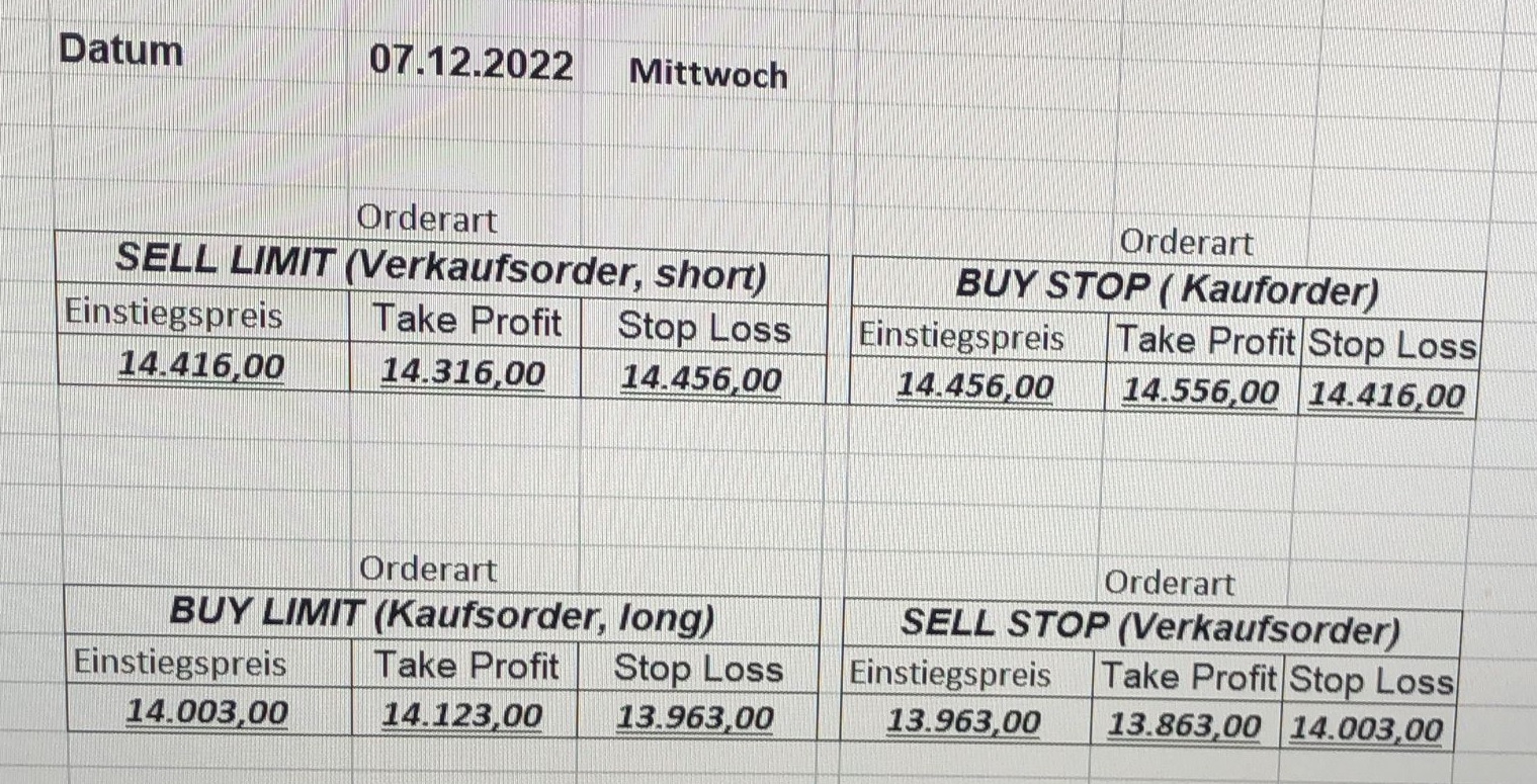 16.5.2023 Platzieren Sie die  Order bis 9:00 Löschen Sie bitte offene Order und Positionen um 21:45 ! Zur Frage der Punktgröße: Beispielrechnung: Bitte immer kurz auf den am weitest entfernten Stopp schauen. Diese Punktzahl sollte nicht mehr als 0,5% bis 1% des Kapitals ausmachen. 15.5.2023 Platzieren Sie die  Order bis 9:00 Löschen Sie bitte offene Order und Positionen um 21:45 ! Zur Frage der Punktgröße: Beispielrechnung: Bitte immer kurz auf den am weitest entfernten Stopp schauen. Diese Punktzahl sollte nicht mehr als 0,5% bis 1% des Kapitals ausmachen. 12.5.2023 Platzieren Sie die  Order bis 9:00 Löschen Sie bitte offene Order und Positionen um 21:45 ! Zur Frage der Punktgröße: Beispielrechnung: Bitte immer kurz auf den am weitest entfernten Stopp schauen. Diese Punktzahl sollte nicht mehr als 0,5% bis 1% des Kapitals ausmachen. 10.5.2023  Platzieren Sie die  Order bis 9:00 Löschen Sie bitte offene Order und Positionen um 21:45 ! Zur Frage der Punktgröße: Beispielrechnung: Bitte immer kurz auf den am weitest entfernten Stopp schauen. Diese Punktzahl sollte nicht mehr als 0,5% bis 1% des Kapitals ausmachen. 9.5.2023 Platzieren Sie die  Order bis 9:00 Löschen Sie bitte offene Order und Positionen um 21:45 ! Zur Frage der Punktgröße: Beispielrechnung: Bitte immer kurz auf den am weitest entfernten Stopp schauen. Diese Punktzahl sollte nicht mehr als 0,5% bis 1% des Kapitals ausmachen.   8.5.2023 Platzieren Sie die  Order bis 9:00 Löschen Sie bitte offene Order und Positionen um 21:45 ! Zur Frage der Punktgröße: Beispielrechnung: Bitte immer kurz auf den am weitest entfernten Stopp schauen. Diese Punktzahl sollte nicht mehr als 0,5% bis 1% des Kapitals ausmachen. 5.5.2023 Platzieren Sie die  Order bis 9:00 Löschen Sie bitte offene Order und Positionen um 21:45 ! Zur Frage der Punktgröße: Beispielrechnung: Bitte immer kurz auf den am weitest entfernten Stopp schauen. Diese Punktzahl sollte nicht mehr als 0,5% bis 1% des Kapitals ausmachen. 4.5.2023 Platzieren Sie die  Order bis 9:00 Löschen Sie bitte offene Order und Positionen um 21:45 ! Zur Frage der Punktgröße: Beispielrechnung: Bitte immer kurz auf den am weitest entfernten Stopp schauen. Diese Punktzahl sollte nicht mehr als 0,5% bis 1% des Kapitals ausmachen. 3.5.2023 Heute abend FED-Sitzung: Wir bleiben heute aus dem Markt! 2.5.2023 Platzieren Sie die  Order bis 9:00 Löschen Sie bitte offene Order und Positionen um 21:45 ! Zur Frage der Punktgröße: Beispielrechnung: Bitte immer kurz auf den am weitest entfernten Stopp schauen. Diese Punktzahl sollte nicht mehr als 0,5% bis 1% des Kapitals ausmachen. 28.4.2023 Platzieren Sie die  Order bis 9:00 Löschen Sie bitte offene Order und Positionen um 21:45 ! Zur Frage der Punktgröße: Beispielrechnung: Bitte immer kurz auf den am weitest entfernten Stopp schauen. Diese Punktzahl sollte nicht mehr als 0,5% bis 1% des Kapitals ausmachen. 27.4.2023 Platzieren Sie die  Order bis 9:00 Löschen Sie bitte offene Order und Positionen um 21:45 ! Zur Frage der Punktgröße: Beispielrechnung: Bitte immer kurz auf den am weitest entfernten Stopp schauen. Diese Punktzahl sollte nicht mehr als 0,5% bis 1% des Kapitals ausmachen. 26.4.2023 Platzieren Sie die  Order bis 9:00 Löschen Sie bitte offene Order und Positionen um 21:45 ! Zur Frage der Punktgröße: Beispielrechnung: Bitte immer kurz auf den am weitest entfernten Stopp schauen. Diese Punktzahl sollte nicht mehr als 0,5% bis 1% des Kapitals ausmachen. 25.4.2023 Platzieren Sie die  Order bis 9:00 Löschen Sie bitte offene Order und Positionen um 21:45 ! Zur Frage der Punktgröße: Beispielrechnung: Bitte immer kurz auf den am weitest entfernten Stopp schauen. Diese Punktzahl sollte nicht mehr als 0,5% bis 1% des Kapitals ausmachen. 24.4.2023 Platzieren Sie die  Order bis 9:00 Löschen Sie bitte offene Order und Positionen um 21:45 ! Zur Frage der Punktgröße: Beispielrechnung: Bitte immer kurz auf den am weitest entfernten Stopp schauen. Diese Punktzahl sollte nicht mehr als 0,5% bis 1% des Kapitals ausmachen. 21.4.2023 Platzieren Sie die  Order bis 9:00 Löschen Sie bitte offene Order und Positionen um 21:45 ! Zur Frage der Punktgröße: Beispielrechnung: Bitte immer kurz auf den am weitest entfernten Stopp schauen. Diese Punktzahl sollte nicht mehr als 0,5% bis 1% des Kapitals ausmachen. Sorry, falscher Wochentag, aber es sind die heutigen Signale!    20.4.2023 Platzieren Sie die  Order bis 9:00 Löschen Sie bitte offene Order und Positionen um 21:45 ! Zur Frage der Punktgröße: Beispielrechnung: Bitte immer kurz auf den am weitest entfernten Stopp schauen. Diese Punktzahl sollte nicht mehr als 0,5% bis 1% des Kapitals ausmachen. 19.4.2023 Platzieren Sie die  Order bis 9:00 Löschen Sie bitte offene Order und Positionen um 21:45 ! Zur Frage der Punktgröße: Beispielrechnung: Bitte immer kurz auf den am weitest entfernten Stopp schauen. Diese Punktzahl sollte nicht mehr als 0,5% bis 1% des Kapitals ausmachen. 18.4.2023 Platzieren Sie die  Order bis 9:00 Löschen Sie bitte offene Order und Positionen um 21:45 ! Zur Frage der Punktgröße: Beispielrechnung: Bitte immer kurz auf den am weitest entfernten Stopp schauen. Diese Punktzahl sollte nicht mehr als 0,5% bis 1% des Kapitals ausmachen.  17.4.2023 Platzieren Sie die  Order bis 9:00 Löschen Sie bitte offene Order und Positionen um 21:45 ! Zur Frage der Punktgröße: Beispielrechnung: Bitte immer kurz auf den am weitest entfernten Stopp schauen. Diese Punktzahl sollte nicht mehr als 0,5% bis 1% des Kapitals ausmachen. 14.4.2023 Platzieren Sie die  Order bis 9:00 Löschen Sie bitte offene Order und Positionen um 21:45 ! Zur Frage der Punktgröße: Beispielrechnung: Bitte immer kurz auf den am weitest entfernten Stopp schauen. Diese Punktzahl sollte nicht mehr als 0,5% bis 1% des Kapitals ausmachen. 13.4.2023 Heute bleiben wir an der Seitenlinie. Aktuell ist der DAX nicht volatil genug!  12.4.2023 Pla