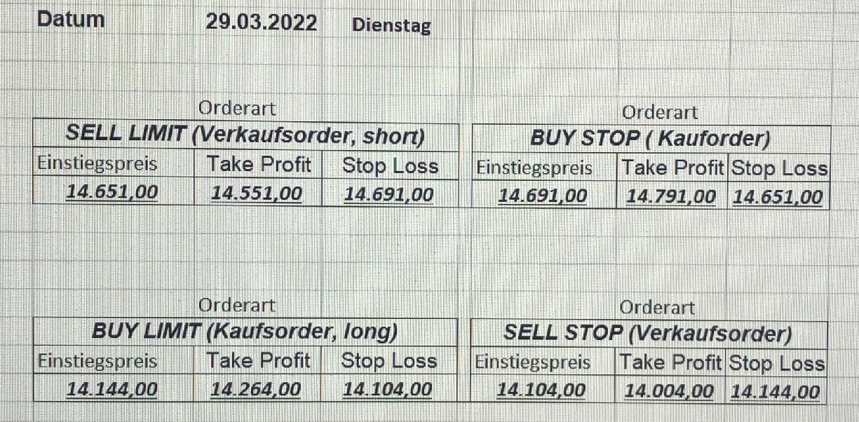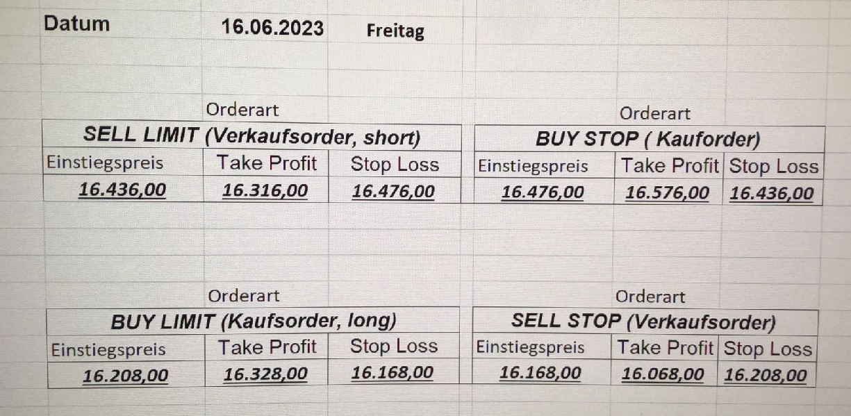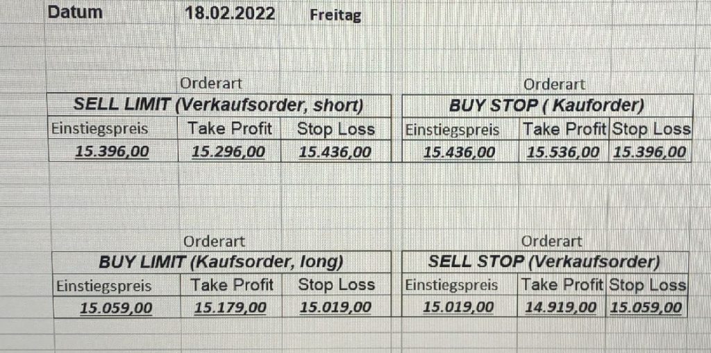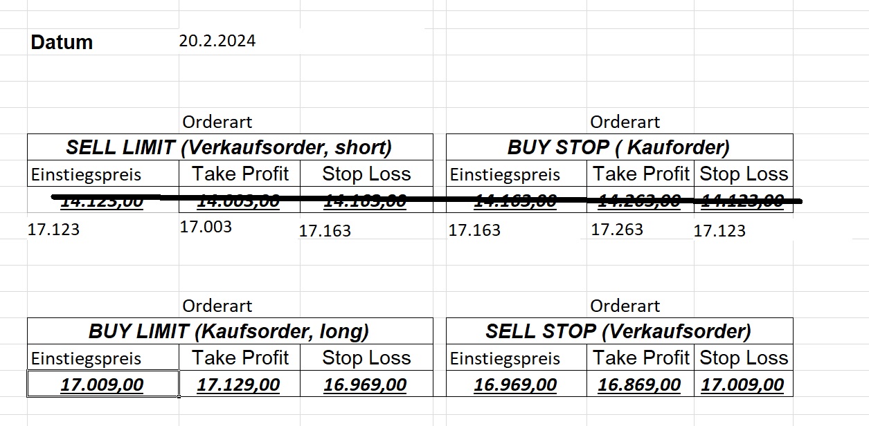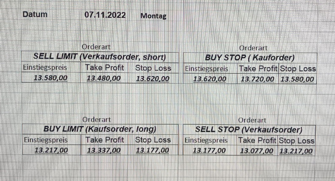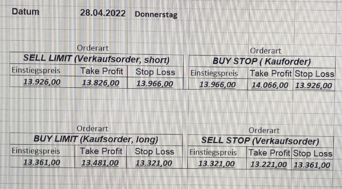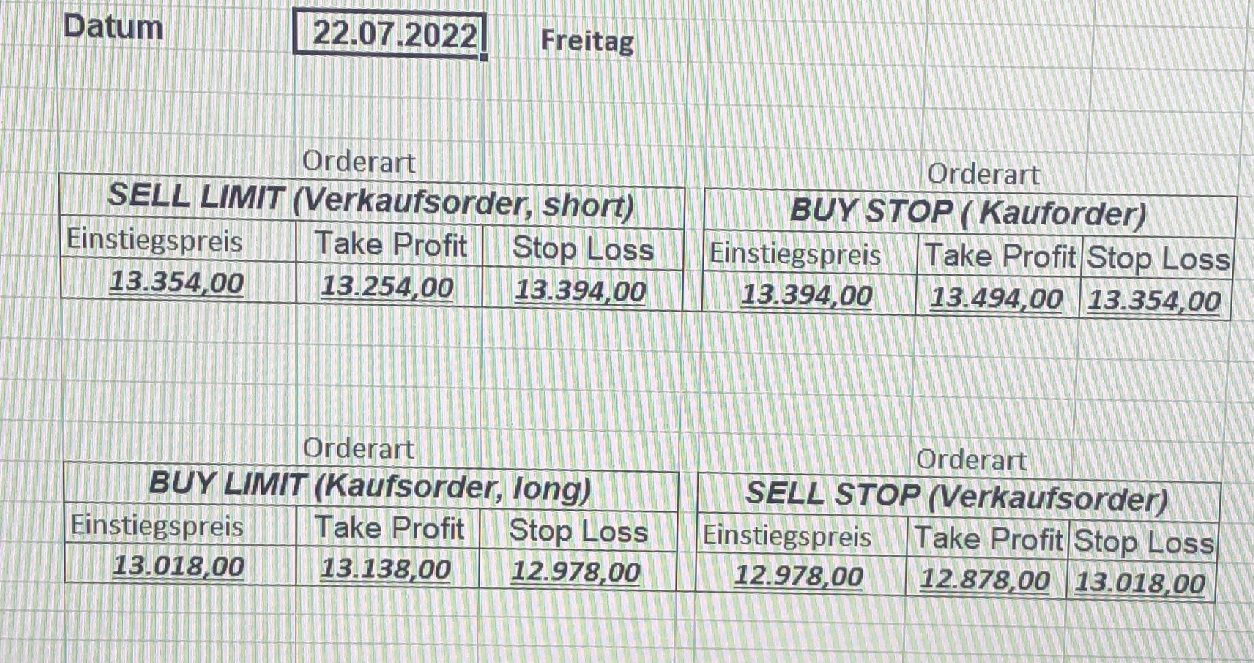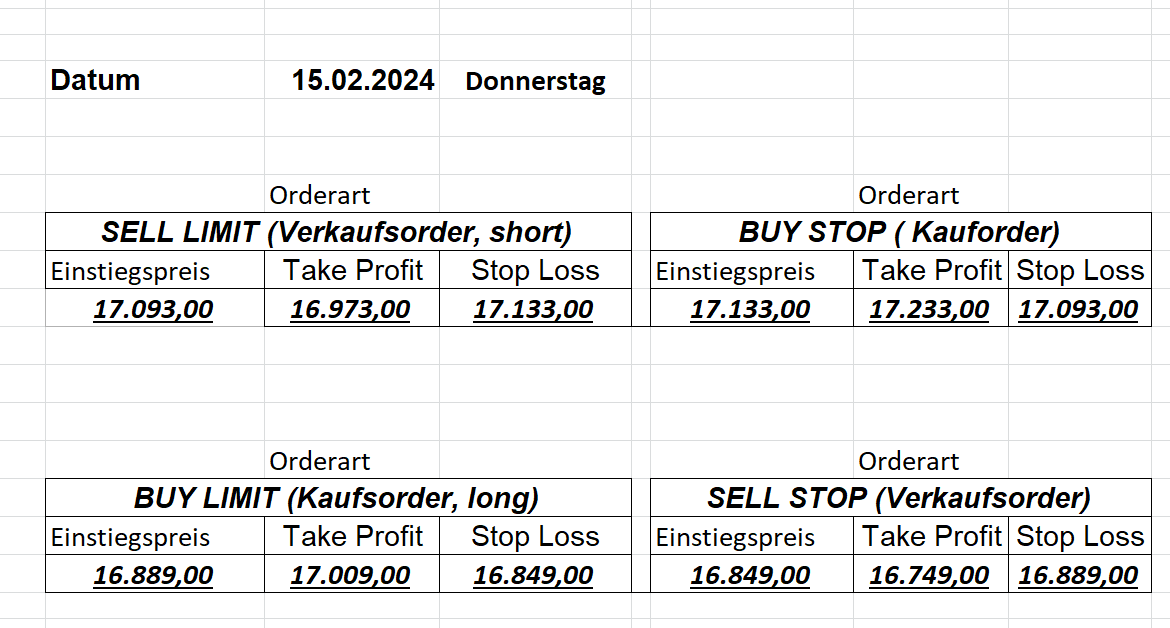 16.5.2023 Platzieren Sie die  Order bis 9:00 Löschen Sie bitte offene Order und Positionen um 21:45 ! Zur Frage der Punktgröße: Beispielrechnung: Bitte immer kurz auf den am weitest entfernten Stopp schauen. Diese Punktzahl sollte nicht mehr als 0,5% bis 1% des Kapitals ausmachen. 15.5.2023 Platzieren Sie die  Order bis 9:00 Löschen Sie bitte offene Order und Positionen um 21:45 ! Zur Frage der Punktgröße: Beispielrechnung: Bitte immer kurz auf den am weitest entfernten Stopp schauen. Diese Punktzahl sollte nicht mehr als 0,5% bis 1% des Kapitals ausmachen. 12.5.2023 Platzieren Sie die  Order bis 9:00 Löschen Sie bitte offene Order und Positionen um 21:45 ! Zur Frage der Punktgröße: Beispielrechnung: Bitte immer kurz auf den am weitest entfernten Stopp schauen. Diese Punktzahl sollte nicht mehr als 0,5% bis 1% des Kapitals ausmachen. 10.5.2023  Platzieren Sie die  Order bis 9:00 Löschen Sie bitte offene Order und Positionen um 21:45 ! Zur Frage der Punktgröße: Beispielrechnung: Bitte immer kurz auf den am weitest entfernten Stopp schauen. Diese Punktzahl sollte nicht mehr als 0,5% bis 1% des Kapitals ausmachen. 9.5.2023 Platzieren Sie die  Order bis 9:00 Löschen Sie bitte offene Order und Positionen um 21:45 ! Zur Frage der Punktgröße: Beispielrechnung: Bitte immer kurz auf den am weitest entfernten Stopp schauen. Diese Punktzahl sollte nicht mehr als 0,5% bis 1% des Kapitals ausmachen.   8.5.2023 Platzieren Sie die  Order bis 9:00 Löschen Sie bitte offene Order und Positionen um 21:45 ! Zur Frage der Punktgröße: Beispielrechnung: Bitte immer kurz auf den am weitest entfernten Stopp schauen. Diese Punktzahl sollte nicht mehr als 0,5% bis 1% des Kapitals ausmachen. 5.5.2023 Platzieren Sie die  Order bis 9:00 Löschen Sie bitte offene Order und Positionen um 21:45 ! Zur Frage der Punktgröße: Beispielrechnung: Bitte immer kurz auf den am weitest entfernten Stopp schauen. Diese Punktzahl sollte nicht mehr als 0,5% bis 1% des Kapitals ausmachen. 4.5.2023 Platzieren Sie die  Order bis 9:00 Löschen Sie bitte offene Order und Positionen um 21:45 ! Zur Frage der Punktgröße: Beispielrechnung: Bitte immer kurz auf den am weitest entfernten Stopp schauen. Diese Punktzahl sollte nicht mehr als 0,5% bis 1% des Kapitals ausmachen. 3.5.2023 Heute abend FED-Sitzung: Wir bleiben heute aus dem Markt! 2.5.2023 Platzieren Sie die  Order bis 9:00 Löschen Sie bitte offene Order und Positionen um 21:45 ! Zur Frage der Punktgröße: Beispielrechnung: Bitte immer kurz auf den am weitest entfernten Stopp schauen. Diese Punktzahl sollte nicht mehr als 0,5% bis 1% des Kapitals ausmachen. 28.4.2023 Platzieren Sie die  Order bis 9:00 Löschen Sie bitte offene Order und Positionen um 21:45 ! Zur Frage der Punktgröße: Beispielrechnung: Bitte immer kurz auf den am weitest entfernten Stopp schauen. Diese Punktzahl sollte nicht mehr als 0,5% bis 1% des Kapitals ausmachen. 27.4.2023 Platzieren Sie die  Order bis 9:00 Löschen Sie bitte offene Order und Positionen um 21:45 ! Zur Frage der Punktgröße: Beispielrechnung: Bitte immer kurz auf den am weitest entfernten Stopp schauen. Diese Punktzahl sollte nicht mehr als 0,5% bis 1% des Kapitals ausmachen. 26.4.2023 Platzieren Sie die  Order bis 9:00 Löschen Sie bitte offene Order und Positionen um 21:45 ! Zur Frage der Punktgröße: Beispielrechnung: Bitte immer kurz auf den am weitest entfernten Stopp schauen. Diese Punktzahl sollte nicht mehr als 0,5% bis 1% des Kapitals ausmachen. 25.4.2023 Platzieren Sie die  Order bis 9:00 Löschen Sie bitte offene Order und Positionen um 21:45 ! Zur Frage der Punktgröße: Beispielrechnung: Bitte immer kurz auf den am weitest entfernten Stopp schauen. Diese Punktzahl sollte nicht mehr als 0,5% bis 1% des Kapitals ausmachen. 24.4.2023 Platzieren Sie die  Order bis 9:00 Löschen Sie bitte offene Order und Positionen um 21:45 ! Zur Frage der Punktgröße: Beispielrechnung: Bitte immer kurz auf den am weitest entfernten Stopp schauen. Diese Punktzahl sollte nicht mehr als 0,5% bis 1% des Kapitals ausmachen. 21.4.2023 Platzieren Sie die  Order bis 9:00 Löschen Sie bitte offene Order und Positionen um 21:45 ! Zur Frage der Punktgröße: Beispielrechnung: Bitte immer kurz auf den am weitest entfernten Stopp schauen. Diese Punktzahl sollte nicht mehr als 0,5% bis 1% des Kapitals ausmachen. Sorry, falscher Wochentag, aber es sind die heutigen Signale!    20.4.2023 Platzieren Sie die  Order bis 9:00 Löschen Sie bitte offene Order und Positionen um 21:45 ! Zur Frage der Punktgröße: Beispielrechnung: Bitte immer kurz auf den am weitest entfernten Stopp schauen. Diese Punktzahl sollte nicht mehr als 0,5% bis 1% des Kapitals ausmachen. 19.4.2023 Platzieren Sie die  Order bis 9:00 Löschen Sie bitte offene Order und Positionen um 21:45 ! Zur Frage der Punktgröße: Beispielrechnung: Bitte immer kurz auf den am weitest entfernten Stopp schauen. Diese Punktzahl sollte nicht mehr als 0,5% bis 1% des Kapitals ausmachen. 18.4.2023 Platzieren Sie die  Order bis 9:00 Löschen Sie bitte offene Order und Positionen um 21:45 ! Zur Frage der Punktgröße: Beispielrechnung: Bitte immer kurz auf den am weitest entfernten Stopp schauen. Diese Punktzahl sollte nicht mehr als 0,5% bis 1% des Kapitals ausmachen.  17.4.2023 Platzieren Sie die  Order bis 9:00 Löschen Sie bitte offene Order und Positionen um 21:45 ! Zur Frage der Punktgröße: Beispielrechnung: Bitte immer kurz auf den am weitest entfernten Stopp schauen. Diese Punktzahl sollte nicht mehr als 0,5% bis 1% des Kapitals ausmachen. 14.4.2023 Platzieren Sie die  Order bis 9:00 Löschen Sie bitte offene Order und Positionen um 21:45 ! Zur Frage der Punktgröße: Beispielrechnung: Bitte immer kurz auf den am weitest entfernten Stopp schauen. Diese Punktzahl sollte nicht mehr als 0,5% bis 1% des Kapitals ausmachen. 13.4.2023 Heute bleiben wir an der Seitenlinie. Aktuell ist der DAX nicht volatil genug!  12.4.2023 Pla