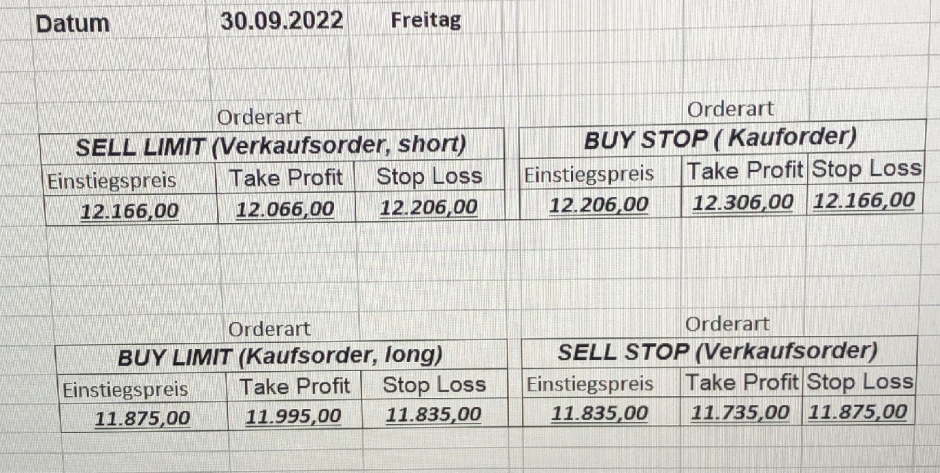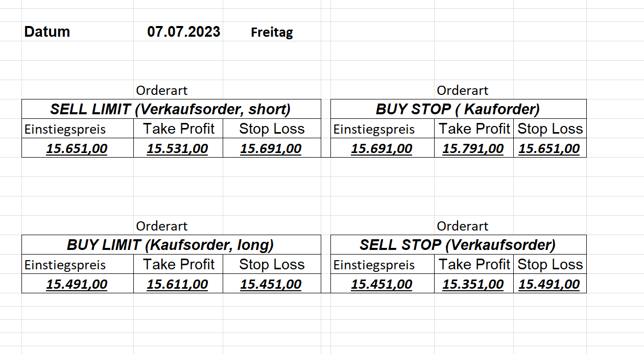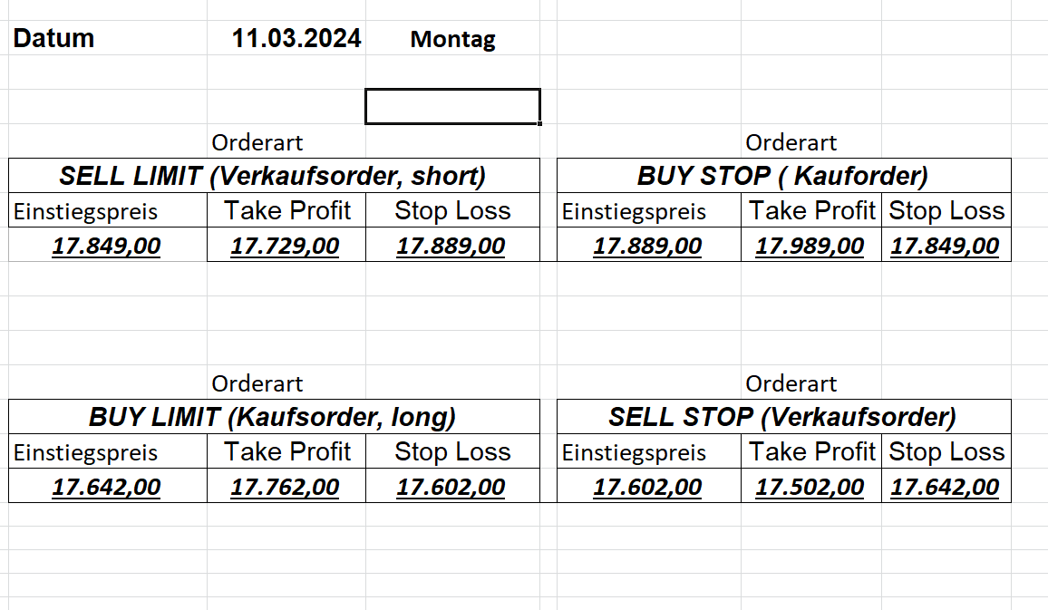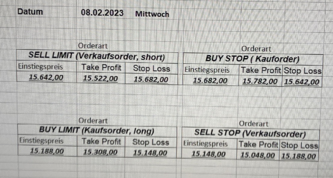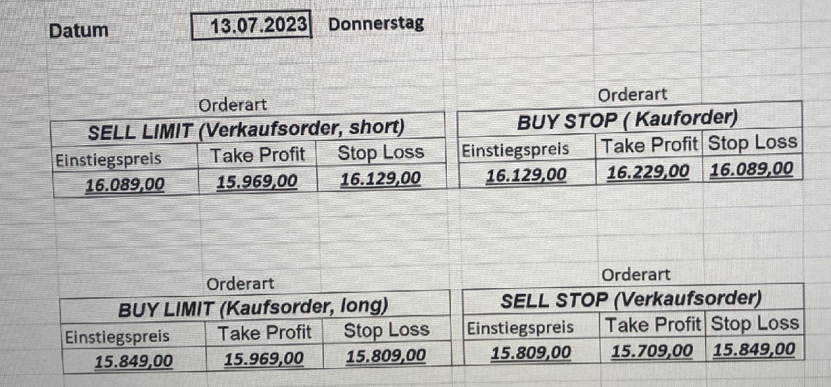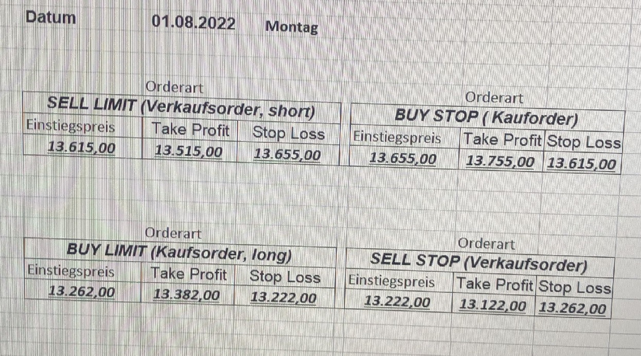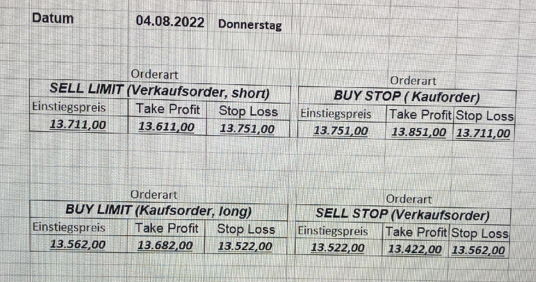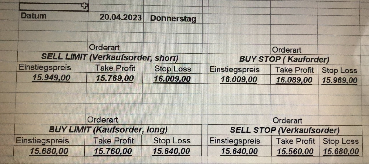 16.5.2023 Platzieren Sie die  Order bis 9:00 Löschen Sie bitte offene Order und Positionen um 21:45 ! Zur Frage der Punktgröße: Beispielrechnung: Bitte immer kurz auf den am weitest entfernten Stopp schauen. Diese Punktzahl sollte nicht mehr als 0,5% bis 1% des Kapitals ausmachen. 15.5.2023 Platzieren Sie die  Order bis 9:00 Löschen Sie bitte offene Order und Positionen um 21:45 ! Zur Frage der Punktgröße: Beispielrechnung: Bitte immer kurz auf den am weitest entfernten Stopp schauen. Diese Punktzahl sollte nicht mehr als 0,5% bis 1% des Kapitals ausmachen. 12.5.2023 Platzieren Sie die  Order bis 9:00 Löschen Sie bitte offene Order und Positionen um 21:45 ! Zur Frage der Punktgröße: Beispielrechnung: Bitte immer kurz auf den am weitest entfernten Stopp schauen. Diese Punktzahl sollte nicht mehr als 0,5% bis 1% des Kapitals ausmachen. 10.5.2023  Platzieren Sie die  Order bis 9:00 Löschen Sie bitte offene Order und Positionen um 21:45 ! Zur Frage der Punktgröße: Beispielrechnung: Bitte immer kurz auf den am weitest entfernten Stopp schauen. Diese Punktzahl sollte nicht mehr als 0,5% bis 1% des Kapitals ausmachen. 9.5.2023 Platzieren Sie die  Order bis 9:00 Löschen Sie bitte offene Order und Positionen um 21:45 ! Zur Frage der Punktgröße: Beispielrechnung: Bitte immer kurz auf den am weitest entfernten Stopp schauen. Diese Punktzahl sollte nicht mehr als 0,5% bis 1% des Kapitals ausmachen.   8.5.2023 Platzieren Sie die  Order bis 9:00 Löschen Sie bitte offene Order und Positionen um 21:45 ! Zur Frage der Punktgröße: Beispielrechnung: Bitte immer kurz auf den am weitest entfernten Stopp schauen. Diese Punktzahl sollte nicht mehr als 0,5% bis 1% des Kapitals ausmachen. 5.5.2023 Platzieren Sie die  Order bis 9:00 Löschen Sie bitte offene Order und Positionen um 21:45 ! Zur Frage der Punktgröße: Beispielrechnung: Bitte immer kurz auf den am weitest entfernten Stopp schauen. Diese Punktzahl sollte nicht mehr als 0,5% bis 1% des Kapitals ausmachen. 4.5.2023 Platzieren Sie die  Order bis 9:00 Löschen Sie bitte offene Order und Positionen um 21:45 ! Zur Frage der Punktgröße: Beispielrechnung: Bitte immer kurz auf den am weitest entfernten Stopp schauen. Diese Punktzahl sollte nicht mehr als 0,5% bis 1% des Kapitals ausmachen. 3.5.2023 Heute abend FED-Sitzung: Wir bleiben heute aus dem Markt! 2.5.2023 Platzieren Sie die  Order bis 9:00 Löschen Sie bitte offene Order und Positionen um 21:45 ! Zur Frage der Punktgröße: Beispielrechnung: Bitte immer kurz auf den am weitest entfernten Stopp schauen. Diese Punktzahl sollte nicht mehr als 0,5% bis 1% des Kapitals ausmachen. 28.4.2023 Platzieren Sie die  Order bis 9:00 Löschen Sie bitte offene Order und Positionen um 21:45 ! Zur Frage der Punktgröße: Beispielrechnung: Bitte immer kurz auf den am weitest entfernten Stopp schauen. Diese Punktzahl sollte nicht mehr als 0,5% bis 1% des Kapitals ausmachen. 27.4.2023 Platzieren Sie die  Order bis 9:00 Löschen Sie bitte offene Order und Positionen um 21:45 ! Zur Frage der Punktgröße: Beispielrechnung: Bitte immer kurz auf den am weitest entfernten Stopp schauen. Diese Punktzahl sollte nicht mehr als 0,5% bis 1% des Kapitals ausmachen. 26.4.2023 Platzieren Sie die  Order bis 9:00 Löschen Sie bitte offene Order und Positionen um 21:45 ! Zur Frage der Punktgröße: Beispielrechnung: Bitte immer kurz auf den am weitest entfernten Stopp schauen. Diese Punktzahl sollte nicht mehr als 0,5% bis 1% des Kapitals ausmachen. 25.4.2023 Platzieren Sie die  Order bis 9:00 Löschen Sie bitte offene Order und Positionen um 21:45 ! Zur Frage der Punktgröße: Beispielrechnung: Bitte immer kurz auf den am weitest entfernten Stopp schauen. Diese Punktzahl sollte nicht mehr als 0,5% bis 1% des Kapitals ausmachen. 24.4.2023 Platzieren Sie die  Order bis 9:00 Löschen Sie bitte offene Order und Positionen um 21:45 ! Zur Frage der Punktgröße: Beispielrechnung: Bitte immer kurz auf den am weitest entfernten Stopp schauen. Diese Punktzahl sollte nicht mehr als 0,5% bis 1% des Kapitals ausmachen. 21.4.2023 Platzieren Sie die  Order bis 9:00 Löschen Sie bitte offene Order und Positionen um 21:45 ! Zur Frage der Punktgröße: Beispielrechnung: Bitte immer kurz auf den am weitest entfernten Stopp schauen. Diese Punktzahl sollte nicht mehr als 0,5% bis 1% des Kapitals ausmachen. Sorry, falscher Wochentag, aber es sind die heutigen Signale!    20.4.2023 Platzieren Sie die  Order bis 9:00 Löschen Sie bitte offene Order und Positionen um 21:45 ! Zur Frage der Punktgröße: Beispielrechnung: Bitte immer kurz auf den am weitest entfernten Stopp schauen. Diese Punktzahl sollte nicht mehr als 0,5% bis 1% des Kapitals ausmachen. 19.4.2023 Platzieren Sie die  Order bis 9:00 Löschen Sie bitte offene Order und Positionen um 21:45 ! Zur Frage der Punktgröße: Beispielrechnung: Bitte immer kurz auf den am weitest entfernten Stopp schauen. Diese Punktzahl sollte nicht mehr als 0,5% bis 1% des Kapitals ausmachen. 18.4.2023 Platzieren Sie die  Order bis 9:00 Löschen Sie bitte offene Order und Positionen um 21:45 ! Zur Frage der Punktgröße: Beispielrechnung: Bitte immer kurz auf den am weitest entfernten Stopp schauen. Diese Punktzahl sollte nicht mehr als 0,5% bis 1% des Kapitals ausmachen.  17.4.2023 Platzieren Sie die  Order bis 9:00 Löschen Sie bitte offene Order und Positionen um 21:45 ! Zur Frage der Punktgröße: Beispielrechnung: Bitte immer kurz auf den am weitest entfernten Stopp schauen. Diese Punktzahl sollte nicht mehr als 0,5% bis 1% des Kapitals ausmachen. 14.4.2023 Platzieren Sie die  Order bis 9:00 Löschen Sie bitte offene Order und Positionen um 21:45 ! Zur Frage der Punktgröße: Beispielrechnung: Bitte immer kurz auf den am weitest entfernten Stopp schauen. Diese Punktzahl sollte nicht mehr als 0,5% bis 1% des Kapitals ausmachen. 13.4.2023 Heute bleiben wir an der Seitenlinie. Aktuell ist der DAX nicht volatil genug!  12.4.2023 Pla