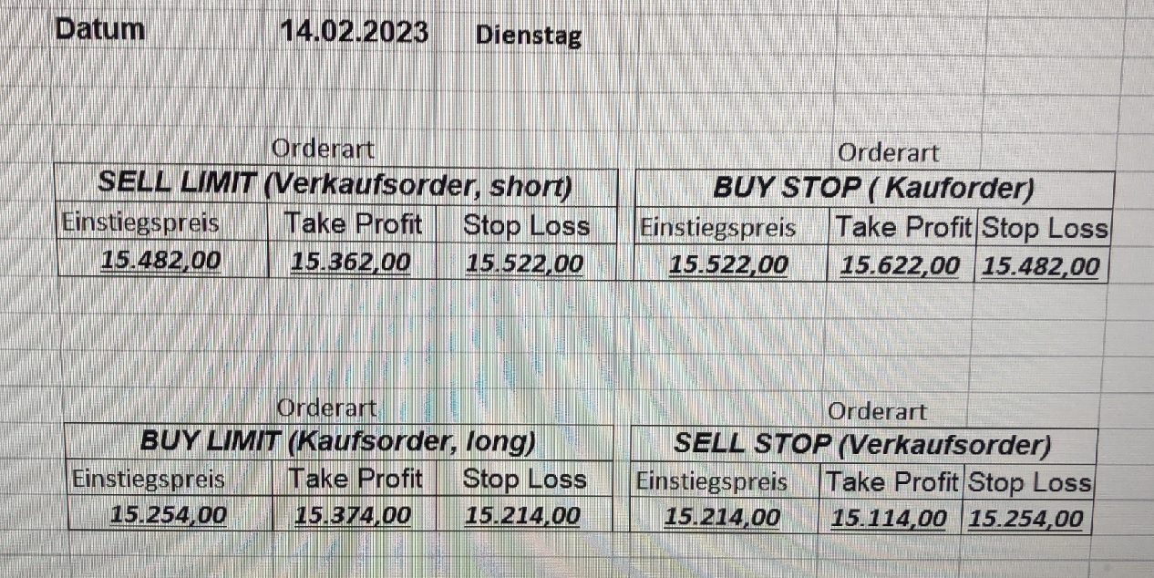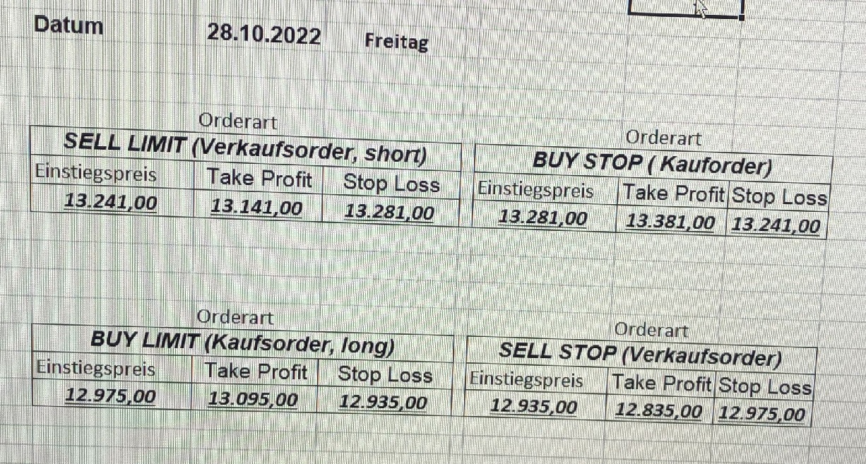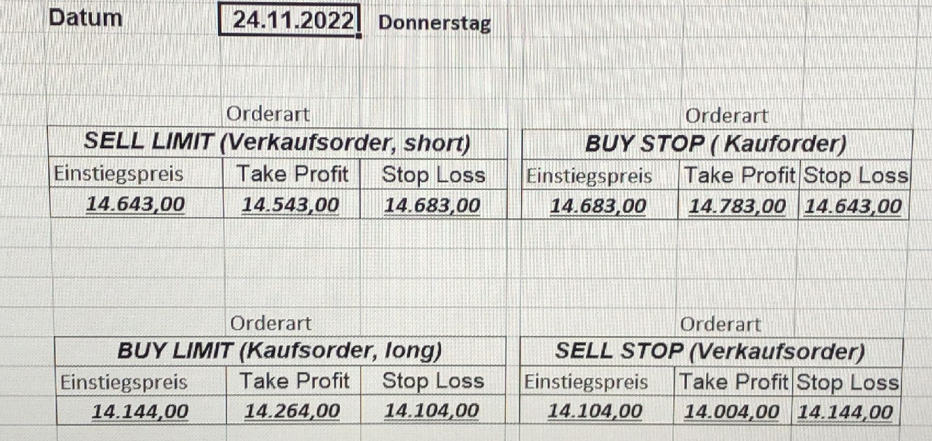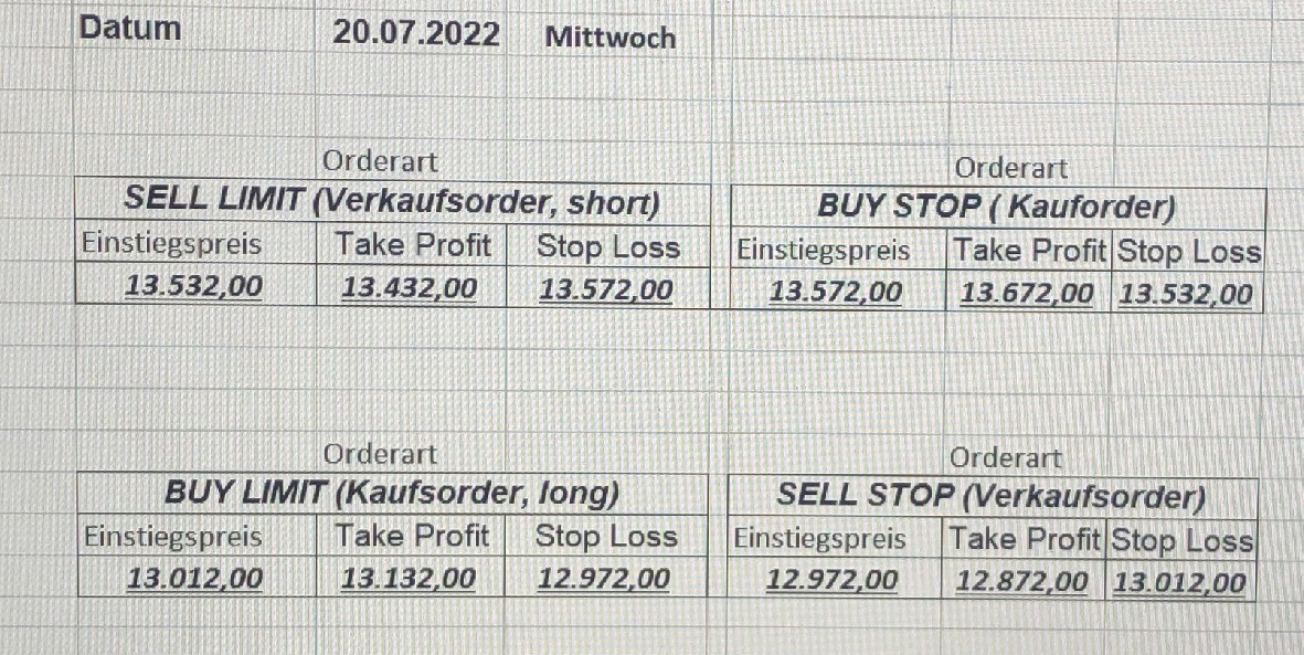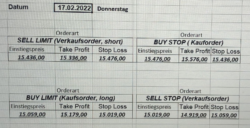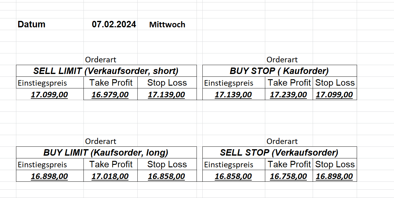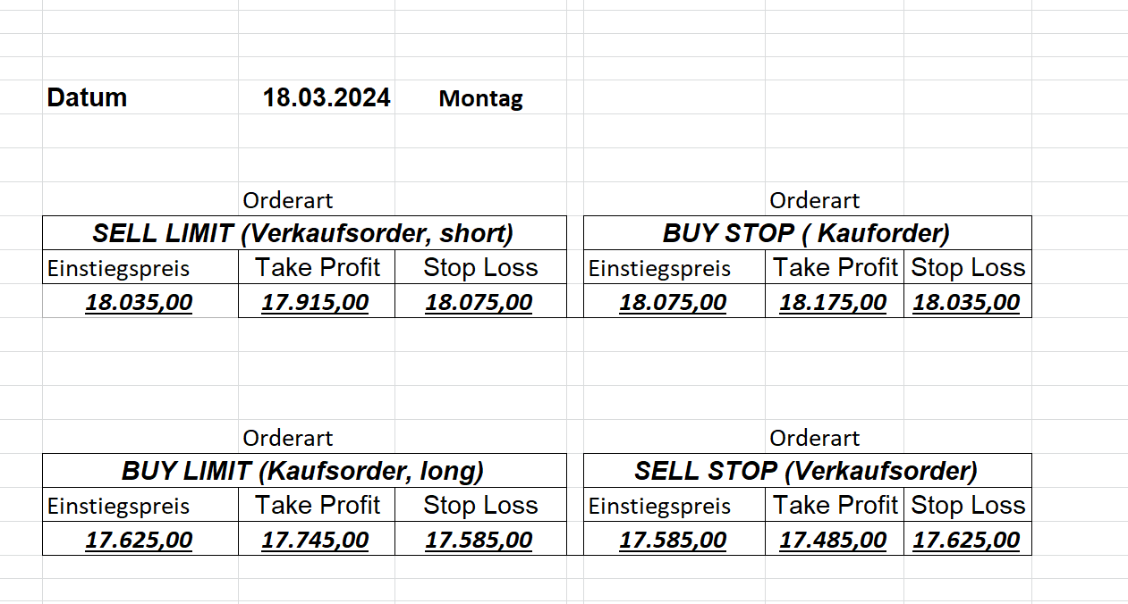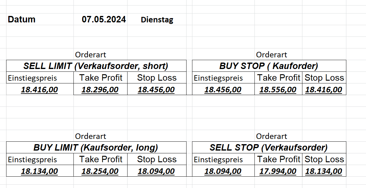 16.5.2023 Platzieren Sie die  Order bis 9:00 Löschen Sie bitte offene Order und Positionen um 21:45 ! Zur Frage der Punktgröße: Beispielrechnung: Bitte immer kurz auf den am weitest entfernten Stopp schauen. Diese Punktzahl sollte nicht mehr als 0,5% bis 1% des Kapitals ausmachen. 15.5.2023 Platzieren Sie die  Order bis 9:00 Löschen Sie bitte offene Order und Positionen um 21:45 ! Zur Frage der Punktgröße: Beispielrechnung: Bitte immer kurz auf den am weitest entfernten Stopp schauen. Diese Punktzahl sollte nicht mehr als 0,5% bis 1% des Kapitals ausmachen. 12.5.2023 Platzieren Sie die  Order bis 9:00 Löschen Sie bitte offene Order und Positionen um 21:45 ! Zur Frage der Punktgröße: Beispielrechnung: Bitte immer kurz auf den am weitest entfernten Stopp schauen. Diese Punktzahl sollte nicht mehr als 0,5% bis 1% des Kapitals ausmachen. 10.5.2023  Platzieren Sie die  Order bis 9:00 Löschen Sie bitte offene Order und Positionen um 21:45 ! Zur Frage der Punktgröße: Beispielrechnung: Bitte immer kurz auf den am weitest entfernten Stopp schauen. Diese Punktzahl sollte nicht mehr als 0,5% bis 1% des Kapitals ausmachen. 9.5.2023 Platzieren Sie die  Order bis 9:00 Löschen Sie bitte offene Order und Positionen um 21:45 ! Zur Frage der Punktgröße: Beispielrechnung: Bitte immer kurz auf den am weitest entfernten Stopp schauen. Diese Punktzahl sollte nicht mehr als 0,5% bis 1% des Kapitals ausmachen.   8.5.2023 Platzieren Sie die  Order bis 9:00 Löschen Sie bitte offene Order und Positionen um 21:45 ! Zur Frage der Punktgröße: Beispielrechnung: Bitte immer kurz auf den am weitest entfernten Stopp schauen. Diese Punktzahl sollte nicht mehr als 0,5% bis 1% des Kapitals ausmachen. 5.5.2023 Platzieren Sie die  Order bis 9:00 Löschen Sie bitte offene Order und Positionen um 21:45 ! Zur Frage der Punktgröße: Beispielrechnung: Bitte immer kurz auf den am weitest entfernten Stopp schauen. Diese Punktzahl sollte nicht mehr als 0,5% bis 1% des Kapitals ausmachen. 4.5.2023 Platzieren Sie die  Order bis 9:00 Löschen Sie bitte offene Order und Positionen um 21:45 ! Zur Frage der Punktgröße: Beispielrechnung: Bitte immer kurz auf den am weitest entfernten Stopp schauen. Diese Punktzahl sollte nicht mehr als 0,5% bis 1% des Kapitals ausmachen. 3.5.2023 Heute abend FED-Sitzung: Wir bleiben heute aus dem Markt! 2.5.2023 Platzieren Sie die  Order bis 9:00 Löschen Sie bitte offene Order und Positionen um 21:45 ! Zur Frage der Punktgröße: Beispielrechnung: Bitte immer kurz auf den am weitest entfernten Stopp schauen. Diese Punktzahl sollte nicht mehr als 0,5% bis 1% des Kapitals ausmachen. 28.4.2023 Platzieren Sie die  Order bis 9:00 Löschen Sie bitte offene Order und Positionen um 21:45 ! Zur Frage der Punktgröße: Beispielrechnung: Bitte immer kurz auf den am weitest entfernten Stopp schauen. Diese Punktzahl sollte nicht mehr als 0,5% bis 1% des Kapitals ausmachen. 27.4.2023 Platzieren Sie die  Order bis 9:00 Löschen Sie bitte offene Order und Positionen um 21:45 ! Zur Frage der Punktgröße: Beispielrechnung: Bitte immer kurz auf den am weitest entfernten Stopp schauen. Diese Punktzahl sollte nicht mehr als 0,5% bis 1% des Kapitals ausmachen. 26.4.2023 Platzieren Sie die  Order bis 9:00 Löschen Sie bitte offene Order und Positionen um 21:45 ! Zur Frage der Punktgröße: Beispielrechnung: Bitte immer kurz auf den am weitest entfernten Stopp schauen. Diese Punktzahl sollte nicht mehr als 0,5% bis 1% des Kapitals ausmachen. 25.4.2023 Platzieren Sie die  Order bis 9:00 Löschen Sie bitte offene Order und Positionen um 21:45 ! Zur Frage der Punktgröße: Beispielrechnung: Bitte immer kurz auf den am weitest entfernten Stopp schauen. Diese Punktzahl sollte nicht mehr als 0,5% bis 1% des Kapitals ausmachen. 24.4.2023 Platzieren Sie die  Order bis 9:00 Löschen Sie bitte offene Order und Positionen um 21:45 ! Zur Frage der Punktgröße: Beispielrechnung: Bitte immer kurz auf den am weitest entfernten Stopp schauen. Diese Punktzahl sollte nicht mehr als 0,5% bis 1% des Kapitals ausmachen. 21.4.2023 Platzieren Sie die  Order bis 9:00 Löschen Sie bitte offene Order und Positionen um 21:45 ! Zur Frage der Punktgröße: Beispielrechnung: Bitte immer kurz auf den am weitest entfernten Stopp schauen. Diese Punktzahl sollte nicht mehr als 0,5% bis 1% des Kapitals ausmachen. Sorry, falscher Wochentag, aber es sind die heutigen Signale!    20.4.2023 Platzieren Sie die  Order bis 9:00 Löschen Sie bitte offene Order und Positionen um 21:45 ! Zur Frage der Punktgröße: Beispielrechnung: Bitte immer kurz auf den am weitest entfernten Stopp schauen. Diese Punktzahl sollte nicht mehr als 0,5% bis 1% des Kapitals ausmachen. 19.4.2023 Platzieren Sie die  Order bis 9:00 Löschen Sie bitte offene Order und Positionen um 21:45 ! Zur Frage der Punktgröße: Beispielrechnung: Bitte immer kurz auf den am weitest entfernten Stopp schauen. Diese Punktzahl sollte nicht mehr als 0,5% bis 1% des Kapitals ausmachen. 18.4.2023 Platzieren Sie die  Order bis 9:00 Löschen Sie bitte offene Order und Positionen um 21:45 ! Zur Frage der Punktgröße: Beispielrechnung: Bitte immer kurz auf den am weitest entfernten Stopp schauen. Diese Punktzahl sollte nicht mehr als 0,5% bis 1% des Kapitals ausmachen.  17.4.2023 Platzieren Sie die  Order bis 9:00 Löschen Sie bitte offene Order und Positionen um 21:45 ! Zur Frage der Punktgröße: Beispielrechnung: Bitte immer kurz auf den am weitest entfernten Stopp schauen. Diese Punktzahl sollte nicht mehr als 0,5% bis 1% des Kapitals ausmachen. 14.4.2023 Platzieren Sie die  Order bis 9:00 Löschen Sie bitte offene Order und Positionen um 21:45 ! Zur Frage der Punktgröße: Beispielrechnung: Bitte immer kurz auf den am weitest entfernten Stopp schauen. Diese Punktzahl sollte nicht mehr als 0,5% bis 1% des Kapitals ausmachen. 13.4.2023 Heute bleiben wir an der Seitenlinie. Aktuell ist der DAX nicht volatil genug!  12.4.2023 Pla