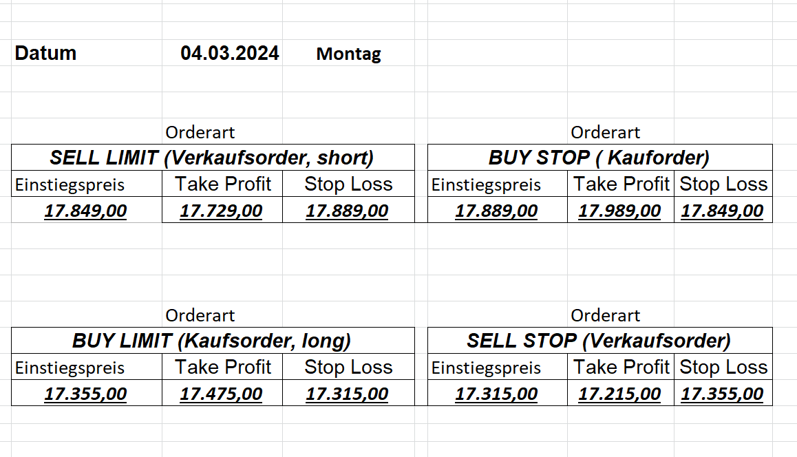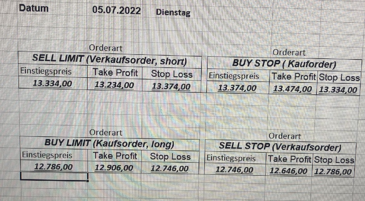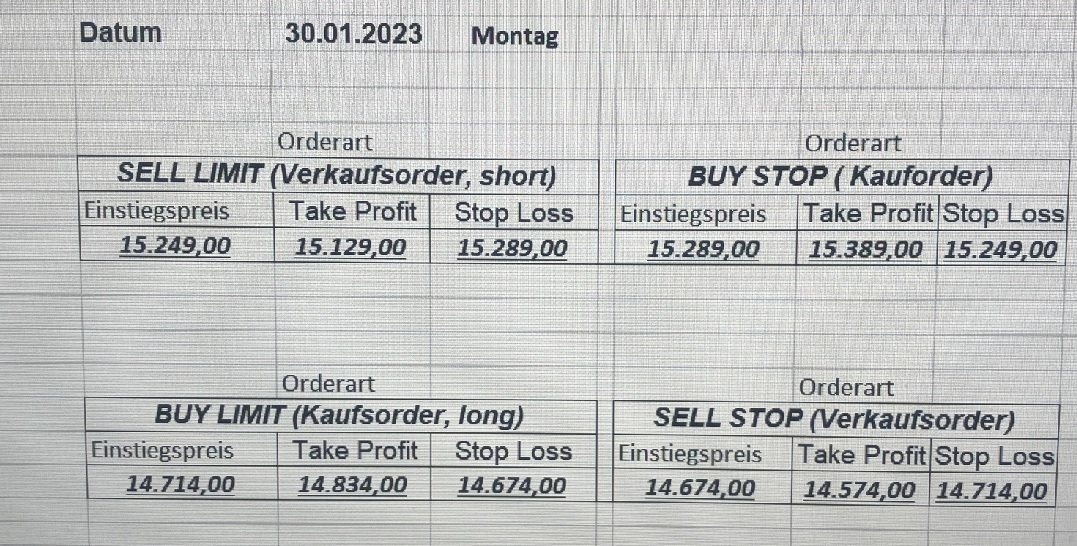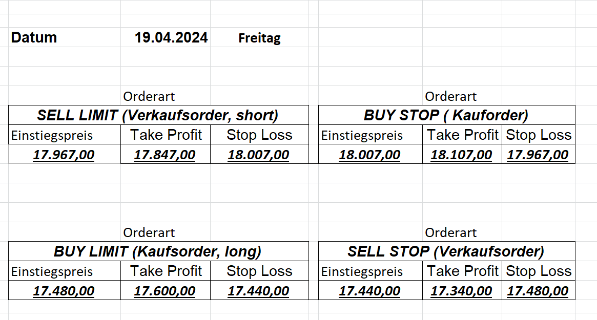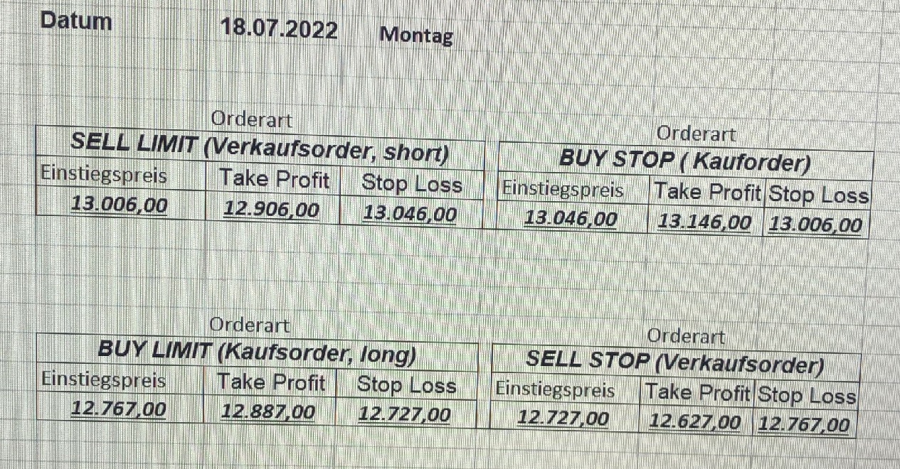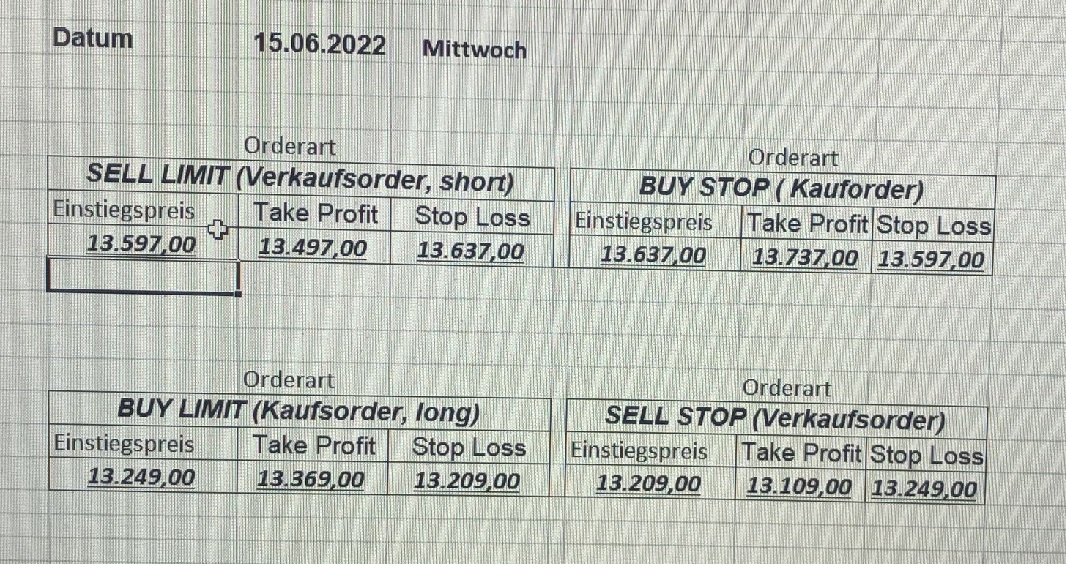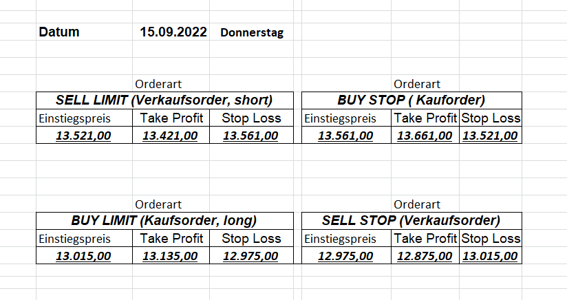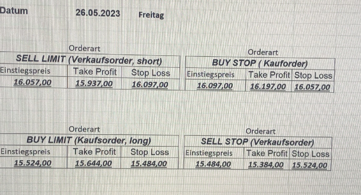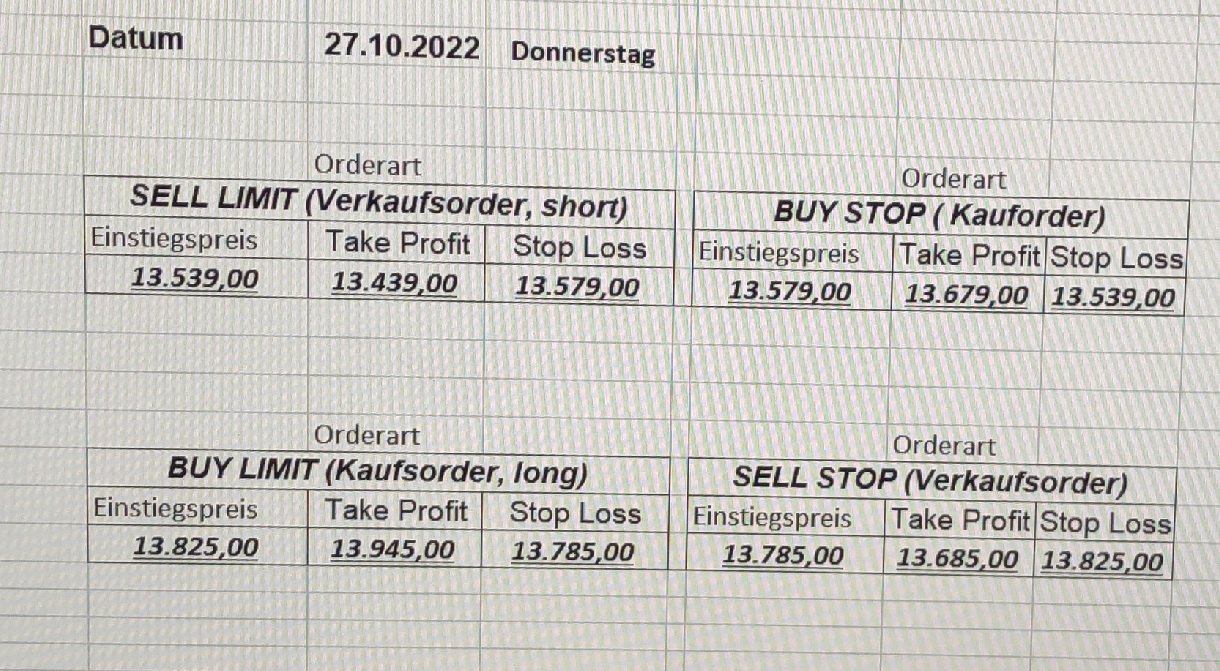16.5.2023 Platzieren Sie die  Order bis 9:00 Löschen Sie bitte offene Order und Positionen um 21:45 ! Zur Frage der Punktgröße: Beispielrechnung: Bitte immer kurz auf den am weitest entfernten Stopp schauen. Diese Punktzahl sollte nicht mehr als 0,5% bis 1% des Kapitals ausmachen. 15.5.2023 Platzieren Sie die  Order bis 9:00 Löschen Sie bitte offene Order und Positionen um 21:45 ! Zur Frage der Punktgröße: Beispielrechnung: Bitte immer kurz auf den am weitest entfernten Stopp schauen. Diese Punktzahl sollte nicht mehr als 0,5% bis 1% des Kapitals ausmachen. 12.5.2023 Platzieren Sie die  Order bis 9:00 Löschen Sie bitte offene Order und Positionen um 21:45 ! Zur Frage der Punktgröße: Beispielrechnung: Bitte immer kurz auf den am weitest entfernten Stopp schauen. Diese Punktzahl sollte nicht mehr als 0,5% bis 1% des Kapitals ausmachen. 10.5.2023  Platzieren Sie die  Order bis 9:00 Löschen Sie bitte offene Order und Positionen um 21:45 ! Zur Frage der Punktgröße: Beispielrechnung: Bitte immer kurz auf den am weitest entfernten Stopp schauen. Diese Punktzahl sollte nicht mehr als 0,5% bis 1% des Kapitals ausmachen. 9.5.2023 Platzieren Sie die  Order bis 9:00 Löschen Sie bitte offene Order und Positionen um 21:45 ! Zur Frage der Punktgröße: Beispielrechnung: Bitte immer kurz auf den am weitest entfernten Stopp schauen. Diese Punktzahl sollte nicht mehr als 0,5% bis 1% des Kapitals ausmachen.   8.5.2023 Platzieren Sie die  Order bis 9:00 Löschen Sie bitte offene Order und Positionen um 21:45 ! Zur Frage der Punktgröße: Beispielrechnung: Bitte immer kurz auf den am weitest entfernten Stopp schauen. Diese Punktzahl sollte nicht mehr als 0,5% bis 1% des Kapitals ausmachen. 5.5.2023 Platzieren Sie die  Order bis 9:00 Löschen Sie bitte offene Order und Positionen um 21:45 ! Zur Frage der Punktgröße: Beispielrechnung: Bitte immer kurz auf den am weitest entfernten Stopp schauen. Diese Punktzahl sollte nicht mehr als 0,5% bis 1% des Kapitals ausmachen. 4.5.2023 Platzieren Sie die  Order bis 9:00 Löschen Sie bitte offene Order und Positionen um 21:45 ! Zur Frage der Punktgröße: Beispielrechnung: Bitte immer kurz auf den am weitest entfernten Stopp schauen. Diese Punktzahl sollte nicht mehr als 0,5% bis 1% des Kapitals ausmachen. 3.5.2023 Heute abend FED-Sitzung: Wir bleiben heute aus dem Markt! 2.5.2023 Platzieren Sie die  Order bis 9:00 Löschen Sie bitte offene Order und Positionen um 21:45 ! Zur Frage der Punktgröße: Beispielrechnung: Bitte immer kurz auf den am weitest entfernten Stopp schauen. Diese Punktzahl sollte nicht mehr als 0,5% bis 1% des Kapitals ausmachen. 28.4.2023 Platzieren Sie die  Order bis 9:00 Löschen Sie bitte offene Order und Positionen um 21:45 ! Zur Frage der Punktgröße: Beispielrechnung: Bitte immer kurz auf den am weitest entfernten Stopp schauen. Diese Punktzahl sollte nicht mehr als 0,5% bis 1% des Kapitals ausmachen. 27.4.2023 Platzieren Sie die  Order bis 9:00 Löschen Sie bitte offene Order und Positionen um 21:45 ! Zur Frage der Punktgröße: Beispielrechnung: Bitte immer kurz auf den am weitest entfernten Stopp schauen. Diese Punktzahl sollte nicht mehr als 0,5% bis 1% des Kapitals ausmachen. 26.4.2023 Platzieren Sie die  Order bis 9:00 Löschen Sie bitte offene Order und Positionen um 21:45 ! Zur Frage der Punktgröße: Beispielrechnung: Bitte immer kurz auf den am weitest entfernten Stopp schauen. Diese Punktzahl sollte nicht mehr als 0,5% bis 1% des Kapitals ausmachen. 25.4.2023 Platzieren Sie die  Order bis 9:00 Löschen Sie bitte offene Order und Positionen um 21:45 ! Zur Frage der Punktgröße: Beispielrechnung: Bitte immer kurz auf den am weitest entfernten Stopp schauen. Diese Punktzahl sollte nicht mehr als 0,5% bis 1% des Kapitals ausmachen. 24.4.2023 Platzieren Sie die  Order bis 9:00 Löschen Sie bitte offene Order und Positionen um 21:45 ! Zur Frage der Punktgröße: Beispielrechnung: Bitte immer kurz auf den am weitest entfernten Stopp schauen. Diese Punktzahl sollte nicht mehr als 0,5% bis 1% des Kapitals ausmachen. 21.4.2023 Platzieren Sie die  Order bis 9:00 Löschen Sie bitte offene Order und Positionen um 21:45 ! Zur Frage der Punktgröße: Beispielrechnung: Bitte immer kurz auf den am weitest entfernten Stopp schauen. Diese Punktzahl sollte nicht mehr als 0,5% bis 1% des Kapitals ausmachen. Sorry, falscher Wochentag, aber es sind die heutigen Signale!    20.4.2023 Platzieren Sie die  Order bis 9:00 Löschen Sie bitte offene Order und Positionen um 21:45 ! Zur Frage der Punktgröße: Beispielrechnung: Bitte immer kurz auf den am weitest entfernten Stopp schauen. Diese Punktzahl sollte nicht mehr als 0,5% bis 1% des Kapitals ausmachen. 19.4.2023 Platzieren Sie die  Order bis 9:00 Löschen Sie bitte offene Order und Positionen um 21:45 ! Zur Frage der Punktgröße: Beispielrechnung: Bitte immer kurz auf den am weitest entfernten Stopp schauen. Diese Punktzahl sollte nicht mehr als 0,5% bis 1% des Kapitals ausmachen. 18.4.2023 Platzieren Sie die  Order bis 9:00 Löschen Sie bitte offene Order und Positionen um 21:45 ! Zur Frage der Punktgröße: Beispielrechnung: Bitte immer kurz auf den am weitest entfernten Stopp schauen. Diese Punktzahl sollte nicht mehr als 0,5% bis 1% des Kapitals ausmachen.  17.4.2023 Platzieren Sie die  Order bis 9:00 Löschen Sie bitte offene Order und Positionen um 21:45 ! Zur Frage der Punktgröße: Beispielrechnung: Bitte immer kurz auf den am weitest entfernten Stopp schauen. Diese Punktzahl sollte nicht mehr als 0,5% bis 1% des Kapitals ausmachen. 14.4.2023 Platzieren Sie die  Order bis 9:00 Löschen Sie bitte offene Order und Positionen um 21:45 ! Zur Frage der Punktgröße: Beispielrechnung: Bitte immer kurz auf den am weitest entfernten Stopp schauen. Diese Punktzahl sollte nicht mehr als 0,5% bis 1% des Kapitals ausmachen. 13.4.2023 Heute bleiben wir an der Seitenlinie. Aktuell ist der DAX nicht volatil genug!  12.4.2023 Pla