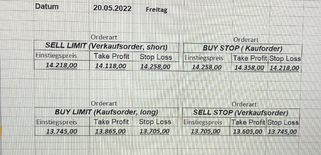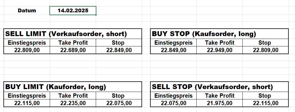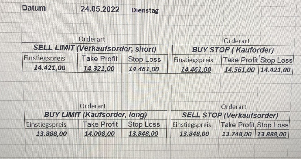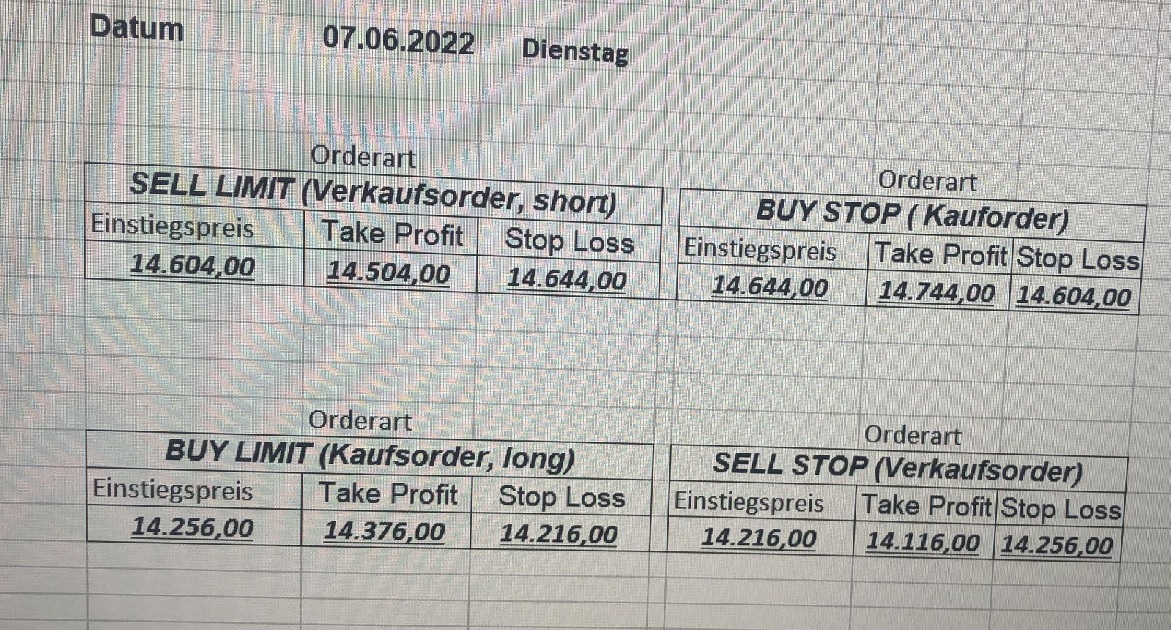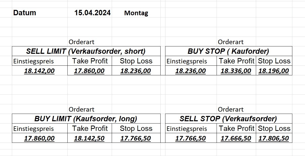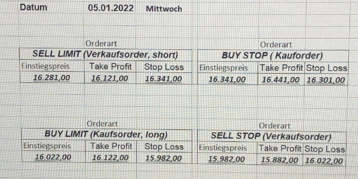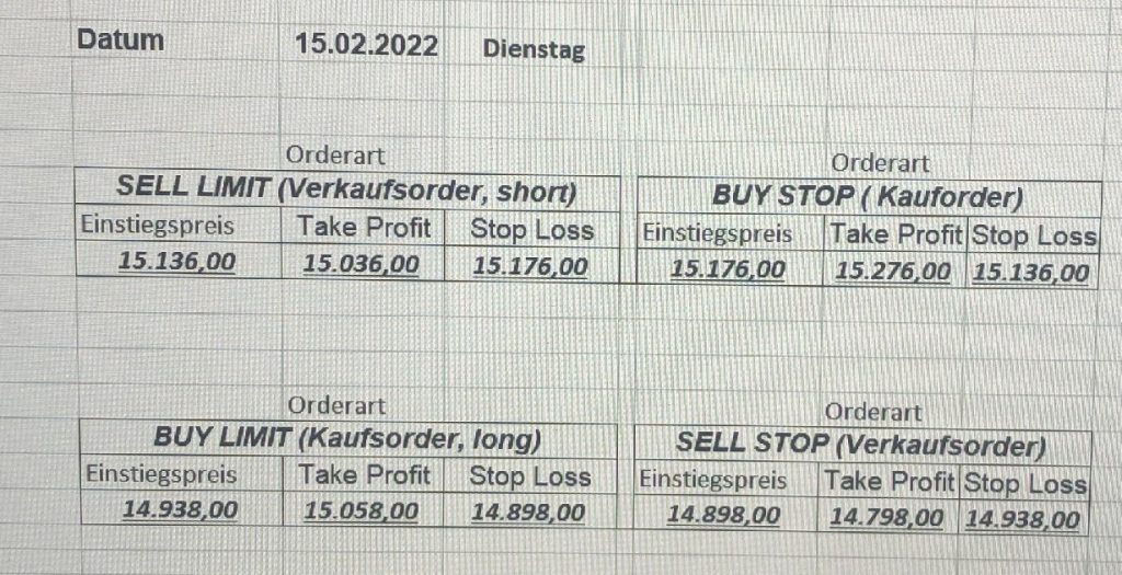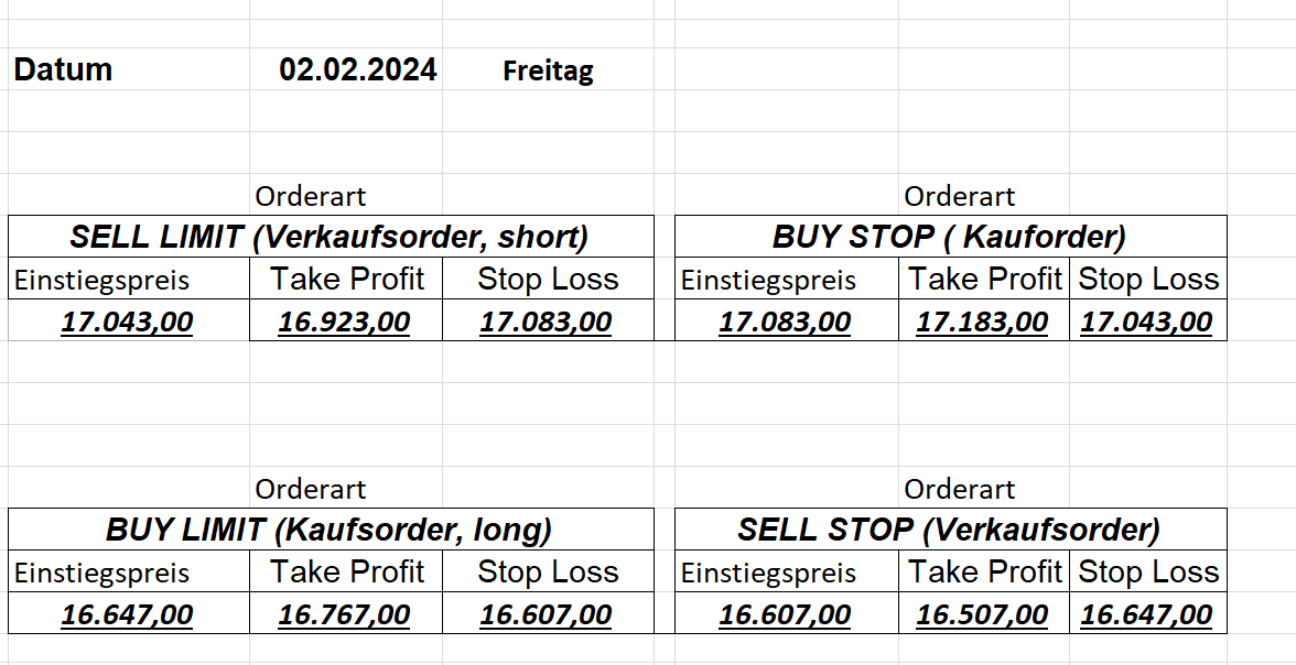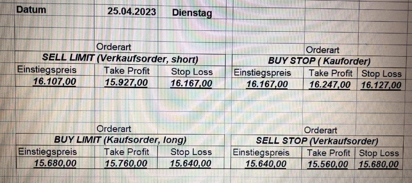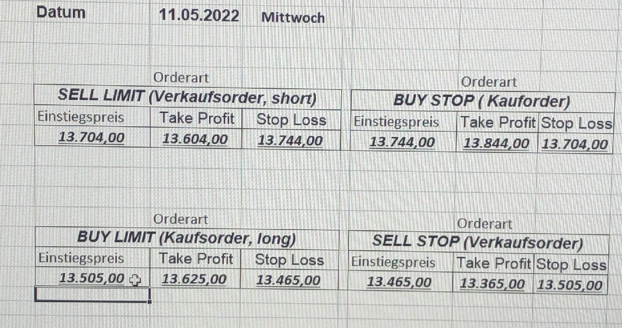 16.5.2023 Platzieren Sie die  Order bis 9:00 Löschen Sie bitte offene Order und Positionen um 21:45 ! Zur Frage der Punktgröße: Beispielrechnung: Bitte immer kurz auf den am weitest entfernten Stopp schauen. Diese Punktzahl sollte nicht mehr als 0,5% bis 1% des Kapitals ausmachen. 15.5.2023 Platzieren Sie die  Order bis 9:00 Löschen Sie bitte offene Order und Positionen um 21:45 ! Zur Frage der Punktgröße: Beispielrechnung: Bitte immer kurz auf den am weitest entfernten Stopp schauen. Diese Punktzahl sollte nicht mehr als 0,5% bis 1% des Kapitals ausmachen. 12.5.2023 Platzieren Sie die  Order bis 9:00 Löschen Sie bitte offene Order und Positionen um 21:45 ! Zur Frage der Punktgröße: Beispielrechnung: Bitte immer kurz auf den am weitest entfernten Stopp schauen. Diese Punktzahl sollte nicht mehr als 0,5% bis 1% des Kapitals ausmachen. 10.5.2023  Platzieren Sie die  Order bis 9:00 Löschen Sie bitte offene Order und Positionen um 21:45 ! Zur Frage der Punktgröße: Beispielrechnung: Bitte immer kurz auf den am weitest entfernten Stopp schauen. Diese Punktzahl sollte nicht mehr als 0,5% bis 1% des Kapitals ausmachen. 9.5.2023 Platzieren Sie die  Order bis 9:00 Löschen Sie bitte offene Order und Positionen um 21:45 ! Zur Frage der Punktgröße: Beispielrechnung: Bitte immer kurz auf den am weitest entfernten Stopp schauen. Diese Punktzahl sollte nicht mehr als 0,5% bis 1% des Kapitals ausmachen.   8.5.2023 Platzieren Sie die  Order bis 9:00 Löschen Sie bitte offene Order und Positionen um 21:45 ! Zur Frage der Punktgröße: Beispielrechnung: Bitte immer kurz auf den am weitest entfernten Stopp schauen. Diese Punktzahl sollte nicht mehr als 0,5% bis 1% des Kapitals ausmachen. 5.5.2023 Platzieren Sie die  Order bis 9:00 Löschen Sie bitte offene Order und Positionen um 21:45 ! Zur Frage der Punktgröße: Beispielrechnung: Bitte immer kurz auf den am weitest entfernten Stopp schauen. Diese Punktzahl sollte nicht mehr als 0,5% bis 1% des Kapitals ausmachen. 4.5.2023 Platzieren Sie die  Order bis 9:00 Löschen Sie bitte offene Order und Positionen um 21:45 ! Zur Frage der Punktgröße: Beispielrechnung: Bitte immer kurz auf den am weitest entfernten Stopp schauen. Diese Punktzahl sollte nicht mehr als 0,5% bis 1% des Kapitals ausmachen. 3.5.2023 Heute abend FED-Sitzung: Wir bleiben heute aus dem Markt! 2.5.2023 Platzieren Sie die  Order bis 9:00 Löschen Sie bitte offene Order und Positionen um 21:45 ! Zur Frage der Punktgröße: Beispielrechnung: Bitte immer kurz auf den am weitest entfernten Stopp schauen. Diese Punktzahl sollte nicht mehr als 0,5% bis 1% des Kapitals ausmachen. 28.4.2023 Platzieren Sie die  Order bis 9:00 Löschen Sie bitte offene Order und Positionen um 21:45 ! Zur Frage der Punktgröße: Beispielrechnung: Bitte immer kurz auf den am weitest entfernten Stopp schauen. Diese Punktzahl sollte nicht mehr als 0,5% bis 1% des Kapitals ausmachen. 27.4.2023 Platzieren Sie die  Order bis 9:00 Löschen Sie bitte offene Order und Positionen um 21:45 ! Zur Frage der Punktgröße: Beispielrechnung: Bitte immer kurz auf den am weitest entfernten Stopp schauen. Diese Punktzahl sollte nicht mehr als 0,5% bis 1% des Kapitals ausmachen. 26.4.2023 Platzieren Sie die  Order bis 9:00 Löschen Sie bitte offene Order und Positionen um 21:45 ! Zur Frage der Punktgröße: Beispielrechnung: Bitte immer kurz auf den am weitest entfernten Stopp schauen. Diese Punktzahl sollte nicht mehr als 0,5% bis 1% des Kapitals ausmachen. 25.4.2023 Platzieren Sie die  Order bis 9:00 Löschen Sie bitte offene Order und Positionen um 21:45 ! Zur Frage der Punktgröße: Beispielrechnung: Bitte immer kurz auf den am weitest entfernten Stopp schauen. Diese Punktzahl sollte nicht mehr als 0,5% bis 1% des Kapitals ausmachen. 24.4.2023 Platzieren Sie die  Order bis 9:00 Löschen Sie bitte offene Order und Positionen um 21:45 ! Zur Frage der Punktgröße: Beispielrechnung: Bitte immer kurz auf den am weitest entfernten Stopp schauen. Diese Punktzahl sollte nicht mehr als 0,5% bis 1% des Kapitals ausmachen. 21.4.2023 Platzieren Sie die  Order bis 9:00 Löschen Sie bitte offene Order und Positionen um 21:45 ! Zur Frage der Punktgröße: Beispielrechnung: Bitte immer kurz auf den am weitest entfernten Stopp schauen. Diese Punktzahl sollte nicht mehr als 0,5% bis 1% des Kapitals ausmachen. Sorry, falscher Wochentag, aber es sind die heutigen Signale!    20.4.2023 Platzieren Sie die  Order bis 9:00 Löschen Sie bitte offene Order und Positionen um 21:45 ! Zur Frage der Punktgröße: Beispielrechnung: Bitte immer kurz auf den am weitest entfernten Stopp schauen. Diese Punktzahl sollte nicht mehr als 0,5% bis 1% des Kapitals ausmachen. 19.4.2023 Platzieren Sie die  Order bis 9:00 Löschen Sie bitte offene Order und Positionen um 21:45 ! Zur Frage der Punktgröße: Beispielrechnung: Bitte immer kurz auf den am weitest entfernten Stopp schauen. Diese Punktzahl sollte nicht mehr als 0,5% bis 1% des Kapitals ausmachen. 18.4.2023 Platzieren Sie die  Order bis 9:00 Löschen Sie bitte offene Order und Positionen um 21:45 ! Zur Frage der Punktgröße: Beispielrechnung: Bitte immer kurz auf den am weitest entfernten Stopp schauen. Diese Punktzahl sollte nicht mehr als 0,5% bis 1% des Kapitals ausmachen.  17.4.2023 Platzieren Sie die  Order bis 9:00 Löschen Sie bitte offene Order und Positionen um 21:45 ! Zur Frage der Punktgröße: Beispielrechnung: Bitte immer kurz auf den am weitest entfernten Stopp schauen. Diese Punktzahl sollte nicht mehr als 0,5% bis 1% des Kapitals ausmachen. 14.4.2023 Platzieren Sie die  Order bis 9:00 Löschen Sie bitte offene Order und Positionen um 21:45 ! Zur Frage der Punktgröße: Beispielrechnung: Bitte immer kurz auf den am weitest entfernten Stopp schauen. Diese Punktzahl sollte nicht mehr als 0,5% bis 1% des Kapitals ausmachen. 13.4.2023 Heute bleiben wir an der Seitenlinie. Aktuell ist der DAX nicht volatil genug!  12.4.2023 Pla