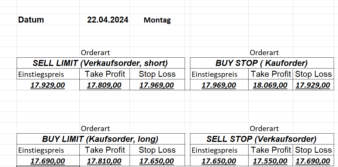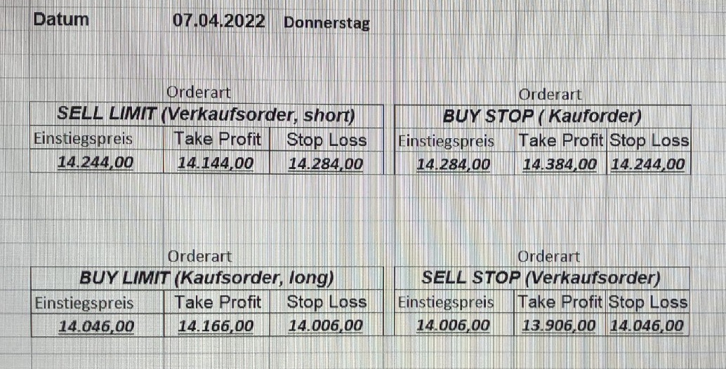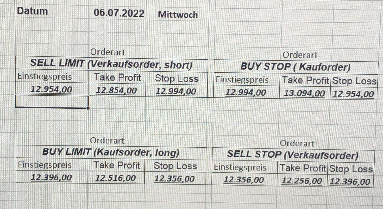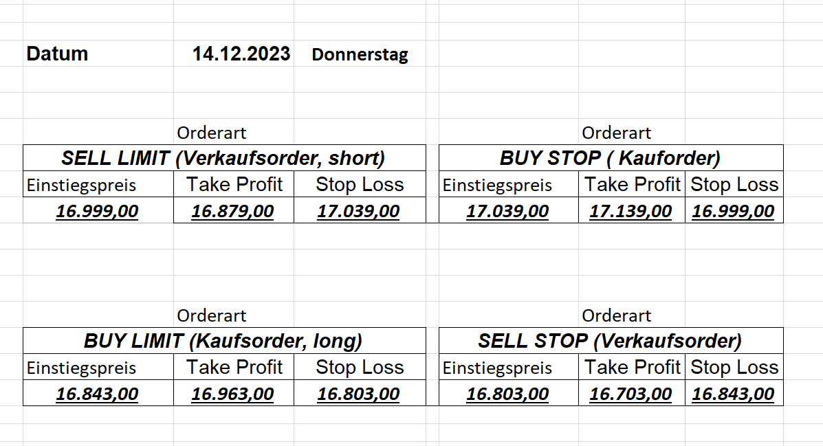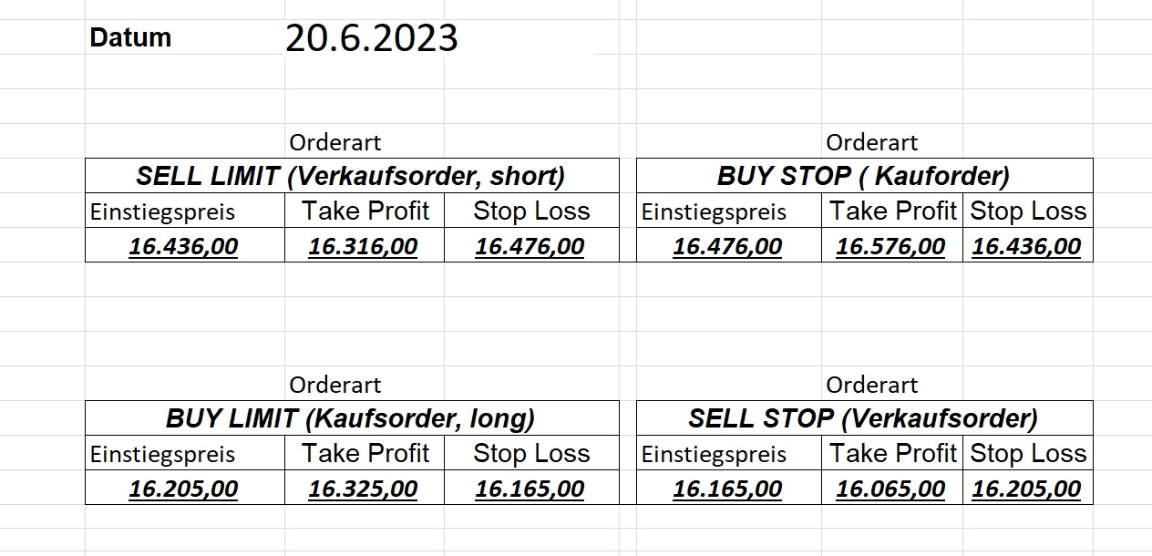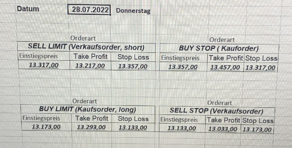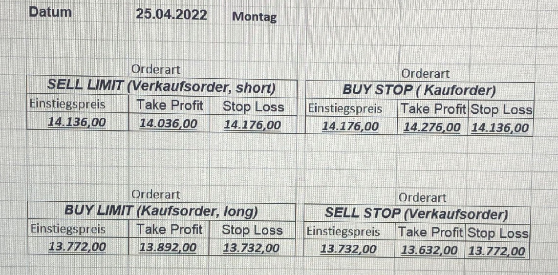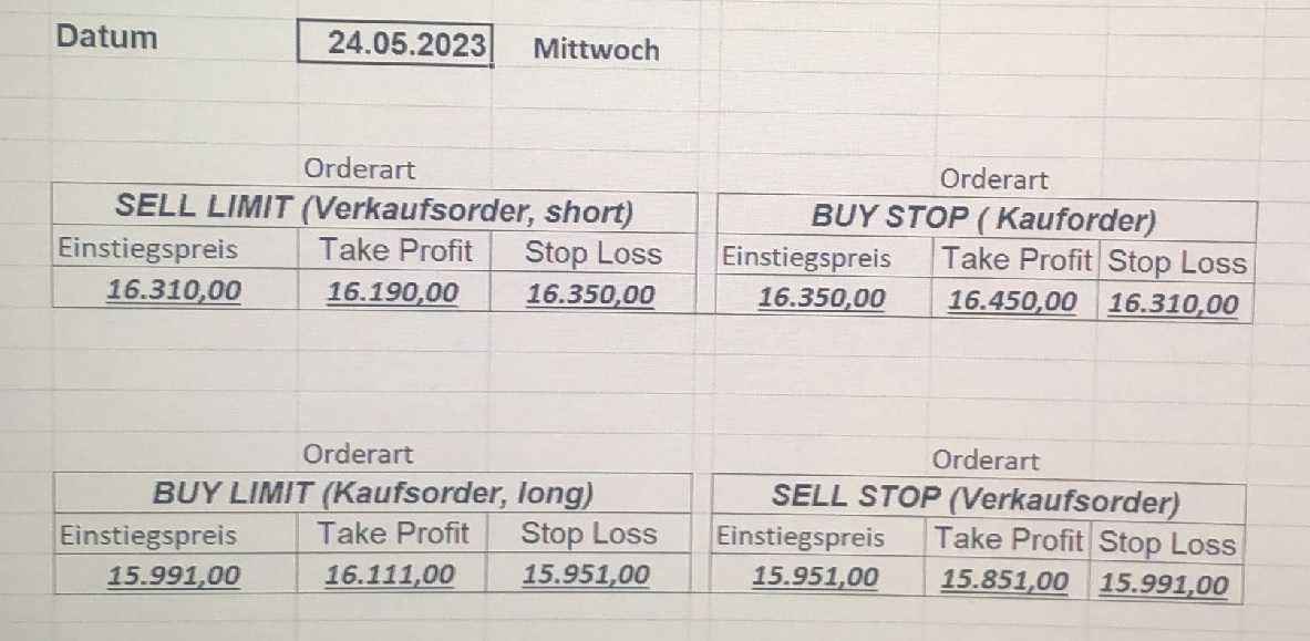 16.5.2023 Platzieren Sie die  Order bis 9:00 Löschen Sie bitte offene Order und Positionen um 21:45 ! Zur Frage der Punktgröße: Beispielrechnung: Bitte immer kurz auf den am weitest entfernten Stopp schauen. Diese Punktzahl sollte nicht mehr als 0,5% bis 1% des Kapitals ausmachen. 15.5.2023 Platzieren Sie die  Order bis 9:00 Löschen Sie bitte offene Order und Positionen um 21:45 ! Zur Frage der Punktgröße: Beispielrechnung: Bitte immer kurz auf den am weitest entfernten Stopp schauen. Diese Punktzahl sollte nicht mehr als 0,5% bis 1% des Kapitals ausmachen. 12.5.2023 Platzieren Sie die  Order bis 9:00 Löschen Sie bitte offene Order und Positionen um 21:45 ! Zur Frage der Punktgröße: Beispielrechnung: Bitte immer kurz auf den am weitest entfernten Stopp schauen. Diese Punktzahl sollte nicht mehr als 0,5% bis 1% des Kapitals ausmachen. 10.5.2023  Platzieren Sie die  Order bis 9:00 Löschen Sie bitte offene Order und Positionen um 21:45 ! Zur Frage der Punktgröße: Beispielrechnung: Bitte immer kurz auf den am weitest entfernten Stopp schauen. Diese Punktzahl sollte nicht mehr als 0,5% bis 1% des Kapitals ausmachen. 9.5.2023 Platzieren Sie die  Order bis 9:00 Löschen Sie bitte offene Order und Positionen um 21:45 ! Zur Frage der Punktgröße: Beispielrechnung: Bitte immer kurz auf den am weitest entfernten Stopp schauen. Diese Punktzahl sollte nicht mehr als 0,5% bis 1% des Kapitals ausmachen.   8.5.2023 Platzieren Sie die  Order bis 9:00 Löschen Sie bitte offene Order und Positionen um 21:45 ! Zur Frage der Punktgröße: Beispielrechnung: Bitte immer kurz auf den am weitest entfernten Stopp schauen. Diese Punktzahl sollte nicht mehr als 0,5% bis 1% des Kapitals ausmachen. 5.5.2023 Platzieren Sie die  Order bis 9:00 Löschen Sie bitte offene Order und Positionen um 21:45 ! Zur Frage der Punktgröße: Beispielrechnung: Bitte immer kurz auf den am weitest entfernten Stopp schauen. Diese Punktzahl sollte nicht mehr als 0,5% bis 1% des Kapitals ausmachen. 4.5.2023 Platzieren Sie die  Order bis 9:00 Löschen Sie bitte offene Order und Positionen um 21:45 ! Zur Frage der Punktgröße: Beispielrechnung: Bitte immer kurz auf den am weitest entfernten Stopp schauen. Diese Punktzahl sollte nicht mehr als 0,5% bis 1% des Kapitals ausmachen. 3.5.2023 Heute abend FED-Sitzung: Wir bleiben heute aus dem Markt! 2.5.2023 Platzieren Sie die  Order bis 9:00 Löschen Sie bitte offene Order und Positionen um 21:45 ! Zur Frage der Punktgröße: Beispielrechnung: Bitte immer kurz auf den am weitest entfernten Stopp schauen. Diese Punktzahl sollte nicht mehr als 0,5% bis 1% des Kapitals ausmachen. 28.4.2023 Platzieren Sie die  Order bis 9:00 Löschen Sie bitte offene Order und Positionen um 21:45 ! Zur Frage der Punktgröße: Beispielrechnung: Bitte immer kurz auf den am weitest entfernten Stopp schauen. Diese Punktzahl sollte nicht mehr als 0,5% bis 1% des Kapitals ausmachen. 27.4.2023 Platzieren Sie die  Order bis 9:00 Löschen Sie bitte offene Order und Positionen um 21:45 ! Zur Frage der Punktgröße: Beispielrechnung: Bitte immer kurz auf den am weitest entfernten Stopp schauen. Diese Punktzahl sollte nicht mehr als 0,5% bis 1% des Kapitals ausmachen. 26.4.2023 Platzieren Sie die  Order bis 9:00 Löschen Sie bitte offene Order und Positionen um 21:45 ! Zur Frage der Punktgröße: Beispielrechnung: Bitte immer kurz auf den am weitest entfernten Stopp schauen. Diese Punktzahl sollte nicht mehr als 0,5% bis 1% des Kapitals ausmachen. 25.4.2023 Platzieren Sie die  Order bis 9:00 Löschen Sie bitte offene Order und Positionen um 21:45 ! Zur Frage der Punktgröße: Beispielrechnung: Bitte immer kurz auf den am weitest entfernten Stopp schauen. Diese Punktzahl sollte nicht mehr als 0,5% bis 1% des Kapitals ausmachen. 24.4.2023 Platzieren Sie die  Order bis 9:00 Löschen Sie bitte offene Order und Positionen um 21:45 ! Zur Frage der Punktgröße: Beispielrechnung: Bitte immer kurz auf den am weitest entfernten Stopp schauen. Diese Punktzahl sollte nicht mehr als 0,5% bis 1% des Kapitals ausmachen. 21.4.2023 Platzieren Sie die  Order bis 9:00 Löschen Sie bitte offene Order und Positionen um 21:45 ! Zur Frage der Punktgröße: Beispielrechnung: Bitte immer kurz auf den am weitest entfernten Stopp schauen. Diese Punktzahl sollte nicht mehr als 0,5% bis 1% des Kapitals ausmachen. Sorry, falscher Wochentag, aber es sind die heutigen Signale!    20.4.2023 Platzieren Sie die  Order bis 9:00 Löschen Sie bitte offene Order und Positionen um 21:45 ! Zur Frage der Punktgröße: Beispielrechnung: Bitte immer kurz auf den am weitest entfernten Stopp schauen. Diese Punktzahl sollte nicht mehr als 0,5% bis 1% des Kapitals ausmachen. 19.4.2023 Platzieren Sie die  Order bis 9:00 Löschen Sie bitte offene Order und Positionen um 21:45 ! Zur Frage der Punktgröße: Beispielrechnung: Bitte immer kurz auf den am weitest entfernten Stopp schauen. Diese Punktzahl sollte nicht mehr als 0,5% bis 1% des Kapitals ausmachen. 18.4.2023 Platzieren Sie die  Order bis 9:00 Löschen Sie bitte offene Order und Positionen um 21:45 ! Zur Frage der Punktgröße: Beispielrechnung: Bitte immer kurz auf den am weitest entfernten Stopp schauen. Diese Punktzahl sollte nicht mehr als 0,5% bis 1% des Kapitals ausmachen.  17.4.2023 Platzieren Sie die  Order bis 9:00 Löschen Sie bitte offene Order und Positionen um 21:45 ! Zur Frage der Punktgröße: Beispielrechnung: Bitte immer kurz auf den am weitest entfernten Stopp schauen. Diese Punktzahl sollte nicht mehr als 0,5% bis 1% des Kapitals ausmachen. 14.4.2023 Platzieren Sie die  Order bis 9:00 Löschen Sie bitte offene Order und Positionen um 21:45 ! Zur Frage der Punktgröße: Beispielrechnung: Bitte immer kurz auf den am weitest entfernten Stopp schauen. Diese Punktzahl sollte nicht mehr als 0,5% bis 1% des Kapitals ausmachen. 13.4.2023 Heute bleiben wir an der Seitenlinie. Aktuell ist der DAX nicht volatil genug!  12.4.2023 Pla