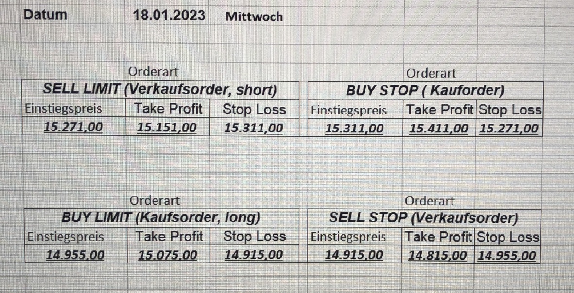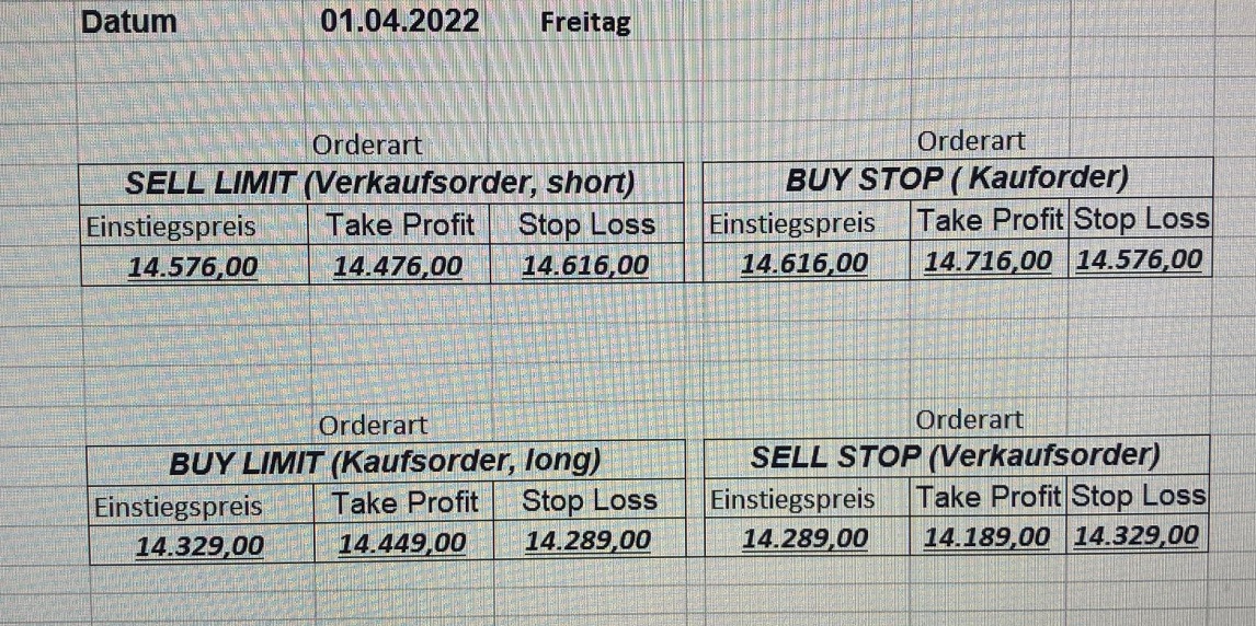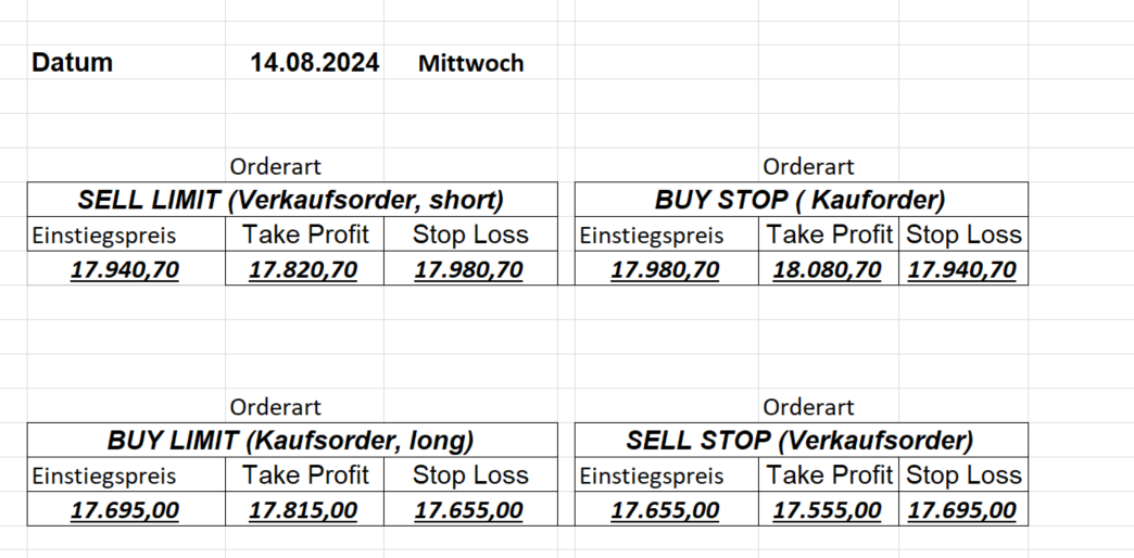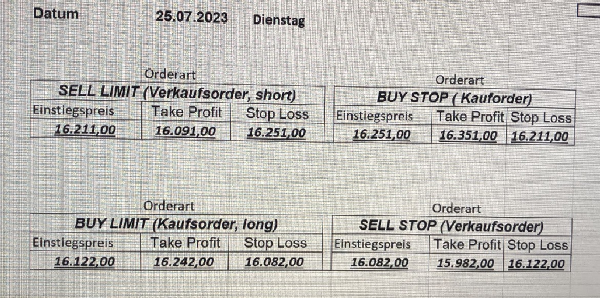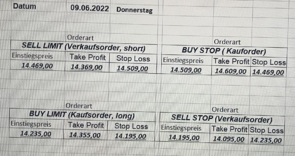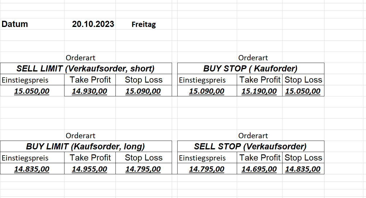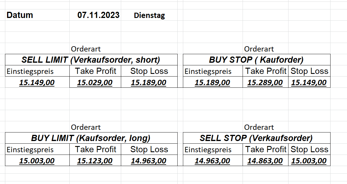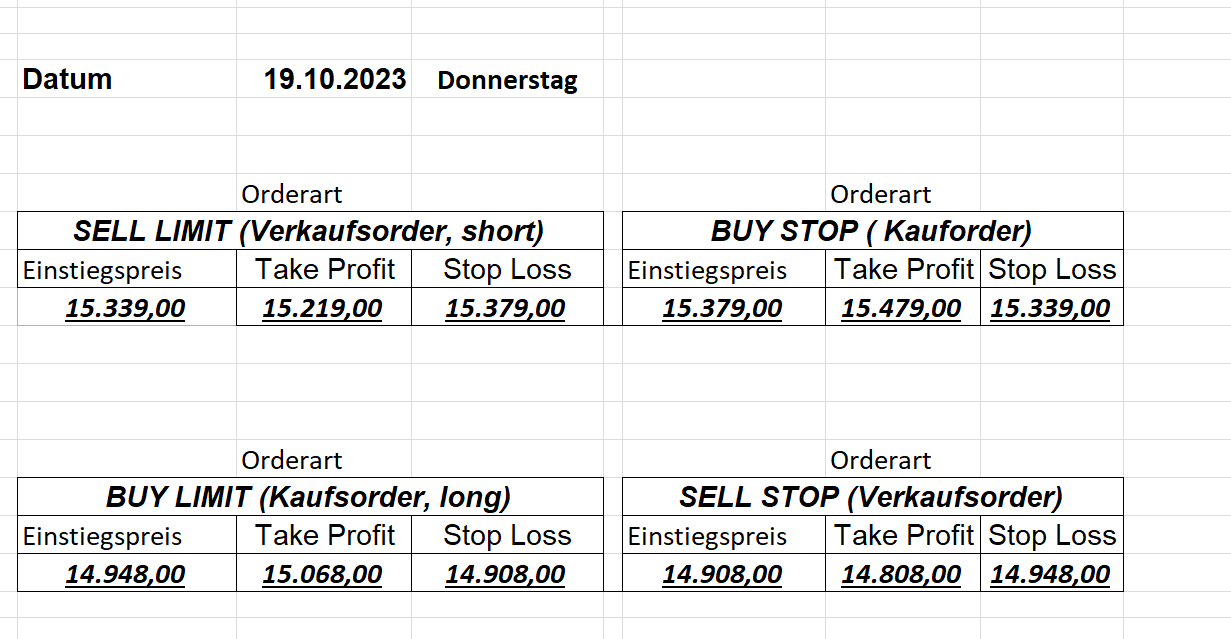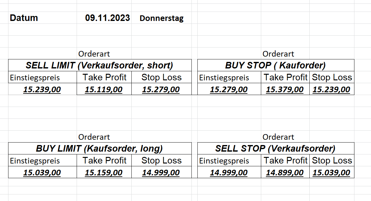 16.5.2023 Platzieren Sie die  Order bis 9:00 Löschen Sie bitte offene Order und Positionen um 21:45 ! Zur Frage der Punktgröße: Beispielrechnung: Bitte immer kurz auf den am weitest entfernten Stopp schauen. Diese Punktzahl sollte nicht mehr als 0,5% bis 1% des Kapitals ausmachen. 15.5.2023 Platzieren Sie die  Order bis 9:00 Löschen Sie bitte offene Order und Positionen um 21:45 ! Zur Frage der Punktgröße: Beispielrechnung: Bitte immer kurz auf den am weitest entfernten Stopp schauen. Diese Punktzahl sollte nicht mehr als 0,5% bis 1% des Kapitals ausmachen. 12.5.2023 Platzieren Sie die  Order bis 9:00 Löschen Sie bitte offene Order und Positionen um 21:45 ! Zur Frage der Punktgröße: Beispielrechnung: Bitte immer kurz auf den am weitest entfernten Stopp schauen. Diese Punktzahl sollte nicht mehr als 0,5% bis 1% des Kapitals ausmachen. 10.5.2023  Platzieren Sie die  Order bis 9:00 Löschen Sie bitte offene Order und Positionen um 21:45 ! Zur Frage der Punktgröße: Beispielrechnung: Bitte immer kurz auf den am weitest entfernten Stopp schauen. Diese Punktzahl sollte nicht mehr als 0,5% bis 1% des Kapitals ausmachen. 9.5.2023 Platzieren Sie die  Order bis 9:00 Löschen Sie bitte offene Order und Positionen um 21:45 ! Zur Frage der Punktgröße: Beispielrechnung: Bitte immer kurz auf den am weitest entfernten Stopp schauen. Diese Punktzahl sollte nicht mehr als 0,5% bis 1% des Kapitals ausmachen.   8.5.2023 Platzieren Sie die  Order bis 9:00 Löschen Sie bitte offene Order und Positionen um 21:45 ! Zur Frage der Punktgröße: Beispielrechnung: Bitte immer kurz auf den am weitest entfernten Stopp schauen. Diese Punktzahl sollte nicht mehr als 0,5% bis 1% des Kapitals ausmachen. 5.5.2023 Platzieren Sie die  Order bis 9:00 Löschen Sie bitte offene Order und Positionen um 21:45 ! Zur Frage der Punktgröße: Beispielrechnung: Bitte immer kurz auf den am weitest entfernten Stopp schauen. Diese Punktzahl sollte nicht mehr als 0,5% bis 1% des Kapitals ausmachen. 4.5.2023 Platzieren Sie die  Order bis 9:00 Löschen Sie bitte offene Order und Positionen um 21:45 ! Zur Frage der Punktgröße: Beispielrechnung: Bitte immer kurz auf den am weitest entfernten Stopp schauen. Diese Punktzahl sollte nicht mehr als 0,5% bis 1% des Kapitals ausmachen. 3.5.2023 Heute abend FED-Sitzung: Wir bleiben heute aus dem Markt! 2.5.2023 Platzieren Sie die  Order bis 9:00 Löschen Sie bitte offene Order und Positionen um 21:45 ! Zur Frage der Punktgröße: Beispielrechnung: Bitte immer kurz auf den am weitest entfernten Stopp schauen. Diese Punktzahl sollte nicht mehr als 0,5% bis 1% des Kapitals ausmachen. 28.4.2023 Platzieren Sie die  Order bis 9:00 Löschen Sie bitte offene Order und Positionen um 21:45 ! Zur Frage der Punktgröße: Beispielrechnung: Bitte immer kurz auf den am weitest entfernten Stopp schauen. Diese Punktzahl sollte nicht mehr als 0,5% bis 1% des Kapitals ausmachen. 27.4.2023 Platzieren Sie die  Order bis 9:00 Löschen Sie bitte offene Order und Positionen um 21:45 ! Zur Frage der Punktgröße: Beispielrechnung: Bitte immer kurz auf den am weitest entfernten Stopp schauen. Diese Punktzahl sollte nicht mehr als 0,5% bis 1% des Kapitals ausmachen. 26.4.2023 Platzieren Sie die  Order bis 9:00 Löschen Sie bitte offene Order und Positionen um 21:45 ! Zur Frage der Punktgröße: Beispielrechnung: Bitte immer kurz auf den am weitest entfernten Stopp schauen. Diese Punktzahl sollte nicht mehr als 0,5% bis 1% des Kapitals ausmachen. 25.4.2023 Platzieren Sie die  Order bis 9:00 Löschen Sie bitte offene Order und Positionen um 21:45 ! Zur Frage der Punktgröße: Beispielrechnung: Bitte immer kurz auf den am weitest entfernten Stopp schauen. Diese Punktzahl sollte nicht mehr als 0,5% bis 1% des Kapitals ausmachen. 24.4.2023 Platzieren Sie die  Order bis 9:00 Löschen Sie bitte offene Order und Positionen um 21:45 ! Zur Frage der Punktgröße: Beispielrechnung: Bitte immer kurz auf den am weitest entfernten Stopp schauen. Diese Punktzahl sollte nicht mehr als 0,5% bis 1% des Kapitals ausmachen. 21.4.2023 Platzieren Sie die  Order bis 9:00 Löschen Sie bitte offene Order und Positionen um 21:45 ! Zur Frage der Punktgröße: Beispielrechnung: Bitte immer kurz auf den am weitest entfernten Stopp schauen. Diese Punktzahl sollte nicht mehr als 0,5% bis 1% des Kapitals ausmachen. Sorry, falscher Wochentag, aber es sind die heutigen Signale!    20.4.2023 Platzieren Sie die  Order bis 9:00 Löschen Sie bitte offene Order und Positionen um 21:45 ! Zur Frage der Punktgröße: Beispielrechnung: Bitte immer kurz auf den am weitest entfernten Stopp schauen. Diese Punktzahl sollte nicht mehr als 0,5% bis 1% des Kapitals ausmachen. 19.4.2023 Platzieren Sie die  Order bis 9:00 Löschen Sie bitte offene Order und Positionen um 21:45 ! Zur Frage der Punktgröße: Beispielrechnung: Bitte immer kurz auf den am weitest entfernten Stopp schauen. Diese Punktzahl sollte nicht mehr als 0,5% bis 1% des Kapitals ausmachen. 18.4.2023 Platzieren Sie die  Order bis 9:00 Löschen Sie bitte offene Order und Positionen um 21:45 ! Zur Frage der Punktgröße: Beispielrechnung: Bitte immer kurz auf den am weitest entfernten Stopp schauen. Diese Punktzahl sollte nicht mehr als 0,5% bis 1% des Kapitals ausmachen.  17.4.2023 Platzieren Sie die  Order bis 9:00 Löschen Sie bitte offene Order und Positionen um 21:45 ! Zur Frage der Punktgröße: Beispielrechnung: Bitte immer kurz auf den am weitest entfernten Stopp schauen. Diese Punktzahl sollte nicht mehr als 0,5% bis 1% des Kapitals ausmachen. 14.4.2023 Platzieren Sie die  Order bis 9:00 Löschen Sie bitte offene Order und Positionen um 21:45 ! Zur Frage der Punktgröße: Beispielrechnung: Bitte immer kurz auf den am weitest entfernten Stopp schauen. Diese Punktzahl sollte nicht mehr als 0,5% bis 1% des Kapitals ausmachen. 13.4.2023 Heute bleiben wir an der Seitenlinie. Aktuell ist der DAX nicht volatil genug!  12.4.2023 Pla