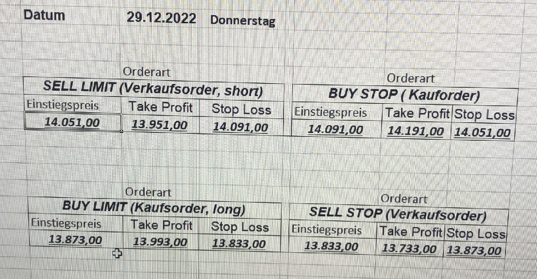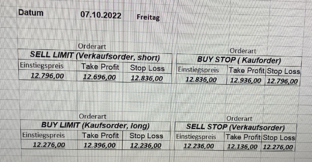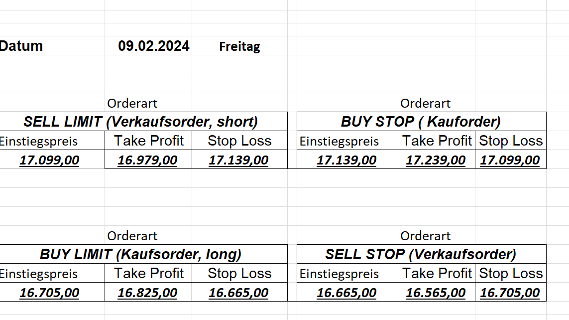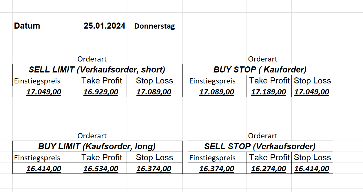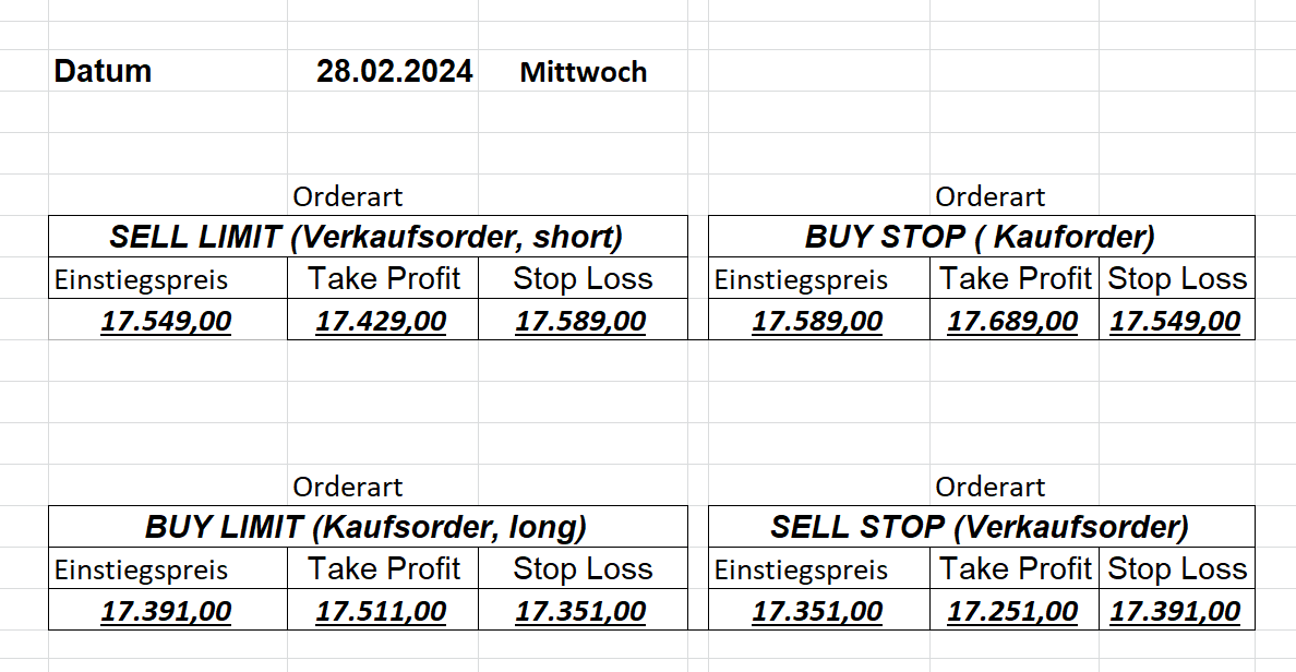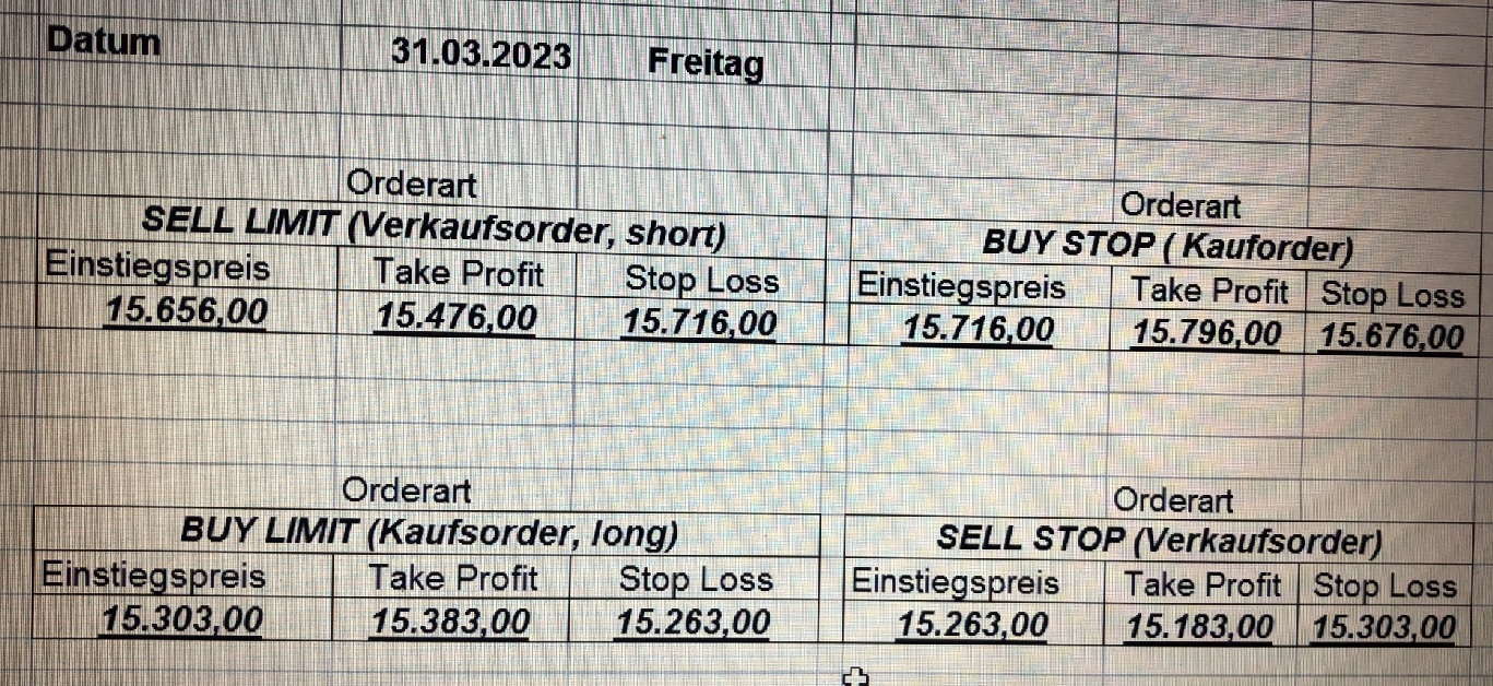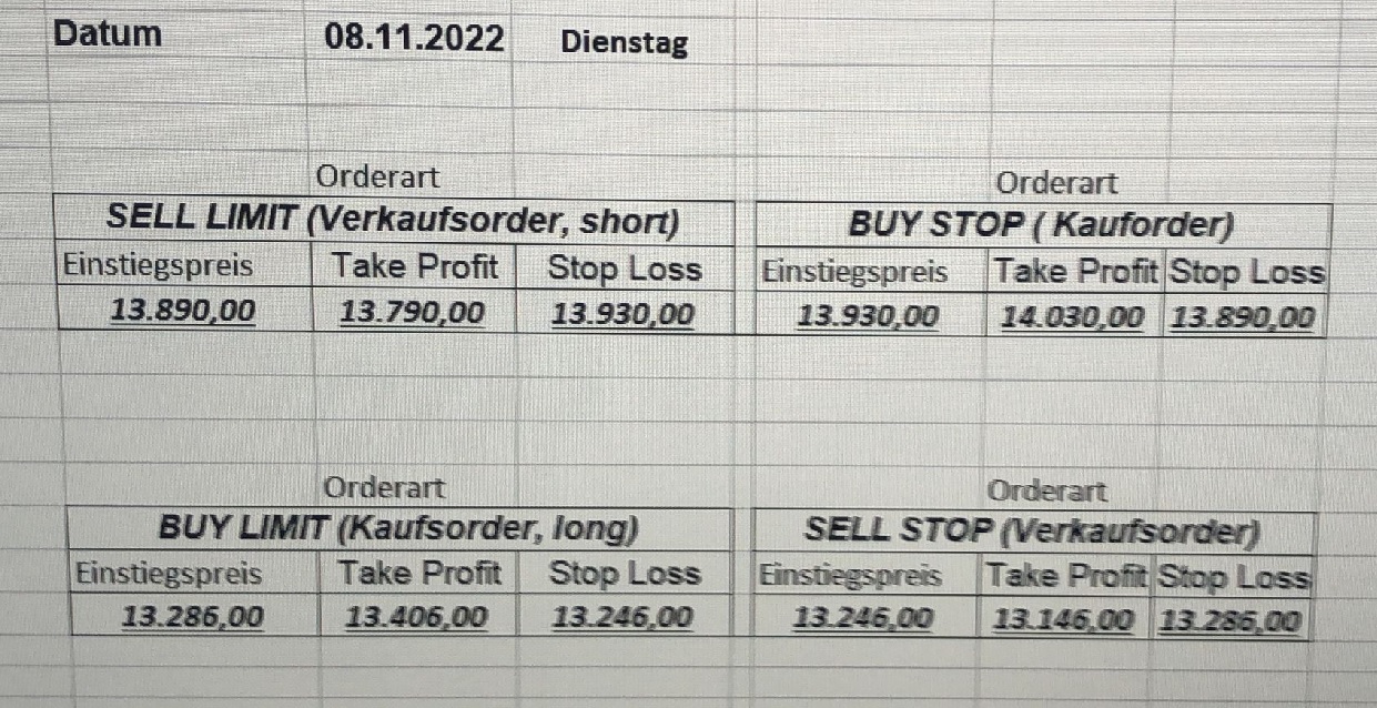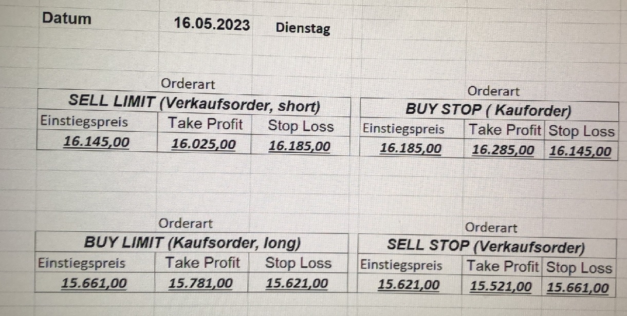 16.5.2023 Platzieren Sie die  Order bis 9:00 Löschen Sie bitte offene Order und Positionen um 21:45 ! Zur Frage der Punktgröße: Beispielrechnung: Bitte immer kurz auf den am weitest entfernten Stopp schauen. Diese Punktzahl sollte nicht mehr als 0,5% bis 1% des Kapitals ausmachen. 15.5.2023 Platzieren Sie die  Order bis 9:00 Löschen Sie bitte offene Order und Positionen um 21:45 ! Zur Frage der Punktgröße: Beispielrechnung: Bitte immer kurz auf den am weitest entfernten Stopp schauen. Diese Punktzahl sollte nicht mehr als 0,5% bis 1% des Kapitals ausmachen. 12.5.2023 Platzieren Sie die  Order bis 9:00 Löschen Sie bitte offene Order und Positionen um 21:45 ! Zur Frage der Punktgröße: Beispielrechnung: Bitte immer kurz auf den am weitest entfernten Stopp schauen. Diese Punktzahl sollte nicht mehr als 0,5% bis 1% des Kapitals ausmachen. 10.5.2023  Platzieren Sie die  Order bis 9:00 Löschen Sie bitte offene Order und Positionen um 21:45 ! Zur Frage der Punktgröße: Beispielrechnung: Bitte immer kurz auf den am weitest entfernten Stopp schauen. Diese Punktzahl sollte nicht mehr als 0,5% bis 1% des Kapitals ausmachen. 9.5.2023 Platzieren Sie die  Order bis 9:00 Löschen Sie bitte offene Order und Positionen um 21:45 ! Zur Frage der Punktgröße: Beispielrechnung: Bitte immer kurz auf den am weitest entfernten Stopp schauen. Diese Punktzahl sollte nicht mehr als 0,5% bis 1% des Kapitals ausmachen.   8.5.2023 Platzieren Sie die  Order bis 9:00 Löschen Sie bitte offene Order und Positionen um 21:45 ! Zur Frage der Punktgröße: Beispielrechnung: Bitte immer kurz auf den am weitest entfernten Stopp schauen. Diese Punktzahl sollte nicht mehr als 0,5% bis 1% des Kapitals ausmachen. 5.5.2023 Platzieren Sie die  Order bis 9:00 Löschen Sie bitte offene Order und Positionen um 21:45 ! Zur Frage der Punktgröße: Beispielrechnung: Bitte immer kurz auf den am weitest entfernten Stopp schauen. Diese Punktzahl sollte nicht mehr als 0,5% bis 1% des Kapitals ausmachen. 4.5.2023 Platzieren Sie die  Order bis 9:00 Löschen Sie bitte offene Order und Positionen um 21:45 ! Zur Frage der Punktgröße: Beispielrechnung: Bitte immer kurz auf den am weitest entfernten Stopp schauen. Diese Punktzahl sollte nicht mehr als 0,5% bis 1% des Kapitals ausmachen. 3.5.2023 Heute abend FED-Sitzung: Wir bleiben heute aus dem Markt! 2.5.2023 Platzieren Sie die  Order bis 9:00 Löschen Sie bitte offene Order und Positionen um 21:45 ! Zur Frage der Punktgröße: Beispielrechnung: Bitte immer kurz auf den am weitest entfernten Stopp schauen. Diese Punktzahl sollte nicht mehr als 0,5% bis 1% des Kapitals ausmachen. 28.4.2023 Platzieren Sie die  Order bis 9:00 Löschen Sie bitte offene Order und Positionen um 21:45 ! Zur Frage der Punktgröße: Beispielrechnung: Bitte immer kurz auf den am weitest entfernten Stopp schauen. Diese Punktzahl sollte nicht mehr als 0,5% bis 1% des Kapitals ausmachen. 27.4.2023 Platzieren Sie die  Order bis 9:00 Löschen Sie bitte offene Order und Positionen um 21:45 ! Zur Frage der Punktgröße: Beispielrechnung: Bitte immer kurz auf den am weitest entfernten Stopp schauen. Diese Punktzahl sollte nicht mehr als 0,5% bis 1% des Kapitals ausmachen. 26.4.2023 Platzieren Sie die  Order bis 9:00 Löschen Sie bitte offene Order und Positionen um 21:45 ! Zur Frage der Punktgröße: Beispielrechnung: Bitte immer kurz auf den am weitest entfernten Stopp schauen. Diese Punktzahl sollte nicht mehr als 0,5% bis 1% des Kapitals ausmachen. 25.4.2023 Platzieren Sie die  Order bis 9:00 Löschen Sie bitte offene Order und Positionen um 21:45 ! Zur Frage der Punktgröße: Beispielrechnung: Bitte immer kurz auf den am weitest entfernten Stopp schauen. Diese Punktzahl sollte nicht mehr als 0,5% bis 1% des Kapitals ausmachen. 24.4.2023 Platzieren Sie die  Order bis 9:00 Löschen Sie bitte offene Order und Positionen um 21:45 ! Zur Frage der Punktgröße: Beispielrechnung: Bitte immer kurz auf den am weitest entfernten Stopp schauen. Diese Punktzahl sollte nicht mehr als 0,5% bis 1% des Kapitals ausmachen. 21.4.2023 Platzieren Sie die  Order bis 9:00 Löschen Sie bitte offene Order und Positionen um 21:45 ! Zur Frage der Punktgröße: Beispielrechnung: Bitte immer kurz auf den am weitest entfernten Stopp schauen. Diese Punktzahl sollte nicht mehr als 0,5% bis 1% des Kapitals ausmachen. Sorry, falscher Wochentag, aber es sind die heutigen Signale!    20.4.2023 Platzieren Sie die  Order bis 9:00 Löschen Sie bitte offene Order und Positionen um 21:45 ! Zur Frage der Punktgröße: Beispielrechnung: Bitte immer kurz auf den am weitest entfernten Stopp schauen. Diese Punktzahl sollte nicht mehr als 0,5% bis 1% des Kapitals ausmachen. 19.4.2023 Platzieren Sie die  Order bis 9:00 Löschen Sie bitte offene Order und Positionen um 21:45 ! Zur Frage der Punktgröße: Beispielrechnung: Bitte immer kurz auf den am weitest entfernten Stopp schauen. Diese Punktzahl sollte nicht mehr als 0,5% bis 1% des Kapitals ausmachen. 18.4.2023 Platzieren Sie die  Order bis 9:00 Löschen Sie bitte offene Order und Positionen um 21:45 ! Zur Frage der Punktgröße: Beispielrechnung: Bitte immer kurz auf den am weitest entfernten Stopp schauen. Diese Punktzahl sollte nicht mehr als 0,5% bis 1% des Kapitals ausmachen.  17.4.2023 Platzieren Sie die  Order bis 9:00 Löschen Sie bitte offene Order und Positionen um 21:45 ! Zur Frage der Punktgröße: Beispielrechnung: Bitte immer kurz auf den am weitest entfernten Stopp schauen. Diese Punktzahl sollte nicht mehr als 0,5% bis 1% des Kapitals ausmachen. 14.4.2023 Platzieren Sie die  Order bis 9:00 Löschen Sie bitte offene Order und Positionen um 21:45 ! Zur Frage der Punktgröße: Beispielrechnung: Bitte immer kurz auf den am weitest entfernten Stopp schauen. Diese Punktzahl sollte nicht mehr als 0,5% bis 1% des Kapitals ausmachen. 13.4.2023 Heute bleiben wir an der Seitenlinie. Aktuell ist der DAX nicht volatil genug!  12.4.2023 Pla