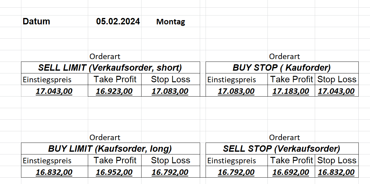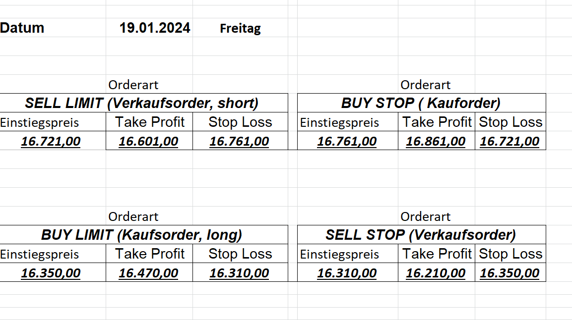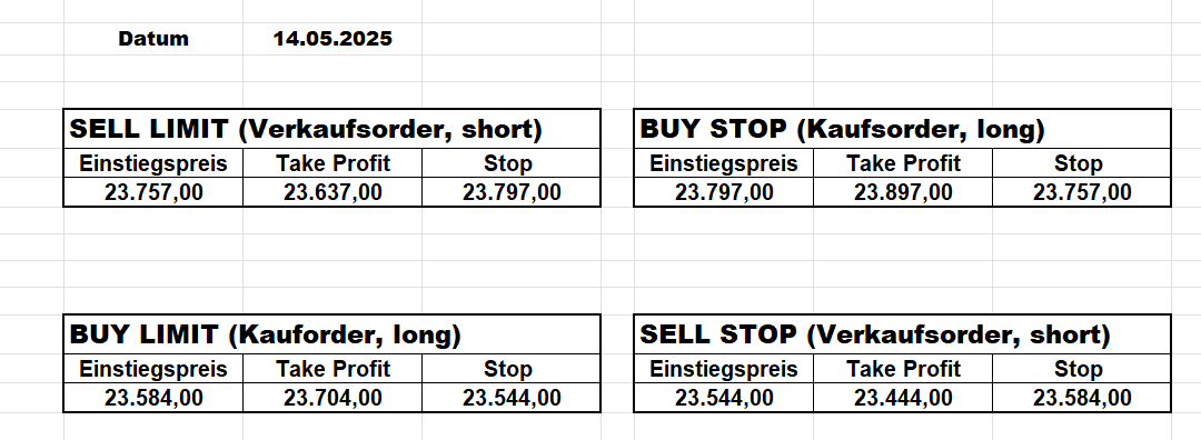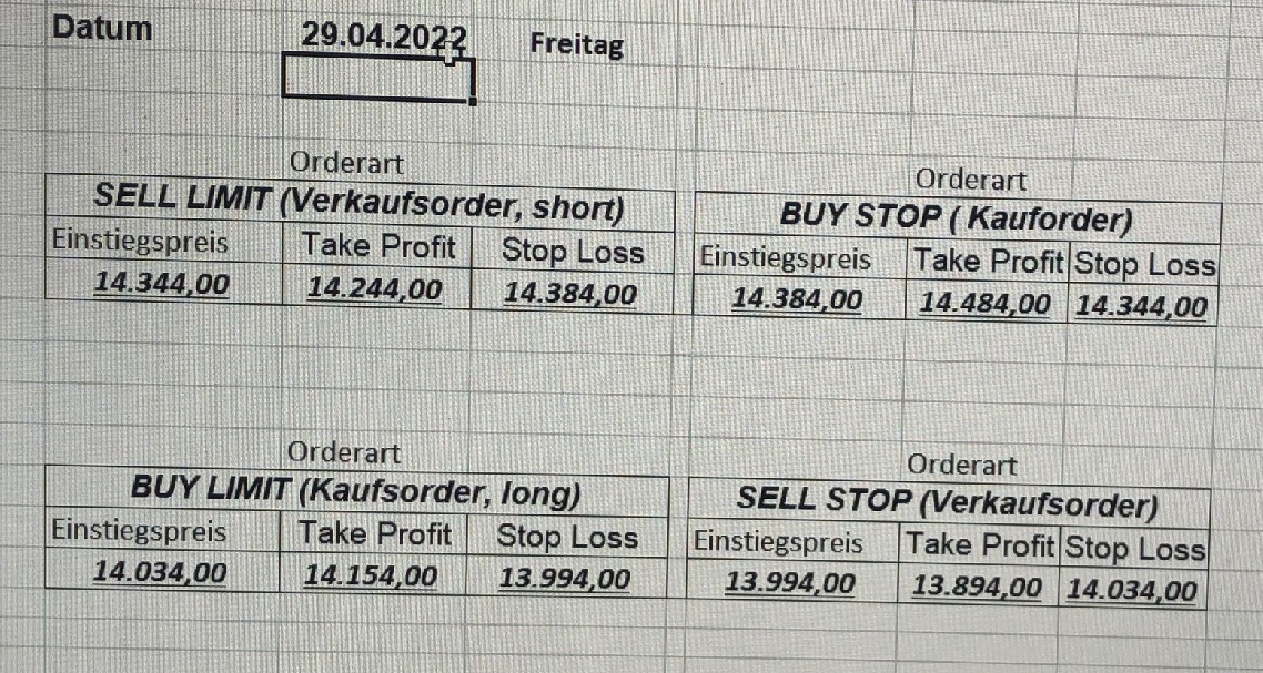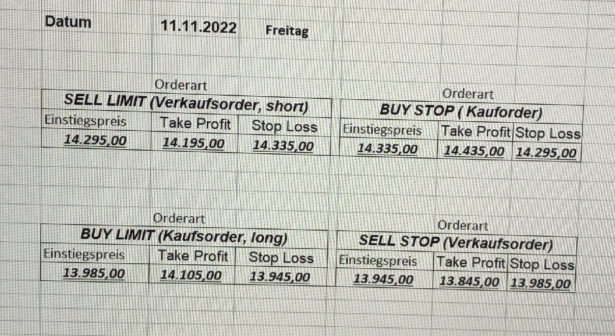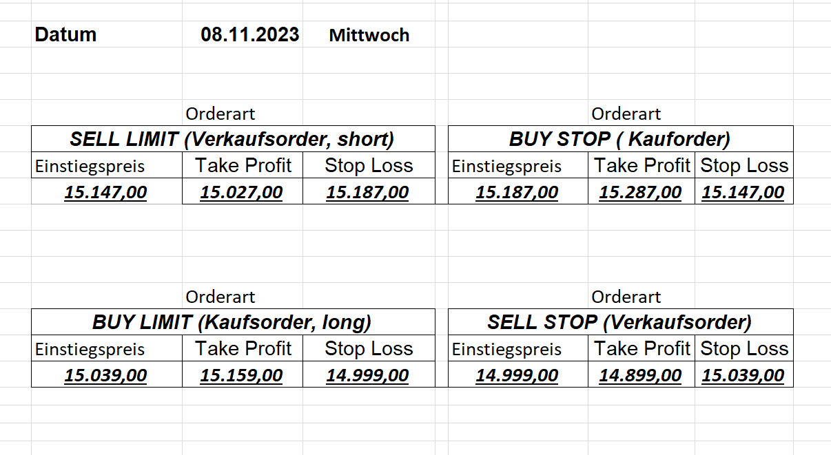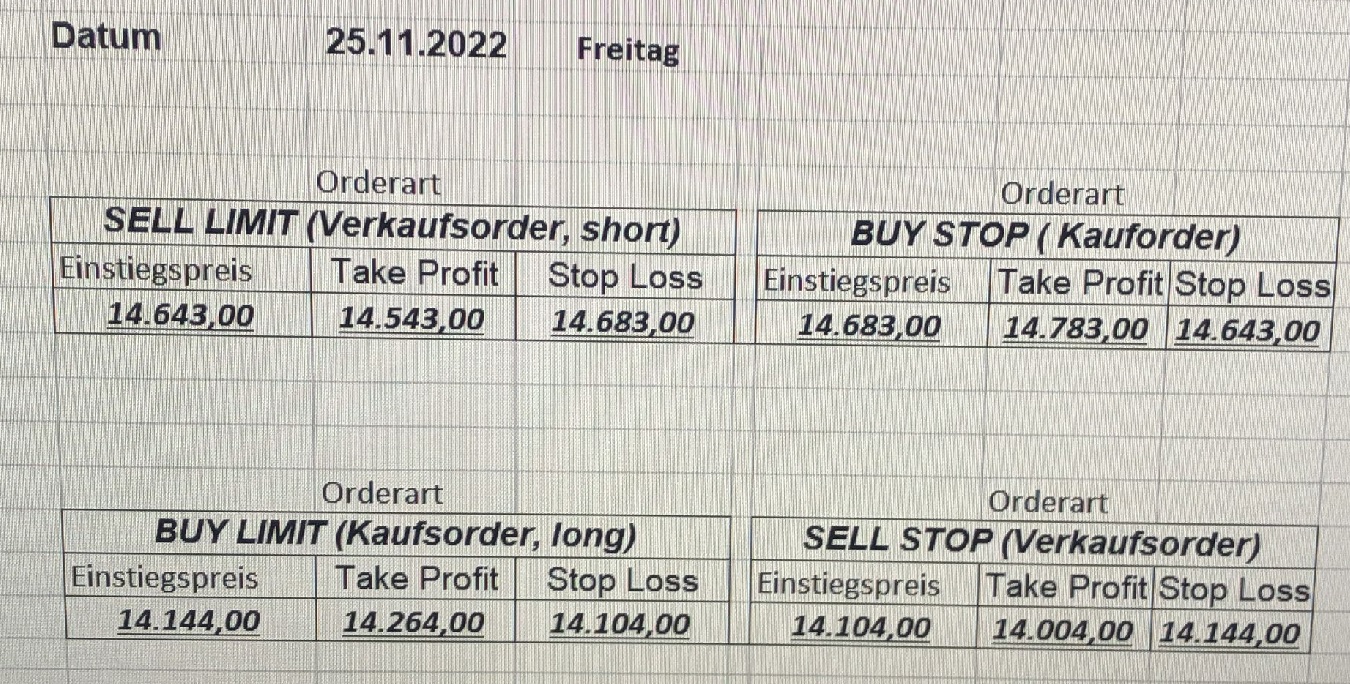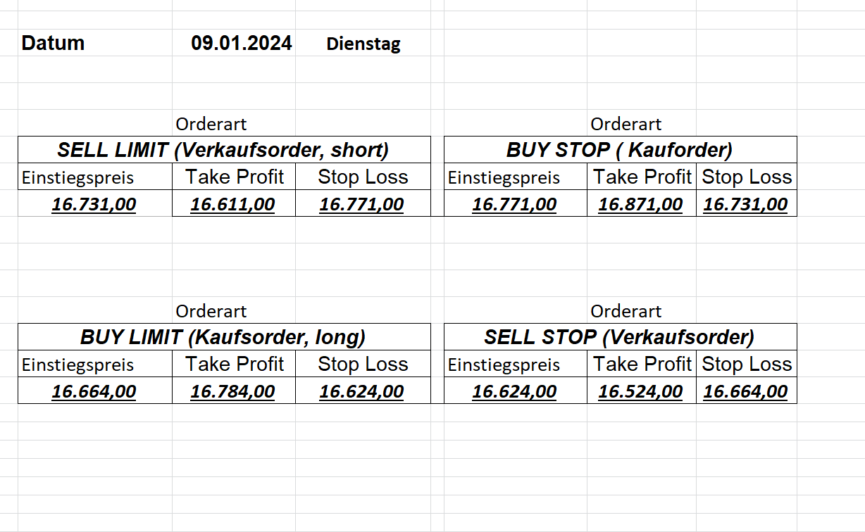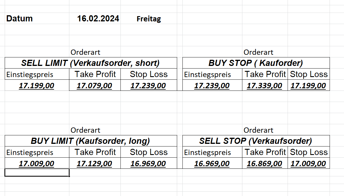 16.5.2023 Platzieren Sie die  Order bis 9:00 Löschen Sie bitte offene Order und Positionen um 21:45 ! Zur Frage der Punktgröße: Beispielrechnung: Bitte immer kurz auf den am weitest entfernten Stopp schauen. Diese Punktzahl sollte nicht mehr als 0,5% bis 1% des Kapitals ausmachen. 15.5.2023 Platzieren Sie die  Order bis 9:00 Löschen Sie bitte offene Order und Positionen um 21:45 ! Zur Frage der Punktgröße: Beispielrechnung: Bitte immer kurz auf den am weitest entfernten Stopp schauen. Diese Punktzahl sollte nicht mehr als 0,5% bis 1% des Kapitals ausmachen. 12.5.2023 Platzieren Sie die  Order bis 9:00 Löschen Sie bitte offene Order und Positionen um 21:45 ! Zur Frage der Punktgröße: Beispielrechnung: Bitte immer kurz auf den am weitest entfernten Stopp schauen. Diese Punktzahl sollte nicht mehr als 0,5% bis 1% des Kapitals ausmachen. 10.5.2023  Platzieren Sie die  Order bis 9:00 Löschen Sie bitte offene Order und Positionen um 21:45 ! Zur Frage der Punktgröße: Beispielrechnung: Bitte immer kurz auf den am weitest entfernten Stopp schauen. Diese Punktzahl sollte nicht mehr als 0,5% bis 1% des Kapitals ausmachen. 9.5.2023 Platzieren Sie die  Order bis 9:00 Löschen Sie bitte offene Order und Positionen um 21:45 ! Zur Frage der Punktgröße: Beispielrechnung: Bitte immer kurz auf den am weitest entfernten Stopp schauen. Diese Punktzahl sollte nicht mehr als 0,5% bis 1% des Kapitals ausmachen.   8.5.2023 Platzieren Sie die  Order bis 9:00 Löschen Sie bitte offene Order und Positionen um 21:45 ! Zur Frage der Punktgröße: Beispielrechnung: Bitte immer kurz auf den am weitest entfernten Stopp schauen. Diese Punktzahl sollte nicht mehr als 0,5% bis 1% des Kapitals ausmachen. 5.5.2023 Platzieren Sie die  Order bis 9:00 Löschen Sie bitte offene Order und Positionen um 21:45 ! Zur Frage der Punktgröße: Beispielrechnung: Bitte immer kurz auf den am weitest entfernten Stopp schauen. Diese Punktzahl sollte nicht mehr als 0,5% bis 1% des Kapitals ausmachen. 4.5.2023 Platzieren Sie die  Order bis 9:00 Löschen Sie bitte offene Order und Positionen um 21:45 ! Zur Frage der Punktgröße: Beispielrechnung: Bitte immer kurz auf den am weitest entfernten Stopp schauen. Diese Punktzahl sollte nicht mehr als 0,5% bis 1% des Kapitals ausmachen. 3.5.2023 Heute abend FED-Sitzung: Wir bleiben heute aus dem Markt! 2.5.2023 Platzieren Sie die  Order bis 9:00 Löschen Sie bitte offene Order und Positionen um 21:45 ! Zur Frage der Punktgröße: Beispielrechnung: Bitte immer kurz auf den am weitest entfernten Stopp schauen. Diese Punktzahl sollte nicht mehr als 0,5% bis 1% des Kapitals ausmachen. 28.4.2023 Platzieren Sie die  Order bis 9:00 Löschen Sie bitte offene Order und Positionen um 21:45 ! Zur Frage der Punktgröße: Beispielrechnung: Bitte immer kurz auf den am weitest entfernten Stopp schauen. Diese Punktzahl sollte nicht mehr als 0,5% bis 1% des Kapitals ausmachen. 27.4.2023 Platzieren Sie die  Order bis 9:00 Löschen Sie bitte offene Order und Positionen um 21:45 ! Zur Frage der Punktgröße: Beispielrechnung: Bitte immer kurz auf den am weitest entfernten Stopp schauen. Diese Punktzahl sollte nicht mehr als 0,5% bis 1% des Kapitals ausmachen. 26.4.2023 Platzieren Sie die  Order bis 9:00 Löschen Sie bitte offene Order und Positionen um 21:45 ! Zur Frage der Punktgröße: Beispielrechnung: Bitte immer kurz auf den am weitest entfernten Stopp schauen. Diese Punktzahl sollte nicht mehr als 0,5% bis 1% des Kapitals ausmachen. 25.4.2023 Platzieren Sie die  Order bis 9:00 Löschen Sie bitte offene Order und Positionen um 21:45 ! Zur Frage der Punktgröße: Beispielrechnung: Bitte immer kurz auf den am weitest entfernten Stopp schauen. Diese Punktzahl sollte nicht mehr als 0,5% bis 1% des Kapitals ausmachen. 24.4.2023 Platzieren Sie die  Order bis 9:00 Löschen Sie bitte offene Order und Positionen um 21:45 ! Zur Frage der Punktgröße: Beispielrechnung: Bitte immer kurz auf den am weitest entfernten Stopp schauen. Diese Punktzahl sollte nicht mehr als 0,5% bis 1% des Kapitals ausmachen. 21.4.2023 Platzieren Sie die  Order bis 9:00 Löschen Sie bitte offene Order und Positionen um 21:45 ! Zur Frage der Punktgröße: Beispielrechnung: Bitte immer kurz auf den am weitest entfernten Stopp schauen. Diese Punktzahl sollte nicht mehr als 0,5% bis 1% des Kapitals ausmachen. Sorry, falscher Wochentag, aber es sind die heutigen Signale!    20.4.2023 Platzieren Sie die  Order bis 9:00 Löschen Sie bitte offene Order und Positionen um 21:45 ! Zur Frage der Punktgröße: Beispielrechnung: Bitte immer kurz auf den am weitest entfernten Stopp schauen. Diese Punktzahl sollte nicht mehr als 0,5% bis 1% des Kapitals ausmachen. 19.4.2023 Platzieren Sie die  Order bis 9:00 Löschen Sie bitte offene Order und Positionen um 21:45 ! Zur Frage der Punktgröße: Beispielrechnung: Bitte immer kurz auf den am weitest entfernten Stopp schauen. Diese Punktzahl sollte nicht mehr als 0,5% bis 1% des Kapitals ausmachen. 18.4.2023 Platzieren Sie die  Order bis 9:00 Löschen Sie bitte offene Order und Positionen um 21:45 ! Zur Frage der Punktgröße: Beispielrechnung: Bitte immer kurz auf den am weitest entfernten Stopp schauen. Diese Punktzahl sollte nicht mehr als 0,5% bis 1% des Kapitals ausmachen.  17.4.2023 Platzieren Sie die  Order bis 9:00 Löschen Sie bitte offene Order und Positionen um 21:45 ! Zur Frage der Punktgröße: Beispielrechnung: Bitte immer kurz auf den am weitest entfernten Stopp schauen. Diese Punktzahl sollte nicht mehr als 0,5% bis 1% des Kapitals ausmachen. 14.4.2023 Platzieren Sie die  Order bis 9:00 Löschen Sie bitte offene Order und Positionen um 21:45 ! Zur Frage der Punktgröße: Beispielrechnung: Bitte immer kurz auf den am weitest entfernten Stopp schauen. Diese Punktzahl sollte nicht mehr als 0,5% bis 1% des Kapitals ausmachen. 13.4.2023 Heute bleiben wir an der Seitenlinie. Aktuell ist der DAX nicht volatil genug!  12.4.2023 Pla