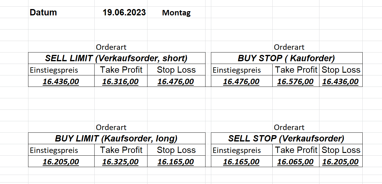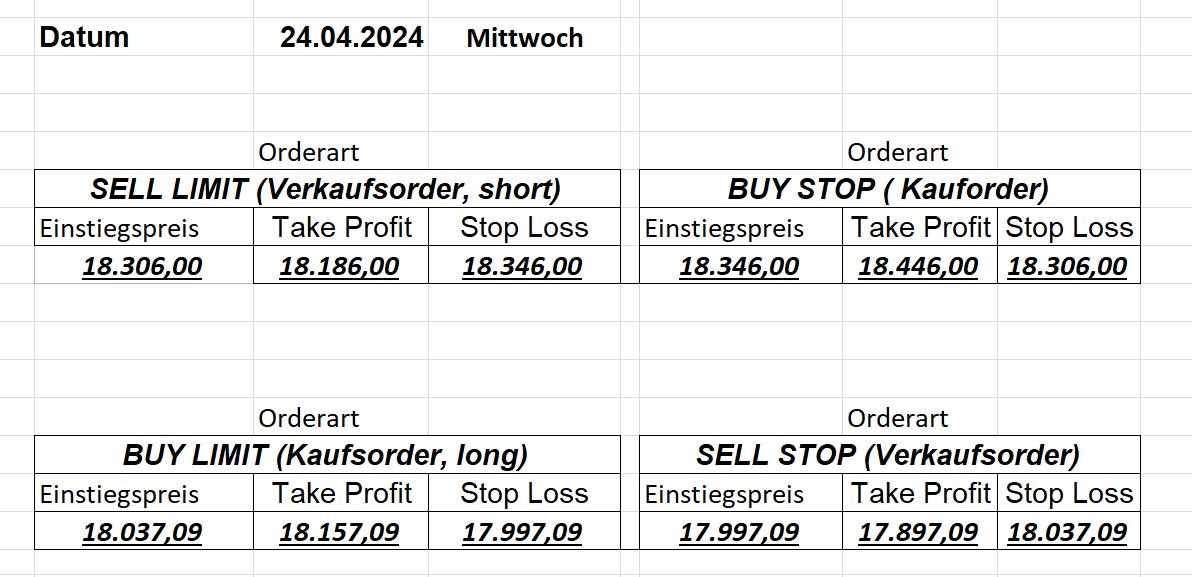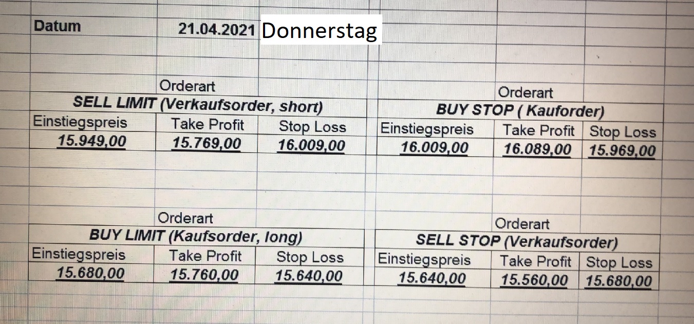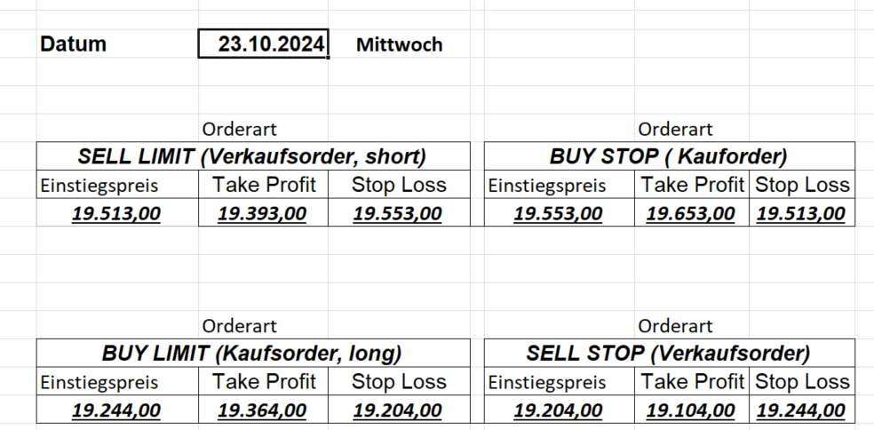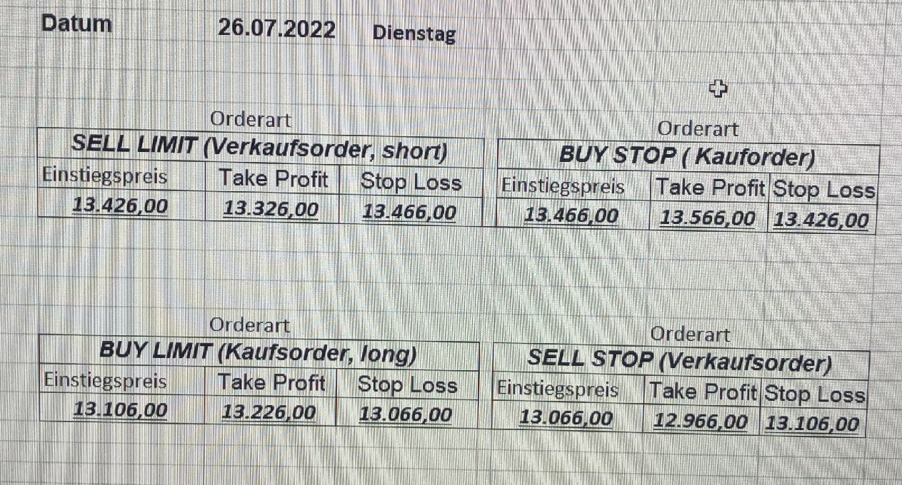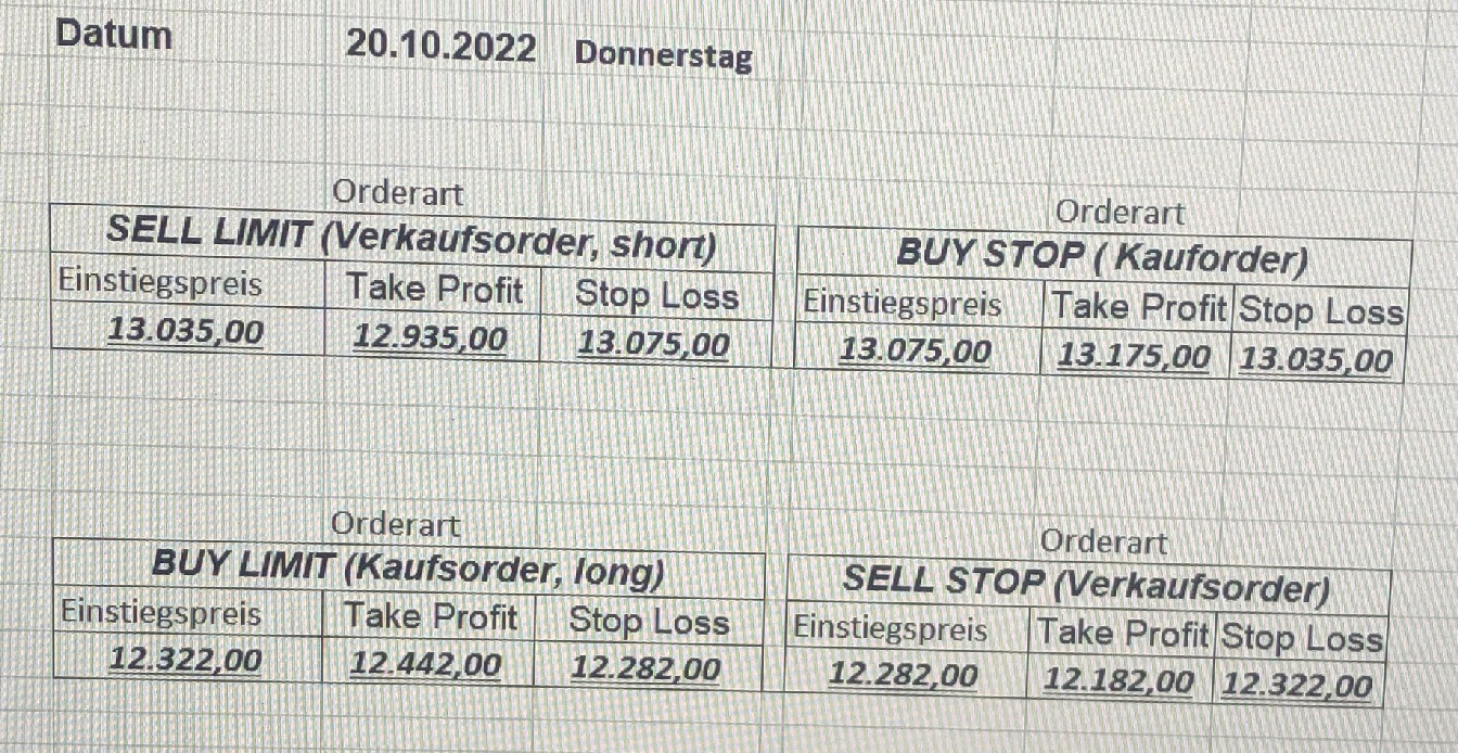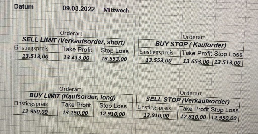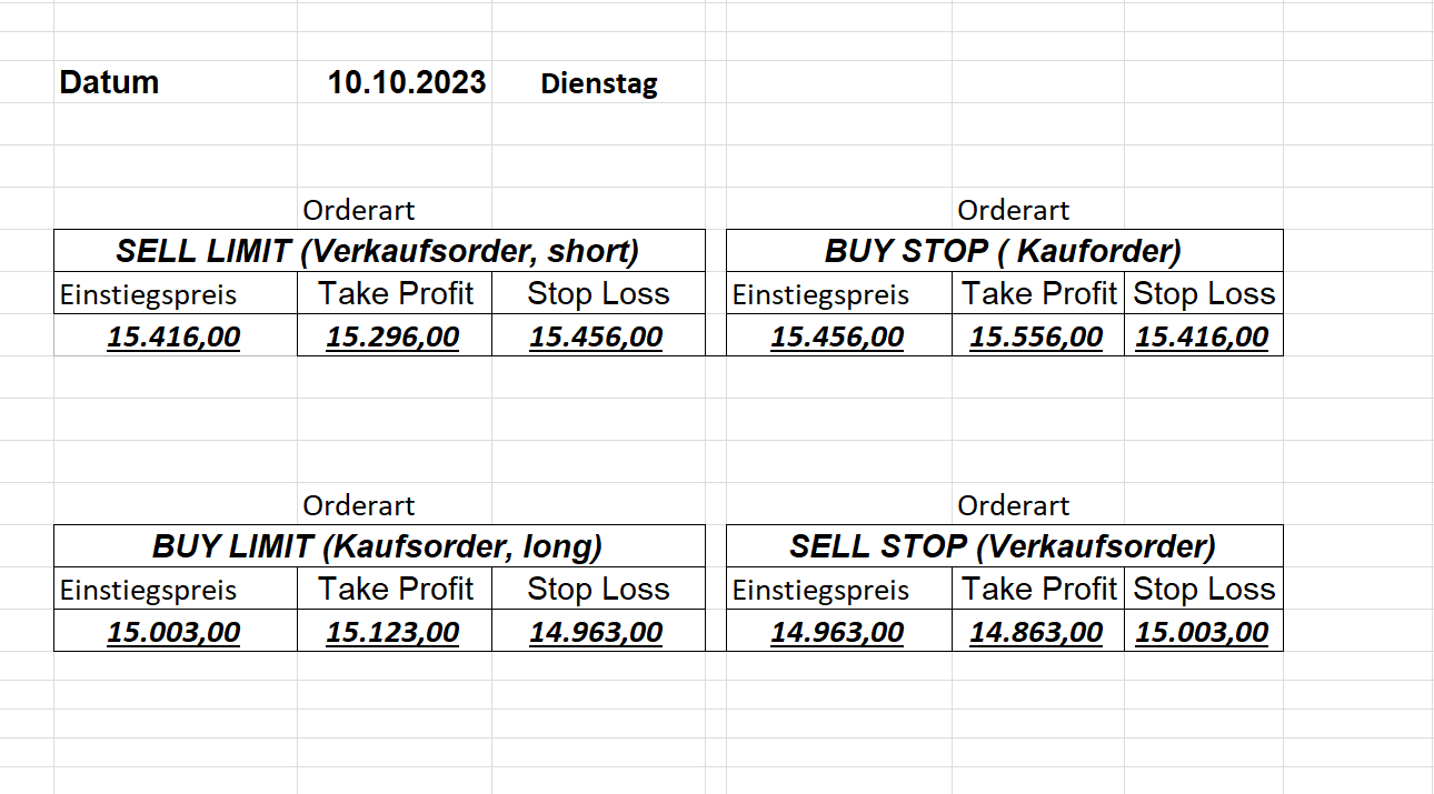 16.5.2023 Platzieren Sie die  Order bis 9:00 Löschen Sie bitte offene Order und Positionen um 21:45 ! Zur Frage der Punktgröße: Beispielrechnung: Bitte immer kurz auf den am weitest entfernten Stopp schauen. Diese Punktzahl sollte nicht mehr als 0,5% bis 1% des Kapitals ausmachen. 15.5.2023 Platzieren Sie die  Order bis 9:00 Löschen Sie bitte offene Order und Positionen um 21:45 ! Zur Frage der Punktgröße: Beispielrechnung: Bitte immer kurz auf den am weitest entfernten Stopp schauen. Diese Punktzahl sollte nicht mehr als 0,5% bis 1% des Kapitals ausmachen. 12.5.2023 Platzieren Sie die  Order bis 9:00 Löschen Sie bitte offene Order und Positionen um 21:45 ! Zur Frage der Punktgröße: Beispielrechnung: Bitte immer kurz auf den am weitest entfernten Stopp schauen. Diese Punktzahl sollte nicht mehr als 0,5% bis 1% des Kapitals ausmachen. 10.5.2023  Platzieren Sie die  Order bis 9:00 Löschen Sie bitte offene Order und Positionen um 21:45 ! Zur Frage der Punktgröße: Beispielrechnung: Bitte immer kurz auf den am weitest entfernten Stopp schauen. Diese Punktzahl sollte nicht mehr als 0,5% bis 1% des Kapitals ausmachen. 9.5.2023 Platzieren Sie die  Order bis 9:00 Löschen Sie bitte offene Order und Positionen um 21:45 ! Zur Frage der Punktgröße: Beispielrechnung: Bitte immer kurz auf den am weitest entfernten Stopp schauen. Diese Punktzahl sollte nicht mehr als 0,5% bis 1% des Kapitals ausmachen.   8.5.2023 Platzieren Sie die  Order bis 9:00 Löschen Sie bitte offene Order und Positionen um 21:45 ! Zur Frage der Punktgröße: Beispielrechnung: Bitte immer kurz auf den am weitest entfernten Stopp schauen. Diese Punktzahl sollte nicht mehr als 0,5% bis 1% des Kapitals ausmachen. 5.5.2023 Platzieren Sie die  Order bis 9:00 Löschen Sie bitte offene Order und Positionen um 21:45 ! Zur Frage der Punktgröße: Beispielrechnung: Bitte immer kurz auf den am weitest entfernten Stopp schauen. Diese Punktzahl sollte nicht mehr als 0,5% bis 1% des Kapitals ausmachen. 4.5.2023 Platzieren Sie die  Order bis 9:00 Löschen Sie bitte offene Order und Positionen um 21:45 ! Zur Frage der Punktgröße: Beispielrechnung: Bitte immer kurz auf den am weitest entfernten Stopp schauen. Diese Punktzahl sollte nicht mehr als 0,5% bis 1% des Kapitals ausmachen. 3.5.2023 Heute abend FED-Sitzung: Wir bleiben heute aus dem Markt! 2.5.2023 Platzieren Sie die  Order bis 9:00 Löschen Sie bitte offene Order und Positionen um 21:45 ! Zur Frage der Punktgröße: Beispielrechnung: Bitte immer kurz auf den am weitest entfernten Stopp schauen. Diese Punktzahl sollte nicht mehr als 0,5% bis 1% des Kapitals ausmachen. 28.4.2023 Platzieren Sie die  Order bis 9:00 Löschen Sie bitte offene Order und Positionen um 21:45 ! Zur Frage der Punktgröße: Beispielrechnung: Bitte immer kurz auf den am weitest entfernten Stopp schauen. Diese Punktzahl sollte nicht mehr als 0,5% bis 1% des Kapitals ausmachen. 27.4.2023 Platzieren Sie die  Order bis 9:00 Löschen Sie bitte offene Order und Positionen um 21:45 ! Zur Frage der Punktgröße: Beispielrechnung: Bitte immer kurz auf den am weitest entfernten Stopp schauen. Diese Punktzahl sollte nicht mehr als 0,5% bis 1% des Kapitals ausmachen. 26.4.2023 Platzieren Sie die  Order bis 9:00 Löschen Sie bitte offene Order und Positionen um 21:45 ! Zur Frage der Punktgröße: Beispielrechnung: Bitte immer kurz auf den am weitest entfernten Stopp schauen. Diese Punktzahl sollte nicht mehr als 0,5% bis 1% des Kapitals ausmachen. 25.4.2023 Platzieren Sie die  Order bis 9:00 Löschen Sie bitte offene Order und Positionen um 21:45 ! Zur Frage der Punktgröße: Beispielrechnung: Bitte immer kurz auf den am weitest entfernten Stopp schauen. Diese Punktzahl sollte nicht mehr als 0,5% bis 1% des Kapitals ausmachen. 24.4.2023 Platzieren Sie die  Order bis 9:00 Löschen Sie bitte offene Order und Positionen um 21:45 ! Zur Frage der Punktgröße: Beispielrechnung: Bitte immer kurz auf den am weitest entfernten Stopp schauen. Diese Punktzahl sollte nicht mehr als 0,5% bis 1% des Kapitals ausmachen. 21.4.2023 Platzieren Sie die  Order bis 9:00 Löschen Sie bitte offene Order und Positionen um 21:45 ! Zur Frage der Punktgröße: Beispielrechnung: Bitte immer kurz auf den am weitest entfernten Stopp schauen. Diese Punktzahl sollte nicht mehr als 0,5% bis 1% des Kapitals ausmachen. Sorry, falscher Wochentag, aber es sind die heutigen Signale!    20.4.2023 Platzieren Sie die  Order bis 9:00 Löschen Sie bitte offene Order und Positionen um 21:45 ! Zur Frage der Punktgröße: Beispielrechnung: Bitte immer kurz auf den am weitest entfernten Stopp schauen. Diese Punktzahl sollte nicht mehr als 0,5% bis 1% des Kapitals ausmachen. 19.4.2023 Platzieren Sie die  Order bis 9:00 Löschen Sie bitte offene Order und Positionen um 21:45 ! Zur Frage der Punktgröße: Beispielrechnung: Bitte immer kurz auf den am weitest entfernten Stopp schauen. Diese Punktzahl sollte nicht mehr als 0,5% bis 1% des Kapitals ausmachen. 18.4.2023 Platzieren Sie die  Order bis 9:00 Löschen Sie bitte offene Order und Positionen um 21:45 ! Zur Frage der Punktgröße: Beispielrechnung: Bitte immer kurz auf den am weitest entfernten Stopp schauen. Diese Punktzahl sollte nicht mehr als 0,5% bis 1% des Kapitals ausmachen.  17.4.2023 Platzieren Sie die  Order bis 9:00 Löschen Sie bitte offene Order und Positionen um 21:45 ! Zur Frage der Punktgröße: Beispielrechnung: Bitte immer kurz auf den am weitest entfernten Stopp schauen. Diese Punktzahl sollte nicht mehr als 0,5% bis 1% des Kapitals ausmachen. 14.4.2023 Platzieren Sie die  Order bis 9:00 Löschen Sie bitte offene Order und Positionen um 21:45 ! Zur Frage der Punktgröße: Beispielrechnung: Bitte immer kurz auf den am weitest entfernten Stopp schauen. Diese Punktzahl sollte nicht mehr als 0,5% bis 1% des Kapitals ausmachen. 13.4.2023 Heute bleiben wir an der Seitenlinie. Aktuell ist der DAX nicht volatil genug!  12.4.2023 Pla