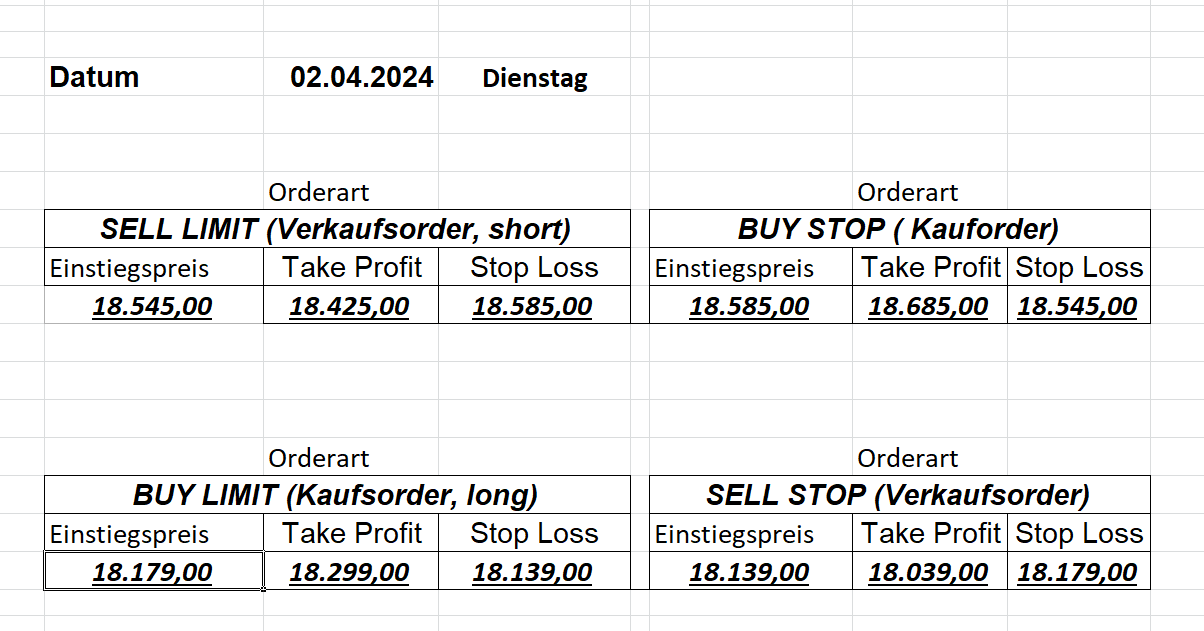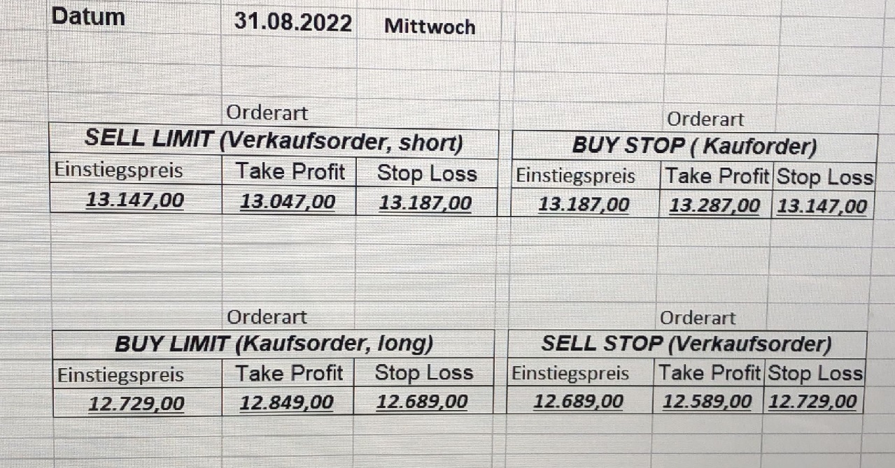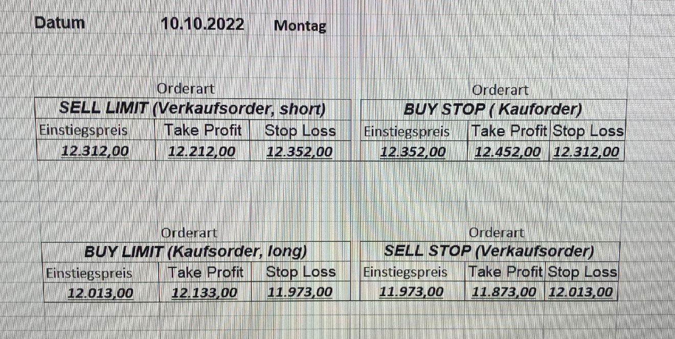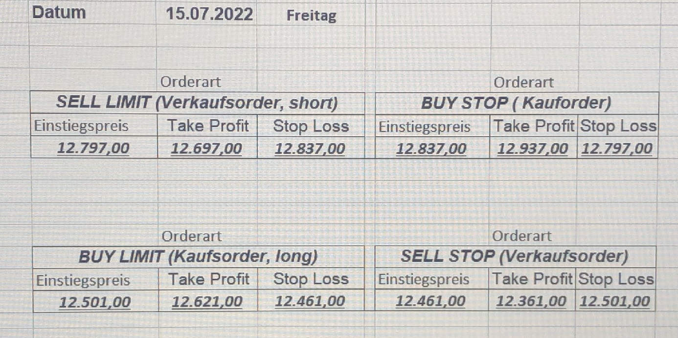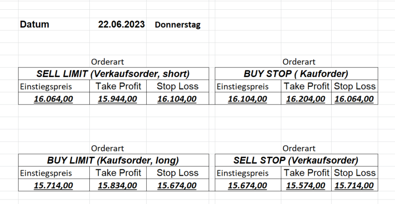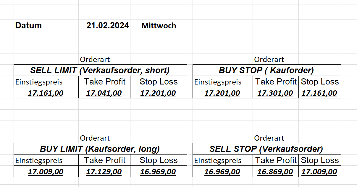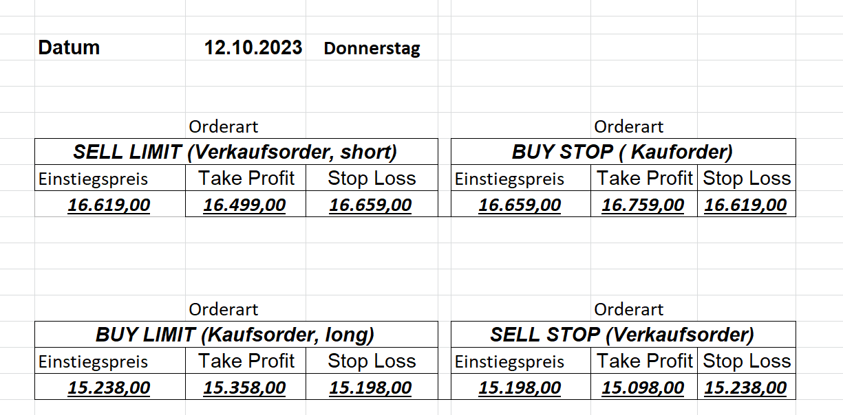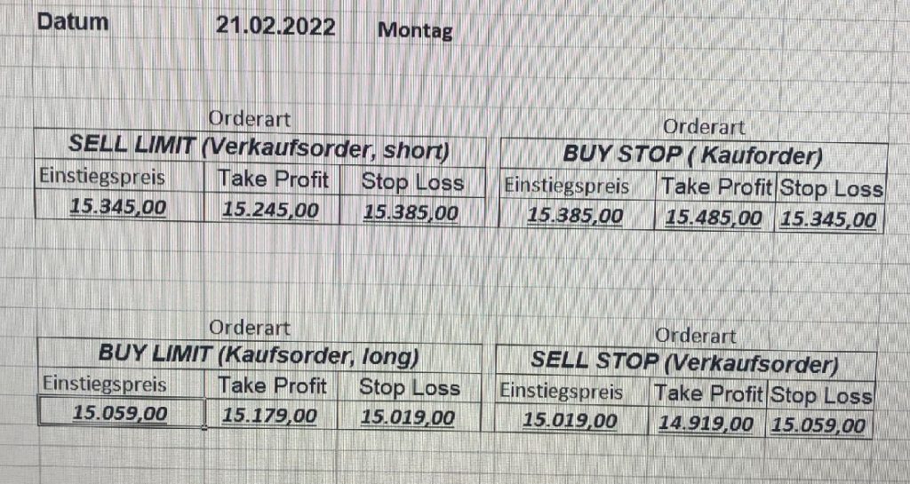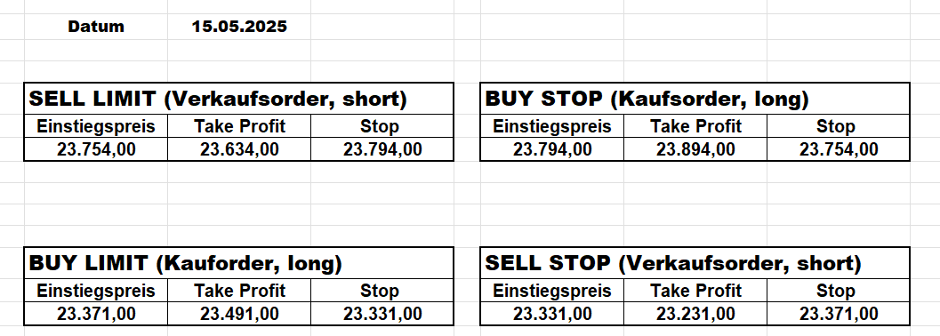 16.5.2023 Platzieren Sie die  Order bis 9:00 Löschen Sie bitte offene Order und Positionen um 21:45 ! Zur Frage der Punktgröße: Beispielrechnung: Bitte immer kurz auf den am weitest entfernten Stopp schauen. Diese Punktzahl sollte nicht mehr als 0,5% bis 1% des Kapitals ausmachen. 15.5.2023 Platzieren Sie die  Order bis 9:00 Löschen Sie bitte offene Order und Positionen um 21:45 ! Zur Frage der Punktgröße: Beispielrechnung: Bitte immer kurz auf den am weitest entfernten Stopp schauen. Diese Punktzahl sollte nicht mehr als 0,5% bis 1% des Kapitals ausmachen. 12.5.2023 Platzieren Sie die  Order bis 9:00 Löschen Sie bitte offene Order und Positionen um 21:45 ! Zur Frage der Punktgröße: Beispielrechnung: Bitte immer kurz auf den am weitest entfernten Stopp schauen. Diese Punktzahl sollte nicht mehr als 0,5% bis 1% des Kapitals ausmachen. 10.5.2023  Platzieren Sie die  Order bis 9:00 Löschen Sie bitte offene Order und Positionen um 21:45 ! Zur Frage der Punktgröße: Beispielrechnung: Bitte immer kurz auf den am weitest entfernten Stopp schauen. Diese Punktzahl sollte nicht mehr als 0,5% bis 1% des Kapitals ausmachen. 9.5.2023 Platzieren Sie die  Order bis 9:00 Löschen Sie bitte offene Order und Positionen um 21:45 ! Zur Frage der Punktgröße: Beispielrechnung: Bitte immer kurz auf den am weitest entfernten Stopp schauen. Diese Punktzahl sollte nicht mehr als 0,5% bis 1% des Kapitals ausmachen.   8.5.2023 Platzieren Sie die  Order bis 9:00 Löschen Sie bitte offene Order und Positionen um 21:45 ! Zur Frage der Punktgröße: Beispielrechnung: Bitte immer kurz auf den am weitest entfernten Stopp schauen. Diese Punktzahl sollte nicht mehr als 0,5% bis 1% des Kapitals ausmachen. 5.5.2023 Platzieren Sie die  Order bis 9:00 Löschen Sie bitte offene Order und Positionen um 21:45 ! Zur Frage der Punktgröße: Beispielrechnung: Bitte immer kurz auf den am weitest entfernten Stopp schauen. Diese Punktzahl sollte nicht mehr als 0,5% bis 1% des Kapitals ausmachen. 4.5.2023 Platzieren Sie die  Order bis 9:00 Löschen Sie bitte offene Order und Positionen um 21:45 ! Zur Frage der Punktgröße: Beispielrechnung: Bitte immer kurz auf den am weitest entfernten Stopp schauen. Diese Punktzahl sollte nicht mehr als 0,5% bis 1% des Kapitals ausmachen. 3.5.2023 Heute abend FED-Sitzung: Wir bleiben heute aus dem Markt! 2.5.2023 Platzieren Sie die  Order bis 9:00 Löschen Sie bitte offene Order und Positionen um 21:45 ! Zur Frage der Punktgröße: Beispielrechnung: Bitte immer kurz auf den am weitest entfernten Stopp schauen. Diese Punktzahl sollte nicht mehr als 0,5% bis 1% des Kapitals ausmachen. 28.4.2023 Platzieren Sie die  Order bis 9:00 Löschen Sie bitte offene Order und Positionen um 21:45 ! Zur Frage der Punktgröße: Beispielrechnung: Bitte immer kurz auf den am weitest entfernten Stopp schauen. Diese Punktzahl sollte nicht mehr als 0,5% bis 1% des Kapitals ausmachen. 27.4.2023 Platzieren Sie die  Order bis 9:00 Löschen Sie bitte offene Order und Positionen um 21:45 ! Zur Frage der Punktgröße: Beispielrechnung: Bitte immer kurz auf den am weitest entfernten Stopp schauen. Diese Punktzahl sollte nicht mehr als 0,5% bis 1% des Kapitals ausmachen. 26.4.2023 Platzieren Sie die  Order bis 9:00 Löschen Sie bitte offene Order und Positionen um 21:45 ! Zur Frage der Punktgröße: Beispielrechnung: Bitte immer kurz auf den am weitest entfernten Stopp schauen. Diese Punktzahl sollte nicht mehr als 0,5% bis 1% des Kapitals ausmachen. 25.4.2023 Platzieren Sie die  Order bis 9:00 Löschen Sie bitte offene Order und Positionen um 21:45 ! Zur Frage der Punktgröße: Beispielrechnung: Bitte immer kurz auf den am weitest entfernten Stopp schauen. Diese Punktzahl sollte nicht mehr als 0,5% bis 1% des Kapitals ausmachen. 24.4.2023 Platzieren Sie die  Order bis 9:00 Löschen Sie bitte offene Order und Positionen um 21:45 ! Zur Frage der Punktgröße: Beispielrechnung: Bitte immer kurz auf den am weitest entfernten Stopp schauen. Diese Punktzahl sollte nicht mehr als 0,5% bis 1% des Kapitals ausmachen. 21.4.2023 Platzieren Sie die  Order bis 9:00 Löschen Sie bitte offene Order und Positionen um 21:45 ! Zur Frage der Punktgröße: Beispielrechnung: Bitte immer kurz auf den am weitest entfernten Stopp schauen. Diese Punktzahl sollte nicht mehr als 0,5% bis 1% des Kapitals ausmachen. Sorry, falscher Wochentag, aber es sind die heutigen Signale!    20.4.2023 Platzieren Sie die  Order bis 9:00 Löschen Sie bitte offene Order und Positionen um 21:45 ! Zur Frage der Punktgröße: Beispielrechnung: Bitte immer kurz auf den am weitest entfernten Stopp schauen. Diese Punktzahl sollte nicht mehr als 0,5% bis 1% des Kapitals ausmachen. 19.4.2023 Platzieren Sie die  Order bis 9:00 Löschen Sie bitte offene Order und Positionen um 21:45 ! Zur Frage der Punktgröße: Beispielrechnung: Bitte immer kurz auf den am weitest entfernten Stopp schauen. Diese Punktzahl sollte nicht mehr als 0,5% bis 1% des Kapitals ausmachen. 18.4.2023 Platzieren Sie die  Order bis 9:00 Löschen Sie bitte offene Order und Positionen um 21:45 ! Zur Frage der Punktgröße: Beispielrechnung: Bitte immer kurz auf den am weitest entfernten Stopp schauen. Diese Punktzahl sollte nicht mehr als 0,5% bis 1% des Kapitals ausmachen.  17.4.2023 Platzieren Sie die  Order bis 9:00 Löschen Sie bitte offene Order und Positionen um 21:45 ! Zur Frage der Punktgröße: Beispielrechnung: Bitte immer kurz auf den am weitest entfernten Stopp schauen. Diese Punktzahl sollte nicht mehr als 0,5% bis 1% des Kapitals ausmachen. 14.4.2023 Platzieren Sie die  Order bis 9:00 Löschen Sie bitte offene Order und Positionen um 21:45 ! Zur Frage der Punktgröße: Beispielrechnung: Bitte immer kurz auf den am weitest entfernten Stopp schauen. Diese Punktzahl sollte nicht mehr als 0,5% bis 1% des Kapitals ausmachen. 13.4.2023 Heute bleiben wir an der Seitenlinie. Aktuell ist der DAX nicht volatil genug!  12.4.2023 Pla