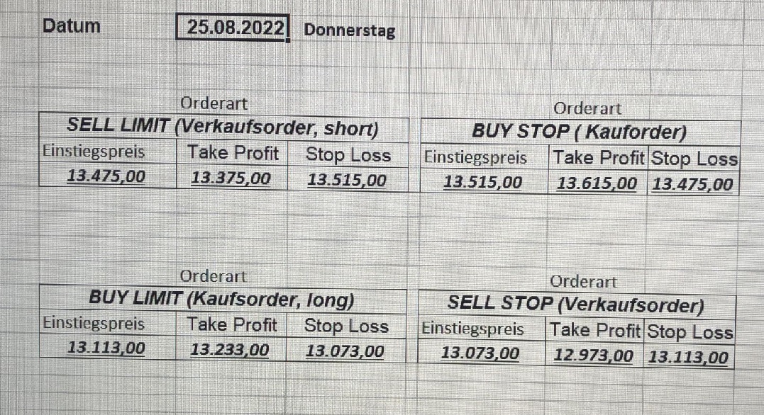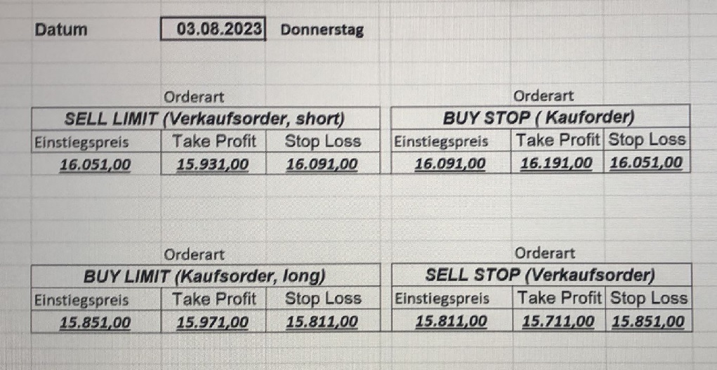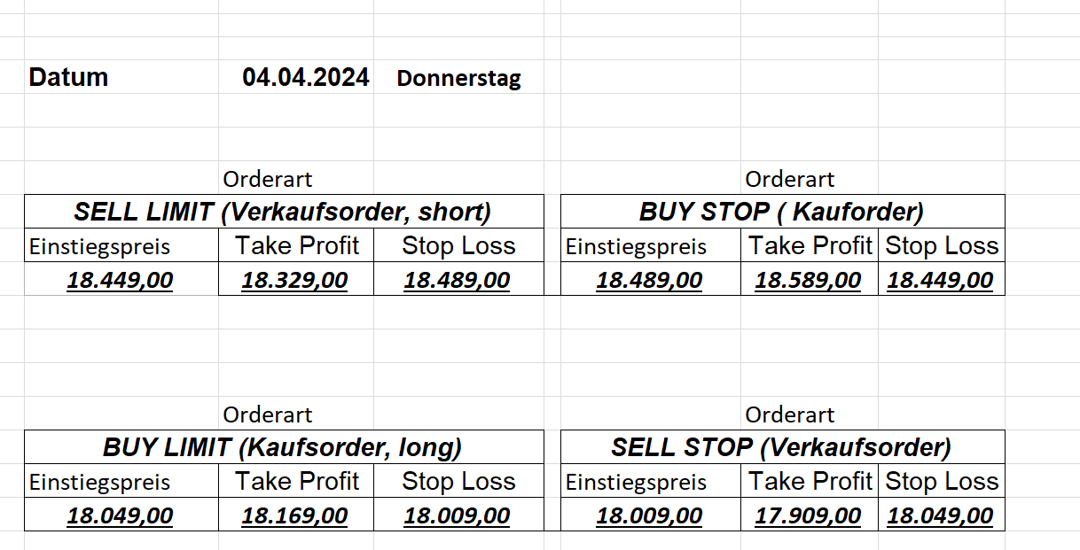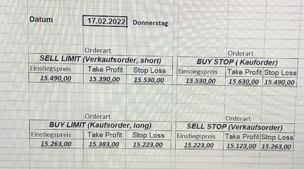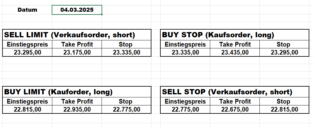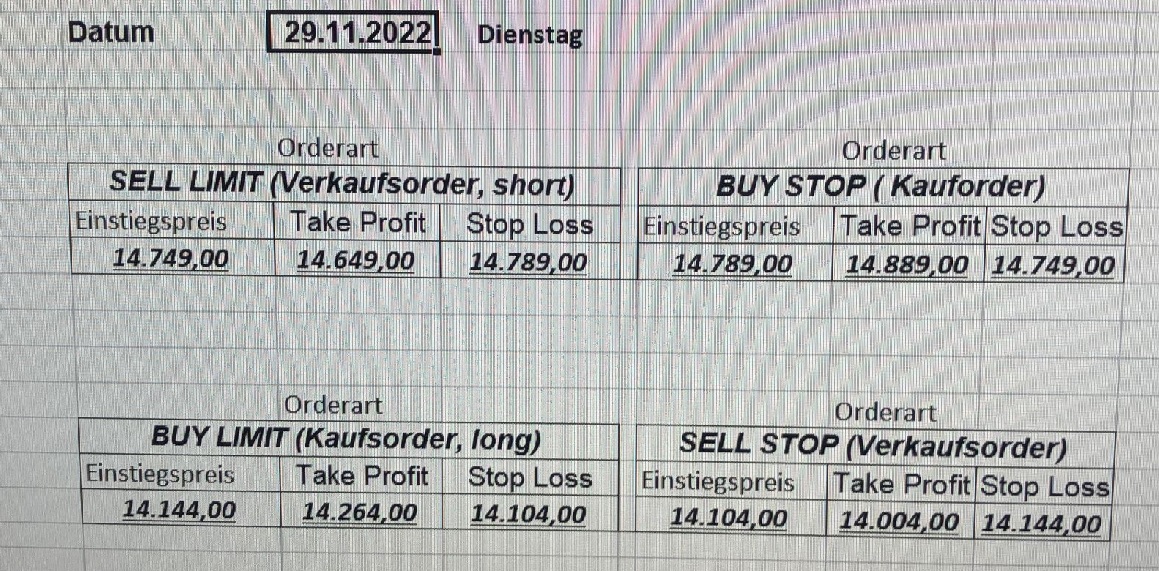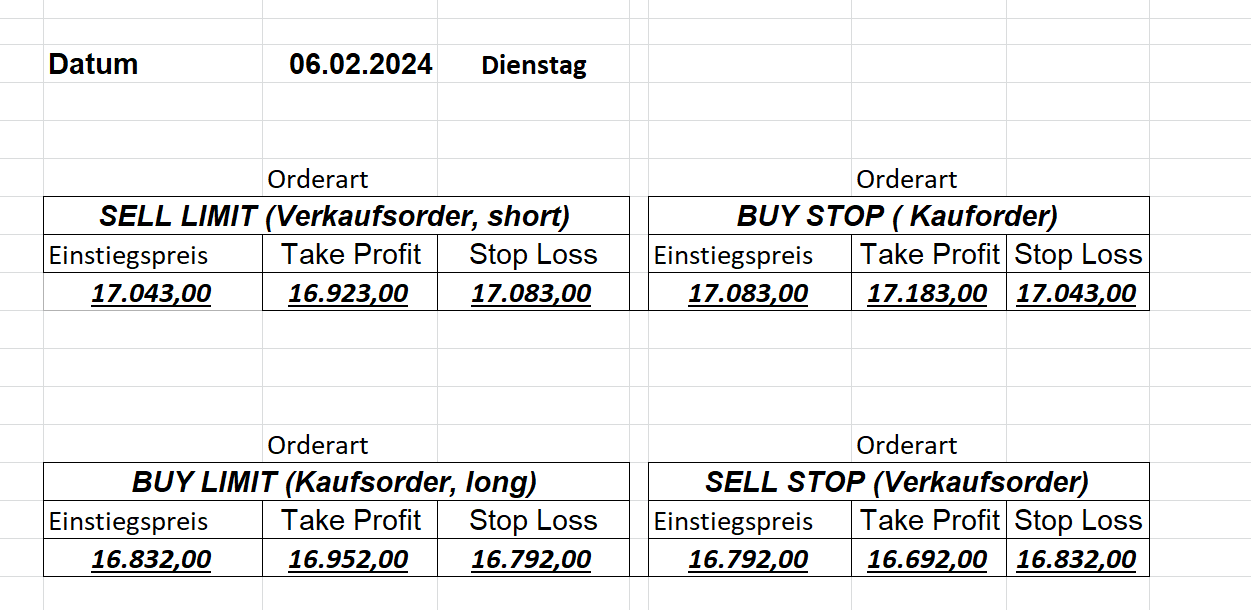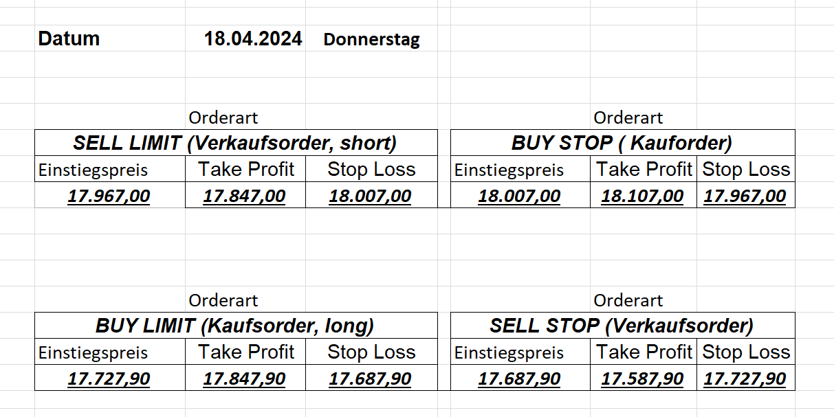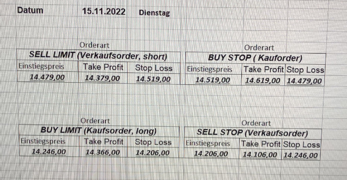 16.5.2023 Platzieren Sie die  Order bis 9:00 Löschen Sie bitte offene Order und Positionen um 21:45 ! Zur Frage der Punktgröße: Beispielrechnung: Bitte immer kurz auf den am weitest entfernten Stopp schauen. Diese Punktzahl sollte nicht mehr als 0,5% bis 1% des Kapitals ausmachen. 15.5.2023 Platzieren Sie die  Order bis 9:00 Löschen Sie bitte offene Order und Positionen um 21:45 ! Zur Frage der Punktgröße: Beispielrechnung: Bitte immer kurz auf den am weitest entfernten Stopp schauen. Diese Punktzahl sollte nicht mehr als 0,5% bis 1% des Kapitals ausmachen. 12.5.2023 Platzieren Sie die  Order bis 9:00 Löschen Sie bitte offene Order und Positionen um 21:45 ! Zur Frage der Punktgröße: Beispielrechnung: Bitte immer kurz auf den am weitest entfernten Stopp schauen. Diese Punktzahl sollte nicht mehr als 0,5% bis 1% des Kapitals ausmachen. 10.5.2023  Platzieren Sie die  Order bis 9:00 Löschen Sie bitte offene Order und Positionen um 21:45 ! Zur Frage der Punktgröße: Beispielrechnung: Bitte immer kurz auf den am weitest entfernten Stopp schauen. Diese Punktzahl sollte nicht mehr als 0,5% bis 1% des Kapitals ausmachen. 9.5.2023 Platzieren Sie die  Order bis 9:00 Löschen Sie bitte offene Order und Positionen um 21:45 ! Zur Frage der Punktgröße: Beispielrechnung: Bitte immer kurz auf den am weitest entfernten Stopp schauen. Diese Punktzahl sollte nicht mehr als 0,5% bis 1% des Kapitals ausmachen.   8.5.2023 Platzieren Sie die  Order bis 9:00 Löschen Sie bitte offene Order und Positionen um 21:45 ! Zur Frage der Punktgröße: Beispielrechnung: Bitte immer kurz auf den am weitest entfernten Stopp schauen. Diese Punktzahl sollte nicht mehr als 0,5% bis 1% des Kapitals ausmachen. 5.5.2023 Platzieren Sie die  Order bis 9:00 Löschen Sie bitte offene Order und Positionen um 21:45 ! Zur Frage der Punktgröße: Beispielrechnung: Bitte immer kurz auf den am weitest entfernten Stopp schauen. Diese Punktzahl sollte nicht mehr als 0,5% bis 1% des Kapitals ausmachen. 4.5.2023 Platzieren Sie die  Order bis 9:00 Löschen Sie bitte offene Order und Positionen um 21:45 ! Zur Frage der Punktgröße: Beispielrechnung: Bitte immer kurz auf den am weitest entfernten Stopp schauen. Diese Punktzahl sollte nicht mehr als 0,5% bis 1% des Kapitals ausmachen. 3.5.2023 Heute abend FED-Sitzung: Wir bleiben heute aus dem Markt! 2.5.2023 Platzieren Sie die  Order bis 9:00 Löschen Sie bitte offene Order und Positionen um 21:45 ! Zur Frage der Punktgröße: Beispielrechnung: Bitte immer kurz auf den am weitest entfernten Stopp schauen. Diese Punktzahl sollte nicht mehr als 0,5% bis 1% des Kapitals ausmachen. 28.4.2023 Platzieren Sie die  Order bis 9:00 Löschen Sie bitte offene Order und Positionen um 21:45 ! Zur Frage der Punktgröße: Beispielrechnung: Bitte immer kurz auf den am weitest entfernten Stopp schauen. Diese Punktzahl sollte nicht mehr als 0,5% bis 1% des Kapitals ausmachen. 27.4.2023 Platzieren Sie die  Order bis 9:00 Löschen Sie bitte offene Order und Positionen um 21:45 ! Zur Frage der Punktgröße: Beispielrechnung: Bitte immer kurz auf den am weitest entfernten Stopp schauen. Diese Punktzahl sollte nicht mehr als 0,5% bis 1% des Kapitals ausmachen. 26.4.2023 Platzieren Sie die  Order bis 9:00 Löschen Sie bitte offene Order und Positionen um 21:45 ! Zur Frage der Punktgröße: Beispielrechnung: Bitte immer kurz auf den am weitest entfernten Stopp schauen. Diese Punktzahl sollte nicht mehr als 0,5% bis 1% des Kapitals ausmachen. 25.4.2023 Platzieren Sie die  Order bis 9:00 Löschen Sie bitte offene Order und Positionen um 21:45 ! Zur Frage der Punktgröße: Beispielrechnung: Bitte immer kurz auf den am weitest entfernten Stopp schauen. Diese Punktzahl sollte nicht mehr als 0,5% bis 1% des Kapitals ausmachen. 24.4.2023 Platzieren Sie die  Order bis 9:00 Löschen Sie bitte offene Order und Positionen um 21:45 ! Zur Frage der Punktgröße: Beispielrechnung: Bitte immer kurz auf den am weitest entfernten Stopp schauen. Diese Punktzahl sollte nicht mehr als 0,5% bis 1% des Kapitals ausmachen. 21.4.2023 Platzieren Sie die  Order bis 9:00 Löschen Sie bitte offene Order und Positionen um 21:45 ! Zur Frage der Punktgröße: Beispielrechnung: Bitte immer kurz auf den am weitest entfernten Stopp schauen. Diese Punktzahl sollte nicht mehr als 0,5% bis 1% des Kapitals ausmachen. Sorry, falscher Wochentag, aber es sind die heutigen Signale!    20.4.2023 Platzieren Sie die  Order bis 9:00 Löschen Sie bitte offene Order und Positionen um 21:45 ! Zur Frage der Punktgröße: Beispielrechnung: Bitte immer kurz auf den am weitest entfernten Stopp schauen. Diese Punktzahl sollte nicht mehr als 0,5% bis 1% des Kapitals ausmachen. 19.4.2023 Platzieren Sie die  Order bis 9:00 Löschen Sie bitte offene Order und Positionen um 21:45 ! Zur Frage der Punktgröße: Beispielrechnung: Bitte immer kurz auf den am weitest entfernten Stopp schauen. Diese Punktzahl sollte nicht mehr als 0,5% bis 1% des Kapitals ausmachen. 18.4.2023 Platzieren Sie die  Order bis 9:00 Löschen Sie bitte offene Order und Positionen um 21:45 ! Zur Frage der Punktgröße: Beispielrechnung: Bitte immer kurz auf den am weitest entfernten Stopp schauen. Diese Punktzahl sollte nicht mehr als 0,5% bis 1% des Kapitals ausmachen.  17.4.2023 Platzieren Sie die  Order bis 9:00 Löschen Sie bitte offene Order und Positionen um 21:45 ! Zur Frage der Punktgröße: Beispielrechnung: Bitte immer kurz auf den am weitest entfernten Stopp schauen. Diese Punktzahl sollte nicht mehr als 0,5% bis 1% des Kapitals ausmachen. 14.4.2023 Platzieren Sie die  Order bis 9:00 Löschen Sie bitte offene Order und Positionen um 21:45 ! Zur Frage der Punktgröße: Beispielrechnung: Bitte immer kurz auf den am weitest entfernten Stopp schauen. Diese Punktzahl sollte nicht mehr als 0,5% bis 1% des Kapitals ausmachen. 13.4.2023 Heute bleiben wir an der Seitenlinie. Aktuell ist der DAX nicht volatil genug!  12.4.2023 Pla