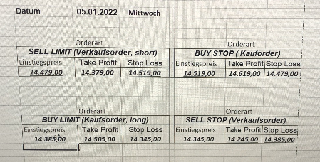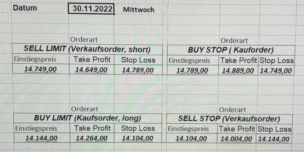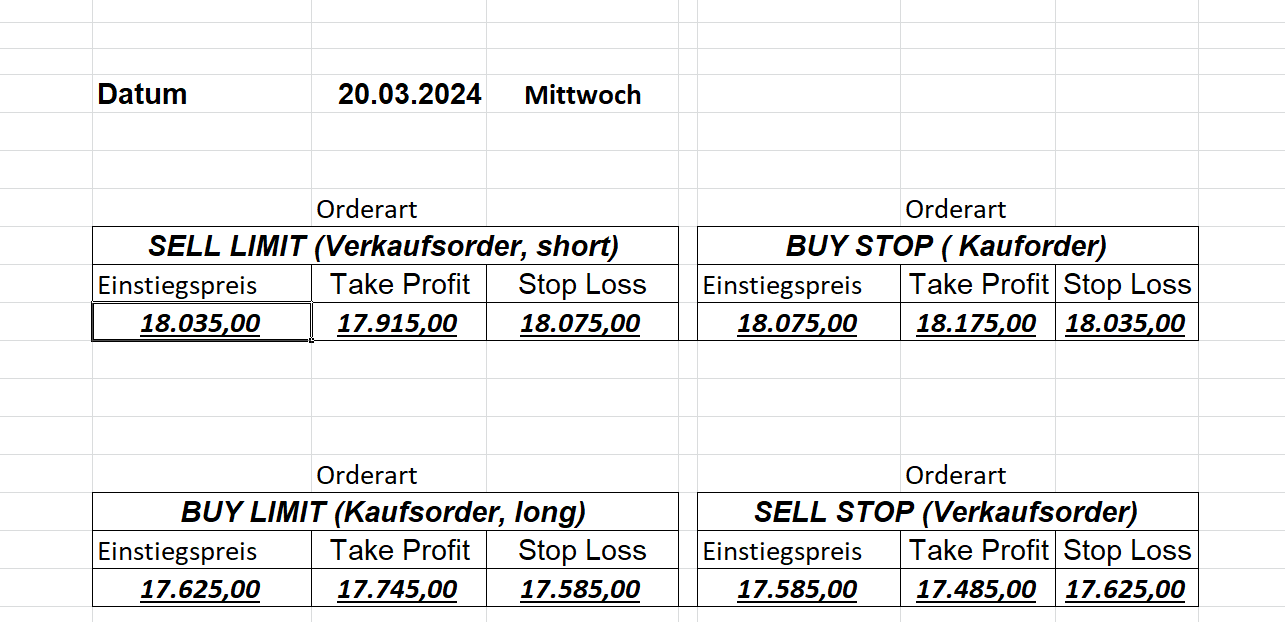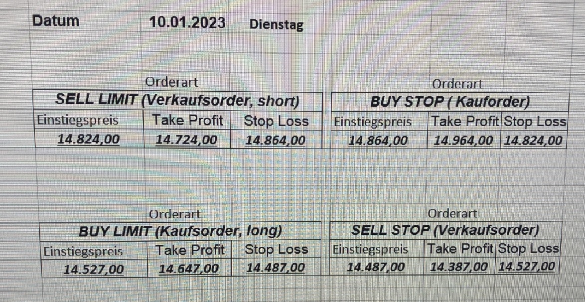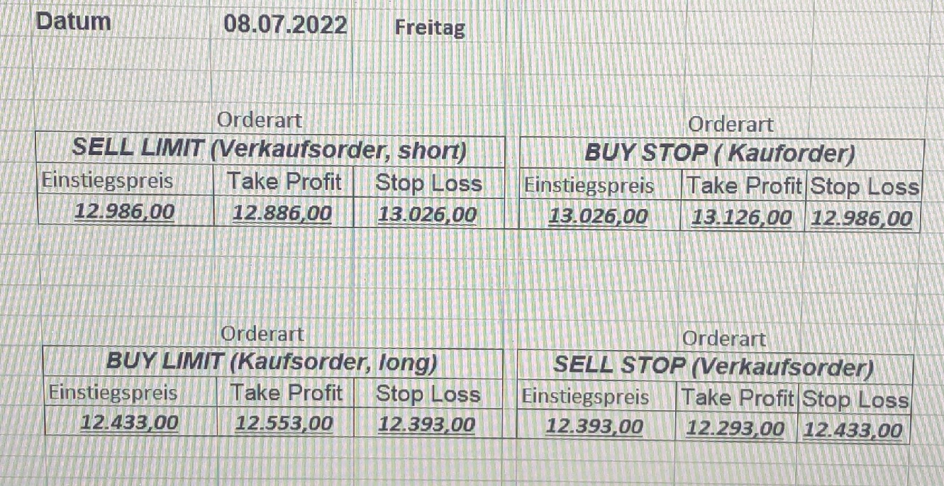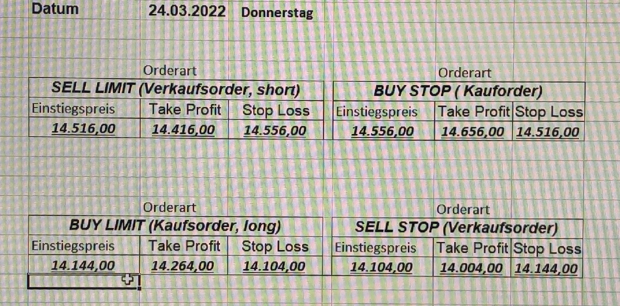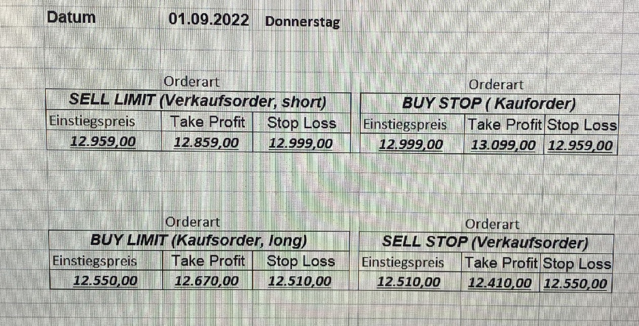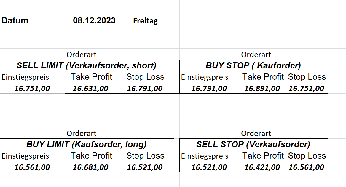 16.5.2023 Platzieren Sie die  Order bis 9:00 Löschen Sie bitte offene Order und Positionen um 21:45 ! Zur Frage der Punktgröße: Beispielrechnung: Bitte immer kurz auf den am weitest entfernten Stopp schauen. Diese Punktzahl sollte nicht mehr als 0,5% bis 1% des Kapitals ausmachen. 15.5.2023 Platzieren Sie die  Order bis 9:00 Löschen Sie bitte offene Order und Positionen um 21:45 ! Zur Frage der Punktgröße: Beispielrechnung: Bitte immer kurz auf den am weitest entfernten Stopp schauen. Diese Punktzahl sollte nicht mehr als 0,5% bis 1% des Kapitals ausmachen. 12.5.2023 Platzieren Sie die  Order bis 9:00 Löschen Sie bitte offene Order und Positionen um 21:45 ! Zur Frage der Punktgröße: Beispielrechnung: Bitte immer kurz auf den am weitest entfernten Stopp schauen. Diese Punktzahl sollte nicht mehr als 0,5% bis 1% des Kapitals ausmachen. 10.5.2023  Platzieren Sie die  Order bis 9:00 Löschen Sie bitte offene Order und Positionen um 21:45 ! Zur Frage der Punktgröße: Beispielrechnung: Bitte immer kurz auf den am weitest entfernten Stopp schauen. Diese Punktzahl sollte nicht mehr als 0,5% bis 1% des Kapitals ausmachen. 9.5.2023 Platzieren Sie die  Order bis 9:00 Löschen Sie bitte offene Order und Positionen um 21:45 ! Zur Frage der Punktgröße: Beispielrechnung: Bitte immer kurz auf den am weitest entfernten Stopp schauen. Diese Punktzahl sollte nicht mehr als 0,5% bis 1% des Kapitals ausmachen.   8.5.2023 Platzieren Sie die  Order bis 9:00 Löschen Sie bitte offene Order und Positionen um 21:45 ! Zur Frage der Punktgröße: Beispielrechnung: Bitte immer kurz auf den am weitest entfernten Stopp schauen. Diese Punktzahl sollte nicht mehr als 0,5% bis 1% des Kapitals ausmachen. 5.5.2023 Platzieren Sie die  Order bis 9:00 Löschen Sie bitte offene Order und Positionen um 21:45 ! Zur Frage der Punktgröße: Beispielrechnung: Bitte immer kurz auf den am weitest entfernten Stopp schauen. Diese Punktzahl sollte nicht mehr als 0,5% bis 1% des Kapitals ausmachen. 4.5.2023 Platzieren Sie die  Order bis 9:00 Löschen Sie bitte offene Order und Positionen um 21:45 ! Zur Frage der Punktgröße: Beispielrechnung: Bitte immer kurz auf den am weitest entfernten Stopp schauen. Diese Punktzahl sollte nicht mehr als 0,5% bis 1% des Kapitals ausmachen. 3.5.2023 Heute abend FED-Sitzung: Wir bleiben heute aus dem Markt! 2.5.2023 Platzieren Sie die  Order bis 9:00 Löschen Sie bitte offene Order und Positionen um 21:45 ! Zur Frage der Punktgröße: Beispielrechnung: Bitte immer kurz auf den am weitest entfernten Stopp schauen. Diese Punktzahl sollte nicht mehr als 0,5% bis 1% des Kapitals ausmachen. 28.4.2023 Platzieren Sie die  Order bis 9:00 Löschen Sie bitte offene Order und Positionen um 21:45 ! Zur Frage der Punktgröße: Beispielrechnung: Bitte immer kurz auf den am weitest entfernten Stopp schauen. Diese Punktzahl sollte nicht mehr als 0,5% bis 1% des Kapitals ausmachen. 27.4.2023 Platzieren Sie die  Order bis 9:00 Löschen Sie bitte offene Order und Positionen um 21:45 ! Zur Frage der Punktgröße: Beispielrechnung: Bitte immer kurz auf den am weitest entfernten Stopp schauen. Diese Punktzahl sollte nicht mehr als 0,5% bis 1% des Kapitals ausmachen. 26.4.2023 Platzieren Sie die  Order bis 9:00 Löschen Sie bitte offene Order und Positionen um 21:45 ! Zur Frage der Punktgröße: Beispielrechnung: Bitte immer kurz auf den am weitest entfernten Stopp schauen. Diese Punktzahl sollte nicht mehr als 0,5% bis 1% des Kapitals ausmachen. 25.4.2023 Platzieren Sie die  Order bis 9:00 Löschen Sie bitte offene Order und Positionen um 21:45 ! Zur Frage der Punktgröße: Beispielrechnung: Bitte immer kurz auf den am weitest entfernten Stopp schauen. Diese Punktzahl sollte nicht mehr als 0,5% bis 1% des Kapitals ausmachen. 24.4.2023 Platzieren Sie die  Order bis 9:00 Löschen Sie bitte offene Order und Positionen um 21:45 ! Zur Frage der Punktgröße: Beispielrechnung: Bitte immer kurz auf den am weitest entfernten Stopp schauen. Diese Punktzahl sollte nicht mehr als 0,5% bis 1% des Kapitals ausmachen. 21.4.2023 Platzieren Sie die  Order bis 9:00 Löschen Sie bitte offene Order und Positionen um 21:45 ! Zur Frage der Punktgröße: Beispielrechnung: Bitte immer kurz auf den am weitest entfernten Stopp schauen. Diese Punktzahl sollte nicht mehr als 0,5% bis 1% des Kapitals ausmachen. Sorry, falscher Wochentag, aber es sind die heutigen Signale!    20.4.2023 Platzieren Sie die  Order bis 9:00 Löschen Sie bitte offene Order und Positionen um 21:45 ! Zur Frage der Punktgröße: Beispielrechnung: Bitte immer kurz auf den am weitest entfernten Stopp schauen. Diese Punktzahl sollte nicht mehr als 0,5% bis 1% des Kapitals ausmachen. 19.4.2023 Platzieren Sie die  Order bis 9:00 Löschen Sie bitte offene Order und Positionen um 21:45 ! Zur Frage der Punktgröße: Beispielrechnung: Bitte immer kurz auf den am weitest entfernten Stopp schauen. Diese Punktzahl sollte nicht mehr als 0,5% bis 1% des Kapitals ausmachen. 18.4.2023 Platzieren Sie die  Order bis 9:00 Löschen Sie bitte offene Order und Positionen um 21:45 ! Zur Frage der Punktgröße: Beispielrechnung: Bitte immer kurz auf den am weitest entfernten Stopp schauen. Diese Punktzahl sollte nicht mehr als 0,5% bis 1% des Kapitals ausmachen.  17.4.2023 Platzieren Sie die  Order bis 9:00 Löschen Sie bitte offene Order und Positionen um 21:45 ! Zur Frage der Punktgröße: Beispielrechnung: Bitte immer kurz auf den am weitest entfernten Stopp schauen. Diese Punktzahl sollte nicht mehr als 0,5% bis 1% des Kapitals ausmachen. 14.4.2023 Platzieren Sie die  Order bis 9:00 Löschen Sie bitte offene Order und Positionen um 21:45 ! Zur Frage der Punktgröße: Beispielrechnung: Bitte immer kurz auf den am weitest entfernten Stopp schauen. Diese Punktzahl sollte nicht mehr als 0,5% bis 1% des Kapitals ausmachen. 13.4.2023 Heute bleiben wir an der Seitenlinie. Aktuell ist der DAX nicht volatil genug!  12.4.2023 Pla