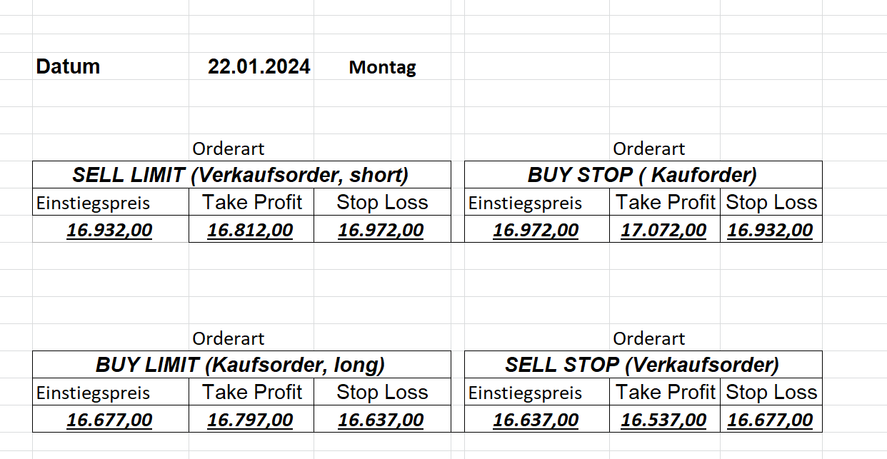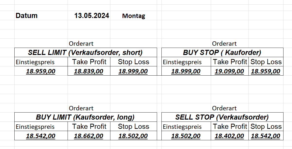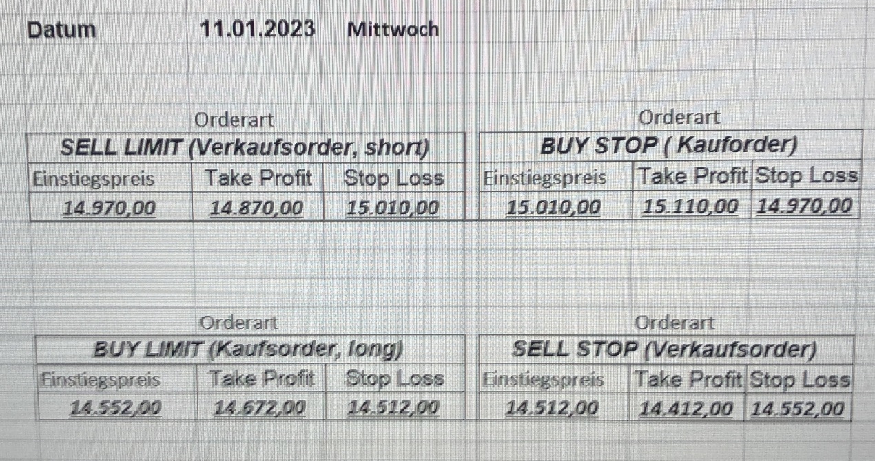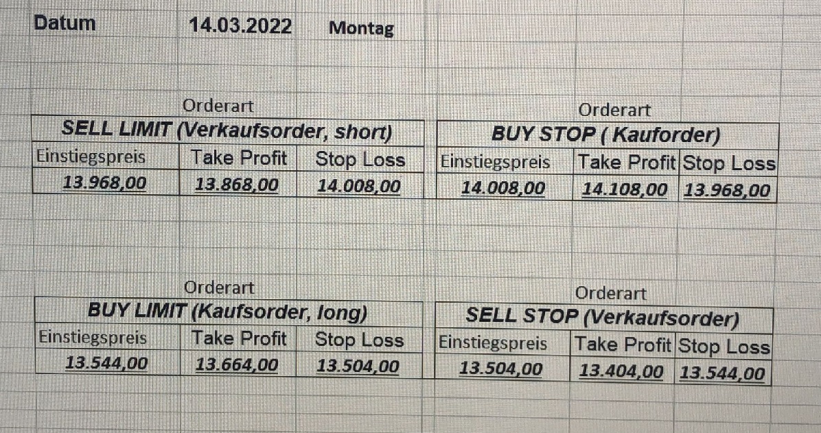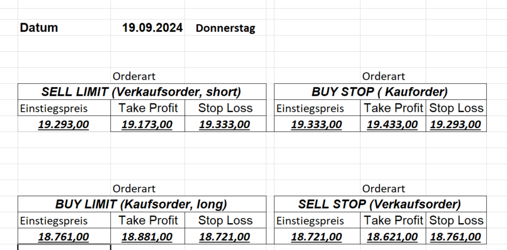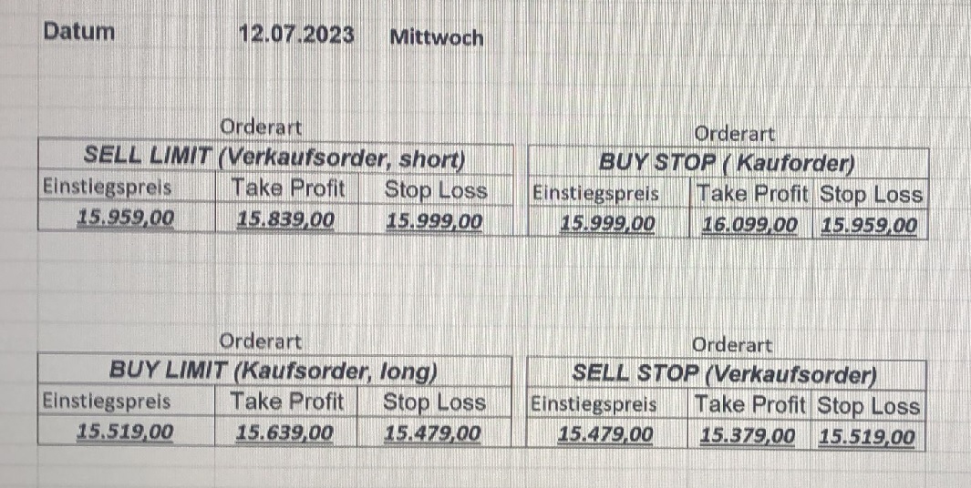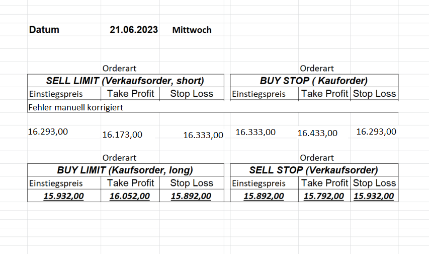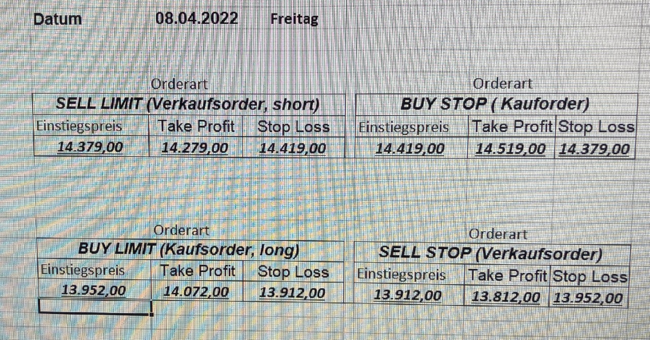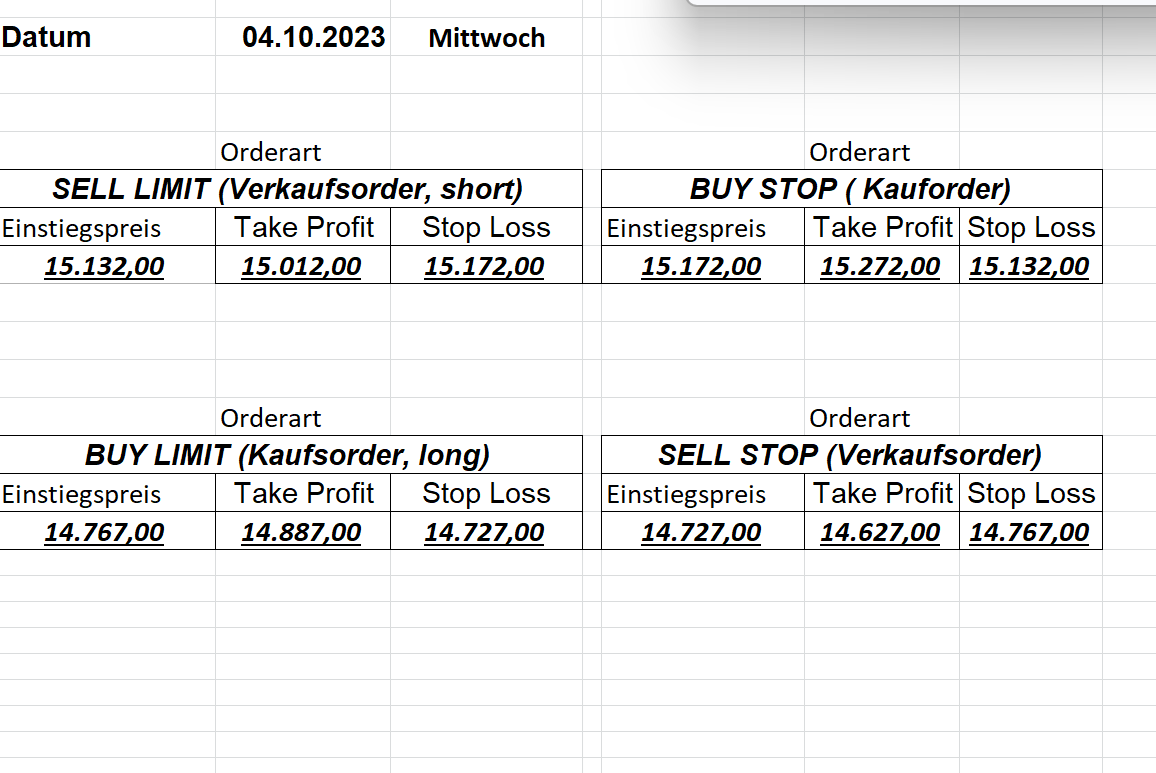 16.5.2023 Platzieren Sie die  Order bis 9:00 Löschen Sie bitte offene Order und Positionen um 21:45 ! Zur Frage der Punktgröße: Beispielrechnung: Bitte immer kurz auf den am weitest entfernten Stopp schauen. Diese Punktzahl sollte nicht mehr als 0,5% bis 1% des Kapitals ausmachen. 15.5.2023 Platzieren Sie die  Order bis 9:00 Löschen Sie bitte offene Order und Positionen um 21:45 ! Zur Frage der Punktgröße: Beispielrechnung: Bitte immer kurz auf den am weitest entfernten Stopp schauen. Diese Punktzahl sollte nicht mehr als 0,5% bis 1% des Kapitals ausmachen. 12.5.2023 Platzieren Sie die  Order bis 9:00 Löschen Sie bitte offene Order und Positionen um 21:45 ! Zur Frage der Punktgröße: Beispielrechnung: Bitte immer kurz auf den am weitest entfernten Stopp schauen. Diese Punktzahl sollte nicht mehr als 0,5% bis 1% des Kapitals ausmachen. 10.5.2023  Platzieren Sie die  Order bis 9:00 Löschen Sie bitte offene Order und Positionen um 21:45 ! Zur Frage der Punktgröße: Beispielrechnung: Bitte immer kurz auf den am weitest entfernten Stopp schauen. Diese Punktzahl sollte nicht mehr als 0,5% bis 1% des Kapitals ausmachen. 9.5.2023 Platzieren Sie die  Order bis 9:00 Löschen Sie bitte offene Order und Positionen um 21:45 ! Zur Frage der Punktgröße: Beispielrechnung: Bitte immer kurz auf den am weitest entfernten Stopp schauen. Diese Punktzahl sollte nicht mehr als 0,5% bis 1% des Kapitals ausmachen.   8.5.2023 Platzieren Sie die  Order bis 9:00 Löschen Sie bitte offene Order und Positionen um 21:45 ! Zur Frage der Punktgröße: Beispielrechnung: Bitte immer kurz auf den am weitest entfernten Stopp schauen. Diese Punktzahl sollte nicht mehr als 0,5% bis 1% des Kapitals ausmachen. 5.5.2023 Platzieren Sie die  Order bis 9:00 Löschen Sie bitte offene Order und Positionen um 21:45 ! Zur Frage der Punktgröße: Beispielrechnung: Bitte immer kurz auf den am weitest entfernten Stopp schauen. Diese Punktzahl sollte nicht mehr als 0,5% bis 1% des Kapitals ausmachen. 4.5.2023 Platzieren Sie die  Order bis 9:00 Löschen Sie bitte offene Order und Positionen um 21:45 ! Zur Frage der Punktgröße: Beispielrechnung: Bitte immer kurz auf den am weitest entfernten Stopp schauen. Diese Punktzahl sollte nicht mehr als 0,5% bis 1% des Kapitals ausmachen. 3.5.2023 Heute abend FED-Sitzung: Wir bleiben heute aus dem Markt! 2.5.2023 Platzieren Sie die  Order bis 9:00 Löschen Sie bitte offene Order und Positionen um 21:45 ! Zur Frage der Punktgröße: Beispielrechnung: Bitte immer kurz auf den am weitest entfernten Stopp schauen. Diese Punktzahl sollte nicht mehr als 0,5% bis 1% des Kapitals ausmachen. 28.4.2023 Platzieren Sie die  Order bis 9:00 Löschen Sie bitte offene Order und Positionen um 21:45 ! Zur Frage der Punktgröße: Beispielrechnung: Bitte immer kurz auf den am weitest entfernten Stopp schauen. Diese Punktzahl sollte nicht mehr als 0,5% bis 1% des Kapitals ausmachen. 27.4.2023 Platzieren Sie die  Order bis 9:00 Löschen Sie bitte offene Order und Positionen um 21:45 ! Zur Frage der Punktgröße: Beispielrechnung: Bitte immer kurz auf den am weitest entfernten Stopp schauen. Diese Punktzahl sollte nicht mehr als 0,5% bis 1% des Kapitals ausmachen. 26.4.2023 Platzieren Sie die  Order bis 9:00 Löschen Sie bitte offene Order und Positionen um 21:45 ! Zur Frage der Punktgröße: Beispielrechnung: Bitte immer kurz auf den am weitest entfernten Stopp schauen. Diese Punktzahl sollte nicht mehr als 0,5% bis 1% des Kapitals ausmachen. 25.4.2023 Platzieren Sie die  Order bis 9:00 Löschen Sie bitte offene Order und Positionen um 21:45 ! Zur Frage der Punktgröße: Beispielrechnung: Bitte immer kurz auf den am weitest entfernten Stopp schauen. Diese Punktzahl sollte nicht mehr als 0,5% bis 1% des Kapitals ausmachen. 24.4.2023 Platzieren Sie die  Order bis 9:00 Löschen Sie bitte offene Order und Positionen um 21:45 ! Zur Frage der Punktgröße: Beispielrechnung: Bitte immer kurz auf den am weitest entfernten Stopp schauen. Diese Punktzahl sollte nicht mehr als 0,5% bis 1% des Kapitals ausmachen. 21.4.2023 Platzieren Sie die  Order bis 9:00 Löschen Sie bitte offene Order und Positionen um 21:45 ! Zur Frage der Punktgröße: Beispielrechnung: Bitte immer kurz auf den am weitest entfernten Stopp schauen. Diese Punktzahl sollte nicht mehr als 0,5% bis 1% des Kapitals ausmachen. Sorry, falscher Wochentag, aber es sind die heutigen Signale!    20.4.2023 Platzieren Sie die  Order bis 9:00 Löschen Sie bitte offene Order und Positionen um 21:45 ! Zur Frage der Punktgröße: Beispielrechnung: Bitte immer kurz auf den am weitest entfernten Stopp schauen. Diese Punktzahl sollte nicht mehr als 0,5% bis 1% des Kapitals ausmachen. 19.4.2023 Platzieren Sie die  Order bis 9:00 Löschen Sie bitte offene Order und Positionen um 21:45 ! Zur Frage der Punktgröße: Beispielrechnung: Bitte immer kurz auf den am weitest entfernten Stopp schauen. Diese Punktzahl sollte nicht mehr als 0,5% bis 1% des Kapitals ausmachen. 18.4.2023 Platzieren Sie die  Order bis 9:00 Löschen Sie bitte offene Order und Positionen um 21:45 ! Zur Frage der Punktgröße: Beispielrechnung: Bitte immer kurz auf den am weitest entfernten Stopp schauen. Diese Punktzahl sollte nicht mehr als 0,5% bis 1% des Kapitals ausmachen.  17.4.2023 Platzieren Sie die  Order bis 9:00 Löschen Sie bitte offene Order und Positionen um 21:45 ! Zur Frage der Punktgröße: Beispielrechnung: Bitte immer kurz auf den am weitest entfernten Stopp schauen. Diese Punktzahl sollte nicht mehr als 0,5% bis 1% des Kapitals ausmachen. 14.4.2023 Platzieren Sie die  Order bis 9:00 Löschen Sie bitte offene Order und Positionen um 21:45 ! Zur Frage der Punktgröße: Beispielrechnung: Bitte immer kurz auf den am weitest entfernten Stopp schauen. Diese Punktzahl sollte nicht mehr als 0,5% bis 1% des Kapitals ausmachen. 13.4.2023 Heute bleiben wir an der Seitenlinie. Aktuell ist der DAX nicht volatil genug!  12.4.2023 Pla