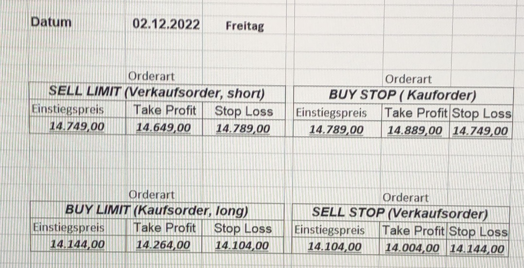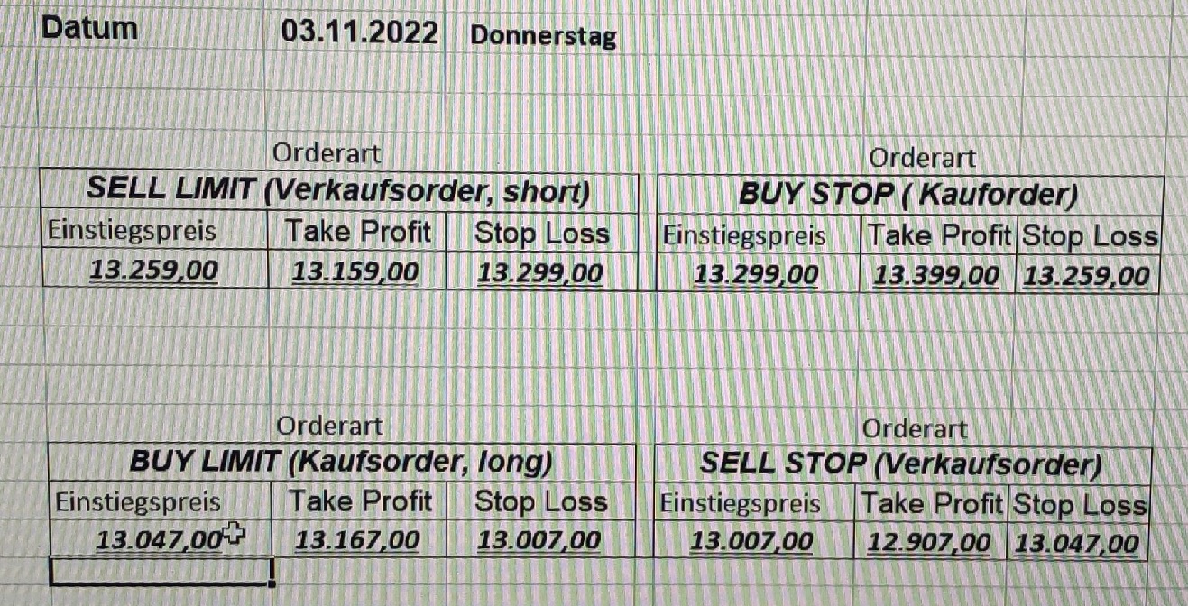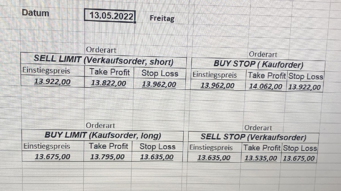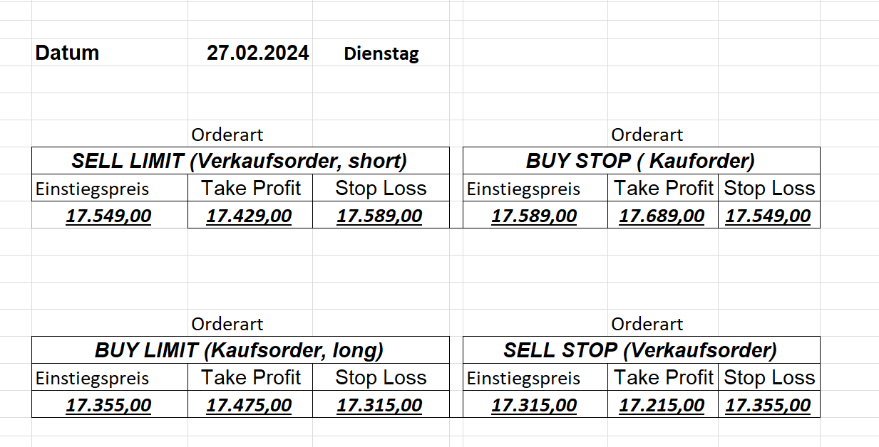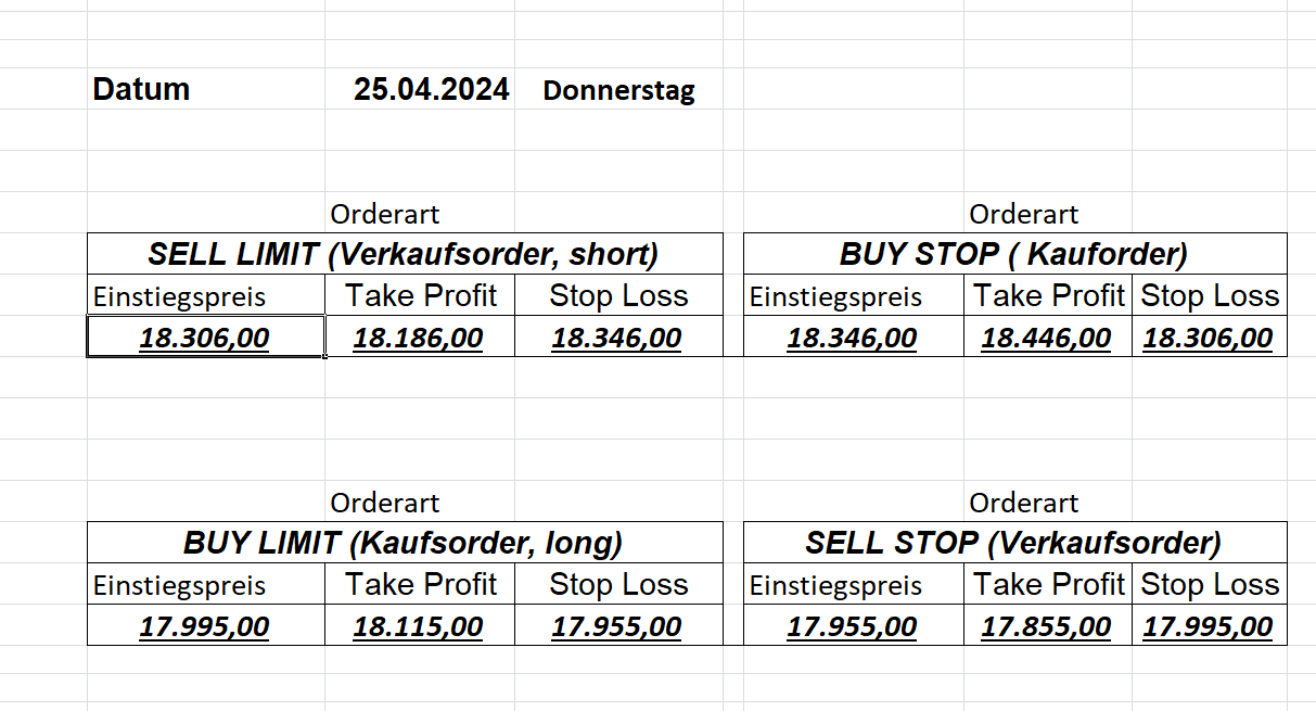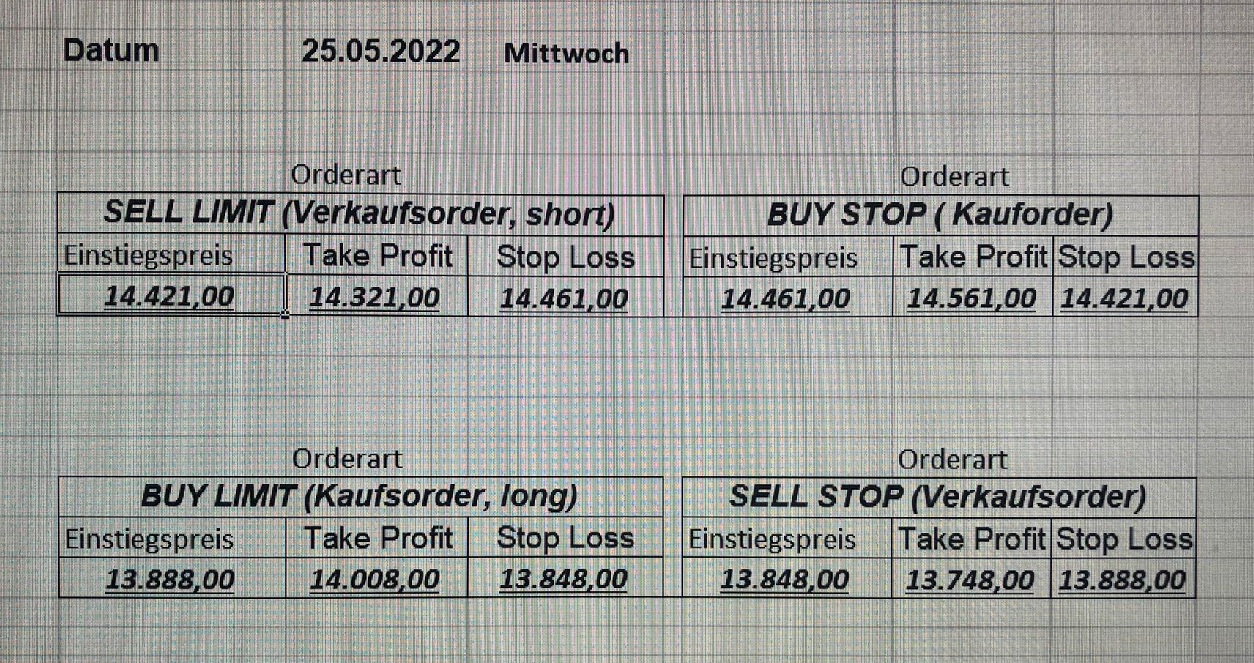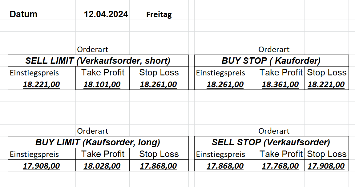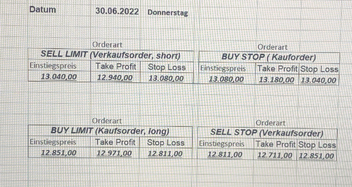 16.5.2023 Platzieren Sie die  Order bis 9:00 Löschen Sie bitte offene Order und Positionen um 21:45 ! Zur Frage der Punktgröße: Beispielrechnung: Bitte immer kurz auf den am weitest entfernten Stopp schauen. Diese Punktzahl sollte nicht mehr als 0,5% bis 1% des Kapitals ausmachen. 15.5.2023 Platzieren Sie die  Order bis 9:00 Löschen Sie bitte offene Order und Positionen um 21:45 ! Zur Frage der Punktgröße: Beispielrechnung: Bitte immer kurz auf den am weitest entfernten Stopp schauen. Diese Punktzahl sollte nicht mehr als 0,5% bis 1% des Kapitals ausmachen. 12.5.2023 Platzieren Sie die  Order bis 9:00 Löschen Sie bitte offene Order und Positionen um 21:45 ! Zur Frage der Punktgröße: Beispielrechnung: Bitte immer kurz auf den am weitest entfernten Stopp schauen. Diese Punktzahl sollte nicht mehr als 0,5% bis 1% des Kapitals ausmachen. 10.5.2023  Platzieren Sie die  Order bis 9:00 Löschen Sie bitte offene Order und Positionen um 21:45 ! Zur Frage der Punktgröße: Beispielrechnung: Bitte immer kurz auf den am weitest entfernten Stopp schauen. Diese Punktzahl sollte nicht mehr als 0,5% bis 1% des Kapitals ausmachen. 9.5.2023 Platzieren Sie die  Order bis 9:00 Löschen Sie bitte offene Order und Positionen um 21:45 ! Zur Frage der Punktgröße: Beispielrechnung: Bitte immer kurz auf den am weitest entfernten Stopp schauen. Diese Punktzahl sollte nicht mehr als 0,5% bis 1% des Kapitals ausmachen.   8.5.2023 Platzieren Sie die  Order bis 9:00 Löschen Sie bitte offene Order und Positionen um 21:45 ! Zur Frage der Punktgröße: Beispielrechnung: Bitte immer kurz auf den am weitest entfernten Stopp schauen. Diese Punktzahl sollte nicht mehr als 0,5% bis 1% des Kapitals ausmachen. 5.5.2023 Platzieren Sie die  Order bis 9:00 Löschen Sie bitte offene Order und Positionen um 21:45 ! Zur Frage der Punktgröße: Beispielrechnung: Bitte immer kurz auf den am weitest entfernten Stopp schauen. Diese Punktzahl sollte nicht mehr als 0,5% bis 1% des Kapitals ausmachen. 4.5.2023 Platzieren Sie die  Order bis 9:00 Löschen Sie bitte offene Order und Positionen um 21:45 ! Zur Frage der Punktgröße: Beispielrechnung: Bitte immer kurz auf den am weitest entfernten Stopp schauen. Diese Punktzahl sollte nicht mehr als 0,5% bis 1% des Kapitals ausmachen. 3.5.2023 Heute abend FED-Sitzung: Wir bleiben heute aus dem Markt! 2.5.2023 Platzieren Sie die  Order bis 9:00 Löschen Sie bitte offene Order und Positionen um 21:45 ! Zur Frage der Punktgröße: Beispielrechnung: Bitte immer kurz auf den am weitest entfernten Stopp schauen. Diese Punktzahl sollte nicht mehr als 0,5% bis 1% des Kapitals ausmachen. 28.4.2023 Platzieren Sie die  Order bis 9:00 Löschen Sie bitte offene Order und Positionen um 21:45 ! Zur Frage der Punktgröße: Beispielrechnung: Bitte immer kurz auf den am weitest entfernten Stopp schauen. Diese Punktzahl sollte nicht mehr als 0,5% bis 1% des Kapitals ausmachen. 27.4.2023 Platzieren Sie die  Order bis 9:00 Löschen Sie bitte offene Order und Positionen um 21:45 ! Zur Frage der Punktgröße: Beispielrechnung: Bitte immer kurz auf den am weitest entfernten Stopp schauen. Diese Punktzahl sollte nicht mehr als 0,5% bis 1% des Kapitals ausmachen. 26.4.2023 Platzieren Sie die  Order bis 9:00 Löschen Sie bitte offene Order und Positionen um 21:45 ! Zur Frage der Punktgröße: Beispielrechnung: Bitte immer kurz auf den am weitest entfernten Stopp schauen. Diese Punktzahl sollte nicht mehr als 0,5% bis 1% des Kapitals ausmachen. 25.4.2023 Platzieren Sie die  Order bis 9:00 Löschen Sie bitte offene Order und Positionen um 21:45 ! Zur Frage der Punktgröße: Beispielrechnung: Bitte immer kurz auf den am weitest entfernten Stopp schauen. Diese Punktzahl sollte nicht mehr als 0,5% bis 1% des Kapitals ausmachen. 24.4.2023 Platzieren Sie die  Order bis 9:00 Löschen Sie bitte offene Order und Positionen um 21:45 ! Zur Frage der Punktgröße: Beispielrechnung: Bitte immer kurz auf den am weitest entfernten Stopp schauen. Diese Punktzahl sollte nicht mehr als 0,5% bis 1% des Kapitals ausmachen. 21.4.2023 Platzieren Sie die  Order bis 9:00 Löschen Sie bitte offene Order und Positionen um 21:45 ! Zur Frage der Punktgröße: Beispielrechnung: Bitte immer kurz auf den am weitest entfernten Stopp schauen. Diese Punktzahl sollte nicht mehr als 0,5% bis 1% des Kapitals ausmachen. Sorry, falscher Wochentag, aber es sind die heutigen Signale!    20.4.2023 Platzieren Sie die  Order bis 9:00 Löschen Sie bitte offene Order und Positionen um 21:45 ! Zur Frage der Punktgröße: Beispielrechnung: Bitte immer kurz auf den am weitest entfernten Stopp schauen. Diese Punktzahl sollte nicht mehr als 0,5% bis 1% des Kapitals ausmachen. 19.4.2023 Platzieren Sie die  Order bis 9:00 Löschen Sie bitte offene Order und Positionen um 21:45 ! Zur Frage der Punktgröße: Beispielrechnung: Bitte immer kurz auf den am weitest entfernten Stopp schauen. Diese Punktzahl sollte nicht mehr als 0,5% bis 1% des Kapitals ausmachen. 18.4.2023 Platzieren Sie die  Order bis 9:00 Löschen Sie bitte offene Order und Positionen um 21:45 ! Zur Frage der Punktgröße: Beispielrechnung: Bitte immer kurz auf den am weitest entfernten Stopp schauen. Diese Punktzahl sollte nicht mehr als 0,5% bis 1% des Kapitals ausmachen.  17.4.2023 Platzieren Sie die  Order bis 9:00 Löschen Sie bitte offene Order und Positionen um 21:45 ! Zur Frage der Punktgröße: Beispielrechnung: Bitte immer kurz auf den am weitest entfernten Stopp schauen. Diese Punktzahl sollte nicht mehr als 0,5% bis 1% des Kapitals ausmachen. 14.4.2023 Platzieren Sie die  Order bis 9:00 Löschen Sie bitte offene Order und Positionen um 21:45 ! Zur Frage der Punktgröße: Beispielrechnung: Bitte immer kurz auf den am weitest entfernten Stopp schauen. Diese Punktzahl sollte nicht mehr als 0,5% bis 1% des Kapitals ausmachen. 13.4.2023 Heute bleiben wir an der Seitenlinie. Aktuell ist der DAX nicht volatil genug!  12.4.2023 Pla