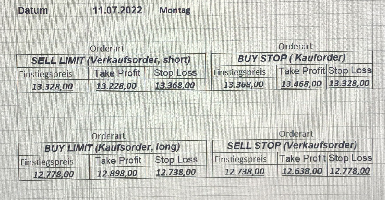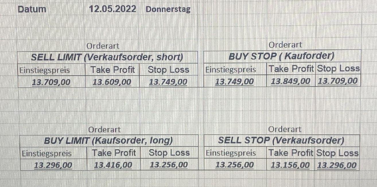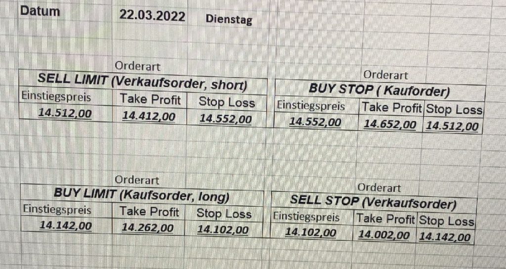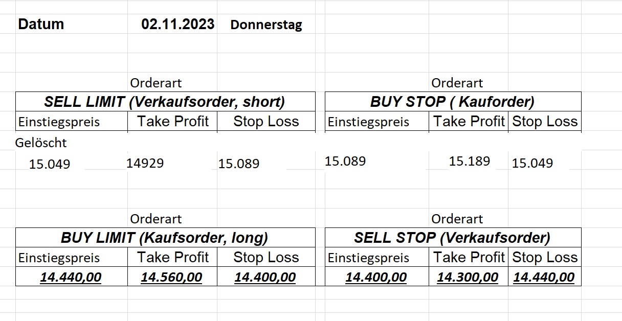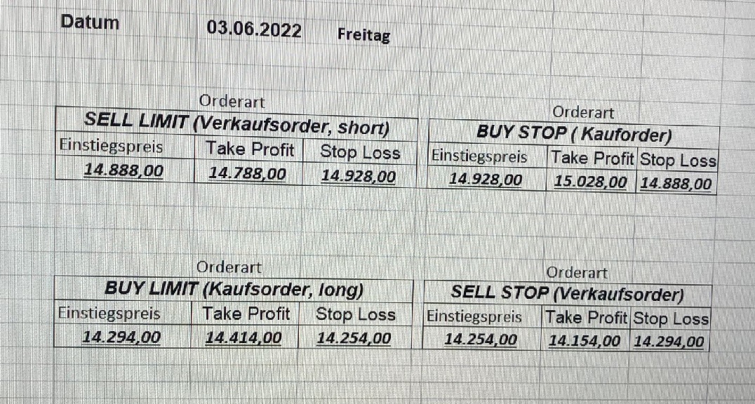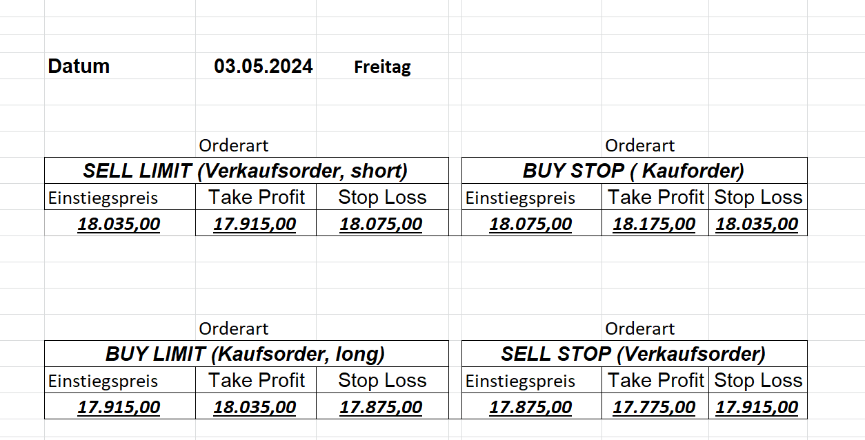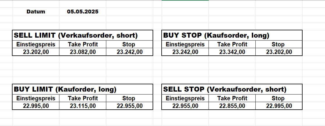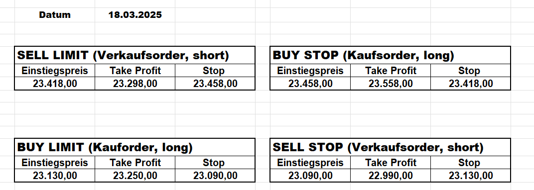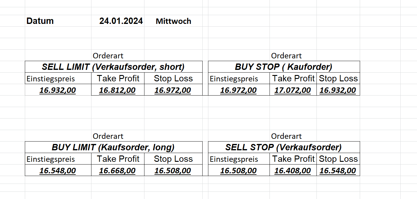 16.5.2023 Platzieren Sie die  Order bis 9:00 Löschen Sie bitte offene Order und Positionen um 21:45 ! Zur Frage der Punktgröße: Beispielrechnung: Bitte immer kurz auf den am weitest entfernten Stopp schauen. Diese Punktzahl sollte nicht mehr als 0,5% bis 1% des Kapitals ausmachen. 15.5.2023 Platzieren Sie die  Order bis 9:00 Löschen Sie bitte offene Order und Positionen um 21:45 ! Zur Frage der Punktgröße: Beispielrechnung: Bitte immer kurz auf den am weitest entfernten Stopp schauen. Diese Punktzahl sollte nicht mehr als 0,5% bis 1% des Kapitals ausmachen. 12.5.2023 Platzieren Sie die  Order bis 9:00 Löschen Sie bitte offene Order und Positionen um 21:45 ! Zur Frage der Punktgröße: Beispielrechnung: Bitte immer kurz auf den am weitest entfernten Stopp schauen. Diese Punktzahl sollte nicht mehr als 0,5% bis 1% des Kapitals ausmachen. 10.5.2023  Platzieren Sie die  Order bis 9:00 Löschen Sie bitte offene Order und Positionen um 21:45 ! Zur Frage der Punktgröße: Beispielrechnung: Bitte immer kurz auf den am weitest entfernten Stopp schauen. Diese Punktzahl sollte nicht mehr als 0,5% bis 1% des Kapitals ausmachen. 9.5.2023 Platzieren Sie die  Order bis 9:00 Löschen Sie bitte offene Order und Positionen um 21:45 ! Zur Frage der Punktgröße: Beispielrechnung: Bitte immer kurz auf den am weitest entfernten Stopp schauen. Diese Punktzahl sollte nicht mehr als 0,5% bis 1% des Kapitals ausmachen.   8.5.2023 Platzieren Sie die  Order bis 9:00 Löschen Sie bitte offene Order und Positionen um 21:45 ! Zur Frage der Punktgröße: Beispielrechnung: Bitte immer kurz auf den am weitest entfernten Stopp schauen. Diese Punktzahl sollte nicht mehr als 0,5% bis 1% des Kapitals ausmachen. 5.5.2023 Platzieren Sie die  Order bis 9:00 Löschen Sie bitte offene Order und Positionen um 21:45 ! Zur Frage der Punktgröße: Beispielrechnung: Bitte immer kurz auf den am weitest entfernten Stopp schauen. Diese Punktzahl sollte nicht mehr als 0,5% bis 1% des Kapitals ausmachen. 4.5.2023 Platzieren Sie die  Order bis 9:00 Löschen Sie bitte offene Order und Positionen um 21:45 ! Zur Frage der Punktgröße: Beispielrechnung: Bitte immer kurz auf den am weitest entfernten Stopp schauen. Diese Punktzahl sollte nicht mehr als 0,5% bis 1% des Kapitals ausmachen. 3.5.2023 Heute abend FED-Sitzung: Wir bleiben heute aus dem Markt! 2.5.2023 Platzieren Sie die  Order bis 9:00 Löschen Sie bitte offene Order und Positionen um 21:45 ! Zur Frage der Punktgröße: Beispielrechnung: Bitte immer kurz auf den am weitest entfernten Stopp schauen. Diese Punktzahl sollte nicht mehr als 0,5% bis 1% des Kapitals ausmachen. 28.4.2023 Platzieren Sie die  Order bis 9:00 Löschen Sie bitte offene Order und Positionen um 21:45 ! Zur Frage der Punktgröße: Beispielrechnung: Bitte immer kurz auf den am weitest entfernten Stopp schauen. Diese Punktzahl sollte nicht mehr als 0,5% bis 1% des Kapitals ausmachen. 27.4.2023 Platzieren Sie die  Order bis 9:00 Löschen Sie bitte offene Order und Positionen um 21:45 ! Zur Frage der Punktgröße: Beispielrechnung: Bitte immer kurz auf den am weitest entfernten Stopp schauen. Diese Punktzahl sollte nicht mehr als 0,5% bis 1% des Kapitals ausmachen. 26.4.2023 Platzieren Sie die  Order bis 9:00 Löschen Sie bitte offene Order und Positionen um 21:45 ! Zur Frage der Punktgröße: Beispielrechnung: Bitte immer kurz auf den am weitest entfernten Stopp schauen. Diese Punktzahl sollte nicht mehr als 0,5% bis 1% des Kapitals ausmachen. 25.4.2023 Platzieren Sie die  Order bis 9:00 Löschen Sie bitte offene Order und Positionen um 21:45 ! Zur Frage der Punktgröße: Beispielrechnung: Bitte immer kurz auf den am weitest entfernten Stopp schauen. Diese Punktzahl sollte nicht mehr als 0,5% bis 1% des Kapitals ausmachen. 24.4.2023 Platzieren Sie die  Order bis 9:00 Löschen Sie bitte offene Order und Positionen um 21:45 ! Zur Frage der Punktgröße: Beispielrechnung: Bitte immer kurz auf den am weitest entfernten Stopp schauen. Diese Punktzahl sollte nicht mehr als 0,5% bis 1% des Kapitals ausmachen. 21.4.2023 Platzieren Sie die  Order bis 9:00 Löschen Sie bitte offene Order und Positionen um 21:45 ! Zur Frage der Punktgröße: Beispielrechnung: Bitte immer kurz auf den am weitest entfernten Stopp schauen. Diese Punktzahl sollte nicht mehr als 0,5% bis 1% des Kapitals ausmachen. Sorry, falscher Wochentag, aber es sind die heutigen Signale!    20.4.2023 Platzieren Sie die  Order bis 9:00 Löschen Sie bitte offene Order und Positionen um 21:45 ! Zur Frage der Punktgröße: Beispielrechnung: Bitte immer kurz auf den am weitest entfernten Stopp schauen. Diese Punktzahl sollte nicht mehr als 0,5% bis 1% des Kapitals ausmachen. 19.4.2023 Platzieren Sie die  Order bis 9:00 Löschen Sie bitte offene Order und Positionen um 21:45 ! Zur Frage der Punktgröße: Beispielrechnung: Bitte immer kurz auf den am weitest entfernten Stopp schauen. Diese Punktzahl sollte nicht mehr als 0,5% bis 1% des Kapitals ausmachen. 18.4.2023 Platzieren Sie die  Order bis 9:00 Löschen Sie bitte offene Order und Positionen um 21:45 ! Zur Frage der Punktgröße: Beispielrechnung: Bitte immer kurz auf den am weitest entfernten Stopp schauen. Diese Punktzahl sollte nicht mehr als 0,5% bis 1% des Kapitals ausmachen.  17.4.2023 Platzieren Sie die  Order bis 9:00 Löschen Sie bitte offene Order und Positionen um 21:45 ! Zur Frage der Punktgröße: Beispielrechnung: Bitte immer kurz auf den am weitest entfernten Stopp schauen. Diese Punktzahl sollte nicht mehr als 0,5% bis 1% des Kapitals ausmachen. 14.4.2023 Platzieren Sie die  Order bis 9:00 Löschen Sie bitte offene Order und Positionen um 21:45 ! Zur Frage der Punktgröße: Beispielrechnung: Bitte immer kurz auf den am weitest entfernten Stopp schauen. Diese Punktzahl sollte nicht mehr als 0,5% bis 1% des Kapitals ausmachen. 13.4.2023 Heute bleiben wir an der Seitenlinie. Aktuell ist der DAX nicht volatil genug!  12.4.2023 Pla