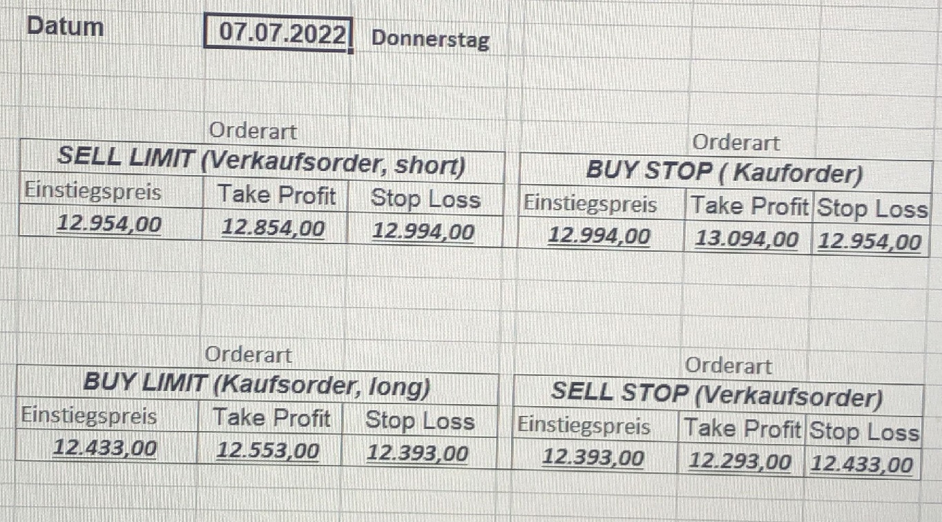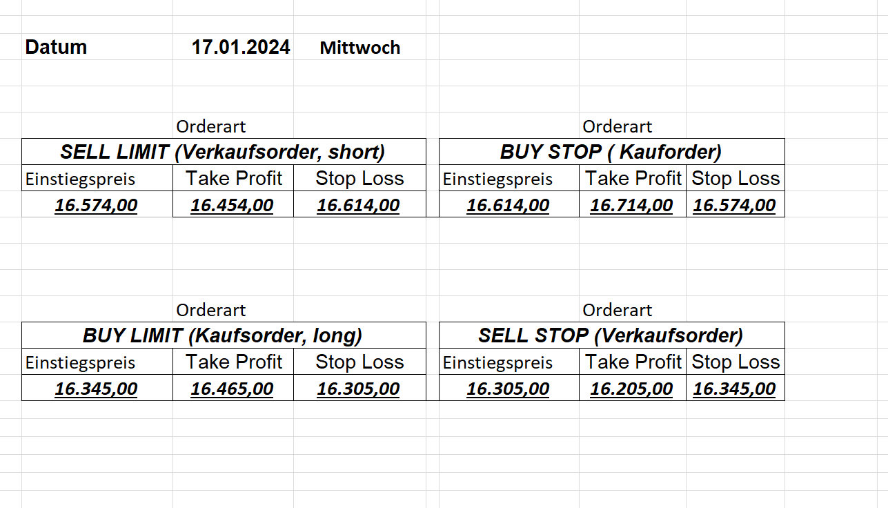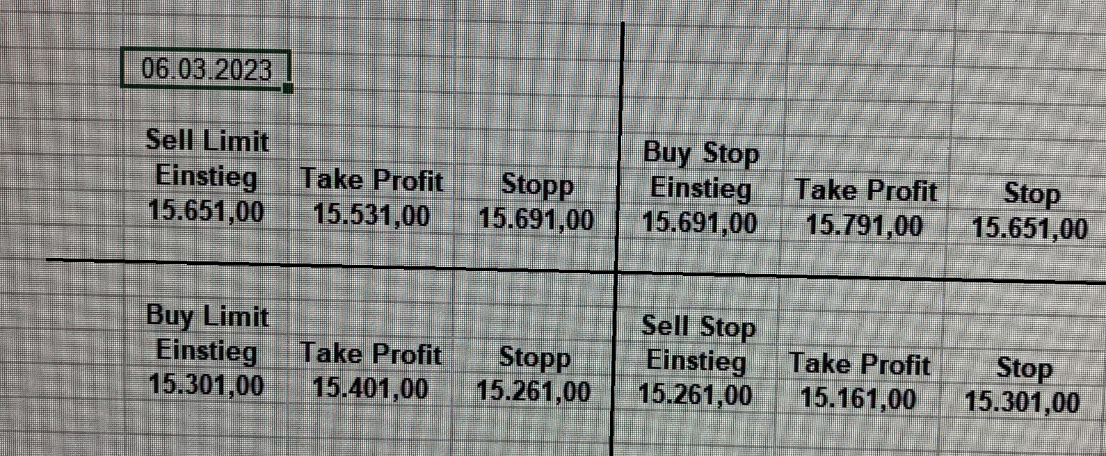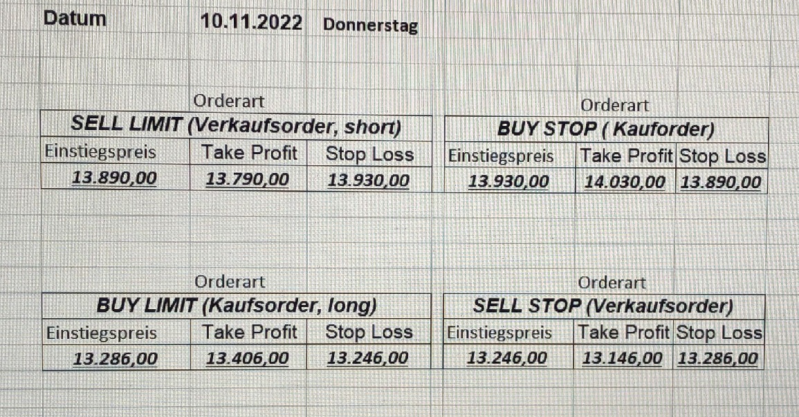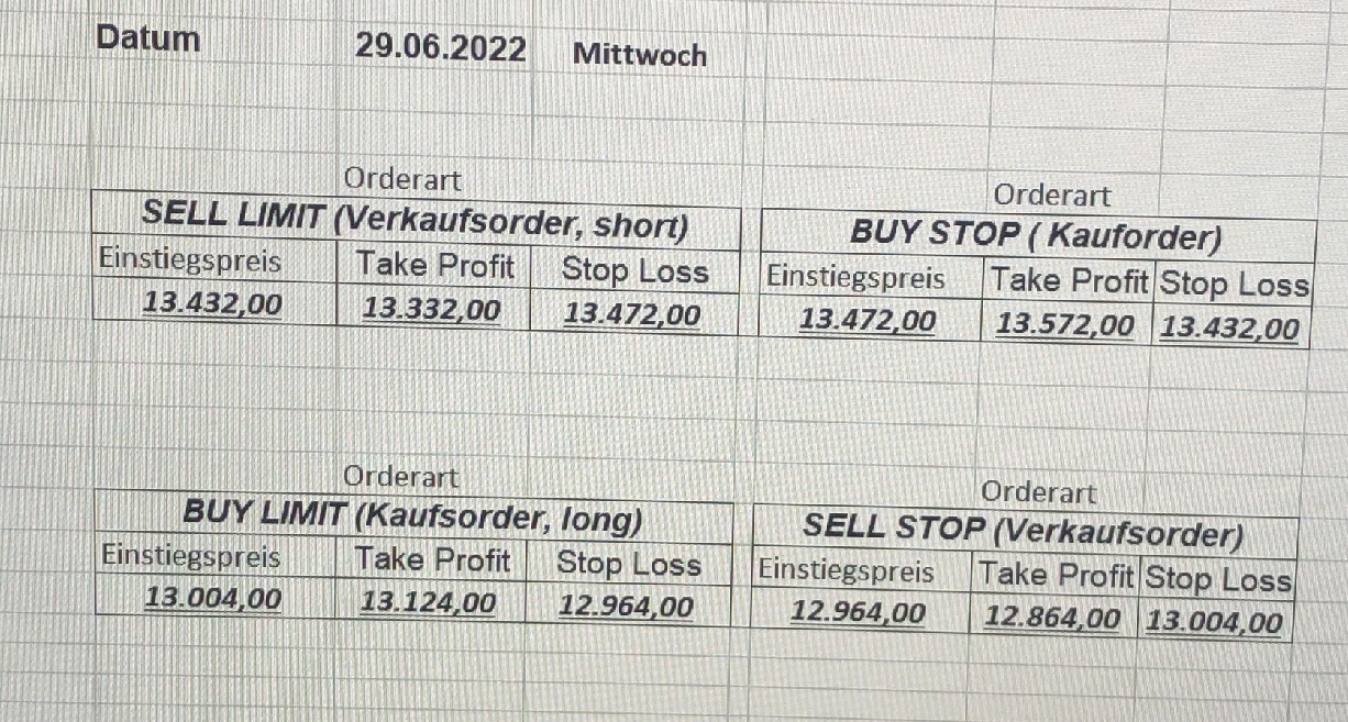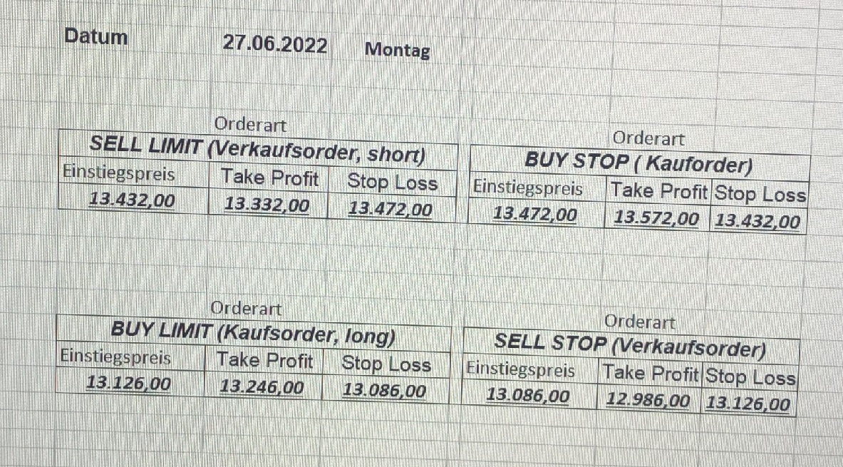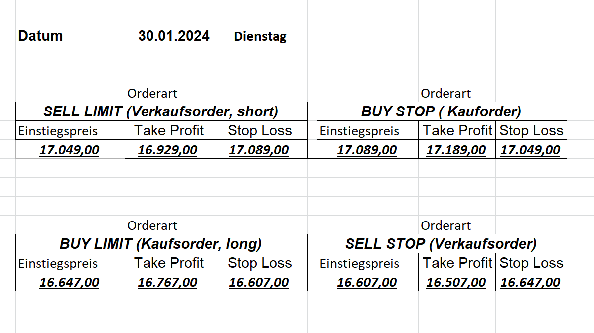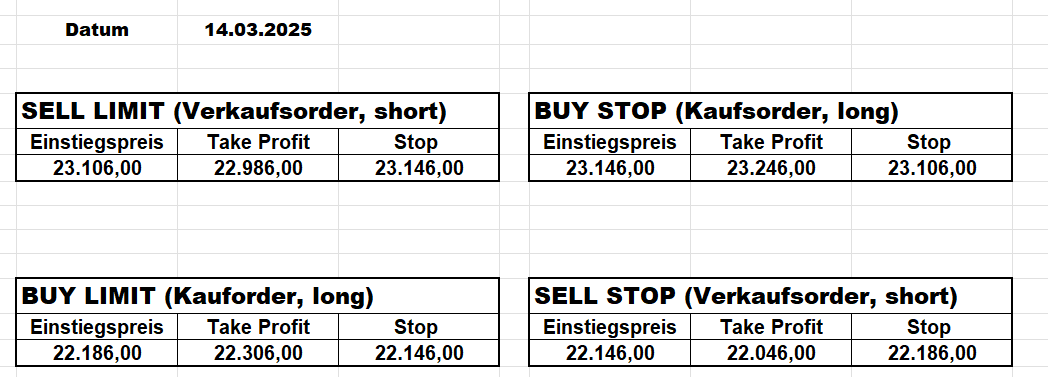 16.5.2023 Platzieren Sie die  Order bis 9:00 Löschen Sie bitte offene Order und Positionen um 21:45 ! Zur Frage der Punktgröße: Beispielrechnung: Bitte immer kurz auf den am weitest entfernten Stopp schauen. Diese Punktzahl sollte nicht mehr als 0,5% bis 1% des Kapitals ausmachen. 15.5.2023 Platzieren Sie die  Order bis 9:00 Löschen Sie bitte offene Order und Positionen um 21:45 ! Zur Frage der Punktgröße: Beispielrechnung: Bitte immer kurz auf den am weitest entfernten Stopp schauen. Diese Punktzahl sollte nicht mehr als 0,5% bis 1% des Kapitals ausmachen. 12.5.2023 Platzieren Sie die  Order bis 9:00 Löschen Sie bitte offene Order und Positionen um 21:45 ! Zur Frage der Punktgröße: Beispielrechnung: Bitte immer kurz auf den am weitest entfernten Stopp schauen. Diese Punktzahl sollte nicht mehr als 0,5% bis 1% des Kapitals ausmachen. 10.5.2023  Platzieren Sie die  Order bis 9:00 Löschen Sie bitte offene Order und Positionen um 21:45 ! Zur Frage der Punktgröße: Beispielrechnung: Bitte immer kurz auf den am weitest entfernten Stopp schauen. Diese Punktzahl sollte nicht mehr als 0,5% bis 1% des Kapitals ausmachen. 9.5.2023 Platzieren Sie die  Order bis 9:00 Löschen Sie bitte offene Order und Positionen um 21:45 ! Zur Frage der Punktgröße: Beispielrechnung: Bitte immer kurz auf den am weitest entfernten Stopp schauen. Diese Punktzahl sollte nicht mehr als 0,5% bis 1% des Kapitals ausmachen.   8.5.2023 Platzieren Sie die  Order bis 9:00 Löschen Sie bitte offene Order und Positionen um 21:45 ! Zur Frage der Punktgröße: Beispielrechnung: Bitte immer kurz auf den am weitest entfernten Stopp schauen. Diese Punktzahl sollte nicht mehr als 0,5% bis 1% des Kapitals ausmachen. 5.5.2023 Platzieren Sie die  Order bis 9:00 Löschen Sie bitte offene Order und Positionen um 21:45 ! Zur Frage der Punktgröße: Beispielrechnung: Bitte immer kurz auf den am weitest entfernten Stopp schauen. Diese Punktzahl sollte nicht mehr als 0,5% bis 1% des Kapitals ausmachen. 4.5.2023 Platzieren Sie die  Order bis 9:00 Löschen Sie bitte offene Order und Positionen um 21:45 ! Zur Frage der Punktgröße: Beispielrechnung: Bitte immer kurz auf den am weitest entfernten Stopp schauen. Diese Punktzahl sollte nicht mehr als 0,5% bis 1% des Kapitals ausmachen. 3.5.2023 Heute abend FED-Sitzung: Wir bleiben heute aus dem Markt! 2.5.2023 Platzieren Sie die  Order bis 9:00 Löschen Sie bitte offene Order und Positionen um 21:45 ! Zur Frage der Punktgröße: Beispielrechnung: Bitte immer kurz auf den am weitest entfernten Stopp schauen. Diese Punktzahl sollte nicht mehr als 0,5% bis 1% des Kapitals ausmachen. 28.4.2023 Platzieren Sie die  Order bis 9:00 Löschen Sie bitte offene Order und Positionen um 21:45 ! Zur Frage der Punktgröße: Beispielrechnung: Bitte immer kurz auf den am weitest entfernten Stopp schauen. Diese Punktzahl sollte nicht mehr als 0,5% bis 1% des Kapitals ausmachen. 27.4.2023 Platzieren Sie die  Order bis 9:00 Löschen Sie bitte offene Order und Positionen um 21:45 ! Zur Frage der Punktgröße: Beispielrechnung: Bitte immer kurz auf den am weitest entfernten Stopp schauen. Diese Punktzahl sollte nicht mehr als 0,5% bis 1% des Kapitals ausmachen. 26.4.2023 Platzieren Sie die  Order bis 9:00 Löschen Sie bitte offene Order und Positionen um 21:45 ! Zur Frage der Punktgröße: Beispielrechnung: Bitte immer kurz auf den am weitest entfernten Stopp schauen. Diese Punktzahl sollte nicht mehr als 0,5% bis 1% des Kapitals ausmachen. 25.4.2023 Platzieren Sie die  Order bis 9:00 Löschen Sie bitte offene Order und Positionen um 21:45 ! Zur Frage der Punktgröße: Beispielrechnung: Bitte immer kurz auf den am weitest entfernten Stopp schauen. Diese Punktzahl sollte nicht mehr als 0,5% bis 1% des Kapitals ausmachen. 24.4.2023 Platzieren Sie die  Order bis 9:00 Löschen Sie bitte offene Order und Positionen um 21:45 ! Zur Frage der Punktgröße: Beispielrechnung: Bitte immer kurz auf den am weitest entfernten Stopp schauen. Diese Punktzahl sollte nicht mehr als 0,5% bis 1% des Kapitals ausmachen. 21.4.2023 Platzieren Sie die  Order bis 9:00 Löschen Sie bitte offene Order und Positionen um 21:45 ! Zur Frage der Punktgröße: Beispielrechnung: Bitte immer kurz auf den am weitest entfernten Stopp schauen. Diese Punktzahl sollte nicht mehr als 0,5% bis 1% des Kapitals ausmachen. Sorry, falscher Wochentag, aber es sind die heutigen Signale!    20.4.2023 Platzieren Sie die  Order bis 9:00 Löschen Sie bitte offene Order und Positionen um 21:45 ! Zur Frage der Punktgröße: Beispielrechnung: Bitte immer kurz auf den am weitest entfernten Stopp schauen. Diese Punktzahl sollte nicht mehr als 0,5% bis 1% des Kapitals ausmachen. 19.4.2023 Platzieren Sie die  Order bis 9:00 Löschen Sie bitte offene Order und Positionen um 21:45 ! Zur Frage der Punktgröße: Beispielrechnung: Bitte immer kurz auf den am weitest entfernten Stopp schauen. Diese Punktzahl sollte nicht mehr als 0,5% bis 1% des Kapitals ausmachen. 18.4.2023 Platzieren Sie die  Order bis 9:00 Löschen Sie bitte offene Order und Positionen um 21:45 ! Zur Frage der Punktgröße: Beispielrechnung: Bitte immer kurz auf den am weitest entfernten Stopp schauen. Diese Punktzahl sollte nicht mehr als 0,5% bis 1% des Kapitals ausmachen.  17.4.2023 Platzieren Sie die  Order bis 9:00 Löschen Sie bitte offene Order und Positionen um 21:45 ! Zur Frage der Punktgröße: Beispielrechnung: Bitte immer kurz auf den am weitest entfernten Stopp schauen. Diese Punktzahl sollte nicht mehr als 0,5% bis 1% des Kapitals ausmachen. 14.4.2023 Platzieren Sie die  Order bis 9:00 Löschen Sie bitte offene Order und Positionen um 21:45 ! Zur Frage der Punktgröße: Beispielrechnung: Bitte immer kurz auf den am weitest entfernten Stopp schauen. Diese Punktzahl sollte nicht mehr als 0,5% bis 1% des Kapitals ausmachen. 13.4.2023 Heute bleiben wir an der Seitenlinie. Aktuell ist der DAX nicht volatil genug!  12.4.2023 Pla