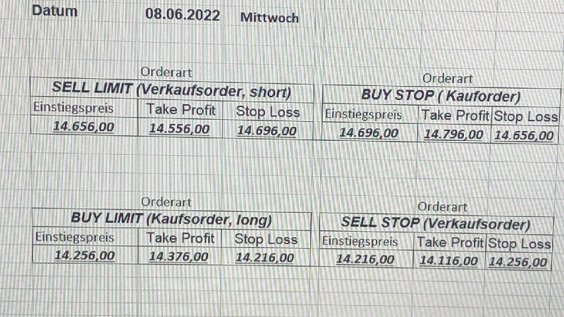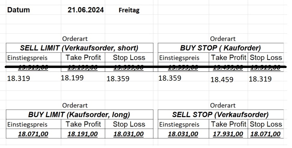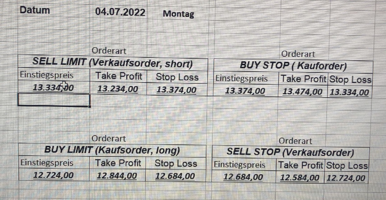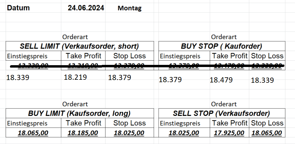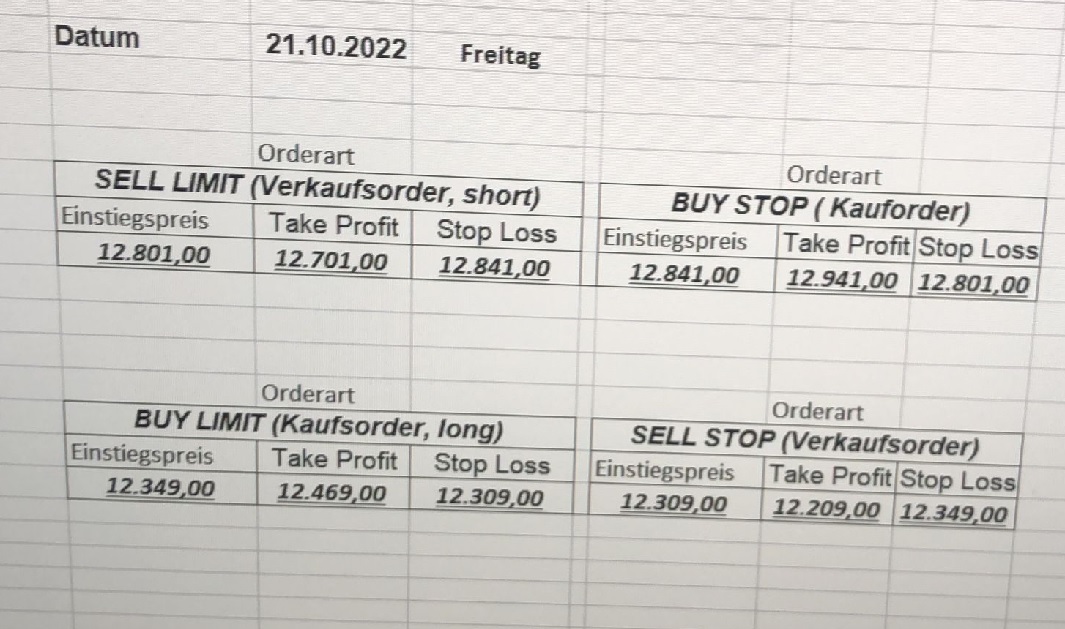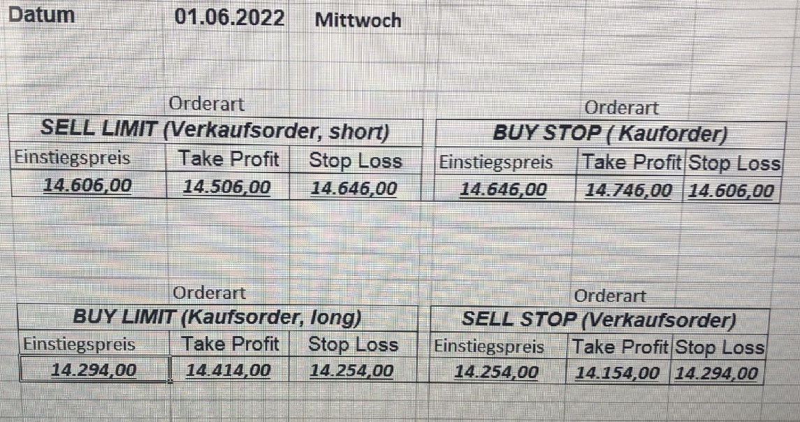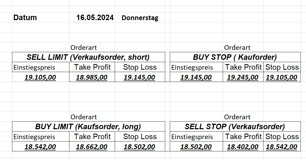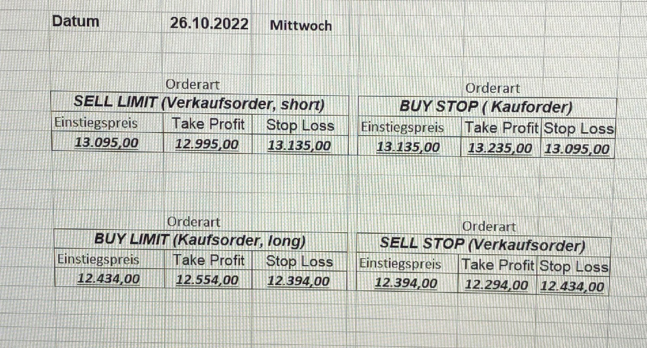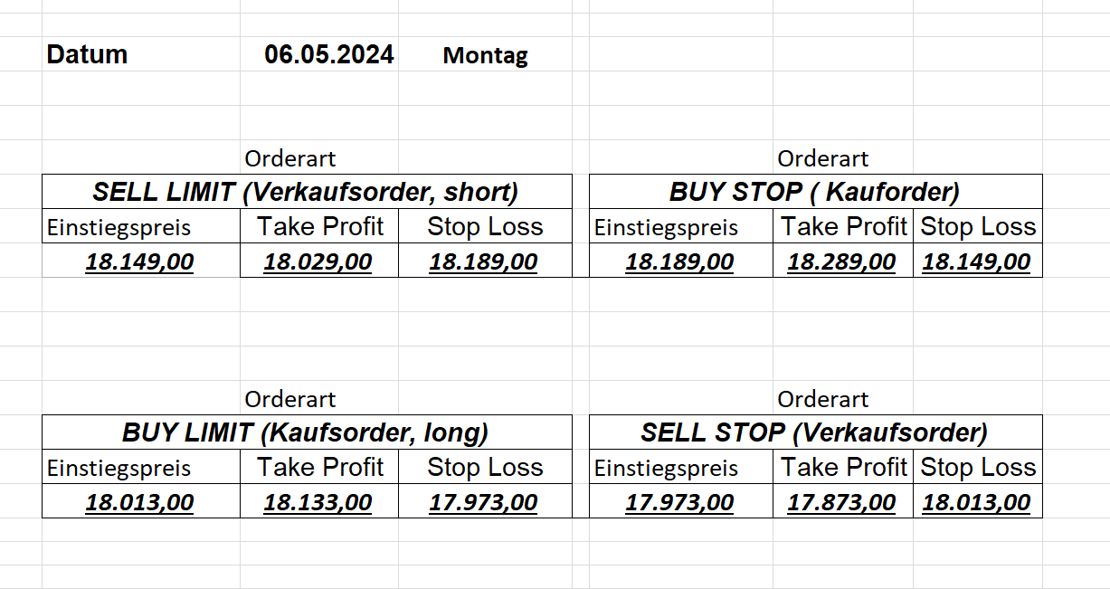 16.5.2023 Platzieren Sie die  Order bis 9:00 Löschen Sie bitte offene Order und Positionen um 21:45 ! Zur Frage der Punktgröße: Beispielrechnung: Bitte immer kurz auf den am weitest entfernten Stopp schauen. Diese Punktzahl sollte nicht mehr als 0,5% bis 1% des Kapitals ausmachen. 15.5.2023 Platzieren Sie die  Order bis 9:00 Löschen Sie bitte offene Order und Positionen um 21:45 ! Zur Frage der Punktgröße: Beispielrechnung: Bitte immer kurz auf den am weitest entfernten Stopp schauen. Diese Punktzahl sollte nicht mehr als 0,5% bis 1% des Kapitals ausmachen. 12.5.2023 Platzieren Sie die  Order bis 9:00 Löschen Sie bitte offene Order und Positionen um 21:45 ! Zur Frage der Punktgröße: Beispielrechnung: Bitte immer kurz auf den am weitest entfernten Stopp schauen. Diese Punktzahl sollte nicht mehr als 0,5% bis 1% des Kapitals ausmachen. 10.5.2023  Platzieren Sie die  Order bis 9:00 Löschen Sie bitte offene Order und Positionen um 21:45 ! Zur Frage der Punktgröße: Beispielrechnung: Bitte immer kurz auf den am weitest entfernten Stopp schauen. Diese Punktzahl sollte nicht mehr als 0,5% bis 1% des Kapitals ausmachen. 9.5.2023 Platzieren Sie die  Order bis 9:00 Löschen Sie bitte offene Order und Positionen um 21:45 ! Zur Frage der Punktgröße: Beispielrechnung: Bitte immer kurz auf den am weitest entfernten Stopp schauen. Diese Punktzahl sollte nicht mehr als 0,5% bis 1% des Kapitals ausmachen.   8.5.2023 Platzieren Sie die  Order bis 9:00 Löschen Sie bitte offene Order und Positionen um 21:45 ! Zur Frage der Punktgröße: Beispielrechnung: Bitte immer kurz auf den am weitest entfernten Stopp schauen. Diese Punktzahl sollte nicht mehr als 0,5% bis 1% des Kapitals ausmachen. 5.5.2023 Platzieren Sie die  Order bis 9:00 Löschen Sie bitte offene Order und Positionen um 21:45 ! Zur Frage der Punktgröße: Beispielrechnung: Bitte immer kurz auf den am weitest entfernten Stopp schauen. Diese Punktzahl sollte nicht mehr als 0,5% bis 1% des Kapitals ausmachen. 4.5.2023 Platzieren Sie die  Order bis 9:00 Löschen Sie bitte offene Order und Positionen um 21:45 ! Zur Frage der Punktgröße: Beispielrechnung: Bitte immer kurz auf den am weitest entfernten Stopp schauen. Diese Punktzahl sollte nicht mehr als 0,5% bis 1% des Kapitals ausmachen. 3.5.2023 Heute abend FED-Sitzung: Wir bleiben heute aus dem Markt! 2.5.2023 Platzieren Sie die  Order bis 9:00 Löschen Sie bitte offene Order und Positionen um 21:45 ! Zur Frage der Punktgröße: Beispielrechnung: Bitte immer kurz auf den am weitest entfernten Stopp schauen. Diese Punktzahl sollte nicht mehr als 0,5% bis 1% des Kapitals ausmachen. 28.4.2023 Platzieren Sie die  Order bis 9:00 Löschen Sie bitte offene Order und Positionen um 21:45 ! Zur Frage der Punktgröße: Beispielrechnung: Bitte immer kurz auf den am weitest entfernten Stopp schauen. Diese Punktzahl sollte nicht mehr als 0,5% bis 1% des Kapitals ausmachen. 27.4.2023 Platzieren Sie die  Order bis 9:00 Löschen Sie bitte offene Order und Positionen um 21:45 ! Zur Frage der Punktgröße: Beispielrechnung: Bitte immer kurz auf den am weitest entfernten Stopp schauen. Diese Punktzahl sollte nicht mehr als 0,5% bis 1% des Kapitals ausmachen. 26.4.2023 Platzieren Sie die  Order bis 9:00 Löschen Sie bitte offene Order und Positionen um 21:45 ! Zur Frage der Punktgröße: Beispielrechnung: Bitte immer kurz auf den am weitest entfernten Stopp schauen. Diese Punktzahl sollte nicht mehr als 0,5% bis 1% des Kapitals ausmachen. 25.4.2023 Platzieren Sie die  Order bis 9:00 Löschen Sie bitte offene Order und Positionen um 21:45 ! Zur Frage der Punktgröße: Beispielrechnung: Bitte immer kurz auf den am weitest entfernten Stopp schauen. Diese Punktzahl sollte nicht mehr als 0,5% bis 1% des Kapitals ausmachen. 24.4.2023 Platzieren Sie die  Order bis 9:00 Löschen Sie bitte offene Order und Positionen um 21:45 ! Zur Frage der Punktgröße: Beispielrechnung: Bitte immer kurz auf den am weitest entfernten Stopp schauen. Diese Punktzahl sollte nicht mehr als 0,5% bis 1% des Kapitals ausmachen. 21.4.2023 Platzieren Sie die  Order bis 9:00 Löschen Sie bitte offene Order und Positionen um 21:45 ! Zur Frage der Punktgröße: Beispielrechnung: Bitte immer kurz auf den am weitest entfernten Stopp schauen. Diese Punktzahl sollte nicht mehr als 0,5% bis 1% des Kapitals ausmachen. Sorry, falscher Wochentag, aber es sind die heutigen Signale!    20.4.2023 Platzieren Sie die  Order bis 9:00 Löschen Sie bitte offene Order und Positionen um 21:45 ! Zur Frage der Punktgröße: Beispielrechnung: Bitte immer kurz auf den am weitest entfernten Stopp schauen. Diese Punktzahl sollte nicht mehr als 0,5% bis 1% des Kapitals ausmachen. 19.4.2023 Platzieren Sie die  Order bis 9:00 Löschen Sie bitte offene Order und Positionen um 21:45 ! Zur Frage der Punktgröße: Beispielrechnung: Bitte immer kurz auf den am weitest entfernten Stopp schauen. Diese Punktzahl sollte nicht mehr als 0,5% bis 1% des Kapitals ausmachen. 18.4.2023 Platzieren Sie die  Order bis 9:00 Löschen Sie bitte offene Order und Positionen um 21:45 ! Zur Frage der Punktgröße: Beispielrechnung: Bitte immer kurz auf den am weitest entfernten Stopp schauen. Diese Punktzahl sollte nicht mehr als 0,5% bis 1% des Kapitals ausmachen.  17.4.2023 Platzieren Sie die  Order bis 9:00 Löschen Sie bitte offene Order und Positionen um 21:45 ! Zur Frage der Punktgröße: Beispielrechnung: Bitte immer kurz auf den am weitest entfernten Stopp schauen. Diese Punktzahl sollte nicht mehr als 0,5% bis 1% des Kapitals ausmachen. 14.4.2023 Platzieren Sie die  Order bis 9:00 Löschen Sie bitte offene Order und Positionen um 21:45 ! Zur Frage der Punktgröße: Beispielrechnung: Bitte immer kurz auf den am weitest entfernten Stopp schauen. Diese Punktzahl sollte nicht mehr als 0,5% bis 1% des Kapitals ausmachen. 13.4.2023 Heute bleiben wir an der Seitenlinie. Aktuell ist der DAX nicht volatil genug!  12.4.2023 Pla