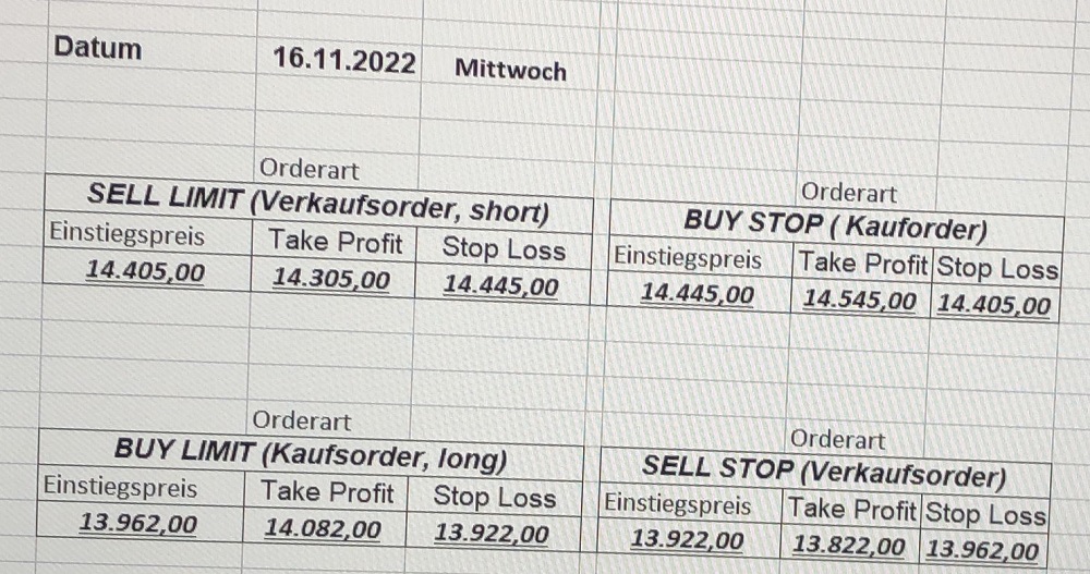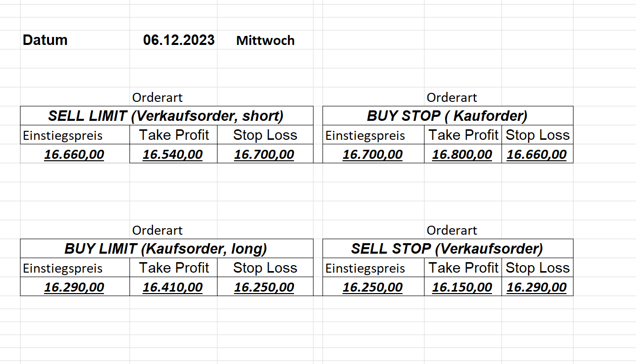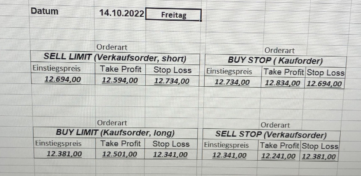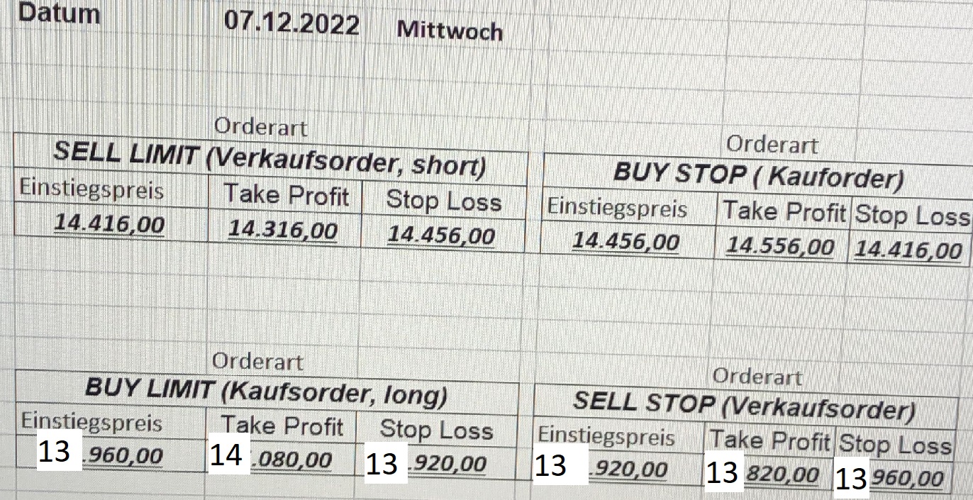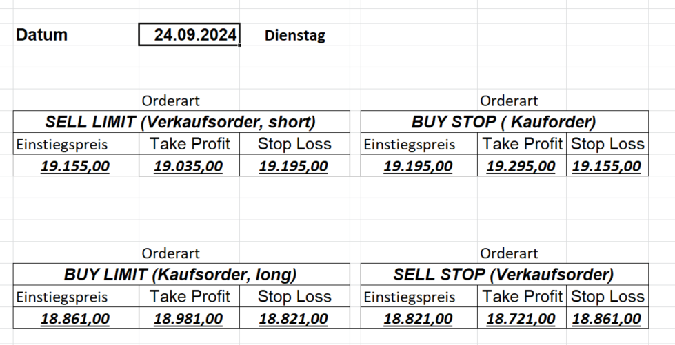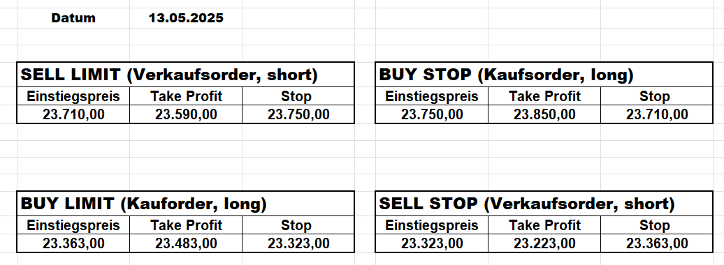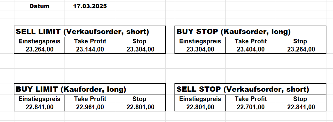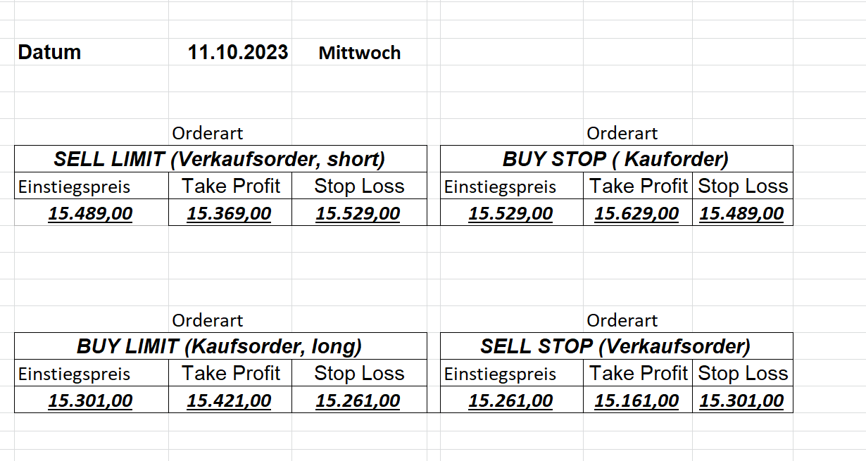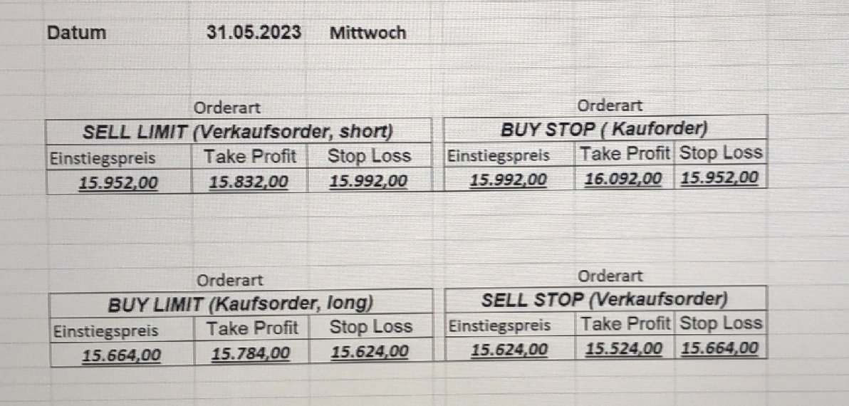 16.5.2023 Platzieren Sie die  Order bis 9:00 Löschen Sie bitte offene Order und Positionen um 21:45 ! Zur Frage der Punktgröße: Beispielrechnung: Bitte immer kurz auf den am weitest entfernten Stopp schauen. Diese Punktzahl sollte nicht mehr als 0,5% bis 1% des Kapitals ausmachen. 15.5.2023 Platzieren Sie die  Order bis 9:00 Löschen Sie bitte offene Order und Positionen um 21:45 ! Zur Frage der Punktgröße: Beispielrechnung: Bitte immer kurz auf den am weitest entfernten Stopp schauen. Diese Punktzahl sollte nicht mehr als 0,5% bis 1% des Kapitals ausmachen. 12.5.2023 Platzieren Sie die  Order bis 9:00 Löschen Sie bitte offene Order und Positionen um 21:45 ! Zur Frage der Punktgröße: Beispielrechnung: Bitte immer kurz auf den am weitest entfernten Stopp schauen. Diese Punktzahl sollte nicht mehr als 0,5% bis 1% des Kapitals ausmachen. 10.5.2023  Platzieren Sie die  Order bis 9:00 Löschen Sie bitte offene Order und Positionen um 21:45 ! Zur Frage der Punktgröße: Beispielrechnung: Bitte immer kurz auf den am weitest entfernten Stopp schauen. Diese Punktzahl sollte nicht mehr als 0,5% bis 1% des Kapitals ausmachen. 9.5.2023 Platzieren Sie die  Order bis 9:00 Löschen Sie bitte offene Order und Positionen um 21:45 ! Zur Frage der Punktgröße: Beispielrechnung: Bitte immer kurz auf den am weitest entfernten Stopp schauen. Diese Punktzahl sollte nicht mehr als 0,5% bis 1% des Kapitals ausmachen.   8.5.2023 Platzieren Sie die  Order bis 9:00 Löschen Sie bitte offene Order und Positionen um 21:45 ! Zur Frage der Punktgröße: Beispielrechnung: Bitte immer kurz auf den am weitest entfernten Stopp schauen. Diese Punktzahl sollte nicht mehr als 0,5% bis 1% des Kapitals ausmachen. 5.5.2023 Platzieren Sie die  Order bis 9:00 Löschen Sie bitte offene Order und Positionen um 21:45 ! Zur Frage der Punktgröße: Beispielrechnung: Bitte immer kurz auf den am weitest entfernten Stopp schauen. Diese Punktzahl sollte nicht mehr als 0,5% bis 1% des Kapitals ausmachen. 4.5.2023 Platzieren Sie die  Order bis 9:00 Löschen Sie bitte offene Order und Positionen um 21:45 ! Zur Frage der Punktgröße: Beispielrechnung: Bitte immer kurz auf den am weitest entfernten Stopp schauen. Diese Punktzahl sollte nicht mehr als 0,5% bis 1% des Kapitals ausmachen. 3.5.2023 Heute abend FED-Sitzung: Wir bleiben heute aus dem Markt! 2.5.2023 Platzieren Sie die  Order bis 9:00 Löschen Sie bitte offene Order und Positionen um 21:45 ! Zur Frage der Punktgröße: Beispielrechnung: Bitte immer kurz auf den am weitest entfernten Stopp schauen. Diese Punktzahl sollte nicht mehr als 0,5% bis 1% des Kapitals ausmachen. 28.4.2023 Platzieren Sie die  Order bis 9:00 Löschen Sie bitte offene Order und Positionen um 21:45 ! Zur Frage der Punktgröße: Beispielrechnung: Bitte immer kurz auf den am weitest entfernten Stopp schauen. Diese Punktzahl sollte nicht mehr als 0,5% bis 1% des Kapitals ausmachen. 27.4.2023 Platzieren Sie die  Order bis 9:00 Löschen Sie bitte offene Order und Positionen um 21:45 ! Zur Frage der Punktgröße: Beispielrechnung: Bitte immer kurz auf den am weitest entfernten Stopp schauen. Diese Punktzahl sollte nicht mehr als 0,5% bis 1% des Kapitals ausmachen. 26.4.2023 Platzieren Sie die  Order bis 9:00 Löschen Sie bitte offene Order und Positionen um 21:45 ! Zur Frage der Punktgröße: Beispielrechnung: Bitte immer kurz auf den am weitest entfernten Stopp schauen. Diese Punktzahl sollte nicht mehr als 0,5% bis 1% des Kapitals ausmachen. 25.4.2023 Platzieren Sie die  Order bis 9:00 Löschen Sie bitte offene Order und Positionen um 21:45 ! Zur Frage der Punktgröße: Beispielrechnung: Bitte immer kurz auf den am weitest entfernten Stopp schauen. Diese Punktzahl sollte nicht mehr als 0,5% bis 1% des Kapitals ausmachen. 24.4.2023 Platzieren Sie die  Order bis 9:00 Löschen Sie bitte offene Order und Positionen um 21:45 ! Zur Frage der Punktgröße: Beispielrechnung: Bitte immer kurz auf den am weitest entfernten Stopp schauen. Diese Punktzahl sollte nicht mehr als 0,5% bis 1% des Kapitals ausmachen. 21.4.2023 Platzieren Sie die  Order bis 9:00 Löschen Sie bitte offene Order und Positionen um 21:45 ! Zur Frage der Punktgröße: Beispielrechnung: Bitte immer kurz auf den am weitest entfernten Stopp schauen. Diese Punktzahl sollte nicht mehr als 0,5% bis 1% des Kapitals ausmachen. Sorry, falscher Wochentag, aber es sind die heutigen Signale!    20.4.2023 Platzieren Sie die  Order bis 9:00 Löschen Sie bitte offene Order und Positionen um 21:45 ! Zur Frage der Punktgröße: Beispielrechnung: Bitte immer kurz auf den am weitest entfernten Stopp schauen. Diese Punktzahl sollte nicht mehr als 0,5% bis 1% des Kapitals ausmachen. 19.4.2023 Platzieren Sie die  Order bis 9:00 Löschen Sie bitte offene Order und Positionen um 21:45 ! Zur Frage der Punktgröße: Beispielrechnung: Bitte immer kurz auf den am weitest entfernten Stopp schauen. Diese Punktzahl sollte nicht mehr als 0,5% bis 1% des Kapitals ausmachen. 18.4.2023 Platzieren Sie die  Order bis 9:00 Löschen Sie bitte offene Order und Positionen um 21:45 ! Zur Frage der Punktgröße: Beispielrechnung: Bitte immer kurz auf den am weitest entfernten Stopp schauen. Diese Punktzahl sollte nicht mehr als 0,5% bis 1% des Kapitals ausmachen.  17.4.2023 Platzieren Sie die  Order bis 9:00 Löschen Sie bitte offene Order und Positionen um 21:45 ! Zur Frage der Punktgröße: Beispielrechnung: Bitte immer kurz auf den am weitest entfernten Stopp schauen. Diese Punktzahl sollte nicht mehr als 0,5% bis 1% des Kapitals ausmachen. 14.4.2023 Platzieren Sie die  Order bis 9:00 Löschen Sie bitte offene Order und Positionen um 21:45 ! Zur Frage der Punktgröße: Beispielrechnung: Bitte immer kurz auf den am weitest entfernten Stopp schauen. Diese Punktzahl sollte nicht mehr als 0,5% bis 1% des Kapitals ausmachen. 13.4.2023 Heute bleiben wir an der Seitenlinie. Aktuell ist der DAX nicht volatil genug!  12.4.2023 Pla