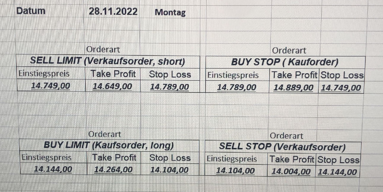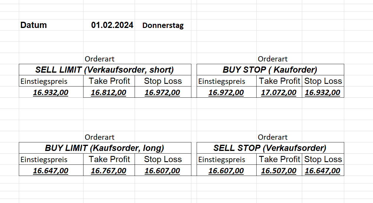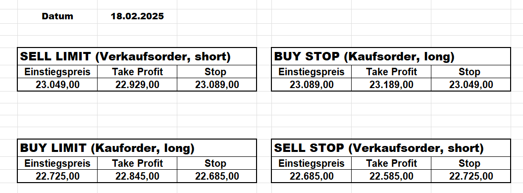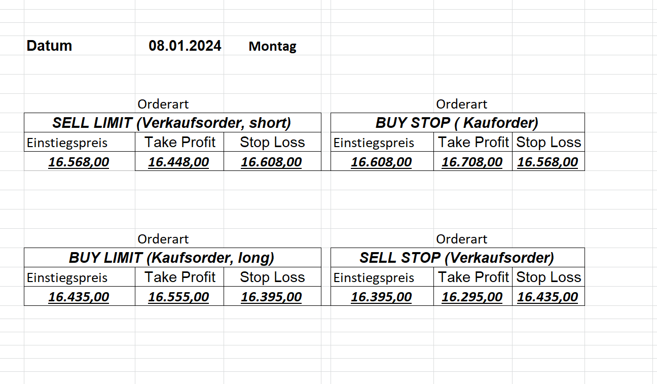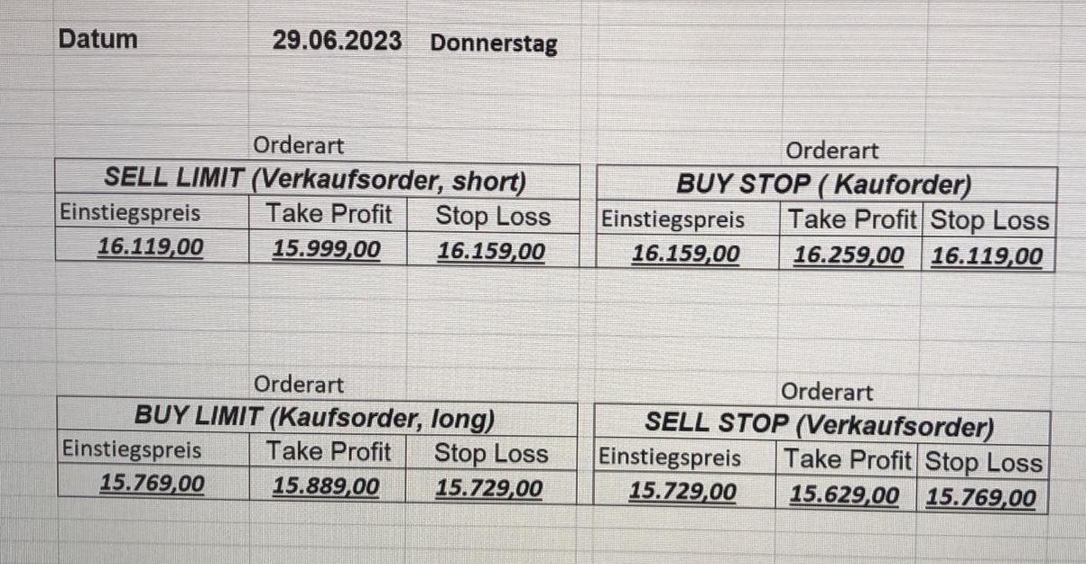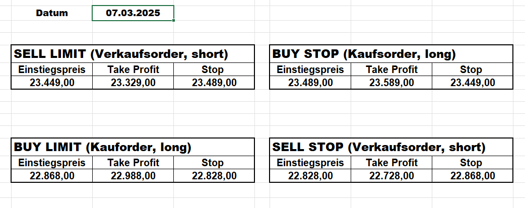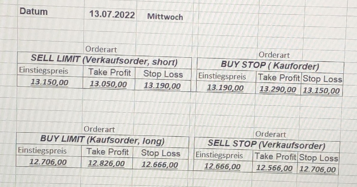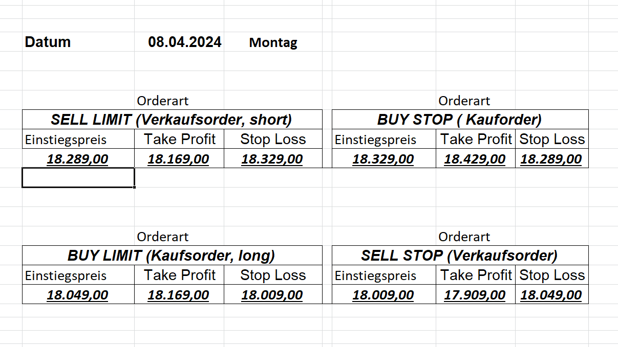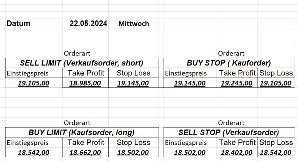 16.5.2023 Platzieren Sie die  Order bis 9:00 Löschen Sie bitte offene Order und Positionen um 21:45 ! Zur Frage der Punktgröße: Beispielrechnung: Bitte immer kurz auf den am weitest entfernten Stopp schauen. Diese Punktzahl sollte nicht mehr als 0,5% bis 1% des Kapitals ausmachen. 15.5.2023 Platzieren Sie die  Order bis 9:00 Löschen Sie bitte offene Order und Positionen um 21:45 ! Zur Frage der Punktgröße: Beispielrechnung: Bitte immer kurz auf den am weitest entfernten Stopp schauen. Diese Punktzahl sollte nicht mehr als 0,5% bis 1% des Kapitals ausmachen. 12.5.2023 Platzieren Sie die  Order bis 9:00 Löschen Sie bitte offene Order und Positionen um 21:45 ! Zur Frage der Punktgröße: Beispielrechnung: Bitte immer kurz auf den am weitest entfernten Stopp schauen. Diese Punktzahl sollte nicht mehr als 0,5% bis 1% des Kapitals ausmachen. 10.5.2023  Platzieren Sie die  Order bis 9:00 Löschen Sie bitte offene Order und Positionen um 21:45 ! Zur Frage der Punktgröße: Beispielrechnung: Bitte immer kurz auf den am weitest entfernten Stopp schauen. Diese Punktzahl sollte nicht mehr als 0,5% bis 1% des Kapitals ausmachen. 9.5.2023 Platzieren Sie die  Order bis 9:00 Löschen Sie bitte offene Order und Positionen um 21:45 ! Zur Frage der Punktgröße: Beispielrechnung: Bitte immer kurz auf den am weitest entfernten Stopp schauen. Diese Punktzahl sollte nicht mehr als 0,5% bis 1% des Kapitals ausmachen.   8.5.2023 Platzieren Sie die  Order bis 9:00 Löschen Sie bitte offene Order und Positionen um 21:45 ! Zur Frage der Punktgröße: Beispielrechnung: Bitte immer kurz auf den am weitest entfernten Stopp schauen. Diese Punktzahl sollte nicht mehr als 0,5% bis 1% des Kapitals ausmachen. 5.5.2023 Platzieren Sie die  Order bis 9:00 Löschen Sie bitte offene Order und Positionen um 21:45 ! Zur Frage der Punktgröße: Beispielrechnung: Bitte immer kurz auf den am weitest entfernten Stopp schauen. Diese Punktzahl sollte nicht mehr als 0,5% bis 1% des Kapitals ausmachen. 4.5.2023 Platzieren Sie die  Order bis 9:00 Löschen Sie bitte offene Order und Positionen um 21:45 ! Zur Frage der Punktgröße: Beispielrechnung: Bitte immer kurz auf den am weitest entfernten Stopp schauen. Diese Punktzahl sollte nicht mehr als 0,5% bis 1% des Kapitals ausmachen. 3.5.2023 Heute abend FED-Sitzung: Wir bleiben heute aus dem Markt! 2.5.2023 Platzieren Sie die  Order bis 9:00 Löschen Sie bitte offene Order und Positionen um 21:45 ! Zur Frage der Punktgröße: Beispielrechnung: Bitte immer kurz auf den am weitest entfernten Stopp schauen. Diese Punktzahl sollte nicht mehr als 0,5% bis 1% des Kapitals ausmachen. 28.4.2023 Platzieren Sie die  Order bis 9:00 Löschen Sie bitte offene Order und Positionen um 21:45 ! Zur Frage der Punktgröße: Beispielrechnung: Bitte immer kurz auf den am weitest entfernten Stopp schauen. Diese Punktzahl sollte nicht mehr als 0,5% bis 1% des Kapitals ausmachen. 27.4.2023 Platzieren Sie die  Order bis 9:00 Löschen Sie bitte offene Order und Positionen um 21:45 ! Zur Frage der Punktgröße: Beispielrechnung: Bitte immer kurz auf den am weitest entfernten Stopp schauen. Diese Punktzahl sollte nicht mehr als 0,5% bis 1% des Kapitals ausmachen. 26.4.2023 Platzieren Sie die  Order bis 9:00 Löschen Sie bitte offene Order und Positionen um 21:45 ! Zur Frage der Punktgröße: Beispielrechnung: Bitte immer kurz auf den am weitest entfernten Stopp schauen. Diese Punktzahl sollte nicht mehr als 0,5% bis 1% des Kapitals ausmachen. 25.4.2023 Platzieren Sie die  Order bis 9:00 Löschen Sie bitte offene Order und Positionen um 21:45 ! Zur Frage der Punktgröße: Beispielrechnung: Bitte immer kurz auf den am weitest entfernten Stopp schauen. Diese Punktzahl sollte nicht mehr als 0,5% bis 1% des Kapitals ausmachen. 24.4.2023 Platzieren Sie die  Order bis 9:00 Löschen Sie bitte offene Order und Positionen um 21:45 ! Zur Frage der Punktgröße: Beispielrechnung: Bitte immer kurz auf den am weitest entfernten Stopp schauen. Diese Punktzahl sollte nicht mehr als 0,5% bis 1% des Kapitals ausmachen. 21.4.2023 Platzieren Sie die  Order bis 9:00 Löschen Sie bitte offene Order und Positionen um 21:45 ! Zur Frage der Punktgröße: Beispielrechnung: Bitte immer kurz auf den am weitest entfernten Stopp schauen. Diese Punktzahl sollte nicht mehr als 0,5% bis 1% des Kapitals ausmachen. Sorry, falscher Wochentag, aber es sind die heutigen Signale!    20.4.2023 Platzieren Sie die  Order bis 9:00 Löschen Sie bitte offene Order und Positionen um 21:45 ! Zur Frage der Punktgröße: Beispielrechnung: Bitte immer kurz auf den am weitest entfernten Stopp schauen. Diese Punktzahl sollte nicht mehr als 0,5% bis 1% des Kapitals ausmachen. 19.4.2023 Platzieren Sie die  Order bis 9:00 Löschen Sie bitte offene Order und Positionen um 21:45 ! Zur Frage der Punktgröße: Beispielrechnung: Bitte immer kurz auf den am weitest entfernten Stopp schauen. Diese Punktzahl sollte nicht mehr als 0,5% bis 1% des Kapitals ausmachen. 18.4.2023 Platzieren Sie die  Order bis 9:00 Löschen Sie bitte offene Order und Positionen um 21:45 ! Zur Frage der Punktgröße: Beispielrechnung: Bitte immer kurz auf den am weitest entfernten Stopp schauen. Diese Punktzahl sollte nicht mehr als 0,5% bis 1% des Kapitals ausmachen.  17.4.2023 Platzieren Sie die  Order bis 9:00 Löschen Sie bitte offene Order und Positionen um 21:45 ! Zur Frage der Punktgröße: Beispielrechnung: Bitte immer kurz auf den am weitest entfernten Stopp schauen. Diese Punktzahl sollte nicht mehr als 0,5% bis 1% des Kapitals ausmachen. 14.4.2023 Platzieren Sie die  Order bis 9:00 Löschen Sie bitte offene Order und Positionen um 21:45 ! Zur Frage der Punktgröße: Beispielrechnung: Bitte immer kurz auf den am weitest entfernten Stopp schauen. Diese Punktzahl sollte nicht mehr als 0,5% bis 1% des Kapitals ausmachen. 13.4.2023 Heute bleiben wir an der Seitenlinie. Aktuell ist der DAX nicht volatil genug!  12.4.2023 Pla