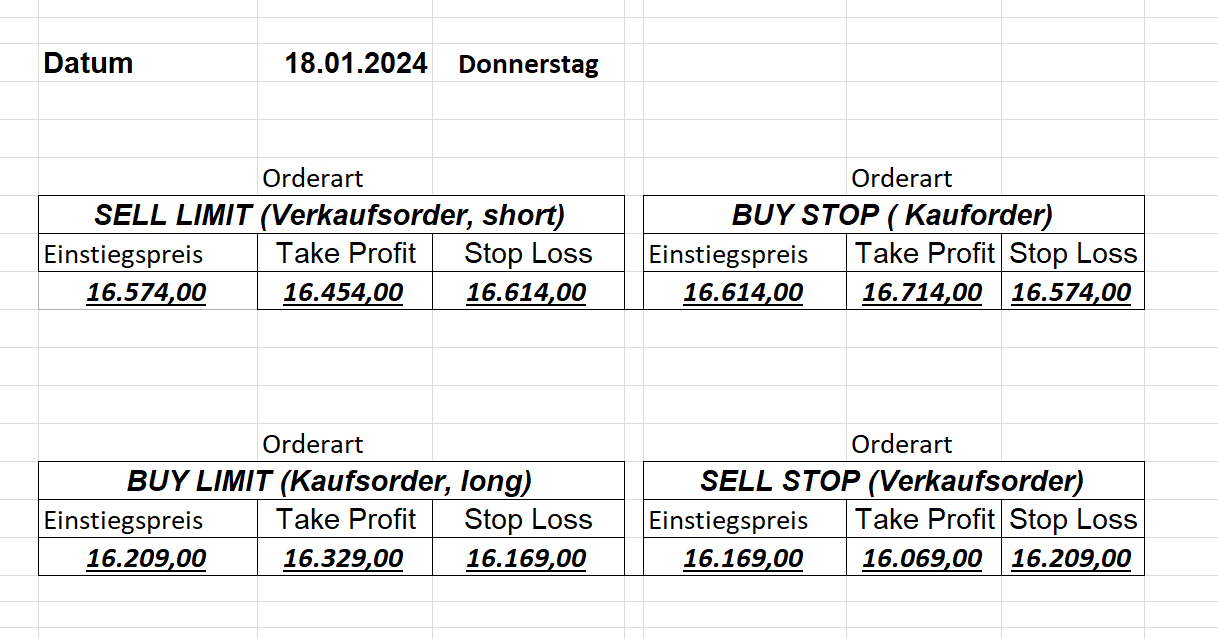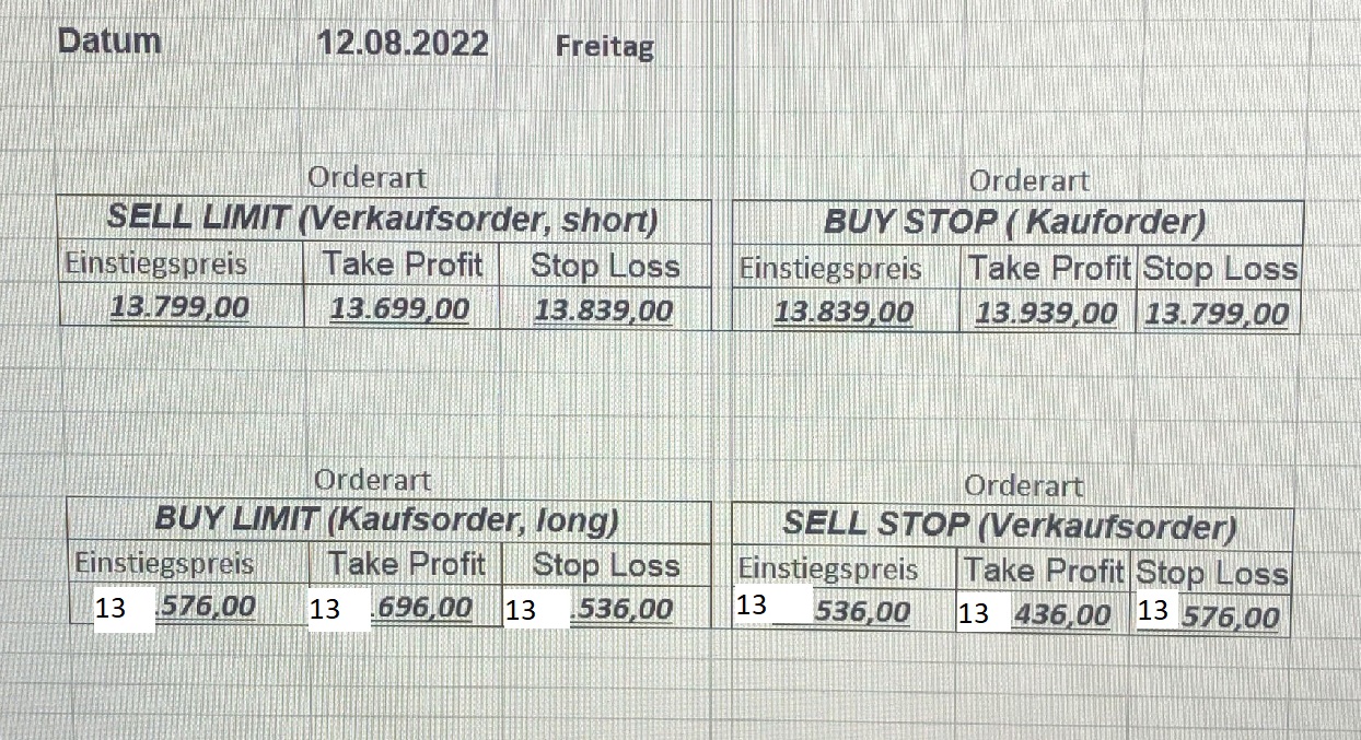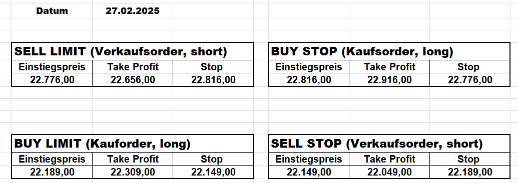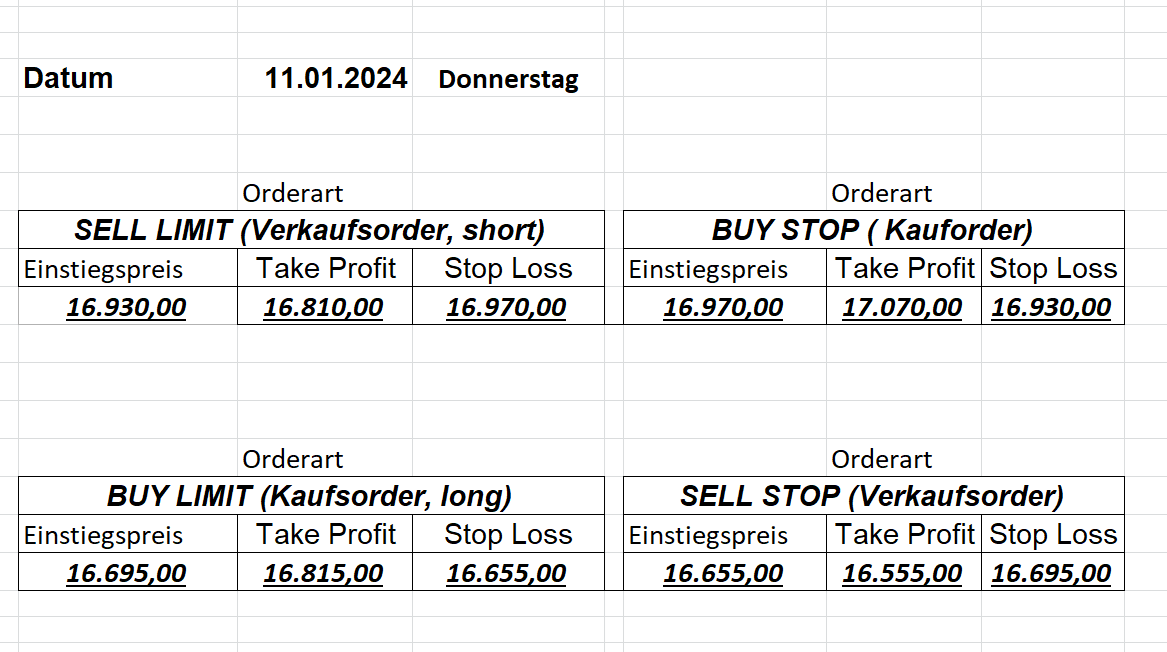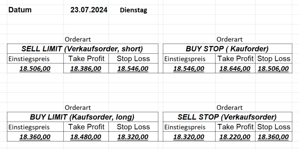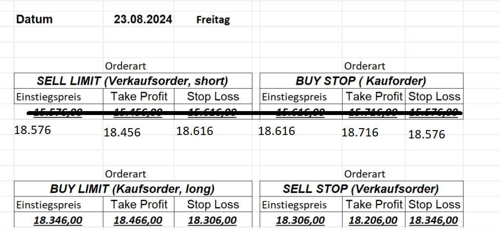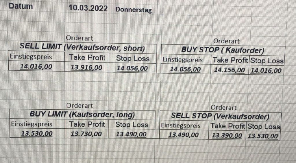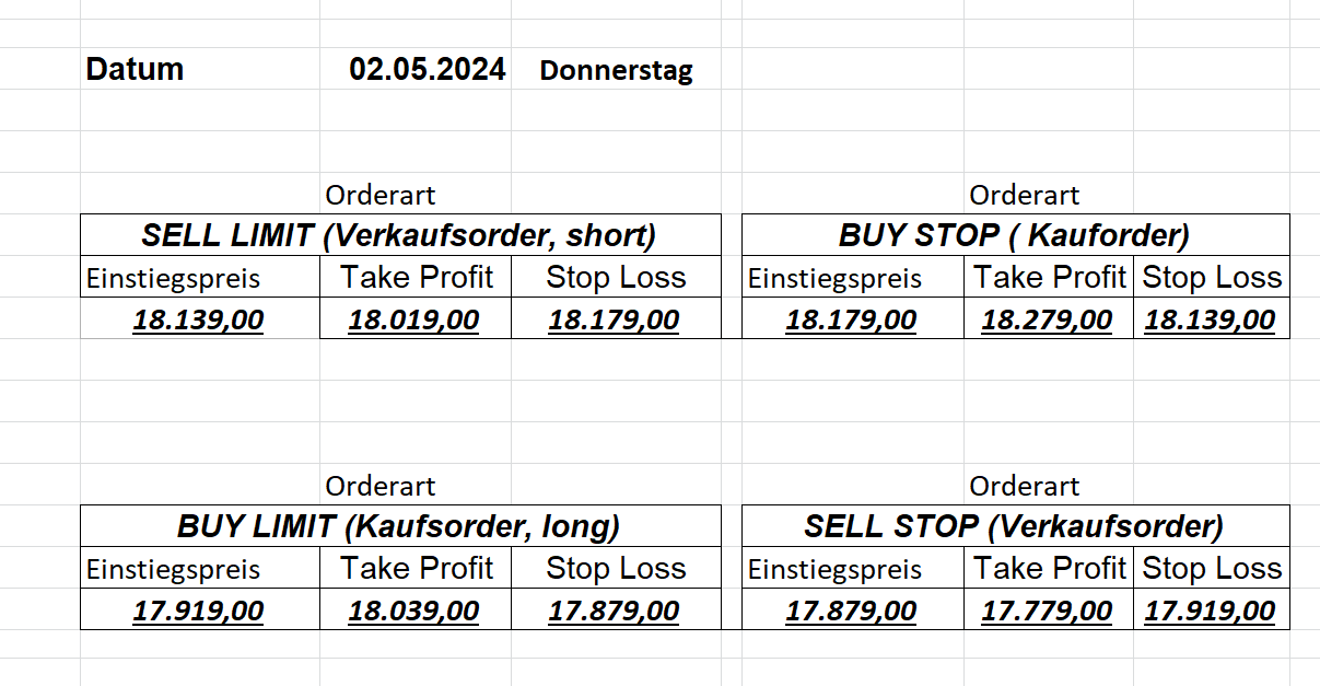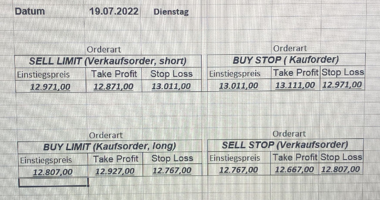 16.5.2023 Platzieren Sie die  Order bis 9:00 Löschen Sie bitte offene Order und Positionen um 21:45 ! Zur Frage der Punktgröße: Beispielrechnung: Bitte immer kurz auf den am weitest entfernten Stopp schauen. Diese Punktzahl sollte nicht mehr als 0,5% bis 1% des Kapitals ausmachen. 15.5.2023 Platzieren Sie die  Order bis 9:00 Löschen Sie bitte offene Order und Positionen um 21:45 ! Zur Frage der Punktgröße: Beispielrechnung: Bitte immer kurz auf den am weitest entfernten Stopp schauen. Diese Punktzahl sollte nicht mehr als 0,5% bis 1% des Kapitals ausmachen. 12.5.2023 Platzieren Sie die  Order bis 9:00 Löschen Sie bitte offene Order und Positionen um 21:45 ! Zur Frage der Punktgröße: Beispielrechnung: Bitte immer kurz auf den am weitest entfernten Stopp schauen. Diese Punktzahl sollte nicht mehr als 0,5% bis 1% des Kapitals ausmachen. 10.5.2023  Platzieren Sie die  Order bis 9:00 Löschen Sie bitte offene Order und Positionen um 21:45 ! Zur Frage der Punktgröße: Beispielrechnung: Bitte immer kurz auf den am weitest entfernten Stopp schauen. Diese Punktzahl sollte nicht mehr als 0,5% bis 1% des Kapitals ausmachen. 9.5.2023 Platzieren Sie die  Order bis 9:00 Löschen Sie bitte offene Order und Positionen um 21:45 ! Zur Frage der Punktgröße: Beispielrechnung: Bitte immer kurz auf den am weitest entfernten Stopp schauen. Diese Punktzahl sollte nicht mehr als 0,5% bis 1% des Kapitals ausmachen.   8.5.2023 Platzieren Sie die  Order bis 9:00 Löschen Sie bitte offene Order und Positionen um 21:45 ! Zur Frage der Punktgröße: Beispielrechnung: Bitte immer kurz auf den am weitest entfernten Stopp schauen. Diese Punktzahl sollte nicht mehr als 0,5% bis 1% des Kapitals ausmachen. 5.5.2023 Platzieren Sie die  Order bis 9:00 Löschen Sie bitte offene Order und Positionen um 21:45 ! Zur Frage der Punktgröße: Beispielrechnung: Bitte immer kurz auf den am weitest entfernten Stopp schauen. Diese Punktzahl sollte nicht mehr als 0,5% bis 1% des Kapitals ausmachen. 4.5.2023 Platzieren Sie die  Order bis 9:00 Löschen Sie bitte offene Order und Positionen um 21:45 ! Zur Frage der Punktgröße: Beispielrechnung: Bitte immer kurz auf den am weitest entfernten Stopp schauen. Diese Punktzahl sollte nicht mehr als 0,5% bis 1% des Kapitals ausmachen. 3.5.2023 Heute abend FED-Sitzung: Wir bleiben heute aus dem Markt! 2.5.2023 Platzieren Sie die  Order bis 9:00 Löschen Sie bitte offene Order und Positionen um 21:45 ! Zur Frage der Punktgröße: Beispielrechnung: Bitte immer kurz auf den am weitest entfernten Stopp schauen. Diese Punktzahl sollte nicht mehr als 0,5% bis 1% des Kapitals ausmachen. 28.4.2023 Platzieren Sie die  Order bis 9:00 Löschen Sie bitte offene Order und Positionen um 21:45 ! Zur Frage der Punktgröße: Beispielrechnung: Bitte immer kurz auf den am weitest entfernten Stopp schauen. Diese Punktzahl sollte nicht mehr als 0,5% bis 1% des Kapitals ausmachen. 27.4.2023 Platzieren Sie die  Order bis 9:00 Löschen Sie bitte offene Order und Positionen um 21:45 ! Zur Frage der Punktgröße: Beispielrechnung: Bitte immer kurz auf den am weitest entfernten Stopp schauen. Diese Punktzahl sollte nicht mehr als 0,5% bis 1% des Kapitals ausmachen. 26.4.2023 Platzieren Sie die  Order bis 9:00 Löschen Sie bitte offene Order und Positionen um 21:45 ! Zur Frage der Punktgröße: Beispielrechnung: Bitte immer kurz auf den am weitest entfernten Stopp schauen. Diese Punktzahl sollte nicht mehr als 0,5% bis 1% des Kapitals ausmachen. 25.4.2023 Platzieren Sie die  Order bis 9:00 Löschen Sie bitte offene Order und Positionen um 21:45 ! Zur Frage der Punktgröße: Beispielrechnung: Bitte immer kurz auf den am weitest entfernten Stopp schauen. Diese Punktzahl sollte nicht mehr als 0,5% bis 1% des Kapitals ausmachen. 24.4.2023 Platzieren Sie die  Order bis 9:00 Löschen Sie bitte offene Order und Positionen um 21:45 ! Zur Frage der Punktgröße: Beispielrechnung: Bitte immer kurz auf den am weitest entfernten Stopp schauen. Diese Punktzahl sollte nicht mehr als 0,5% bis 1% des Kapitals ausmachen. 21.4.2023 Platzieren Sie die  Order bis 9:00 Löschen Sie bitte offene Order und Positionen um 21:45 ! Zur Frage der Punktgröße: Beispielrechnung: Bitte immer kurz auf den am weitest entfernten Stopp schauen. Diese Punktzahl sollte nicht mehr als 0,5% bis 1% des Kapitals ausmachen. Sorry, falscher Wochentag, aber es sind die heutigen Signale!    20.4.2023 Platzieren Sie die  Order bis 9:00 Löschen Sie bitte offene Order und Positionen um 21:45 ! Zur Frage der Punktgröße: Beispielrechnung: Bitte immer kurz auf den am weitest entfernten Stopp schauen. Diese Punktzahl sollte nicht mehr als 0,5% bis 1% des Kapitals ausmachen. 19.4.2023 Platzieren Sie die  Order bis 9:00 Löschen Sie bitte offene Order und Positionen um 21:45 ! Zur Frage der Punktgröße: Beispielrechnung: Bitte immer kurz auf den am weitest entfernten Stopp schauen. Diese Punktzahl sollte nicht mehr als 0,5% bis 1% des Kapitals ausmachen. 18.4.2023 Platzieren Sie die  Order bis 9:00 Löschen Sie bitte offene Order und Positionen um 21:45 ! Zur Frage der Punktgröße: Beispielrechnung: Bitte immer kurz auf den am weitest entfernten Stopp schauen. Diese Punktzahl sollte nicht mehr als 0,5% bis 1% des Kapitals ausmachen.  17.4.2023 Platzieren Sie die  Order bis 9:00 Löschen Sie bitte offene Order und Positionen um 21:45 ! Zur Frage der Punktgröße: Beispielrechnung: Bitte immer kurz auf den am weitest entfernten Stopp schauen. Diese Punktzahl sollte nicht mehr als 0,5% bis 1% des Kapitals ausmachen. 14.4.2023 Platzieren Sie die  Order bis 9:00 Löschen Sie bitte offene Order und Positionen um 21:45 ! Zur Frage der Punktgröße: Beispielrechnung: Bitte immer kurz auf den am weitest entfernten Stopp schauen. Diese Punktzahl sollte nicht mehr als 0,5% bis 1% des Kapitals ausmachen. 13.4.2023 Heute bleiben wir an der Seitenlinie. Aktuell ist der DAX nicht volatil genug!  12.4.2023 Pla