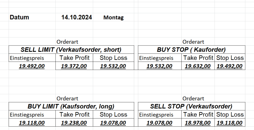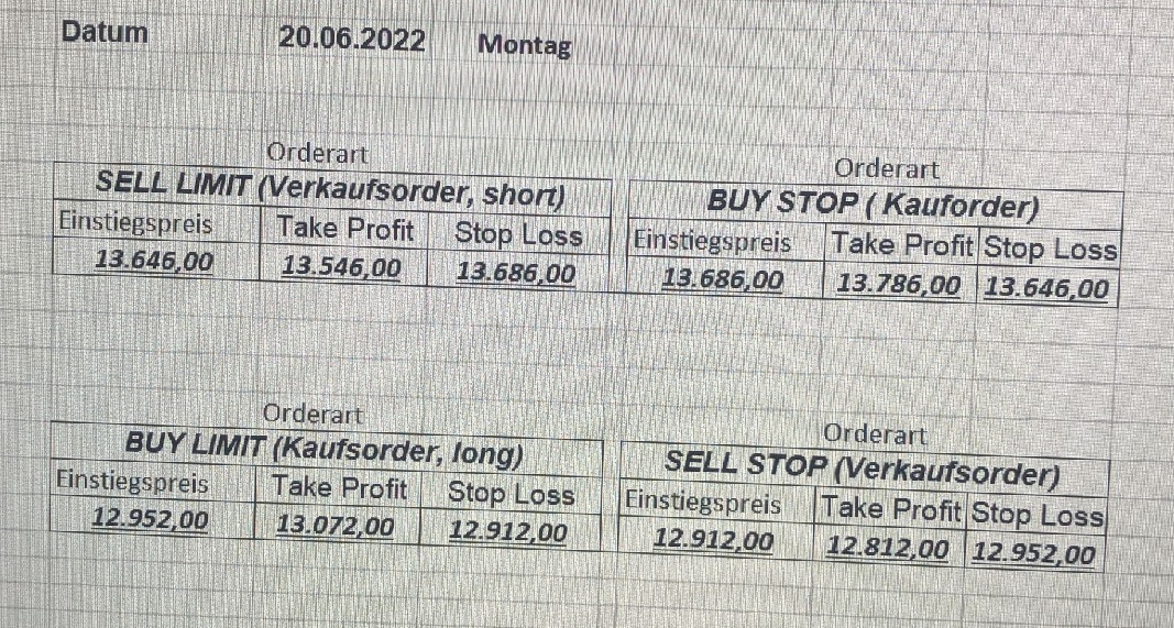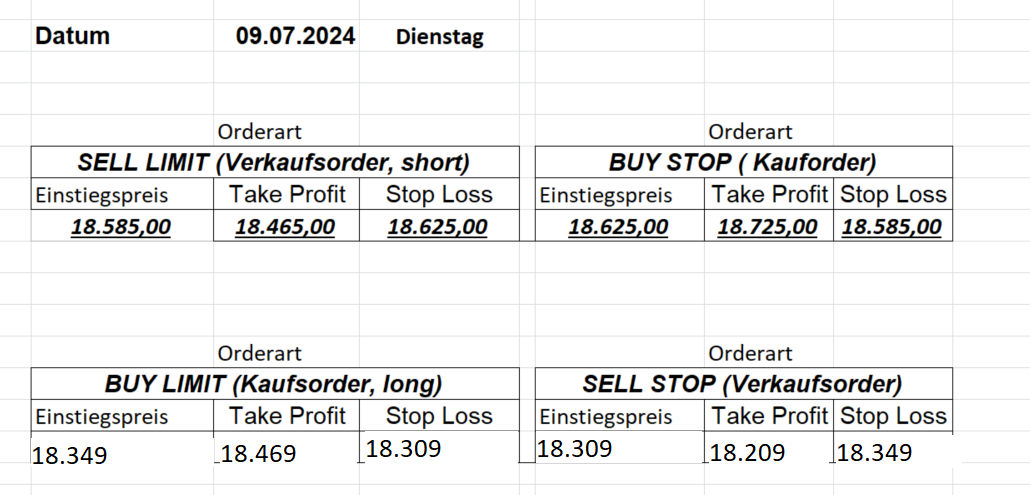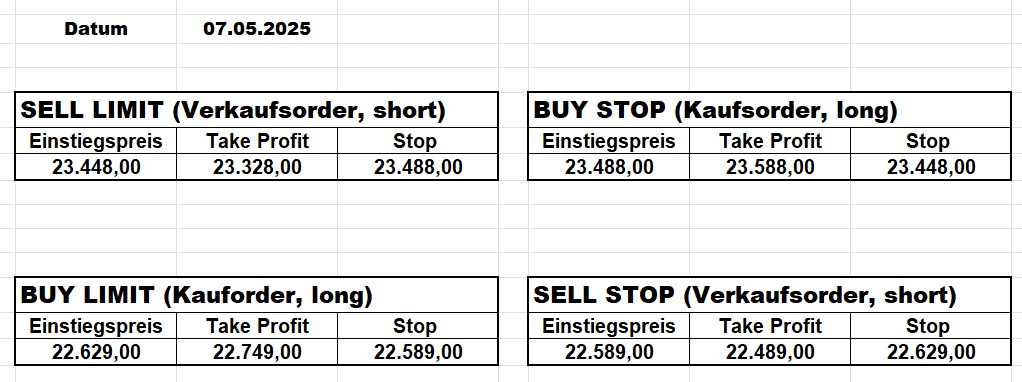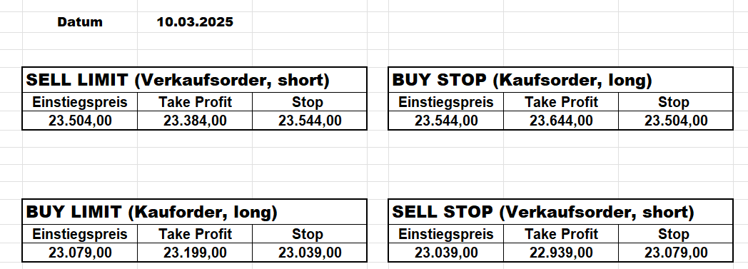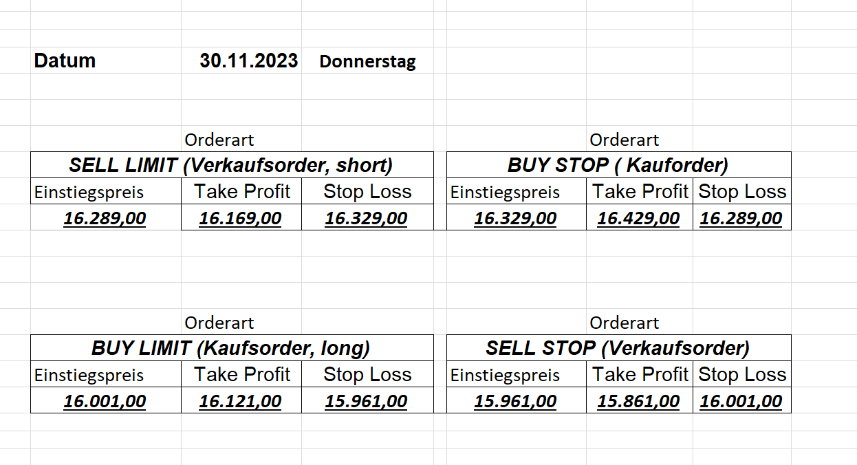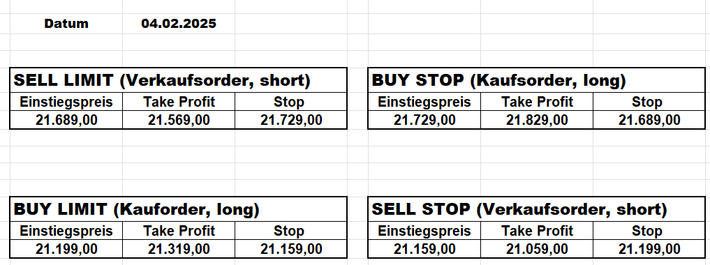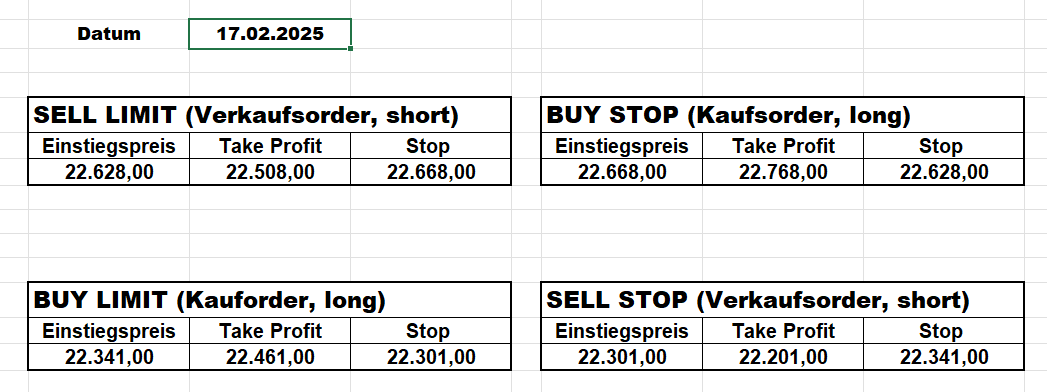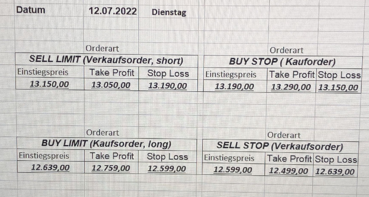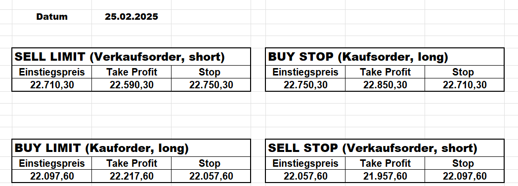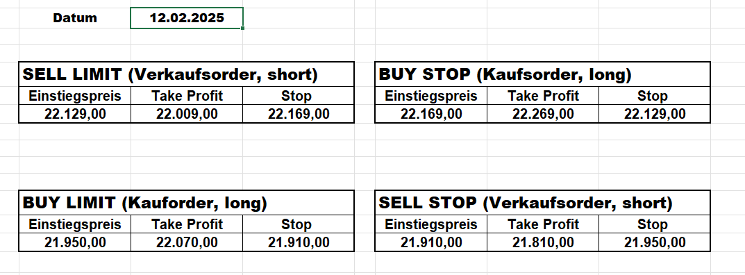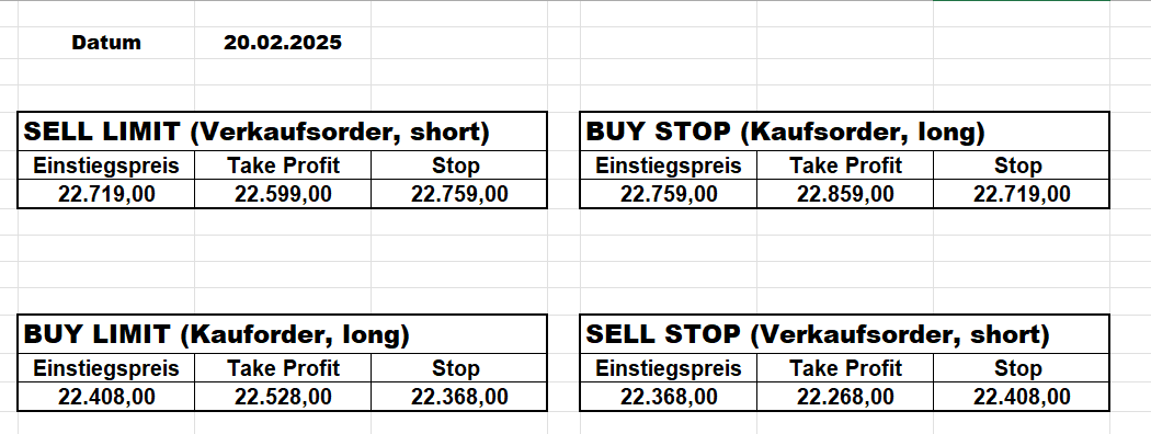 16.5.2023 Platzieren Sie die  Order bis 9:00 Löschen Sie bitte offene Order und Positionen um 21:45 ! Zur Frage der Punktgröße: Beispielrechnung: Bitte immer kurz auf den am weitest entfernten Stopp schauen. Diese Punktzahl sollte nicht mehr als 0,5% bis 1% des Kapitals ausmachen. 15.5.2023 Platzieren Sie die  Order bis 9:00 Löschen Sie bitte offene Order und Positionen um 21:45 ! Zur Frage der Punktgröße: Beispielrechnung: Bitte immer kurz auf den am weitest entfernten Stopp schauen. Diese Punktzahl sollte nicht mehr als 0,5% bis 1% des Kapitals ausmachen. 12.5.2023 Platzieren Sie die  Order bis 9:00 Löschen Sie bitte offene Order und Positionen um 21:45 ! Zur Frage der Punktgröße: Beispielrechnung: Bitte immer kurz auf den am weitest entfernten Stopp schauen. Diese Punktzahl sollte nicht mehr als 0,5% bis 1% des Kapitals ausmachen. 10.5.2023  Platzieren Sie die  Order bis 9:00 Löschen Sie bitte offene Order und Positionen um 21:45 ! Zur Frage der Punktgröße: Beispielrechnung: Bitte immer kurz auf den am weitest entfernten Stopp schauen. Diese Punktzahl sollte nicht mehr als 0,5% bis 1% des Kapitals ausmachen. 9.5.2023 Platzieren Sie die  Order bis 9:00 Löschen Sie bitte offene Order und Positionen um 21:45 ! Zur Frage der Punktgröße: Beispielrechnung: Bitte immer kurz auf den am weitest entfernten Stopp schauen. Diese Punktzahl sollte nicht mehr als 0,5% bis 1% des Kapitals ausmachen.   8.5.2023 Platzieren Sie die  Order bis 9:00 Löschen Sie bitte offene Order und Positionen um 21:45 ! Zur Frage der Punktgröße: Beispielrechnung: Bitte immer kurz auf den am weitest entfernten Stopp schauen. Diese Punktzahl sollte nicht mehr als 0,5% bis 1% des Kapitals ausmachen. 5.5.2023 Platzieren Sie die  Order bis 9:00 Löschen Sie bitte offene Order und Positionen um 21:45 ! Zur Frage der Punktgröße: Beispielrechnung: Bitte immer kurz auf den am weitest entfernten Stopp schauen. Diese Punktzahl sollte nicht mehr als 0,5% bis 1% des Kapitals ausmachen. 4.5.2023 Platzieren Sie die  Order bis 9:00 Löschen Sie bitte offene Order und Positionen um 21:45 ! Zur Frage der Punktgröße: Beispielrechnung: Bitte immer kurz auf den am weitest entfernten Stopp schauen. Diese Punktzahl sollte nicht mehr als 0,5% bis 1% des Kapitals ausmachen. 3.5.2023 Heute abend FED-Sitzung: Wir bleiben heute aus dem Markt! 2.5.2023 Platzieren Sie die  Order bis 9:00 Löschen Sie bitte offene Order und Positionen um 21:45 ! Zur Frage der Punktgröße: Beispielrechnung: Bitte immer kurz auf den am weitest entfernten Stopp schauen. Diese Punktzahl sollte nicht mehr als 0,5% bis 1% des Kapitals ausmachen. 28.4.2023 Platzieren Sie die  Order bis 9:00 Löschen Sie bitte offene Order und Positionen um 21:45 ! Zur Frage der Punktgröße: Beispielrechnung: Bitte immer kurz auf den am weitest entfernten Stopp schauen. Diese Punktzahl sollte nicht mehr als 0,5% bis 1% des Kapitals ausmachen. 27.4.2023 Platzieren Sie die  Order bis 9:00 Löschen Sie bitte offene Order und Positionen um 21:45 ! Zur Frage der Punktgröße: Beispielrechnung: Bitte immer kurz auf den am weitest entfernten Stopp schauen. Diese Punktzahl sollte nicht mehr als 0,5% bis 1% des Kapitals ausmachen. 26.4.2023 Platzieren Sie die  Order bis 9:00 Löschen Sie bitte offene Order und Positionen um 21:45 ! Zur Frage der Punktgröße: Beispielrechnung: Bitte immer kurz auf den am weitest entfernten Stopp schauen. Diese Punktzahl sollte nicht mehr als 0,5% bis 1% des Kapitals ausmachen. 25.4.2023 Platzieren Sie die  Order bis 9:00 Löschen Sie bitte offene Order und Positionen um 21:45 ! Zur Frage der Punktgröße: Beispielrechnung: Bitte immer kurz auf den am weitest entfernten Stopp schauen. Diese Punktzahl sollte nicht mehr als 0,5% bis 1% des Kapitals ausmachen. 24.4.2023 Platzieren Sie die  Order bis 9:00 Löschen Sie bitte offene Order und Positionen um 21:45 ! Zur Frage der Punktgröße: Beispielrechnung: Bitte immer kurz auf den am weitest entfernten Stopp schauen. Diese Punktzahl sollte nicht mehr als 0,5% bis 1% des Kapitals ausmachen. 21.4.2023 Platzieren Sie die  Order bis 9:00 Löschen Sie bitte offene Order und Positionen um 21:45 ! Zur Frage der Punktgröße: Beispielrechnung: Bitte immer kurz auf den am weitest entfernten Stopp schauen. Diese Punktzahl sollte nicht mehr als 0,5% bis 1% des Kapitals ausmachen. Sorry, falscher Wochentag, aber es sind die heutigen Signale!    20.4.2023 Platzieren Sie die  Order bis 9:00 Löschen Sie bitte offene Order und Positionen um 21:45 ! Zur Frage der Punktgröße: Beispielrechnung: Bitte immer kurz auf den am weitest entfernten Stopp schauen. Diese Punktzahl sollte nicht mehr als 0,5% bis 1% des Kapitals ausmachen. 19.4.2023 Platzieren Sie die  Order bis 9:00 Löschen Sie bitte offene Order und Positionen um 21:45 ! Zur Frage der Punktgröße: Beispielrechnung: Bitte immer kurz auf den am weitest entfernten Stopp schauen. Diese Punktzahl sollte nicht mehr als 0,5% bis 1% des Kapitals ausmachen. 18.4.2023 Platzieren Sie die  Order bis 9:00 Löschen Sie bitte offene Order und Positionen um 21:45 ! Zur Frage der Punktgröße: Beispielrechnung: Bitte immer kurz auf den am weitest entfernten Stopp schauen. Diese Punktzahl sollte nicht mehr als 0,5% bis 1% des Kapitals ausmachen.  17.4.2023 Platzieren Sie die  Order bis 9:00 Löschen Sie bitte offene Order und Positionen um 21:45 ! Zur Frage der Punktgröße: Beispielrechnung: Bitte immer kurz auf den am weitest entfernten Stopp schauen. Diese Punktzahl sollte nicht mehr als 0,5% bis 1% des Kapitals ausmachen. 14.4.2023 Platzieren Sie die  Order bis 9:00 Löschen Sie bitte offene Order und Positionen um 21:45 ! Zur Frage der Punktgröße: Beispielrechnung: Bitte immer kurz auf den am weitest entfernten Stopp schauen. Diese Punktzahl sollte nicht mehr als 0,5% bis 1% des Kapitals ausmachen. 13.4.2023 Heute bleiben wir an der Seitenlinie. Aktuell ist der DAX nicht volatil genug!  12.4.2023 Pla