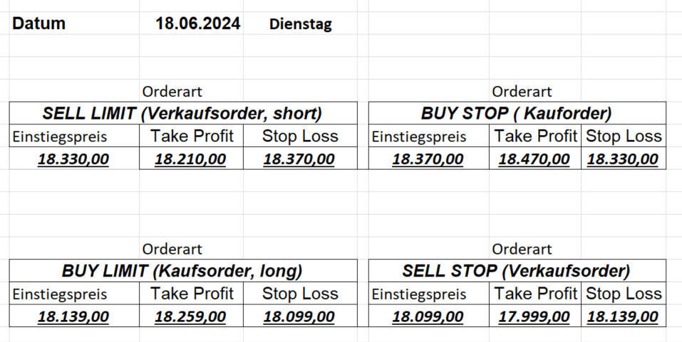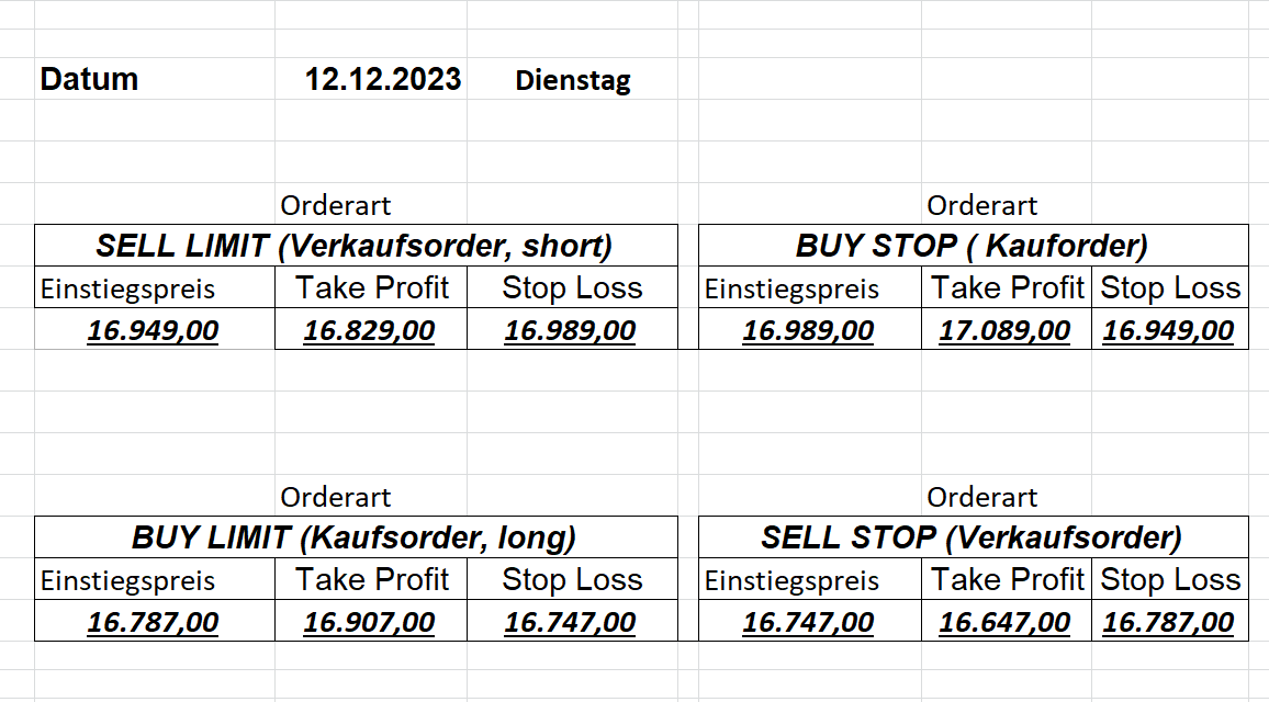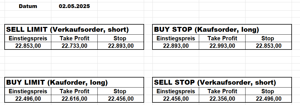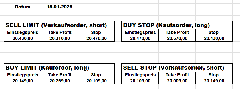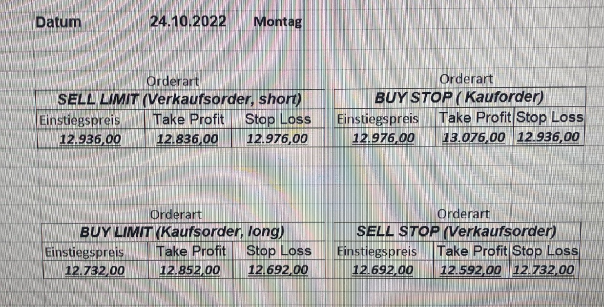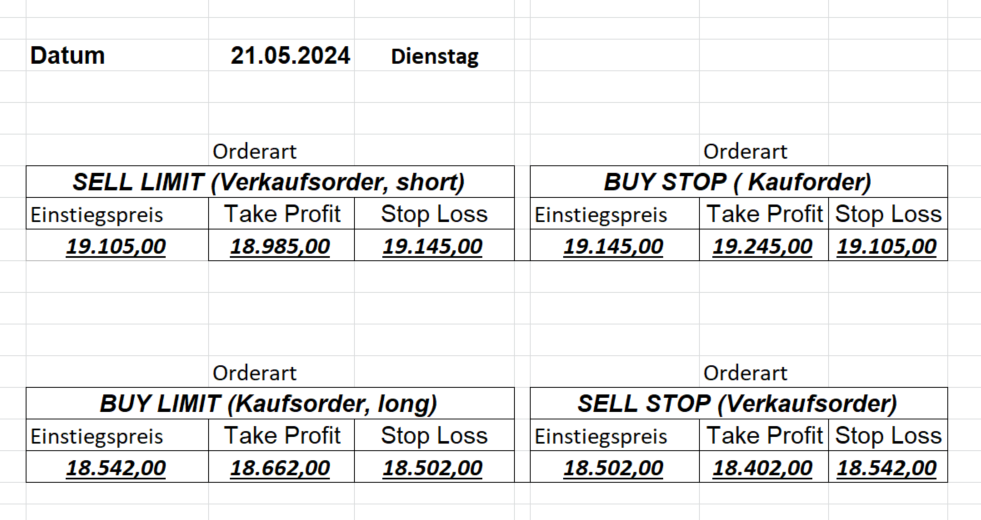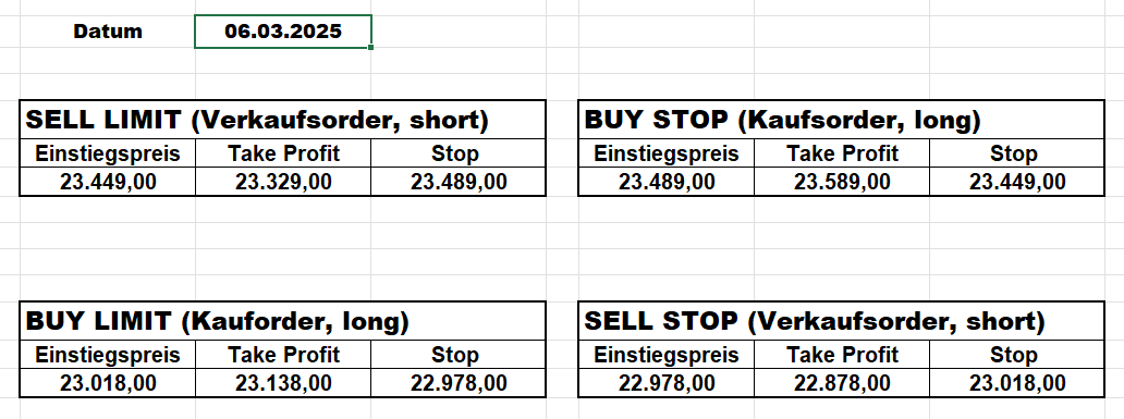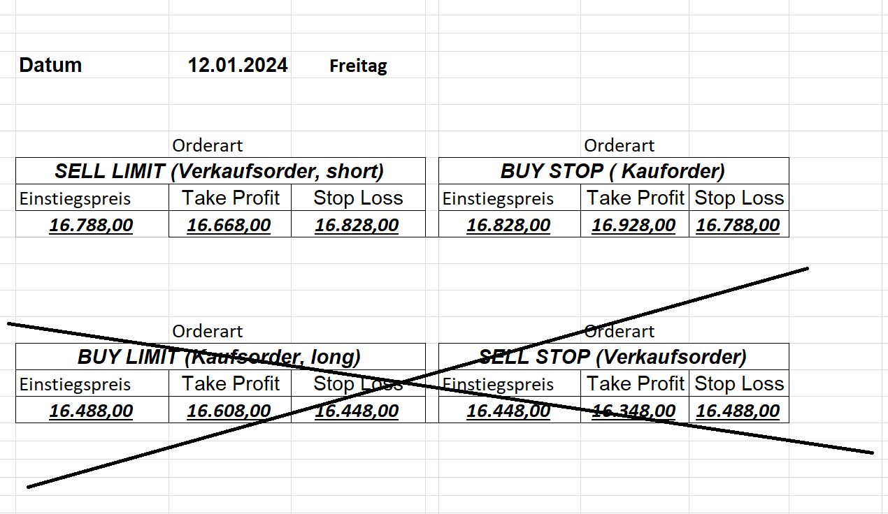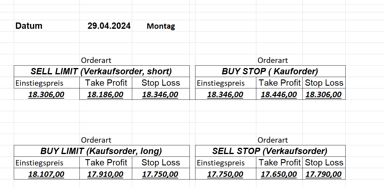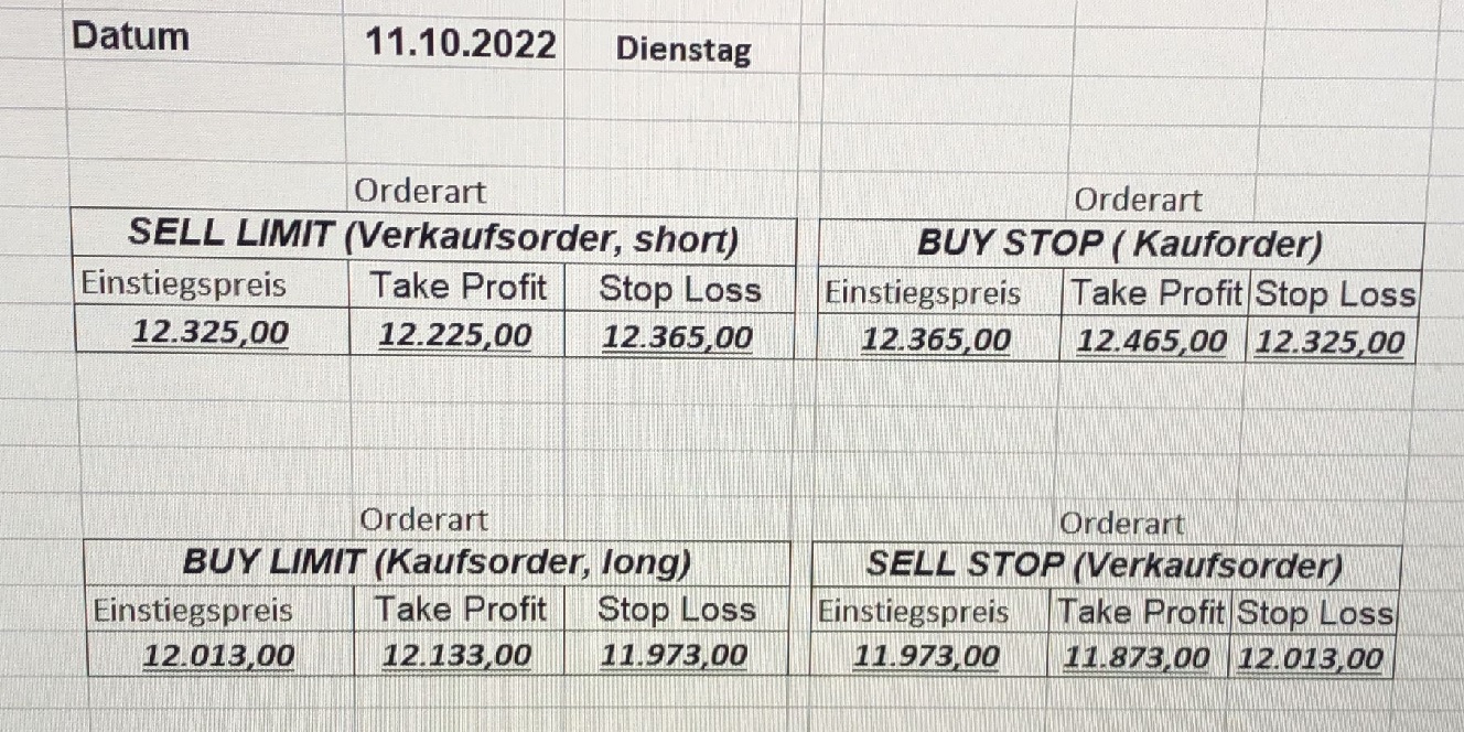 16.5.2023 Platzieren Sie die  Order bis 9:00 Löschen Sie bitte offene Order und Positionen um 21:45 ! Zur Frage der Punktgröße: Beispielrechnung: Bitte immer kurz auf den am weitest entfernten Stopp schauen. Diese Punktzahl sollte nicht mehr als 0,5% bis 1% des Kapitals ausmachen. 15.5.2023 Platzieren Sie die  Order bis 9:00 Löschen Sie bitte offene Order und Positionen um 21:45 ! Zur Frage der Punktgröße: Beispielrechnung: Bitte immer kurz auf den am weitest entfernten Stopp schauen. Diese Punktzahl sollte nicht mehr als 0,5% bis 1% des Kapitals ausmachen. 12.5.2023 Platzieren Sie die  Order bis 9:00 Löschen Sie bitte offene Order und Positionen um 21:45 ! Zur Frage der Punktgröße: Beispielrechnung: Bitte immer kurz auf den am weitest entfernten Stopp schauen. Diese Punktzahl sollte nicht mehr als 0,5% bis 1% des Kapitals ausmachen. 10.5.2023  Platzieren Sie die  Order bis 9:00 Löschen Sie bitte offene Order und Positionen um 21:45 ! Zur Frage der Punktgröße: Beispielrechnung: Bitte immer kurz auf den am weitest entfernten Stopp schauen. Diese Punktzahl sollte nicht mehr als 0,5% bis 1% des Kapitals ausmachen. 9.5.2023 Platzieren Sie die  Order bis 9:00 Löschen Sie bitte offene Order und Positionen um 21:45 ! Zur Frage der Punktgröße: Beispielrechnung: Bitte immer kurz auf den am weitest entfernten Stopp schauen. Diese Punktzahl sollte nicht mehr als 0,5% bis 1% des Kapitals ausmachen.   8.5.2023 Platzieren Sie die  Order bis 9:00 Löschen Sie bitte offene Order und Positionen um 21:45 ! Zur Frage der Punktgröße: Beispielrechnung: Bitte immer kurz auf den am weitest entfernten Stopp schauen. Diese Punktzahl sollte nicht mehr als 0,5% bis 1% des Kapitals ausmachen. 5.5.2023 Platzieren Sie die  Order bis 9:00 Löschen Sie bitte offene Order und Positionen um 21:45 ! Zur Frage der Punktgröße: Beispielrechnung: Bitte immer kurz auf den am weitest entfernten Stopp schauen. Diese Punktzahl sollte nicht mehr als 0,5% bis 1% des Kapitals ausmachen. 4.5.2023 Platzieren Sie die  Order bis 9:00 Löschen Sie bitte offene Order und Positionen um 21:45 ! Zur Frage der Punktgröße: Beispielrechnung: Bitte immer kurz auf den am weitest entfernten Stopp schauen. Diese Punktzahl sollte nicht mehr als 0,5% bis 1% des Kapitals ausmachen. 3.5.2023 Heute abend FED-Sitzung: Wir bleiben heute aus dem Markt! 2.5.2023 Platzieren Sie die  Order bis 9:00 Löschen Sie bitte offene Order und Positionen um 21:45 ! Zur Frage der Punktgröße: Beispielrechnung: Bitte immer kurz auf den am weitest entfernten Stopp schauen. Diese Punktzahl sollte nicht mehr als 0,5% bis 1% des Kapitals ausmachen. 28.4.2023 Platzieren Sie die  Order bis 9:00 Löschen Sie bitte offene Order und Positionen um 21:45 ! Zur Frage der Punktgröße: Beispielrechnung: Bitte immer kurz auf den am weitest entfernten Stopp schauen. Diese Punktzahl sollte nicht mehr als 0,5% bis 1% des Kapitals ausmachen. 27.4.2023 Platzieren Sie die  Order bis 9:00 Löschen Sie bitte offene Order und Positionen um 21:45 ! Zur Frage der Punktgröße: Beispielrechnung: Bitte immer kurz auf den am weitest entfernten Stopp schauen. Diese Punktzahl sollte nicht mehr als 0,5% bis 1% des Kapitals ausmachen. 26.4.2023 Platzieren Sie die  Order bis 9:00 Löschen Sie bitte offene Order und Positionen um 21:45 ! Zur Frage der Punktgröße: Beispielrechnung: Bitte immer kurz auf den am weitest entfernten Stopp schauen. Diese Punktzahl sollte nicht mehr als 0,5% bis 1% des Kapitals ausmachen. 25.4.2023 Platzieren Sie die  Order bis 9:00 Löschen Sie bitte offene Order und Positionen um 21:45 ! Zur Frage der Punktgröße: Beispielrechnung: Bitte immer kurz auf den am weitest entfernten Stopp schauen. Diese Punktzahl sollte nicht mehr als 0,5% bis 1% des Kapitals ausmachen. 24.4.2023 Platzieren Sie die  Order bis 9:00 Löschen Sie bitte offene Order und Positionen um 21:45 ! Zur Frage der Punktgröße: Beispielrechnung: Bitte immer kurz auf den am weitest entfernten Stopp schauen. Diese Punktzahl sollte nicht mehr als 0,5% bis 1% des Kapitals ausmachen. 21.4.2023 Platzieren Sie die  Order bis 9:00 Löschen Sie bitte offene Order und Positionen um 21:45 ! Zur Frage der Punktgröße: Beispielrechnung: Bitte immer kurz auf den am weitest entfernten Stopp schauen. Diese Punktzahl sollte nicht mehr als 0,5% bis 1% des Kapitals ausmachen. Sorry, falscher Wochentag, aber es sind die heutigen Signale!    20.4.2023 Platzieren Sie die  Order bis 9:00 Löschen Sie bitte offene Order und Positionen um 21:45 ! Zur Frage der Punktgröße: Beispielrechnung: Bitte immer kurz auf den am weitest entfernten Stopp schauen. Diese Punktzahl sollte nicht mehr als 0,5% bis 1% des Kapitals ausmachen. 19.4.2023 Platzieren Sie die  Order bis 9:00 Löschen Sie bitte offene Order und Positionen um 21:45 ! Zur Frage der Punktgröße: Beispielrechnung: Bitte immer kurz auf den am weitest entfernten Stopp schauen. Diese Punktzahl sollte nicht mehr als 0,5% bis 1% des Kapitals ausmachen. 18.4.2023 Platzieren Sie die  Order bis 9:00 Löschen Sie bitte offene Order und Positionen um 21:45 ! Zur Frage der Punktgröße: Beispielrechnung: Bitte immer kurz auf den am weitest entfernten Stopp schauen. Diese Punktzahl sollte nicht mehr als 0,5% bis 1% des Kapitals ausmachen.  17.4.2023 Platzieren Sie die  Order bis 9:00 Löschen Sie bitte offene Order und Positionen um 21:45 ! Zur Frage der Punktgröße: Beispielrechnung: Bitte immer kurz auf den am weitest entfernten Stopp schauen. Diese Punktzahl sollte nicht mehr als 0,5% bis 1% des Kapitals ausmachen. 14.4.2023 Platzieren Sie die  Order bis 9:00 Löschen Sie bitte offene Order und Positionen um 21:45 ! Zur Frage der Punktgröße: Beispielrechnung: Bitte immer kurz auf den am weitest entfernten Stopp schauen. Diese Punktzahl sollte nicht mehr als 0,5% bis 1% des Kapitals ausmachen. 13.4.2023 Heute bleiben wir an der Seitenlinie. Aktuell ist der DAX nicht volatil genug!  12.4.2023 Pla