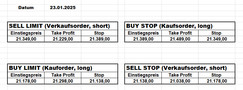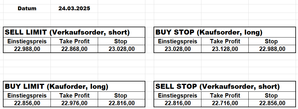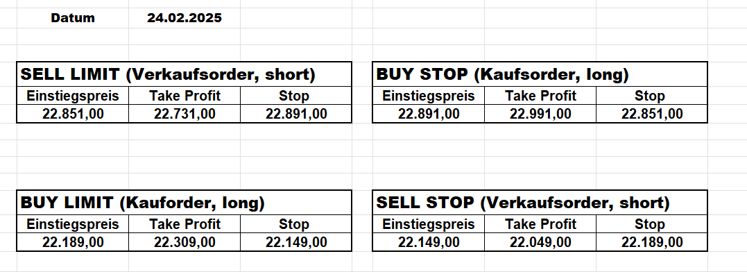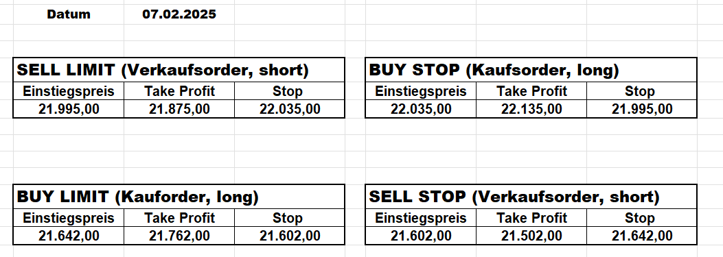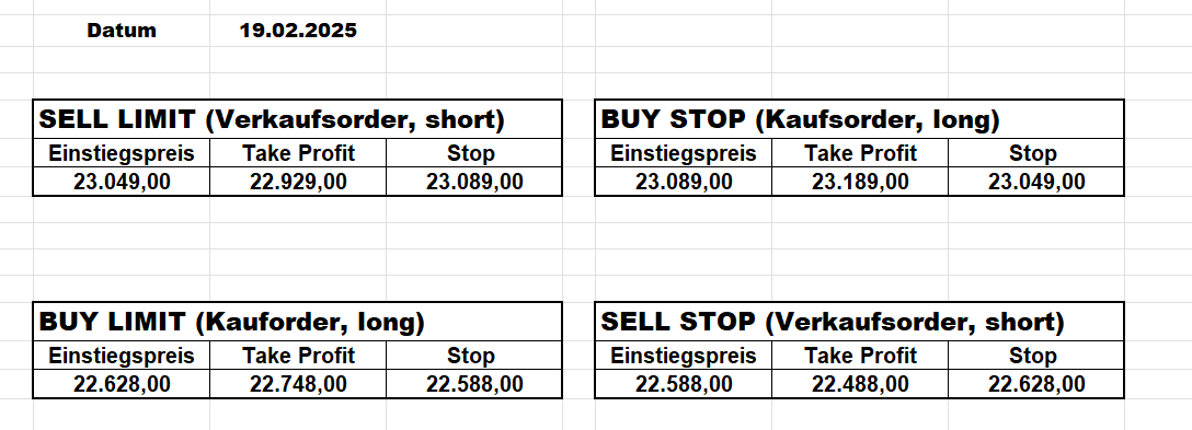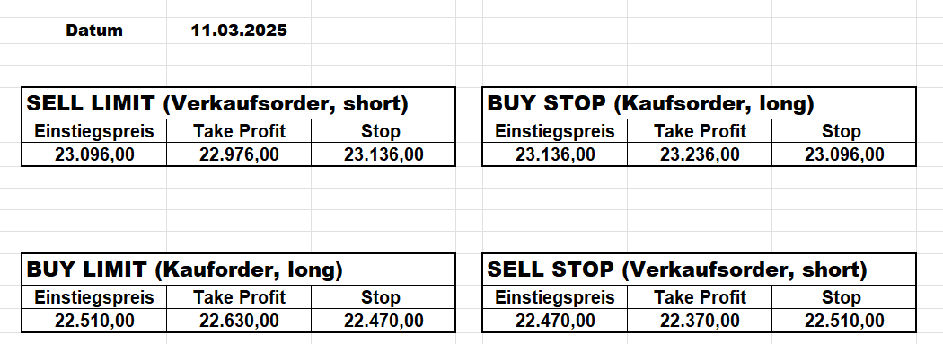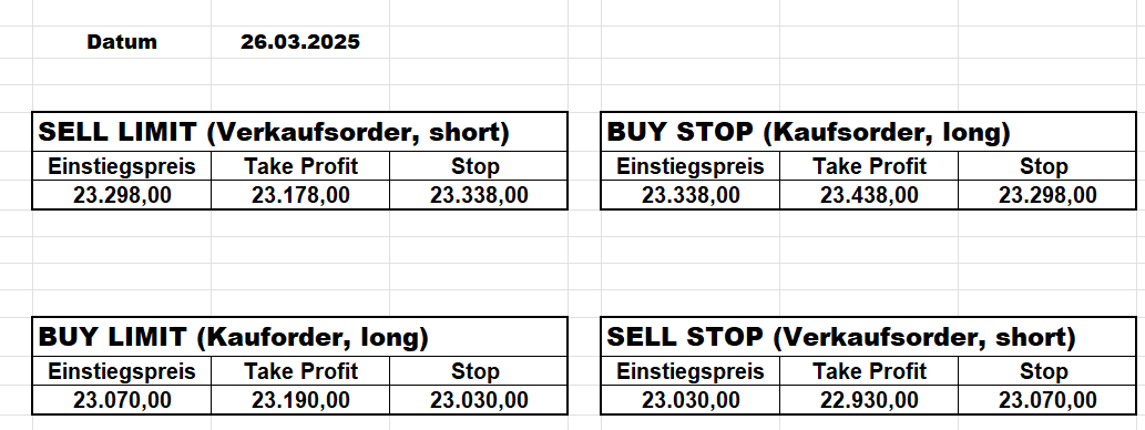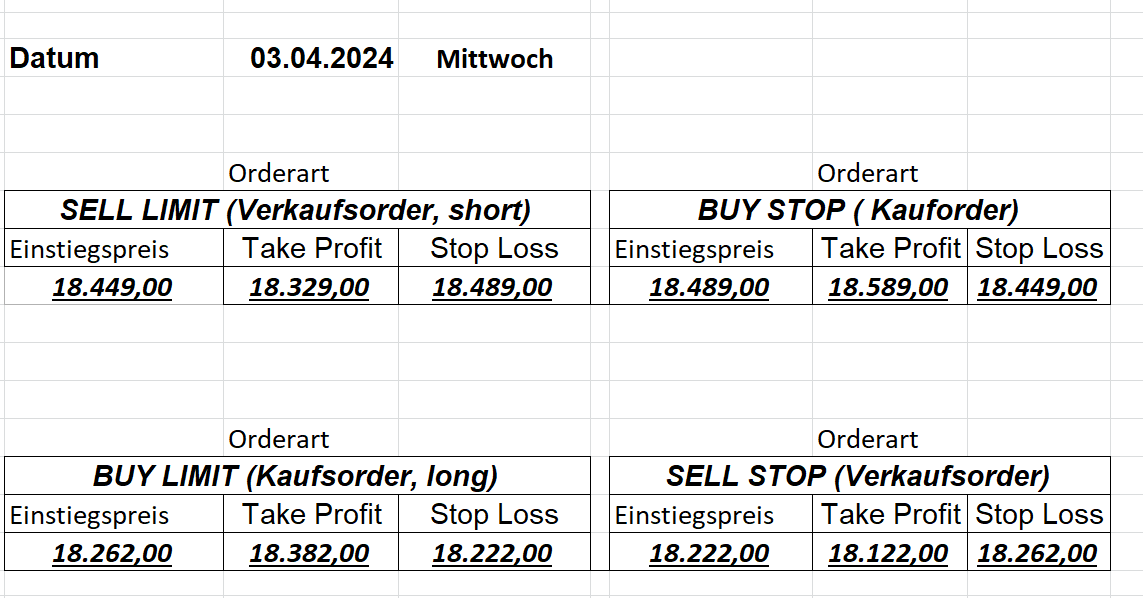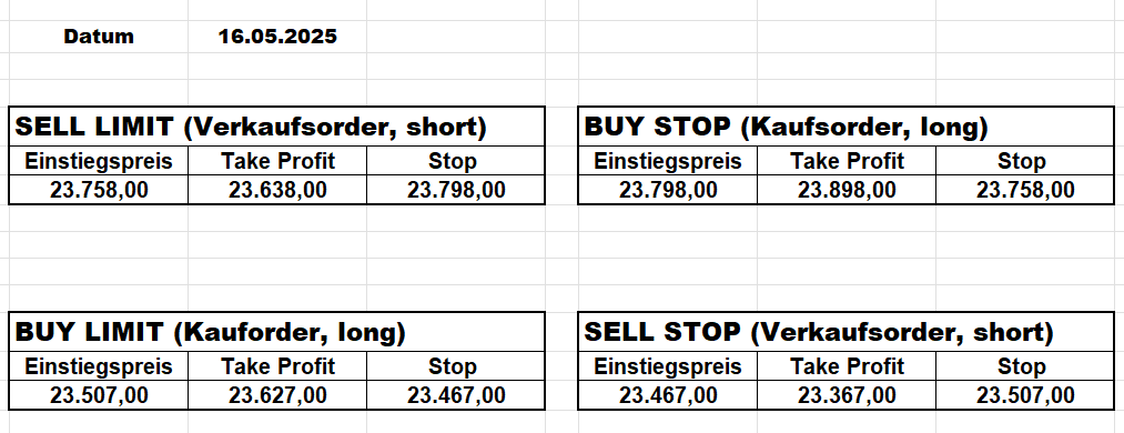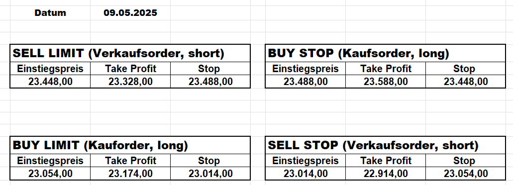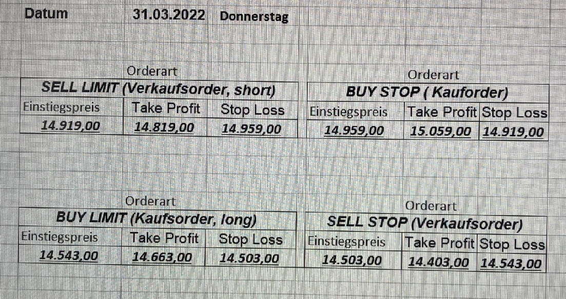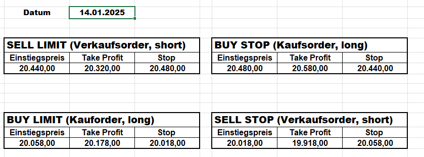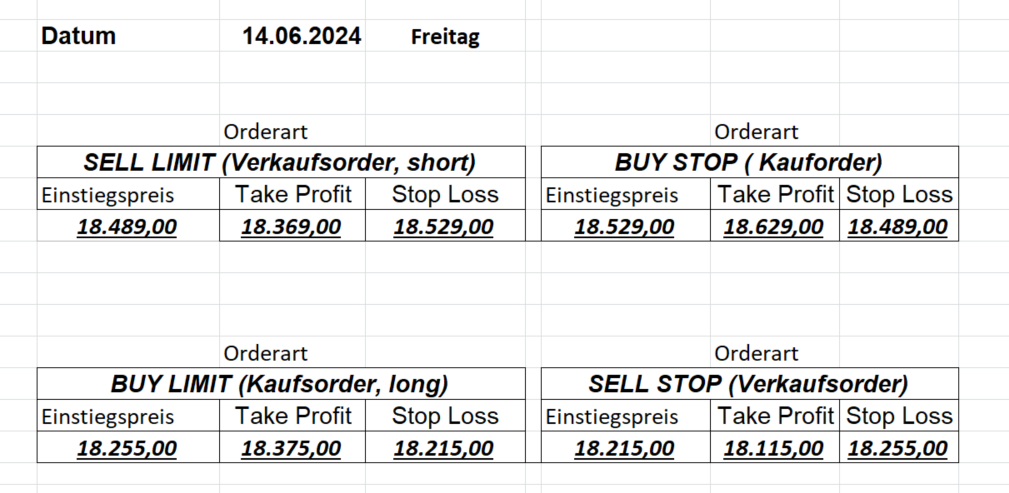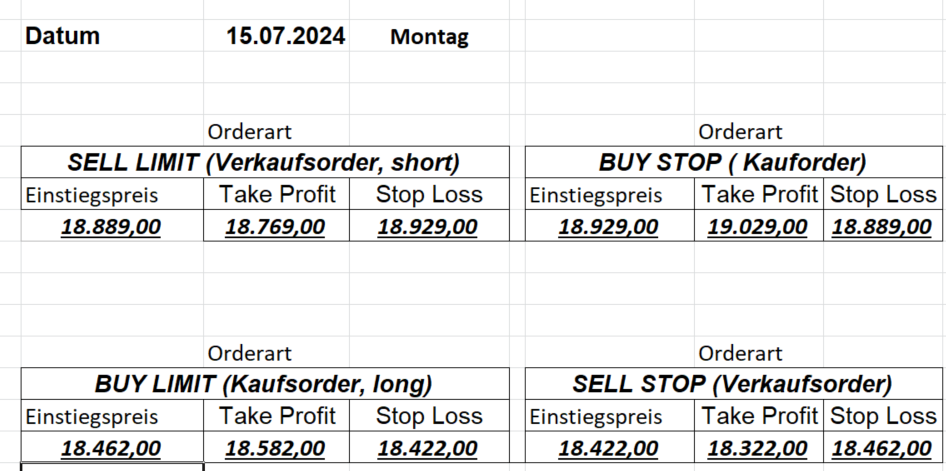 16.5.2023 Platzieren Sie die  Order bis 9:00 Löschen Sie bitte offene Order und Positionen um 21:45 ! Zur Frage der Punktgröße: Beispielrechnung: Bitte immer kurz auf den am weitest entfernten Stopp schauen. Diese Punktzahl sollte nicht mehr als 0,5% bis 1% des Kapitals ausmachen. 15.5.2023 Platzieren Sie die  Order bis 9:00 Löschen Sie bitte offene Order und Positionen um 21:45 ! Zur Frage der Punktgröße: Beispielrechnung: Bitte immer kurz auf den am weitest entfernten Stopp schauen. Diese Punktzahl sollte nicht mehr als 0,5% bis 1% des Kapitals ausmachen. 12.5.2023 Platzieren Sie die  Order bis 9:00 Löschen Sie bitte offene Order und Positionen um 21:45 ! Zur Frage der Punktgröße: Beispielrechnung: Bitte immer kurz auf den am weitest entfernten Stopp schauen. Diese Punktzahl sollte nicht mehr als 0,5% bis 1% des Kapitals ausmachen. 10.5.2023  Platzieren Sie die  Order bis 9:00 Löschen Sie bitte offene Order und Positionen um 21:45 ! Zur Frage der Punktgröße: Beispielrechnung: Bitte immer kurz auf den am weitest entfernten Stopp schauen. Diese Punktzahl sollte nicht mehr als 0,5% bis 1% des Kapitals ausmachen. 9.5.2023 Platzieren Sie die  Order bis 9:00 Löschen Sie bitte offene Order und Positionen um 21:45 ! Zur Frage der Punktgröße: Beispielrechnung: Bitte immer kurz auf den am weitest entfernten Stopp schauen. Diese Punktzahl sollte nicht mehr als 0,5% bis 1% des Kapitals ausmachen.   8.5.2023 Platzieren Sie die  Order bis 9:00 Löschen Sie bitte offene Order und Positionen um 21:45 ! Zur Frage der Punktgröße: Beispielrechnung: Bitte immer kurz auf den am weitest entfernten Stopp schauen. Diese Punktzahl sollte nicht mehr als 0,5% bis 1% des Kapitals ausmachen. 5.5.2023 Platzieren Sie die  Order bis 9:00 Löschen Sie bitte offene Order und Positionen um 21:45 ! Zur Frage der Punktgröße: Beispielrechnung: Bitte immer kurz auf den am weitest entfernten Stopp schauen. Diese Punktzahl sollte nicht mehr als 0,5% bis 1% des Kapitals ausmachen. 4.5.2023 Platzieren Sie die  Order bis 9:00 Löschen Sie bitte offene Order und Positionen um 21:45 ! Zur Frage der Punktgröße: Beispielrechnung: Bitte immer kurz auf den am weitest entfernten Stopp schauen. Diese Punktzahl sollte nicht mehr als 0,5% bis 1% des Kapitals ausmachen. 3.5.2023 Heute abend FED-Sitzung: Wir bleiben heute aus dem Markt! 2.5.2023 Platzieren Sie die  Order bis 9:00 Löschen Sie bitte offene Order und Positionen um 21:45 ! Zur Frage der Punktgröße: Beispielrechnung: Bitte immer kurz auf den am weitest entfernten Stopp schauen. Diese Punktzahl sollte nicht mehr als 0,5% bis 1% des Kapitals ausmachen. 28.4.2023 Platzieren Sie die  Order bis 9:00 Löschen Sie bitte offene Order und Positionen um 21:45 ! Zur Frage der Punktgröße: Beispielrechnung: Bitte immer kurz auf den am weitest entfernten Stopp schauen. Diese Punktzahl sollte nicht mehr als 0,5% bis 1% des Kapitals ausmachen. 27.4.2023 Platzieren Sie die  Order bis 9:00 Löschen Sie bitte offene Order und Positionen um 21:45 ! Zur Frage der Punktgröße: Beispielrechnung: Bitte immer kurz auf den am weitest entfernten Stopp schauen. Diese Punktzahl sollte nicht mehr als 0,5% bis 1% des Kapitals ausmachen. 26.4.2023 Platzieren Sie die  Order bis 9:00 Löschen Sie bitte offene Order und Positionen um 21:45 ! Zur Frage der Punktgröße: Beispielrechnung: Bitte immer kurz auf den am weitest entfernten Stopp schauen. Diese Punktzahl sollte nicht mehr als 0,5% bis 1% des Kapitals ausmachen. 25.4.2023 Platzieren Sie die  Order bis 9:00 Löschen Sie bitte offene Order und Positionen um 21:45 ! Zur Frage der Punktgröße: Beispielrechnung: Bitte immer kurz auf den am weitest entfernten Stopp schauen. Diese Punktzahl sollte nicht mehr als 0,5% bis 1% des Kapitals ausmachen. 24.4.2023 Platzieren Sie die  Order bis 9:00 Löschen Sie bitte offene Order und Positionen um 21:45 ! Zur Frage der Punktgröße: Beispielrechnung: Bitte immer kurz auf den am weitest entfernten Stopp schauen. Diese Punktzahl sollte nicht mehr als 0,5% bis 1% des Kapitals ausmachen. 21.4.2023 Platzieren Sie die  Order bis 9:00 Löschen Sie bitte offene Order und Positionen um 21:45 ! Zur Frage der Punktgröße: Beispielrechnung: Bitte immer kurz auf den am weitest entfernten Stopp schauen. Diese Punktzahl sollte nicht mehr als 0,5% bis 1% des Kapitals ausmachen. Sorry, falscher Wochentag, aber es sind die heutigen Signale!    20.4.2023 Platzieren Sie die  Order bis 9:00 Löschen Sie bitte offene Order und Positionen um 21:45 ! Zur Frage der Punktgröße: Beispielrechnung: Bitte immer kurz auf den am weitest entfernten Stopp schauen. Diese Punktzahl sollte nicht mehr als 0,5% bis 1% des Kapitals ausmachen. 19.4.2023 Platzieren Sie die  Order bis 9:00 Löschen Sie bitte offene Order und Positionen um 21:45 ! Zur Frage der Punktgröße: Beispielrechnung: Bitte immer kurz auf den am weitest entfernten Stopp schauen. Diese Punktzahl sollte nicht mehr als 0,5% bis 1% des Kapitals ausmachen. 18.4.2023 Platzieren Sie die  Order bis 9:00 Löschen Sie bitte offene Order und Positionen um 21:45 ! Zur Frage der Punktgröße: Beispielrechnung: Bitte immer kurz auf den am weitest entfernten Stopp schauen. Diese Punktzahl sollte nicht mehr als 0,5% bis 1% des Kapitals ausmachen.  17.4.2023 Platzieren Sie die  Order bis 9:00 Löschen Sie bitte offene Order und Positionen um 21:45 ! Zur Frage der Punktgröße: Beispielrechnung: Bitte immer kurz auf den am weitest entfernten Stopp schauen. Diese Punktzahl sollte nicht mehr als 0,5% bis 1% des Kapitals ausmachen. 14.4.2023 Platzieren Sie die  Order bis 9:00 Löschen Sie bitte offene Order und Positionen um 21:45 ! Zur Frage der Punktgröße: Beispielrechnung: Bitte immer kurz auf den am weitest entfernten Stopp schauen. Diese Punktzahl sollte nicht mehr als 0,5% bis 1% des Kapitals ausmachen. 13.4.2023 Heute bleiben wir an der Seitenlinie. Aktuell ist der DAX nicht volatil genug!  12.4.2023 Pla