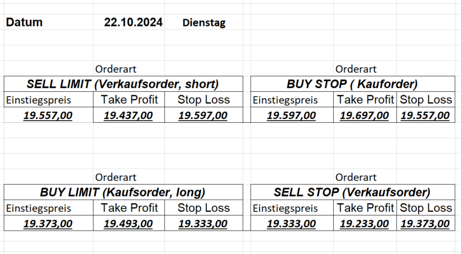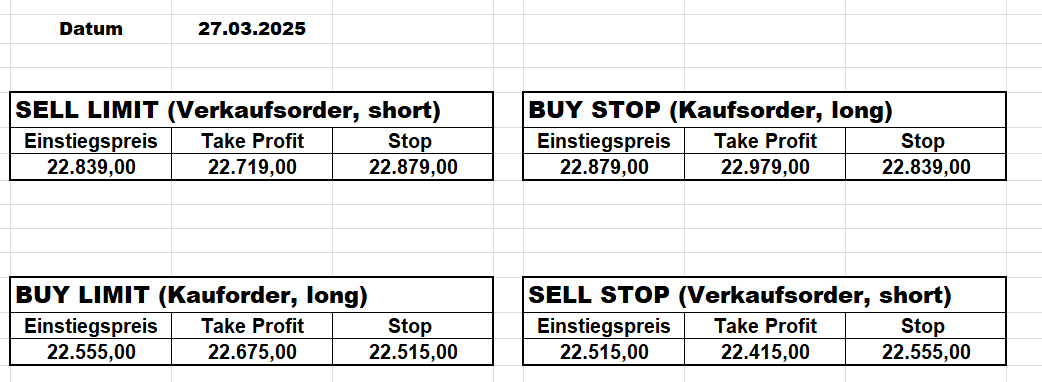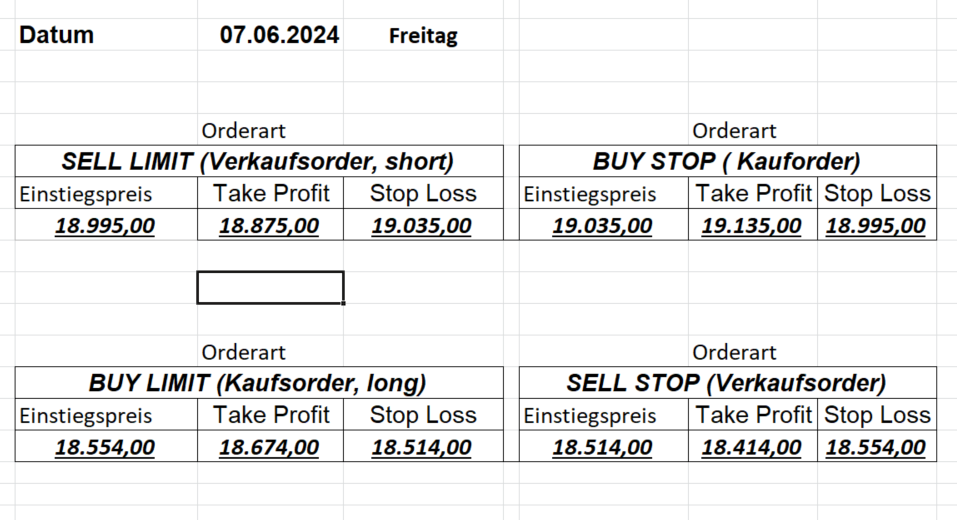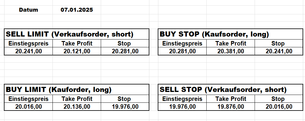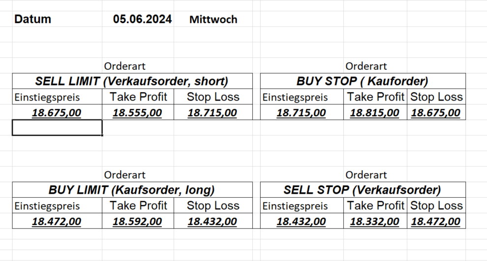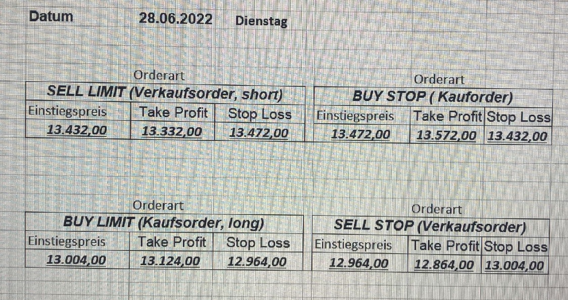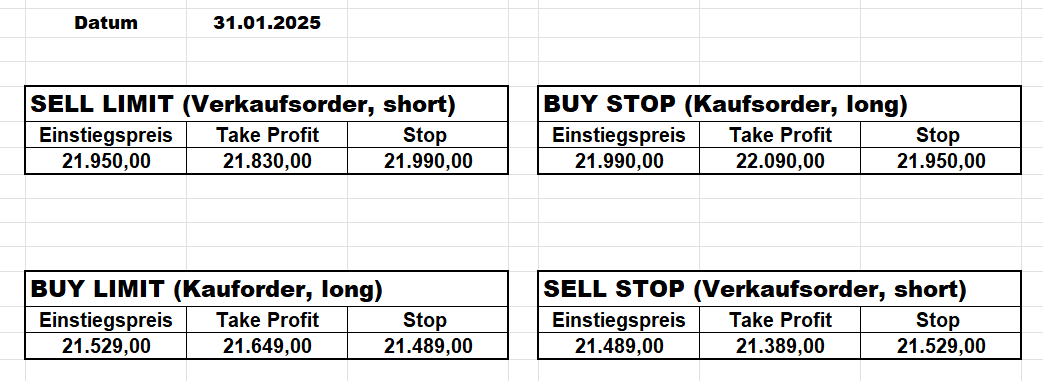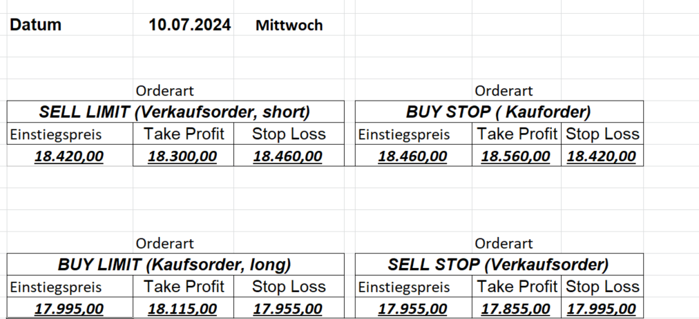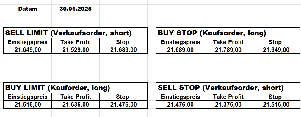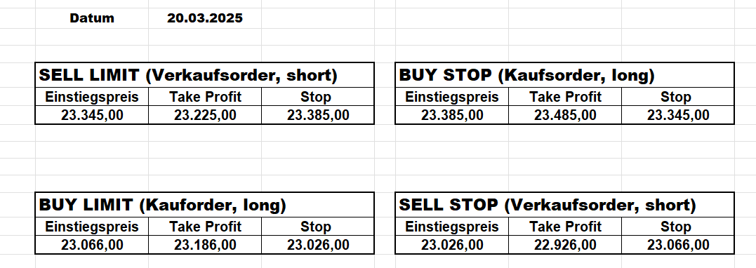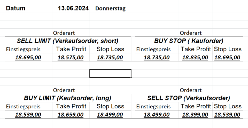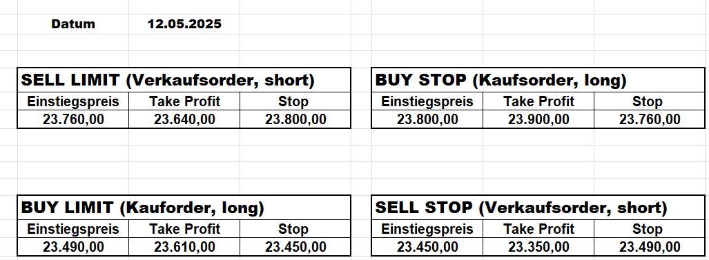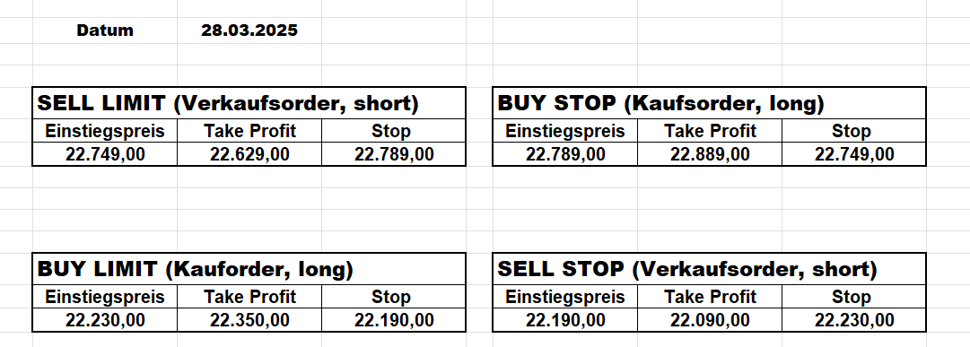 16.5.2023 Platzieren Sie die  Order bis 9:00 Löschen Sie bitte offene Order und Positionen um 21:45 ! Zur Frage der Punktgröße: Beispielrechnung: Bitte immer kurz auf den am weitest entfernten Stopp schauen. Diese Punktzahl sollte nicht mehr als 0,5% bis 1% des Kapitals ausmachen. 15.5.2023 Platzieren Sie die  Order bis 9:00 Löschen Sie bitte offene Order und Positionen um 21:45 ! Zur Frage der Punktgröße: Beispielrechnung: Bitte immer kurz auf den am weitest entfernten Stopp schauen. Diese Punktzahl sollte nicht mehr als 0,5% bis 1% des Kapitals ausmachen. 12.5.2023 Platzieren Sie die  Order bis 9:00 Löschen Sie bitte offene Order und Positionen um 21:45 ! Zur Frage der Punktgröße: Beispielrechnung: Bitte immer kurz auf den am weitest entfernten Stopp schauen. Diese Punktzahl sollte nicht mehr als 0,5% bis 1% des Kapitals ausmachen. 10.5.2023  Platzieren Sie die  Order bis 9:00 Löschen Sie bitte offene Order und Positionen um 21:45 ! Zur Frage der Punktgröße: Beispielrechnung: Bitte immer kurz auf den am weitest entfernten Stopp schauen. Diese Punktzahl sollte nicht mehr als 0,5% bis 1% des Kapitals ausmachen. 9.5.2023 Platzieren Sie die  Order bis 9:00 Löschen Sie bitte offene Order und Positionen um 21:45 ! Zur Frage der Punktgröße: Beispielrechnung: Bitte immer kurz auf den am weitest entfernten Stopp schauen. Diese Punktzahl sollte nicht mehr als 0,5% bis 1% des Kapitals ausmachen.   8.5.2023 Platzieren Sie die  Order bis 9:00 Löschen Sie bitte offene Order und Positionen um 21:45 ! Zur Frage der Punktgröße: Beispielrechnung: Bitte immer kurz auf den am weitest entfernten Stopp schauen. Diese Punktzahl sollte nicht mehr als 0,5% bis 1% des Kapitals ausmachen. 5.5.2023 Platzieren Sie die  Order bis 9:00 Löschen Sie bitte offene Order und Positionen um 21:45 ! Zur Frage der Punktgröße: Beispielrechnung: Bitte immer kurz auf den am weitest entfernten Stopp schauen. Diese Punktzahl sollte nicht mehr als 0,5% bis 1% des Kapitals ausmachen. 4.5.2023 Platzieren Sie die  Order bis 9:00 Löschen Sie bitte offene Order und Positionen um 21:45 ! Zur Frage der Punktgröße: Beispielrechnung: Bitte immer kurz auf den am weitest entfernten Stopp schauen. Diese Punktzahl sollte nicht mehr als 0,5% bis 1% des Kapitals ausmachen. 3.5.2023 Heute abend FED-Sitzung: Wir bleiben heute aus dem Markt! 2.5.2023 Platzieren Sie die  Order bis 9:00 Löschen Sie bitte offene Order und Positionen um 21:45 ! Zur Frage der Punktgröße: Beispielrechnung: Bitte immer kurz auf den am weitest entfernten Stopp schauen. Diese Punktzahl sollte nicht mehr als 0,5% bis 1% des Kapitals ausmachen. 28.4.2023 Platzieren Sie die  Order bis 9:00 Löschen Sie bitte offene Order und Positionen um 21:45 ! Zur Frage der Punktgröße: Beispielrechnung: Bitte immer kurz auf den am weitest entfernten Stopp schauen. Diese Punktzahl sollte nicht mehr als 0,5% bis 1% des Kapitals ausmachen. 27.4.2023 Platzieren Sie die  Order bis 9:00 Löschen Sie bitte offene Order und Positionen um 21:45 ! Zur Frage der Punktgröße: Beispielrechnung: Bitte immer kurz auf den am weitest entfernten Stopp schauen. Diese Punktzahl sollte nicht mehr als 0,5% bis 1% des Kapitals ausmachen. 26.4.2023 Platzieren Sie die  Order bis 9:00 Löschen Sie bitte offene Order und Positionen um 21:45 ! Zur Frage der Punktgröße: Beispielrechnung: Bitte immer kurz auf den am weitest entfernten Stopp schauen. Diese Punktzahl sollte nicht mehr als 0,5% bis 1% des Kapitals ausmachen. 25.4.2023 Platzieren Sie die  Order bis 9:00 Löschen Sie bitte offene Order und Positionen um 21:45 ! Zur Frage der Punktgröße: Beispielrechnung: Bitte immer kurz auf den am weitest entfernten Stopp schauen. Diese Punktzahl sollte nicht mehr als 0,5% bis 1% des Kapitals ausmachen. 24.4.2023 Platzieren Sie die  Order bis 9:00 Löschen Sie bitte offene Order und Positionen um 21:45 ! Zur Frage der Punktgröße: Beispielrechnung: Bitte immer kurz auf den am weitest entfernten Stopp schauen. Diese Punktzahl sollte nicht mehr als 0,5% bis 1% des Kapitals ausmachen. 21.4.2023 Platzieren Sie die  Order bis 9:00 Löschen Sie bitte offene Order und Positionen um 21:45 ! Zur Frage der Punktgröße: Beispielrechnung: Bitte immer kurz auf den am weitest entfernten Stopp schauen. Diese Punktzahl sollte nicht mehr als 0,5% bis 1% des Kapitals ausmachen. Sorry, falscher Wochentag, aber es sind die heutigen Signale!    20.4.2023 Platzieren Sie die  Order bis 9:00 Löschen Sie bitte offene Order und Positionen um 21:45 ! Zur Frage der Punktgröße: Beispielrechnung: Bitte immer kurz auf den am weitest entfernten Stopp schauen. Diese Punktzahl sollte nicht mehr als 0,5% bis 1% des Kapitals ausmachen. 19.4.2023 Platzieren Sie die  Order bis 9:00 Löschen Sie bitte offene Order und Positionen um 21:45 ! Zur Frage der Punktgröße: Beispielrechnung: Bitte immer kurz auf den am weitest entfernten Stopp schauen. Diese Punktzahl sollte nicht mehr als 0,5% bis 1% des Kapitals ausmachen. 18.4.2023 Platzieren Sie die  Order bis 9:00 Löschen Sie bitte offene Order und Positionen um 21:45 ! Zur Frage der Punktgröße: Beispielrechnung: Bitte immer kurz auf den am weitest entfernten Stopp schauen. Diese Punktzahl sollte nicht mehr als 0,5% bis 1% des Kapitals ausmachen.  17.4.2023 Platzieren Sie die  Order bis 9:00 Löschen Sie bitte offene Order und Positionen um 21:45 ! Zur Frage der Punktgröße: Beispielrechnung: Bitte immer kurz auf den am weitest entfernten Stopp schauen. Diese Punktzahl sollte nicht mehr als 0,5% bis 1% des Kapitals ausmachen. 14.4.2023 Platzieren Sie die  Order bis 9:00 Löschen Sie bitte offene Order und Positionen um 21:45 ! Zur Frage der Punktgröße: Beispielrechnung: Bitte immer kurz auf den am weitest entfernten Stopp schauen. Diese Punktzahl sollte nicht mehr als 0,5% bis 1% des Kapitals ausmachen. 13.4.2023 Heute bleiben wir an der Seitenlinie. Aktuell ist der DAX nicht volatil genug!  12.4.2023 Pla