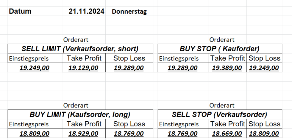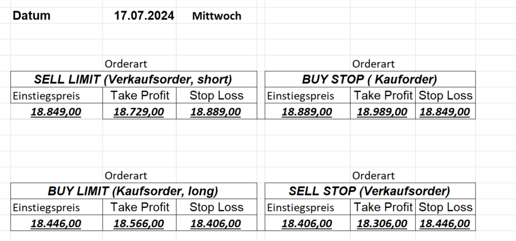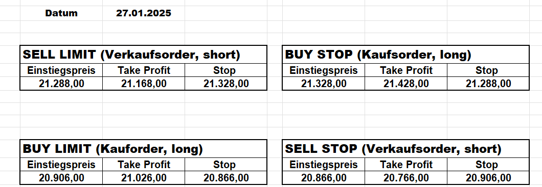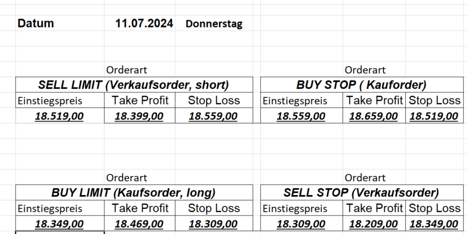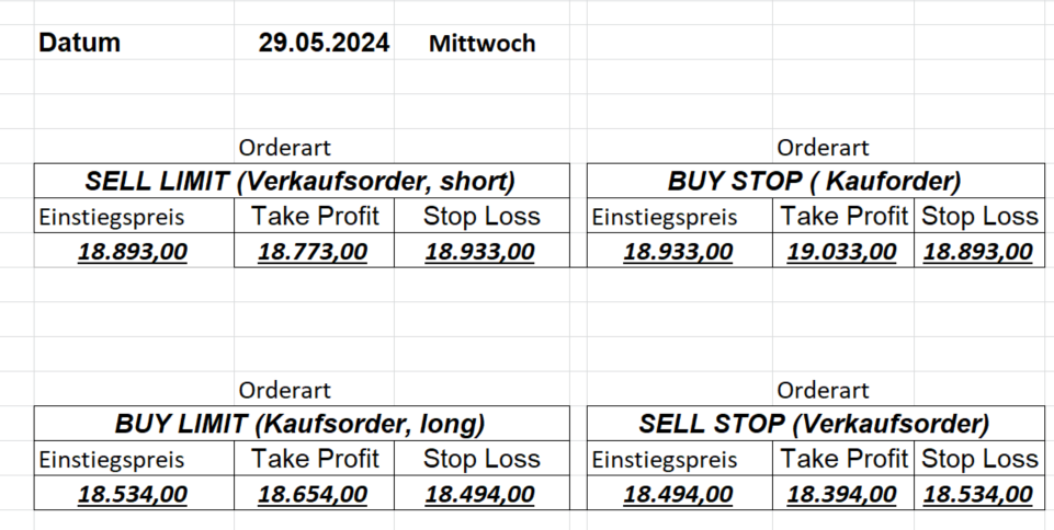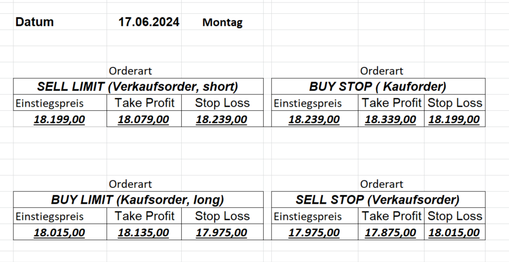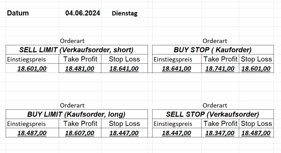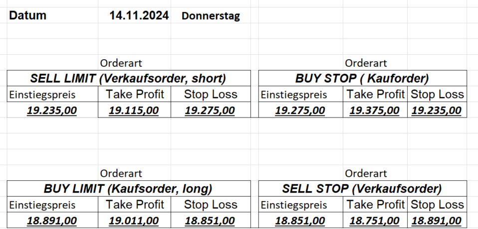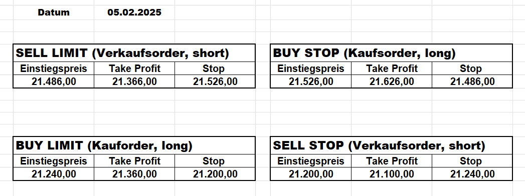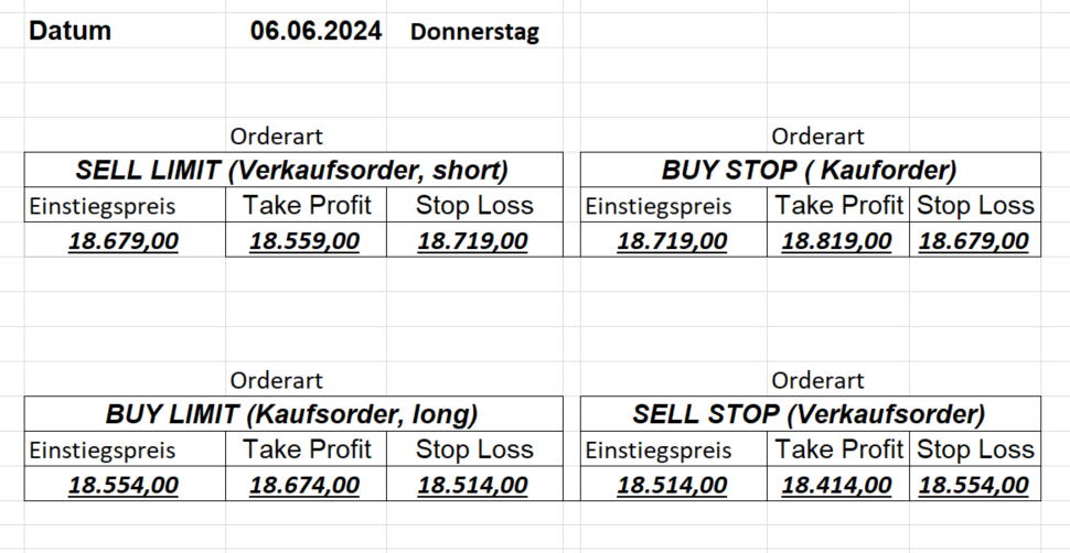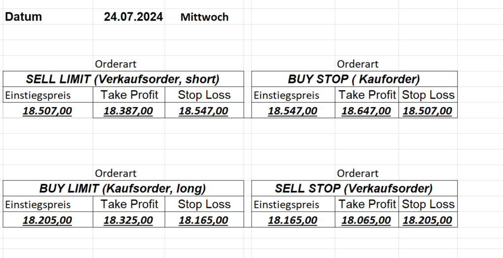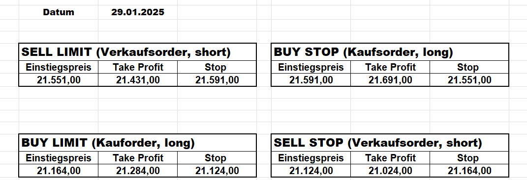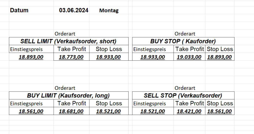 16.5.2023 Platzieren Sie die  Order bis 9:00 Löschen Sie bitte offene Order und Positionen um 21:45 ! Zur Frage der Punktgröße: Beispielrechnung: Bitte immer kurz auf den am weitest entfernten Stopp schauen. Diese Punktzahl sollte nicht mehr als 0,5% bis 1% des Kapitals ausmachen. 15.5.2023 Platzieren Sie die  Order bis 9:00 Löschen Sie bitte offene Order und Positionen um 21:45 ! Zur Frage der Punktgröße: Beispielrechnung: Bitte immer kurz auf den am weitest entfernten Stopp schauen. Diese Punktzahl sollte nicht mehr als 0,5% bis 1% des Kapitals ausmachen. 12.5.2023 Platzieren Sie die  Order bis 9:00 Löschen Sie bitte offene Order und Positionen um 21:45 ! Zur Frage der Punktgröße: Beispielrechnung: Bitte immer kurz auf den am weitest entfernten Stopp schauen. Diese Punktzahl sollte nicht mehr als 0,5% bis 1% des Kapitals ausmachen. 10.5.2023  Platzieren Sie die  Order bis 9:00 Löschen Sie bitte offene Order und Positionen um 21:45 ! Zur Frage der Punktgröße: Beispielrechnung: Bitte immer kurz auf den am weitest entfernten Stopp schauen. Diese Punktzahl sollte nicht mehr als 0,5% bis 1% des Kapitals ausmachen. 9.5.2023 Platzieren Sie die  Order bis 9:00 Löschen Sie bitte offene Order und Positionen um 21:45 ! Zur Frage der Punktgröße: Beispielrechnung: Bitte immer kurz auf den am weitest entfernten Stopp schauen. Diese Punktzahl sollte nicht mehr als 0,5% bis 1% des Kapitals ausmachen.   8.5.2023 Platzieren Sie die  Order bis 9:00 Löschen Sie bitte offene Order und Positionen um 21:45 ! Zur Frage der Punktgröße: Beispielrechnung: Bitte immer kurz auf den am weitest entfernten Stopp schauen. Diese Punktzahl sollte nicht mehr als 0,5% bis 1% des Kapitals ausmachen. 5.5.2023 Platzieren Sie die  Order bis 9:00 Löschen Sie bitte offene Order und Positionen um 21:45 ! Zur Frage der Punktgröße: Beispielrechnung: Bitte immer kurz auf den am weitest entfernten Stopp schauen. Diese Punktzahl sollte nicht mehr als 0,5% bis 1% des Kapitals ausmachen. 4.5.2023 Platzieren Sie die  Order bis 9:00 Löschen Sie bitte offene Order und Positionen um 21:45 ! Zur Frage der Punktgröße: Beispielrechnung: Bitte immer kurz auf den am weitest entfernten Stopp schauen. Diese Punktzahl sollte nicht mehr als 0,5% bis 1% des Kapitals ausmachen. 3.5.2023 Heute abend FED-Sitzung: Wir bleiben heute aus dem Markt! 2.5.2023 Platzieren Sie die  Order bis 9:00 Löschen Sie bitte offene Order und Positionen um 21:45 ! Zur Frage der Punktgröße: Beispielrechnung: Bitte immer kurz auf den am weitest entfernten Stopp schauen. Diese Punktzahl sollte nicht mehr als 0,5% bis 1% des Kapitals ausmachen. 28.4.2023 Platzieren Sie die  Order bis 9:00 Löschen Sie bitte offene Order und Positionen um 21:45 ! Zur Frage der Punktgröße: Beispielrechnung: Bitte immer kurz auf den am weitest entfernten Stopp schauen. Diese Punktzahl sollte nicht mehr als 0,5% bis 1% des Kapitals ausmachen. 27.4.2023 Platzieren Sie die  Order bis 9:00 Löschen Sie bitte offene Order und Positionen um 21:45 ! Zur Frage der Punktgröße: Beispielrechnung: Bitte immer kurz auf den am weitest entfernten Stopp schauen. Diese Punktzahl sollte nicht mehr als 0,5% bis 1% des Kapitals ausmachen. 26.4.2023 Platzieren Sie die  Order bis 9:00 Löschen Sie bitte offene Order und Positionen um 21:45 ! Zur Frage der Punktgröße: Beispielrechnung: Bitte immer kurz auf den am weitest entfernten Stopp schauen. Diese Punktzahl sollte nicht mehr als 0,5% bis 1% des Kapitals ausmachen. 25.4.2023 Platzieren Sie die  Order bis 9:00 Löschen Sie bitte offene Order und Positionen um 21:45 ! Zur Frage der Punktgröße: Beispielrechnung: Bitte immer kurz auf den am weitest entfernten Stopp schauen. Diese Punktzahl sollte nicht mehr als 0,5% bis 1% des Kapitals ausmachen. 24.4.2023 Platzieren Sie die  Order bis 9:00 Löschen Sie bitte offene Order und Positionen um 21:45 ! Zur Frage der Punktgröße: Beispielrechnung: Bitte immer kurz auf den am weitest entfernten Stopp schauen. Diese Punktzahl sollte nicht mehr als 0,5% bis 1% des Kapitals ausmachen. 21.4.2023 Platzieren Sie die  Order bis 9:00 Löschen Sie bitte offene Order und Positionen um 21:45 ! Zur Frage der Punktgröße: Beispielrechnung: Bitte immer kurz auf den am weitest entfernten Stopp schauen. Diese Punktzahl sollte nicht mehr als 0,5% bis 1% des Kapitals ausmachen. Sorry, falscher Wochentag, aber es sind die heutigen Signale!    20.4.2023 Platzieren Sie die  Order bis 9:00 Löschen Sie bitte offene Order und Positionen um 21:45 ! Zur Frage der Punktgröße: Beispielrechnung: Bitte immer kurz auf den am weitest entfernten Stopp schauen. Diese Punktzahl sollte nicht mehr als 0,5% bis 1% des Kapitals ausmachen. 19.4.2023 Platzieren Sie die  Order bis 9:00 Löschen Sie bitte offene Order und Positionen um 21:45 ! Zur Frage der Punktgröße: Beispielrechnung: Bitte immer kurz auf den am weitest entfernten Stopp schauen. Diese Punktzahl sollte nicht mehr als 0,5% bis 1% des Kapitals ausmachen. 18.4.2023 Platzieren Sie die  Order bis 9:00 Löschen Sie bitte offene Order und Positionen um 21:45 ! Zur Frage der Punktgröße: Beispielrechnung: Bitte immer kurz auf den am weitest entfernten Stopp schauen. Diese Punktzahl sollte nicht mehr als 0,5% bis 1% des Kapitals ausmachen.  17.4.2023 Platzieren Sie die  Order bis 9:00 Löschen Sie bitte offene Order und Positionen um 21:45 ! Zur Frage der Punktgröße: Beispielrechnung: Bitte immer kurz auf den am weitest entfernten Stopp schauen. Diese Punktzahl sollte nicht mehr als 0,5% bis 1% des Kapitals ausmachen. 14.4.2023 Platzieren Sie die  Order bis 9:00 Löschen Sie bitte offene Order und Positionen um 21:45 ! Zur Frage der Punktgröße: Beispielrechnung: Bitte immer kurz auf den am weitest entfernten Stopp schauen. Diese Punktzahl sollte nicht mehr als 0,5% bis 1% des Kapitals ausmachen. 13.4.2023 Heute bleiben wir an der Seitenlinie. Aktuell ist der DAX nicht volatil genug!  12.4.2023 Pla