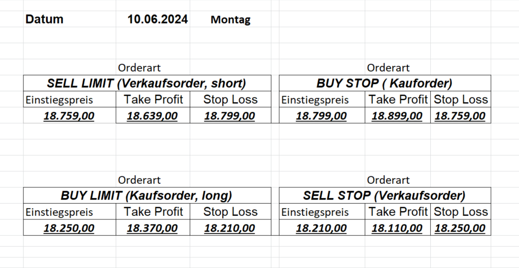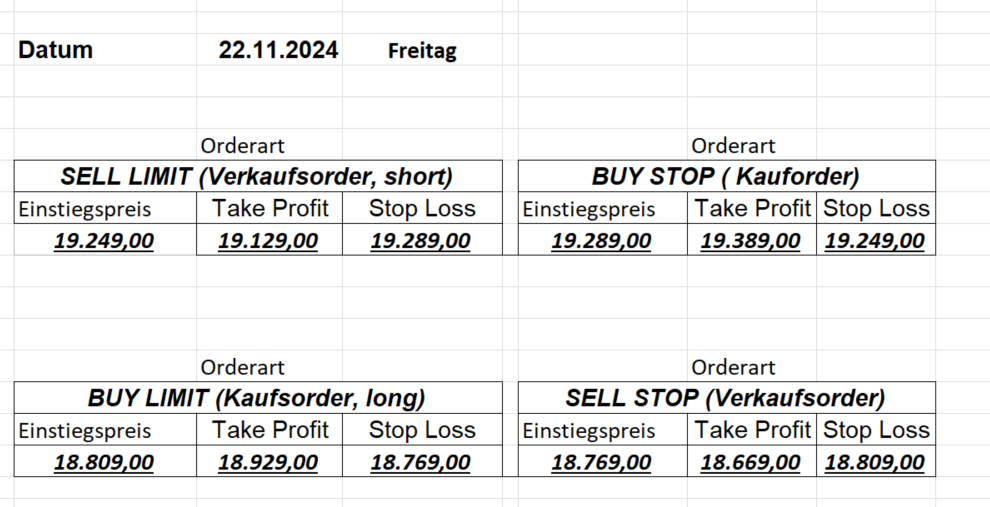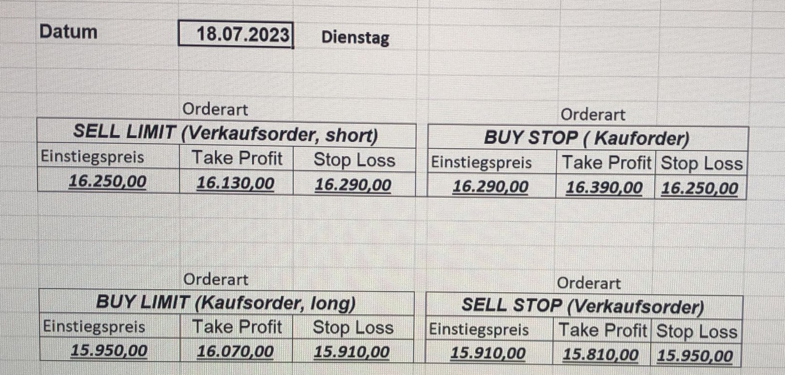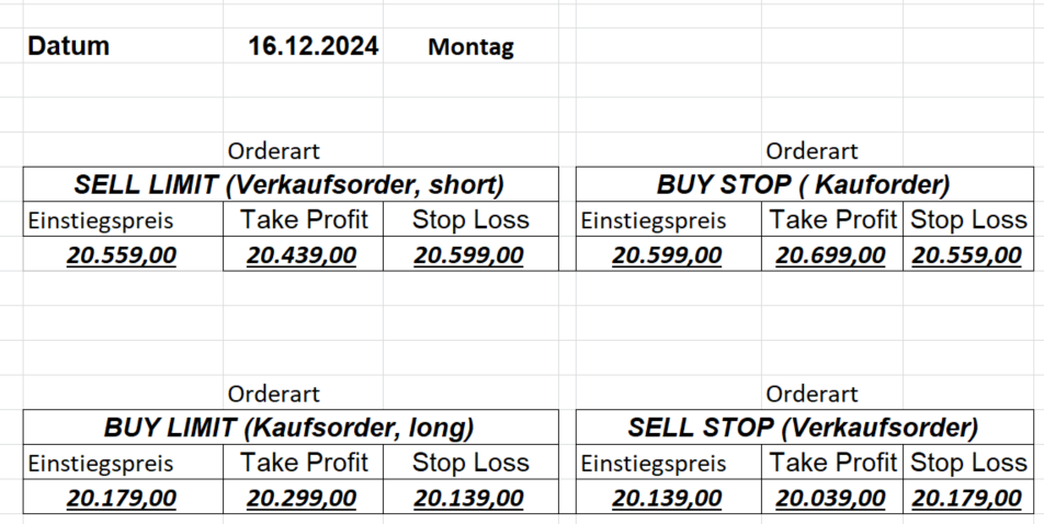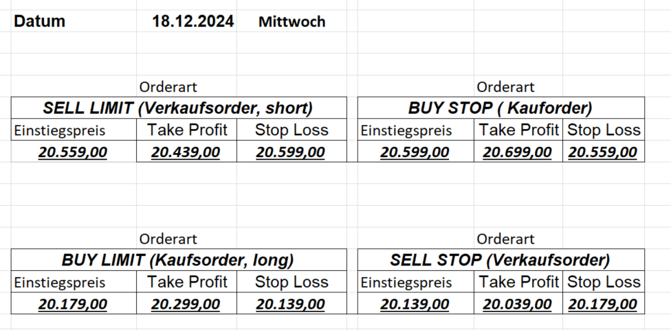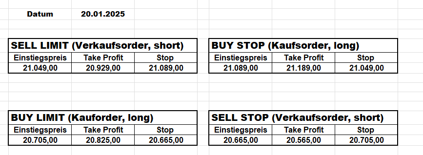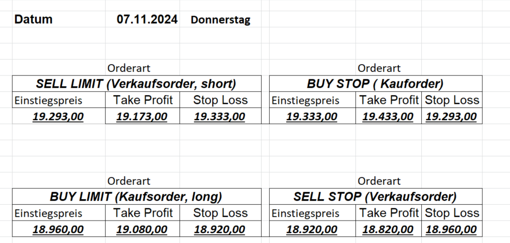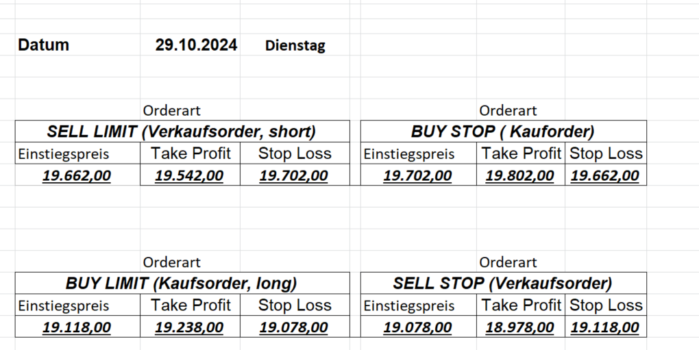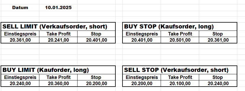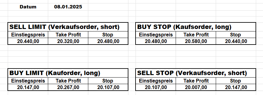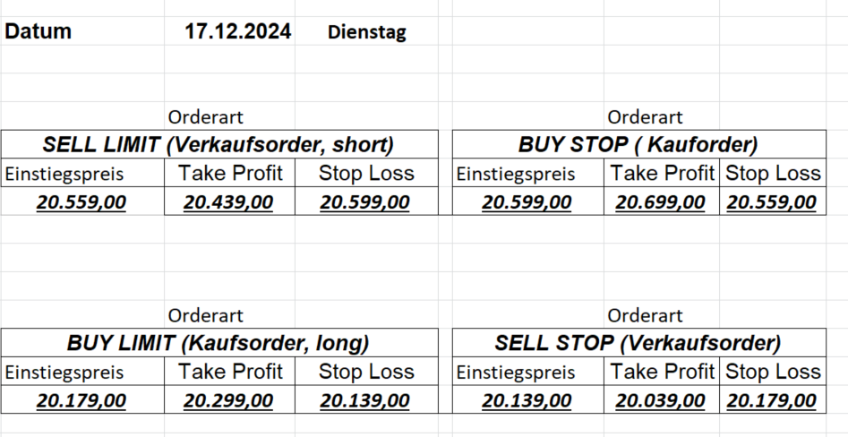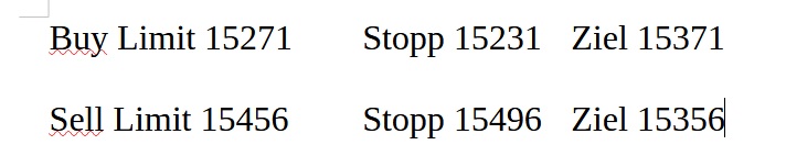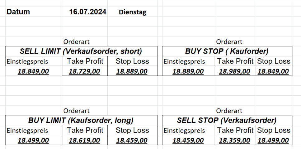 16.5.2023 Platzieren Sie die  Order bis 9:00 Löschen Sie bitte offene Order und Positionen um 21:45 ! Zur Frage der Punktgröße: Beispielrechnung: Bitte immer kurz auf den am weitest entfernten Stopp schauen. Diese Punktzahl sollte nicht mehr als 0,5% bis 1% des Kapitals ausmachen. 15.5.2023 Platzieren Sie die  Order bis 9:00 Löschen Sie bitte offene Order und Positionen um 21:45 ! Zur Frage der Punktgröße: Beispielrechnung: Bitte immer kurz auf den am weitest entfernten Stopp schauen. Diese Punktzahl sollte nicht mehr als 0,5% bis 1% des Kapitals ausmachen. 12.5.2023 Platzieren Sie die  Order bis 9:00 Löschen Sie bitte offene Order und Positionen um 21:45 ! Zur Frage der Punktgröße: Beispielrechnung: Bitte immer kurz auf den am weitest entfernten Stopp schauen. Diese Punktzahl sollte nicht mehr als 0,5% bis 1% des Kapitals ausmachen. 10.5.2023  Platzieren Sie die  Order bis 9:00 Löschen Sie bitte offene Order und Positionen um 21:45 ! Zur Frage der Punktgröße: Beispielrechnung: Bitte immer kurz auf den am weitest entfernten Stopp schauen. Diese Punktzahl sollte nicht mehr als 0,5% bis 1% des Kapitals ausmachen. 9.5.2023 Platzieren Sie die  Order bis 9:00 Löschen Sie bitte offene Order und Positionen um 21:45 ! Zur Frage der Punktgröße: Beispielrechnung: Bitte immer kurz auf den am weitest entfernten Stopp schauen. Diese Punktzahl sollte nicht mehr als 0,5% bis 1% des Kapitals ausmachen.   8.5.2023 Platzieren Sie die  Order bis 9:00 Löschen Sie bitte offene Order und Positionen um 21:45 ! Zur Frage der Punktgröße: Beispielrechnung: Bitte immer kurz auf den am weitest entfernten Stopp schauen. Diese Punktzahl sollte nicht mehr als 0,5% bis 1% des Kapitals ausmachen. 5.5.2023 Platzieren Sie die  Order bis 9:00 Löschen Sie bitte offene Order und Positionen um 21:45 ! Zur Frage der Punktgröße: Beispielrechnung: Bitte immer kurz auf den am weitest entfernten Stopp schauen. Diese Punktzahl sollte nicht mehr als 0,5% bis 1% des Kapitals ausmachen. 4.5.2023 Platzieren Sie die  Order bis 9:00 Löschen Sie bitte offene Order und Positionen um 21:45 ! Zur Frage der Punktgröße: Beispielrechnung: Bitte immer kurz auf den am weitest entfernten Stopp schauen. Diese Punktzahl sollte nicht mehr als 0,5% bis 1% des Kapitals ausmachen. 3.5.2023 Heute abend FED-Sitzung: Wir bleiben heute aus dem Markt! 2.5.2023 Platzieren Sie die  Order bis 9:00 Löschen Sie bitte offene Order und Positionen um 21:45 ! Zur Frage der Punktgröße: Beispielrechnung: Bitte immer kurz auf den am weitest entfernten Stopp schauen. Diese Punktzahl sollte nicht mehr als 0,5% bis 1% des Kapitals ausmachen. 28.4.2023 Platzieren Sie die  Order bis 9:00 Löschen Sie bitte offene Order und Positionen um 21:45 ! Zur Frage der Punktgröße: Beispielrechnung: Bitte immer kurz auf den am weitest entfernten Stopp schauen. Diese Punktzahl sollte nicht mehr als 0,5% bis 1% des Kapitals ausmachen. 27.4.2023 Platzieren Sie die  Order bis 9:00 Löschen Sie bitte offene Order und Positionen um 21:45 ! Zur Frage der Punktgröße: Beispielrechnung: Bitte immer kurz auf den am weitest entfernten Stopp schauen. Diese Punktzahl sollte nicht mehr als 0,5% bis 1% des Kapitals ausmachen. 26.4.2023 Platzieren Sie die  Order bis 9:00 Löschen Sie bitte offene Order und Positionen um 21:45 ! Zur Frage der Punktgröße: Beispielrechnung: Bitte immer kurz auf den am weitest entfernten Stopp schauen. Diese Punktzahl sollte nicht mehr als 0,5% bis 1% des Kapitals ausmachen. 25.4.2023 Platzieren Sie die  Order bis 9:00 Löschen Sie bitte offene Order und Positionen um 21:45 ! Zur Frage der Punktgröße: Beispielrechnung: Bitte immer kurz auf den am weitest entfernten Stopp schauen. Diese Punktzahl sollte nicht mehr als 0,5% bis 1% des Kapitals ausmachen. 24.4.2023 Platzieren Sie die  Order bis 9:00 Löschen Sie bitte offene Order und Positionen um 21:45 ! Zur Frage der Punktgröße: Beispielrechnung: Bitte immer kurz auf den am weitest entfernten Stopp schauen. Diese Punktzahl sollte nicht mehr als 0,5% bis 1% des Kapitals ausmachen. 21.4.2023 Platzieren Sie die  Order bis 9:00 Löschen Sie bitte offene Order und Positionen um 21:45 ! Zur Frage der Punktgröße: Beispielrechnung: Bitte immer kurz auf den am weitest entfernten Stopp schauen. Diese Punktzahl sollte nicht mehr als 0,5% bis 1% des Kapitals ausmachen. Sorry, falscher Wochentag, aber es sind die heutigen Signale!    20.4.2023 Platzieren Sie die  Order bis 9:00 Löschen Sie bitte offene Order und Positionen um 21:45 ! Zur Frage der Punktgröße: Beispielrechnung: Bitte immer kurz auf den am weitest entfernten Stopp schauen. Diese Punktzahl sollte nicht mehr als 0,5% bis 1% des Kapitals ausmachen. 19.4.2023 Platzieren Sie die  Order bis 9:00 Löschen Sie bitte offene Order und Positionen um 21:45 ! Zur Frage der Punktgröße: Beispielrechnung: Bitte immer kurz auf den am weitest entfernten Stopp schauen. Diese Punktzahl sollte nicht mehr als 0,5% bis 1% des Kapitals ausmachen. 18.4.2023 Platzieren Sie die  Order bis 9:00 Löschen Sie bitte offene Order und Positionen um 21:45 ! Zur Frage der Punktgröße: Beispielrechnung: Bitte immer kurz auf den am weitest entfernten Stopp schauen. Diese Punktzahl sollte nicht mehr als 0,5% bis 1% des Kapitals ausmachen.  17.4.2023 Platzieren Sie die  Order bis 9:00 Löschen Sie bitte offene Order und Positionen um 21:45 ! Zur Frage der Punktgröße: Beispielrechnung: Bitte immer kurz auf den am weitest entfernten Stopp schauen. Diese Punktzahl sollte nicht mehr als 0,5% bis 1% des Kapitals ausmachen. 14.4.2023 Platzieren Sie die  Order bis 9:00 Löschen Sie bitte offene Order und Positionen um 21:45 ! Zur Frage der Punktgröße: Beispielrechnung: Bitte immer kurz auf den am weitest entfernten Stopp schauen. Diese Punktzahl sollte nicht mehr als 0,5% bis 1% des Kapitals ausmachen. 13.4.2023 Heute bleiben wir an der Seitenlinie. Aktuell ist der DAX nicht volatil genug!  12.4.2023 Pla
