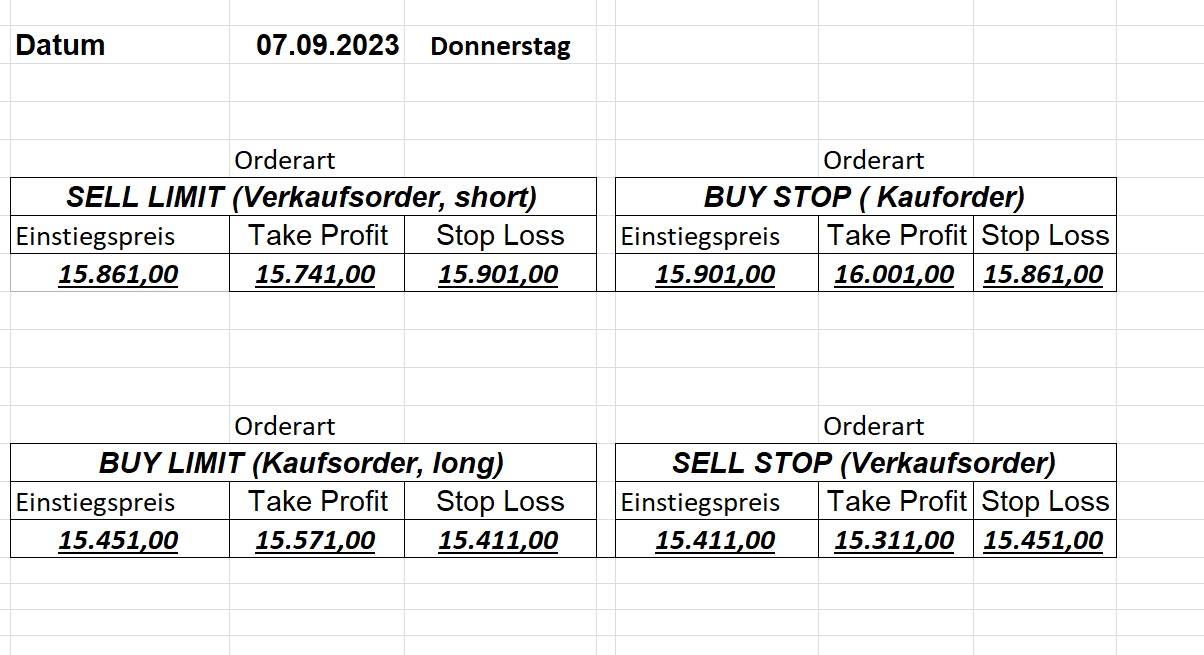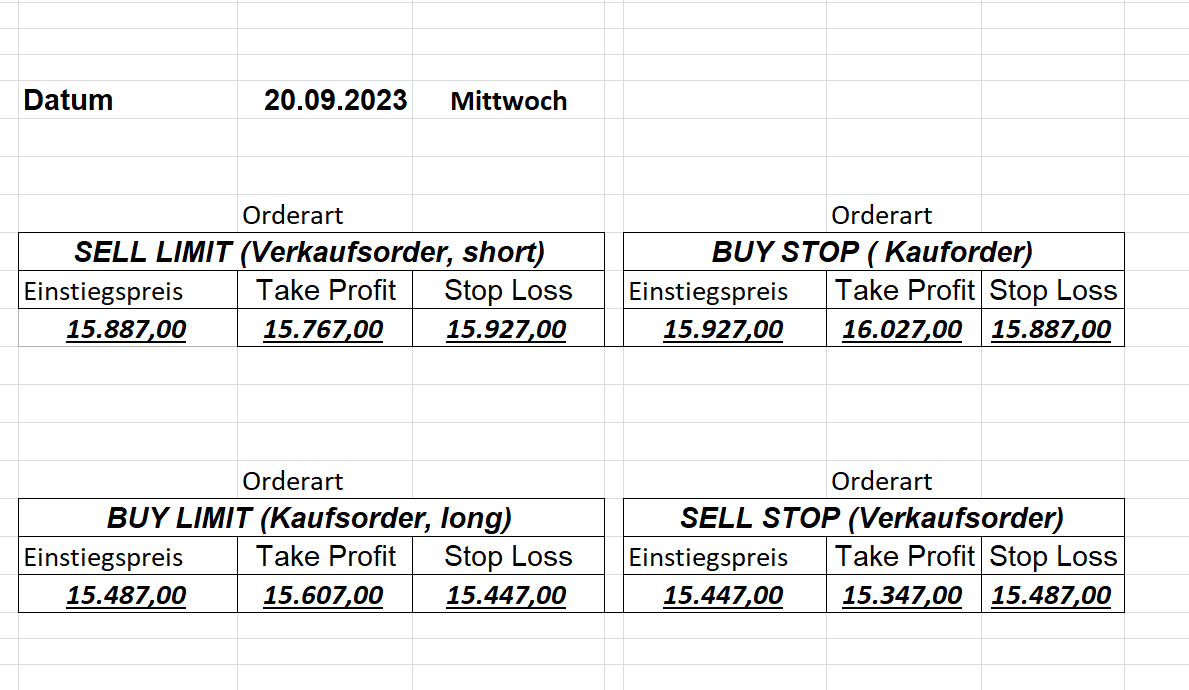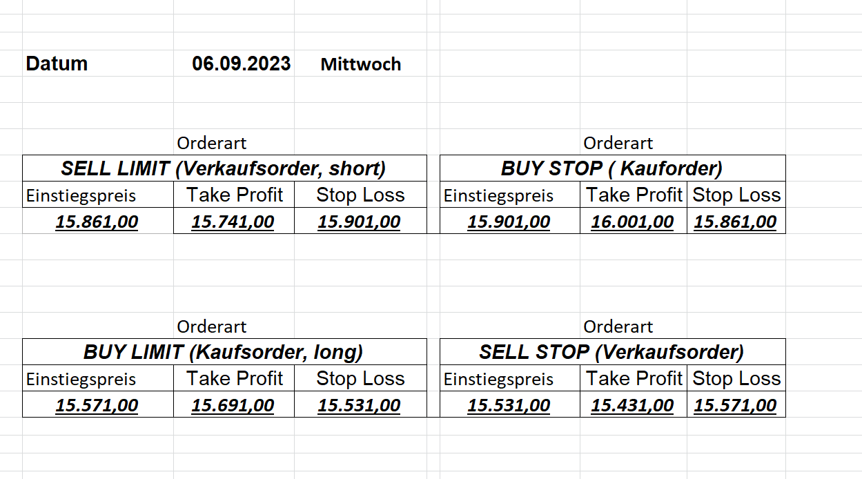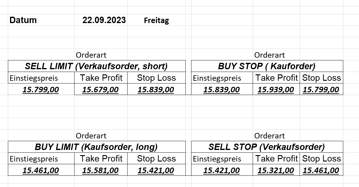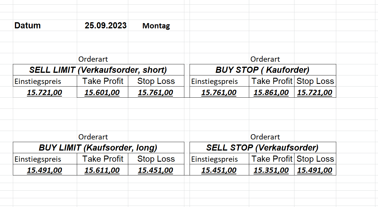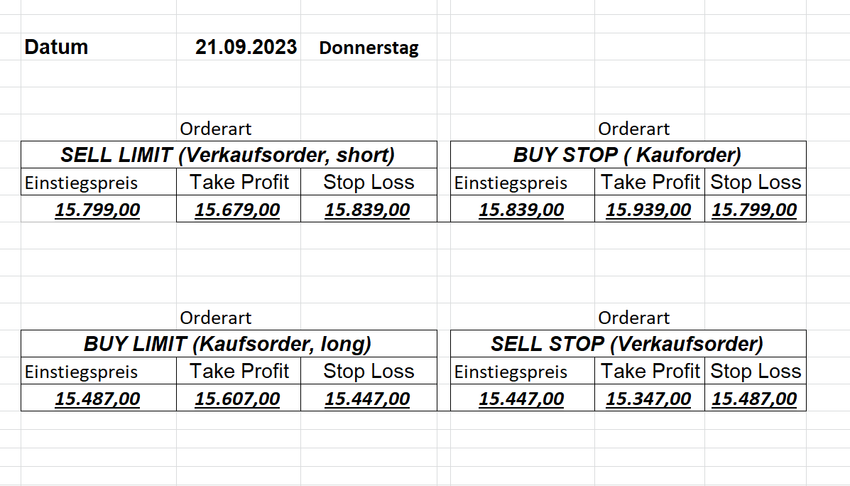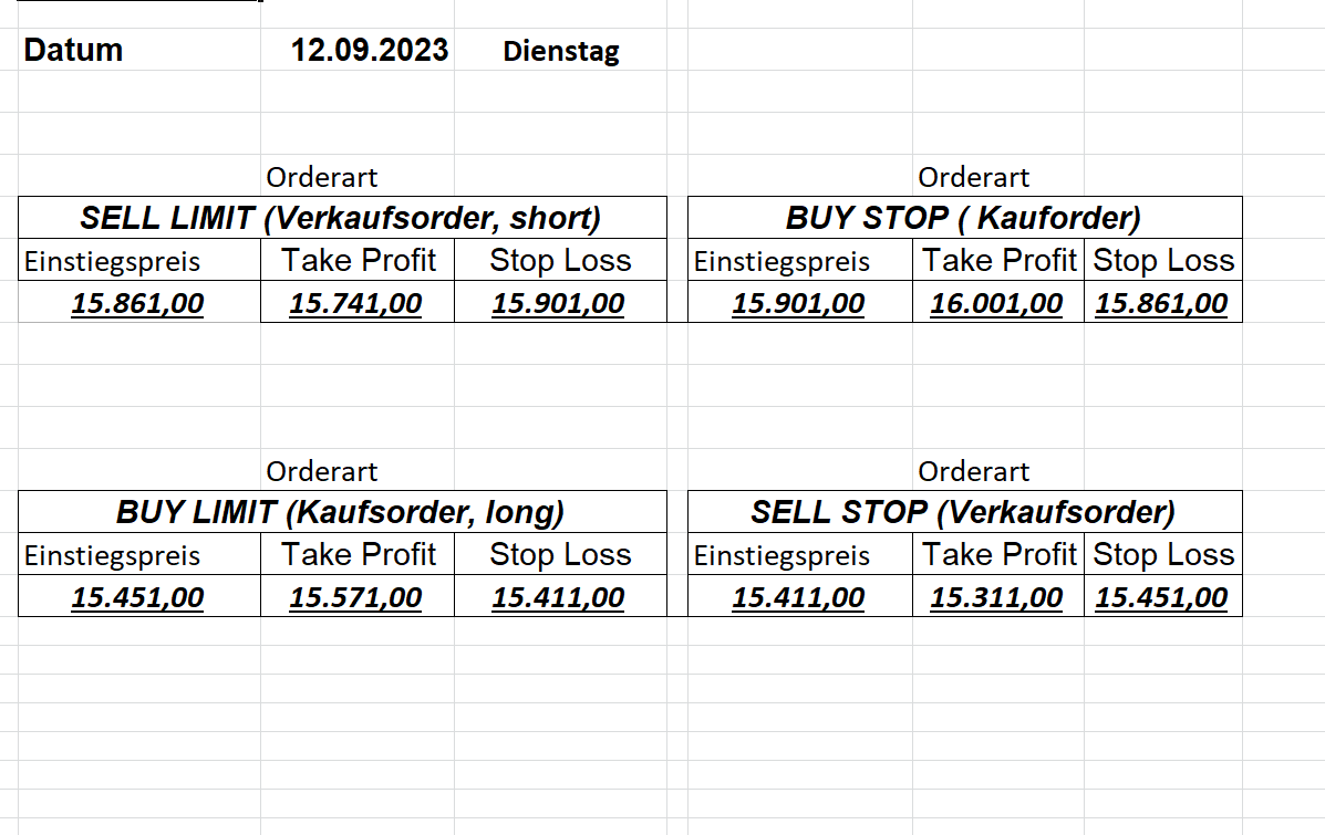 22.9.2023 Platzieren Sie die  Order bis 9:00 Löschen Sie bitte offene Order und Positionen um 21:45 ! Zur Frage der Punktgröße: Beispielrechnung: Bitte immer kurz auf den am weitest entfernten Stopp schauen. Diese Punktzahl sollte nicht mehr als 0,5% bis 1% des Kapitals ausmachen. 21.9.2023 Platzieren Sie die  Order bis 9:00 Löschen Sie bitte offene Order und Positionen um 21:45 ! Zur Frage der Punktgröße: Beispielrechnung: Bitte immer kurz auf den am weitest entfernten Stopp schauen. Diese Punktzahl sollte nicht mehr als 0,5% bis 1% des Kapitals ausmachen. 20.9.2023 Platzieren Sie die  Order bis 9:00 Löschen Sie bitte offene Order und Positionen um 21:45 ! Zur Frage der Punktgröße: Beispielrechnung: Bitte immer kurz auf den am weitest entfernten Stopp schauen. Diese Punktzahl sollte nicht mehr als 0,5% bis 1% des Kapitals ausmachen. 19.9.2023 Platzieren Sie die  Order bis 9:00 Löschen Sie bitte offene Order und Positionen um 21:45 ! Zur Frage der Punktgröße: Beispielrechnung: Bitte immer kurz auf den am weitest entfernten Stopp schauen. Diese Punktzahl sollte nicht mehr als 0,5% bis 1% des Kapitals ausmachen. So langsam kann ich wieder „kriechen“. Corona ist wirklich anstrengend. Zum FDAX: Wir haben ein Ergebnis: Es wird der „Kleine“ mit einem Euro pro Punkt. Wenn es weiter mit der Genesung vorangeht, werden wir am kommenden Montag endlich starten.  Achtung: Beim Buy Limit und beim Stopp Sell bitte die 16 durch 15 ersetzen. Also Buy Limit 15451 /15571/15411 Stopp Sell 15411/ 15311/ 15451 18.9.2023 Platzieren Sie die  Order bis 9:00 Löschen Sie bitte offene Order und Positionen um 21:45 ! Zur Frage der Punktgröße: Beispielrechnung: Bitte immer kurz auf den am weitest entfernten Stopp schauen. Diese Punktzahl sollte nicht mehr als 0,5% bis 1% des Kapitals ausmachen. 15.9.2023 Platzieren Sie die  Order bis 9:00 Löschen Sie bitte offene Order und Positionen um 21:45 ! Zur Frage der Punktgröße: Beispielrechnung: Bitte immer kurz auf den am weitest entfernten Stopp schauen. Diese Punktzahl sollte nicht mehr als 0,5% bis 1% des Kapitals ausmachen. 14.9.2023 Platzieren Sie die  Order bis 9:00 Löschen Sie bitte offene Order und Positionen um 21:45 ! Zur Frage der Punktgröße: Beispielrechnung: Bitte immer kurz auf den am weitest entfernten Stopp schauen. Diese Punktzahl sollte nicht mehr als 0,5% bis 1% des Kapitals ausmachen. 13.9.2023 Heute „spuckte“ das System keine tragfähigen Signale aus. Morgen geht es normal weiter!  12.9.2023
